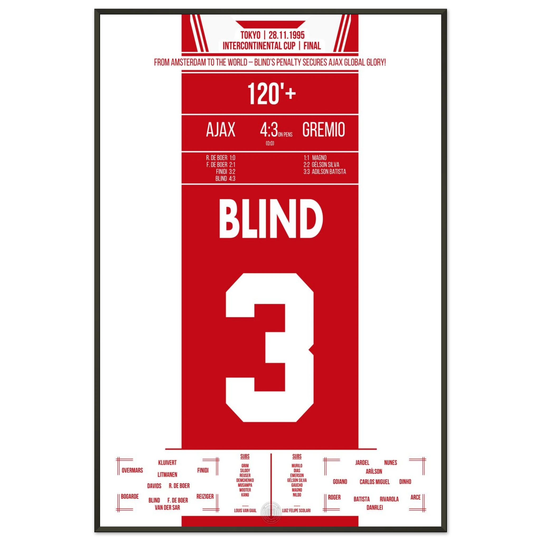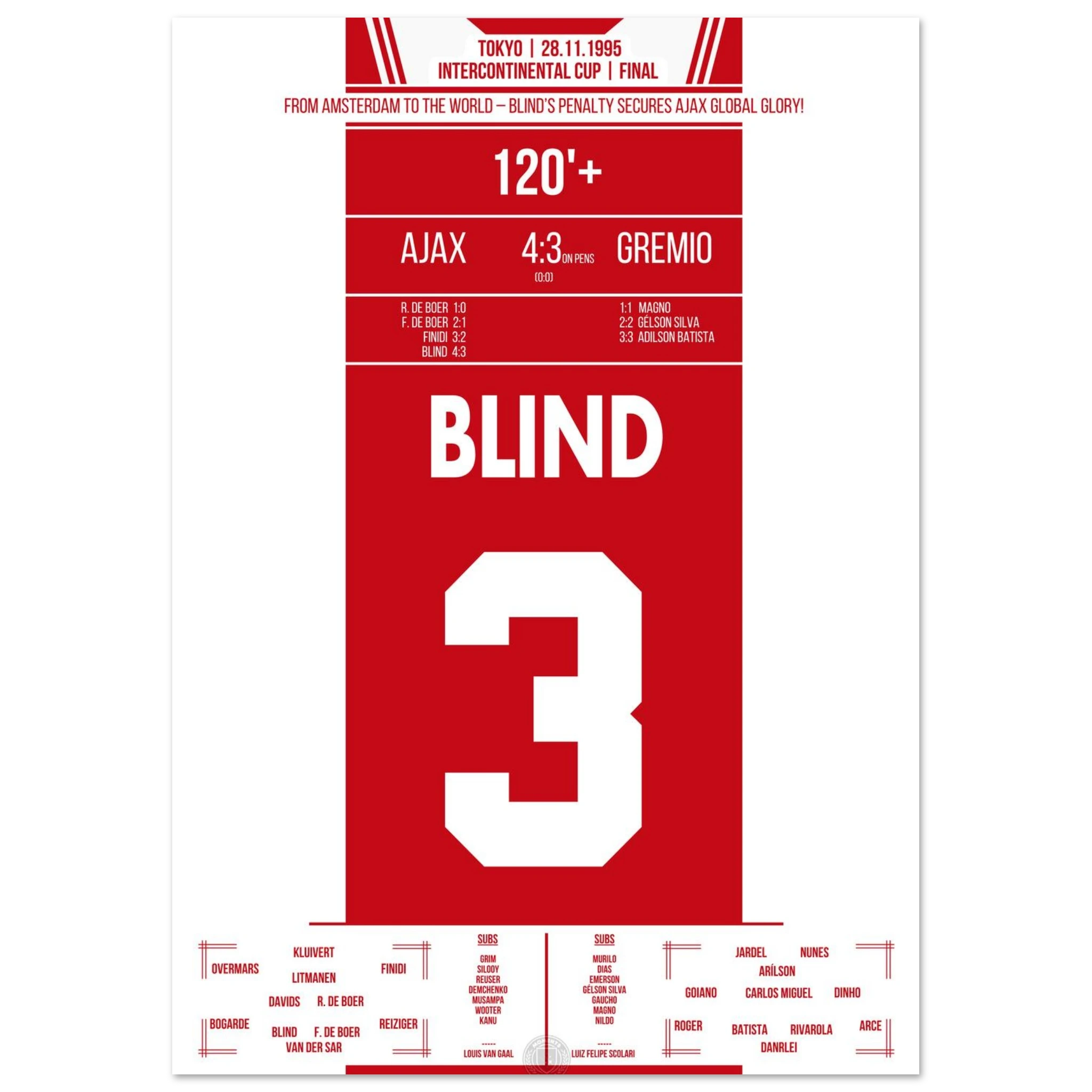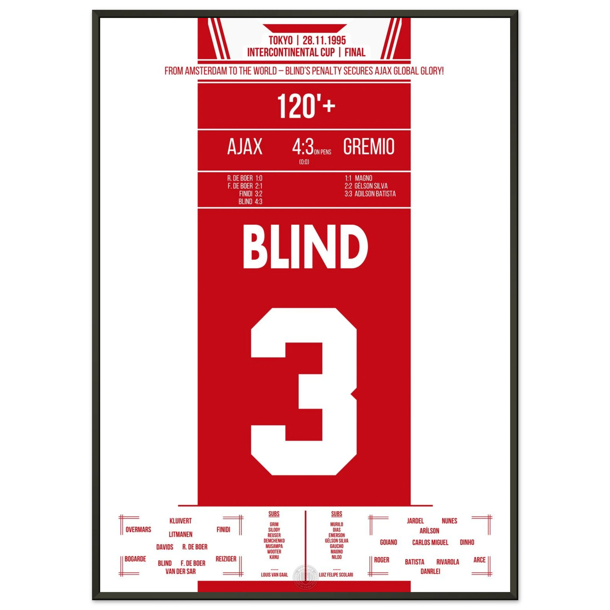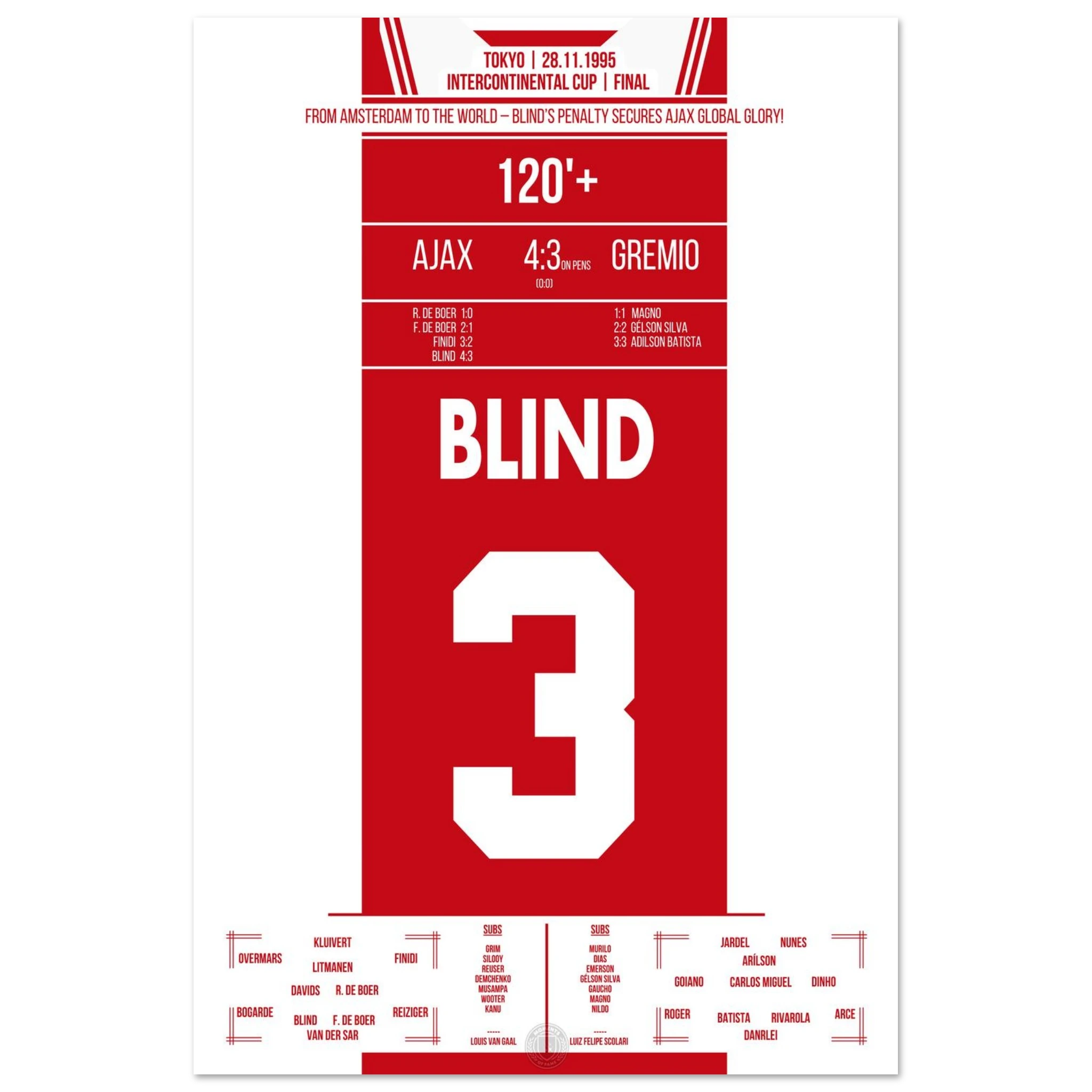 In Tokio trifft Europas Champion Ajax auf Südamerikas Vertreter Grêmio. Nach einem intensiven 0:0 entscheidet Kapitän Danny Blind im Elfmeterschießen – mit all seiner Routine und Nervenstärke. Damit krönen sich die Amsterdamer zur besten Mannschaft der Welt.