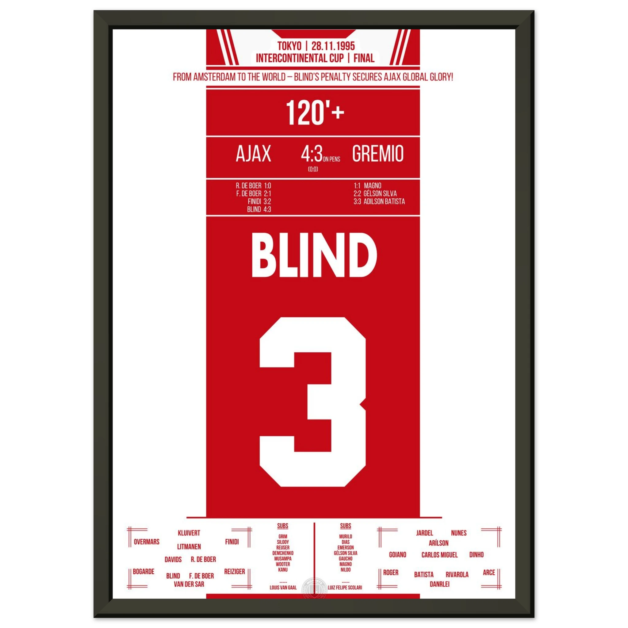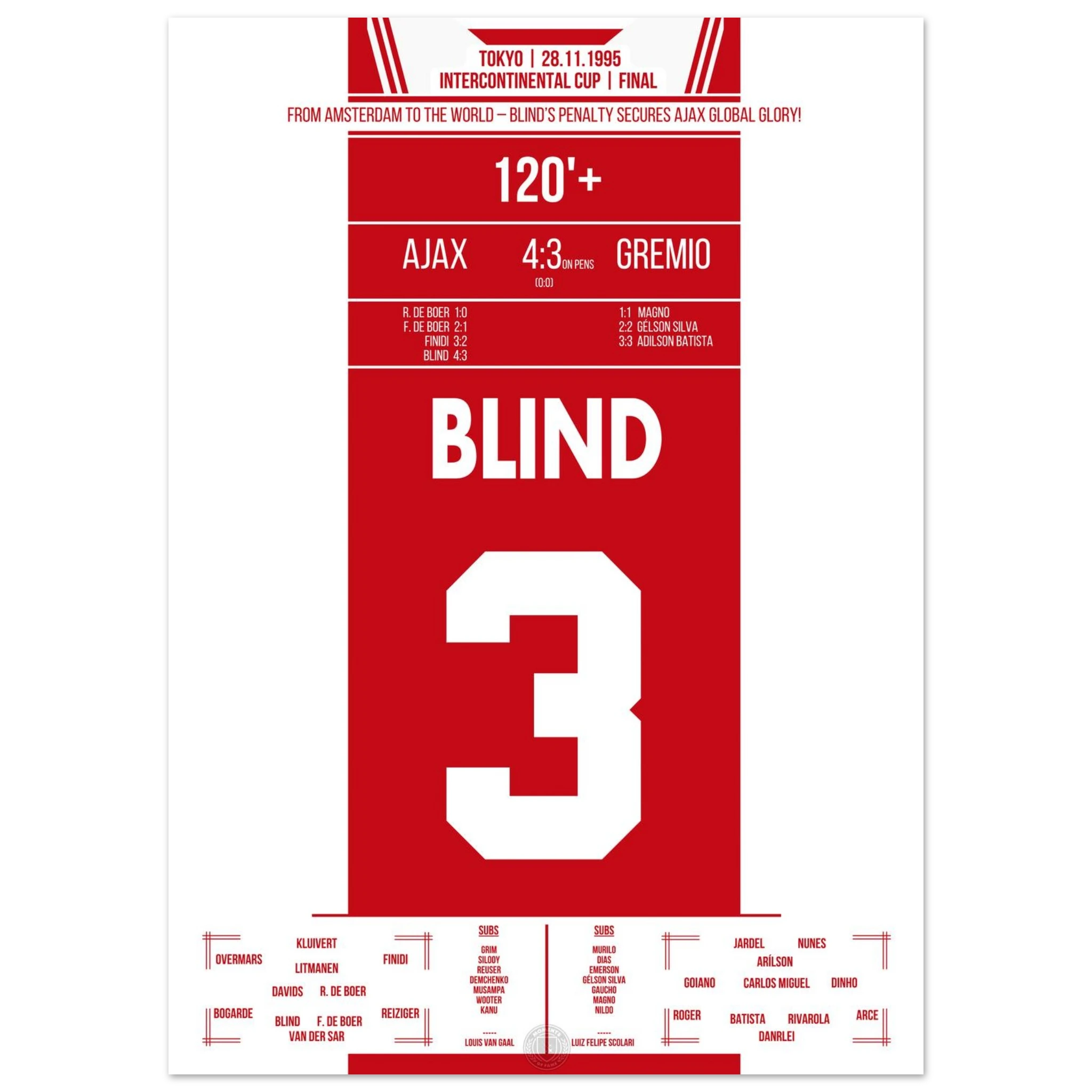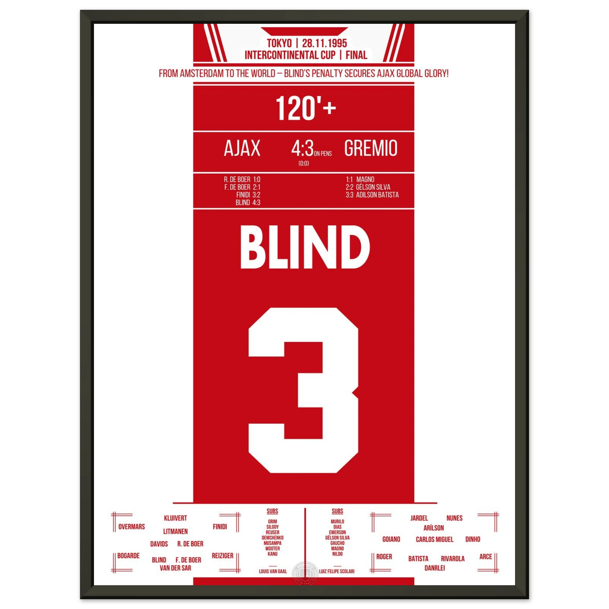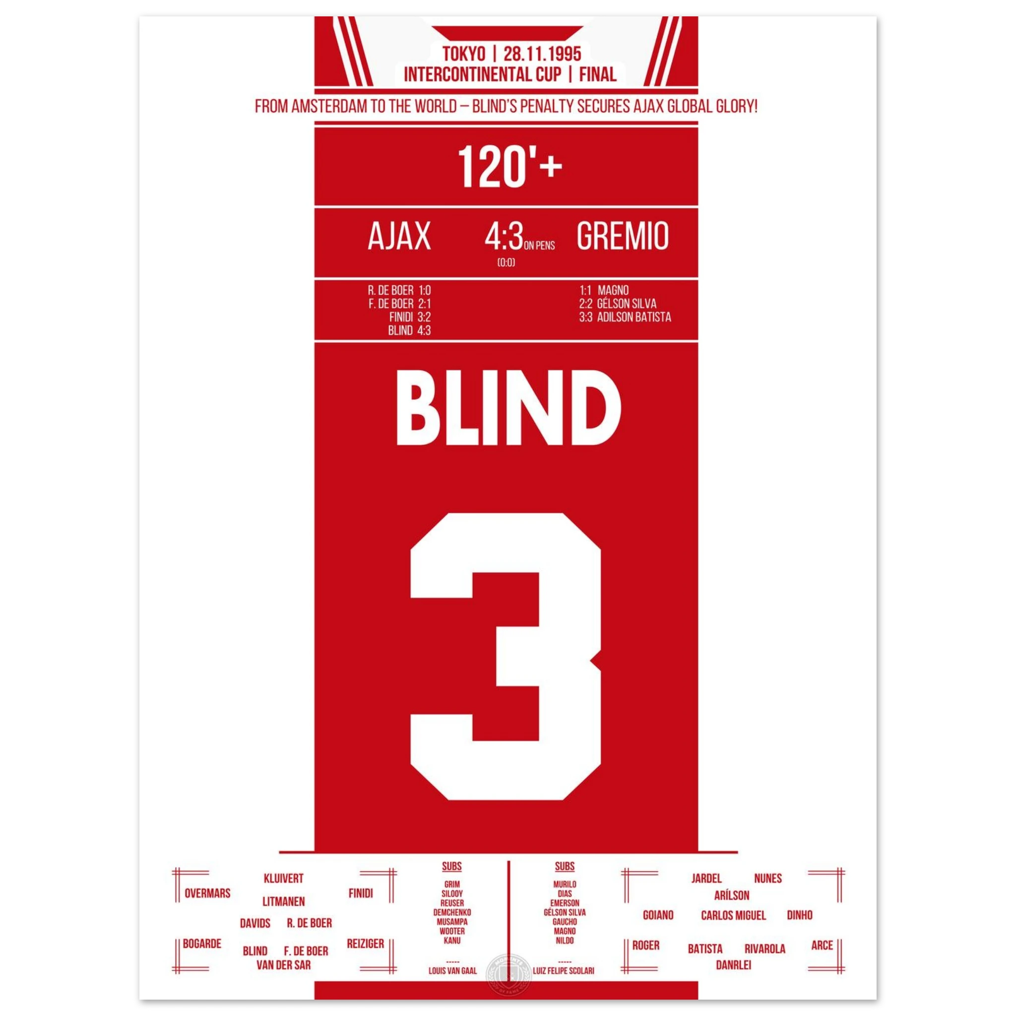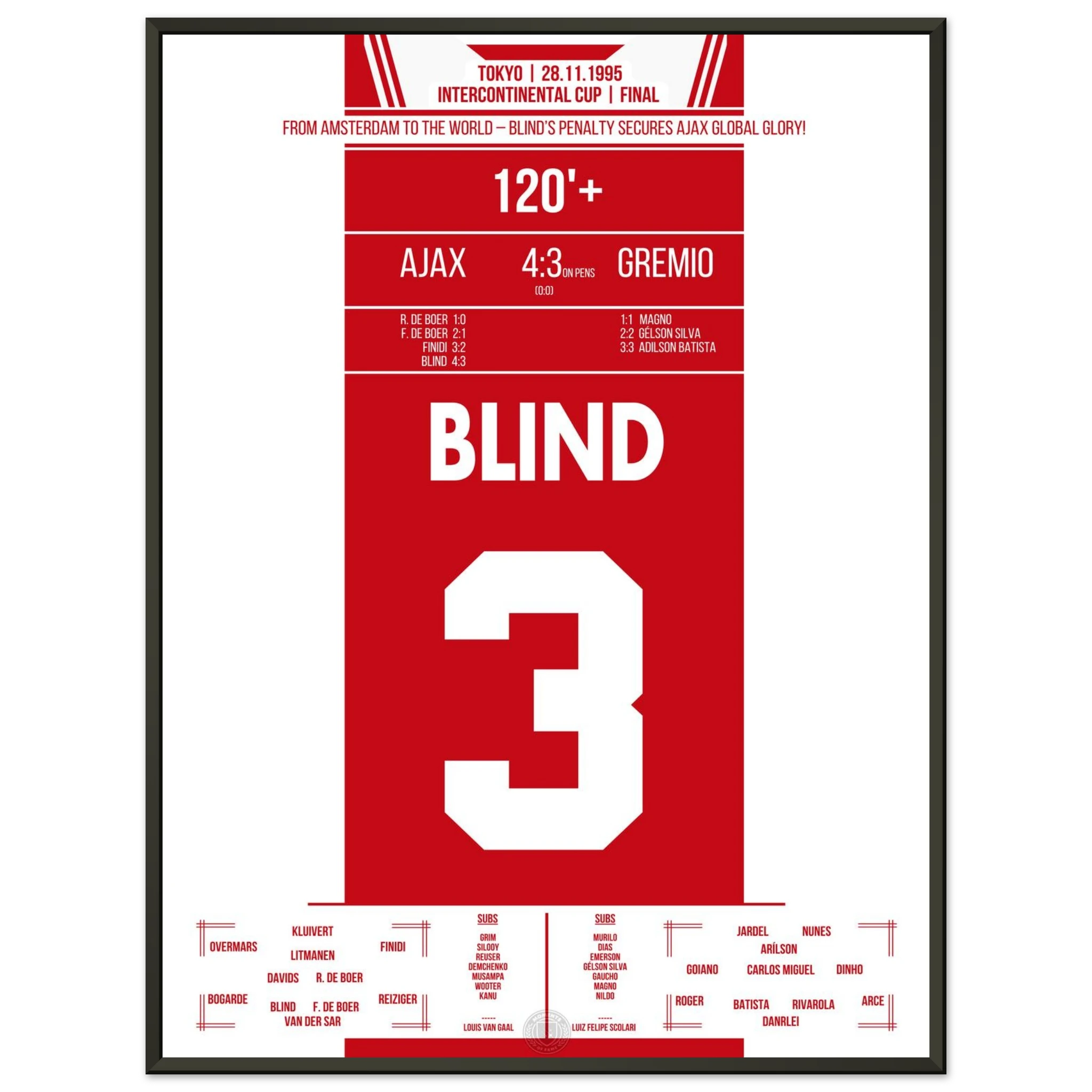 In Tokio trifft Europas Champion Ajax auf Südamerikas Vertreter Grêmio. Nach einem intensiven 0:0 entscheidet Kapitän Danny Blind im Elfmeterschießen – mit all seiner Routine und Nervenstärke. Damit krönen sich die Amsterdamer zur besten Mannschaft der Welt.