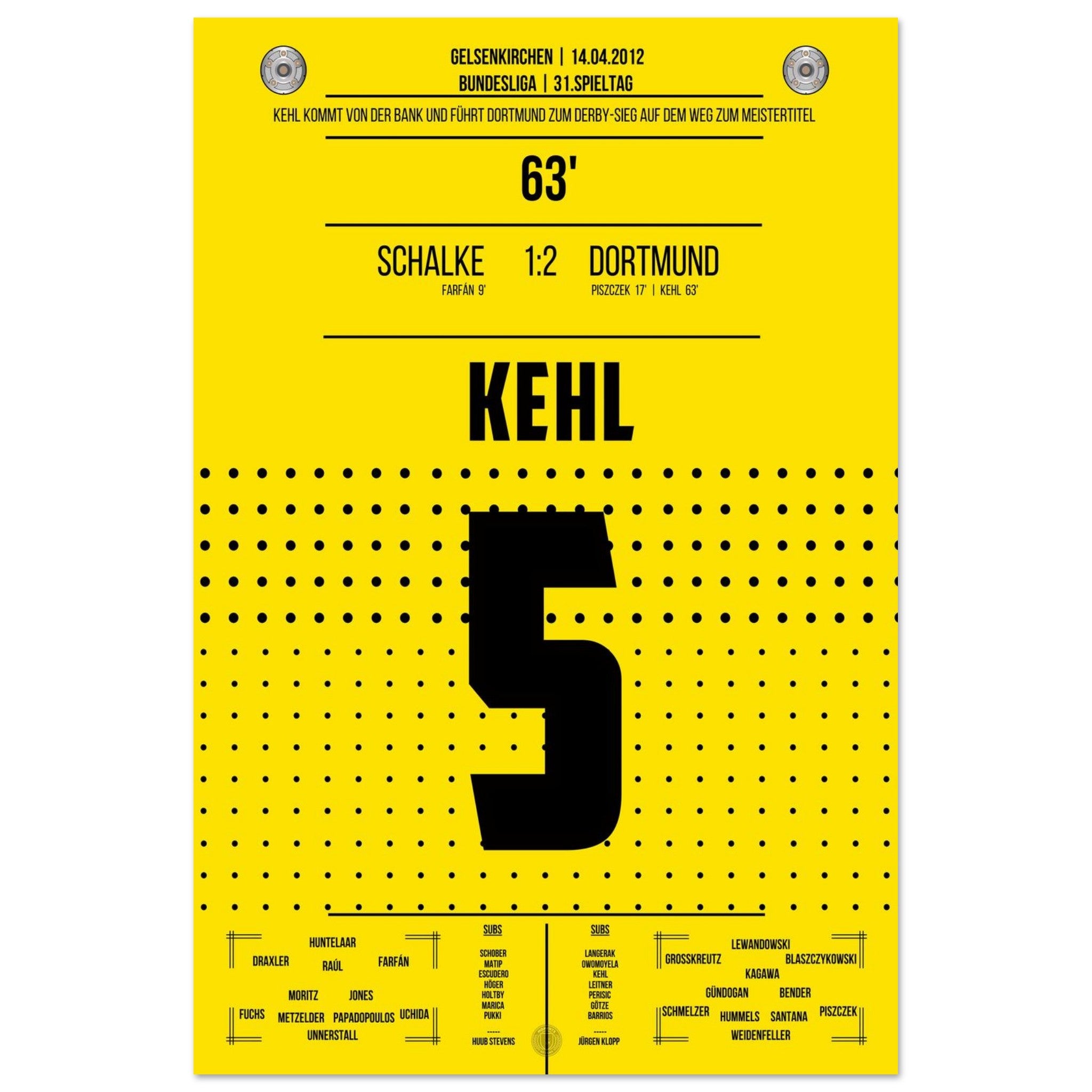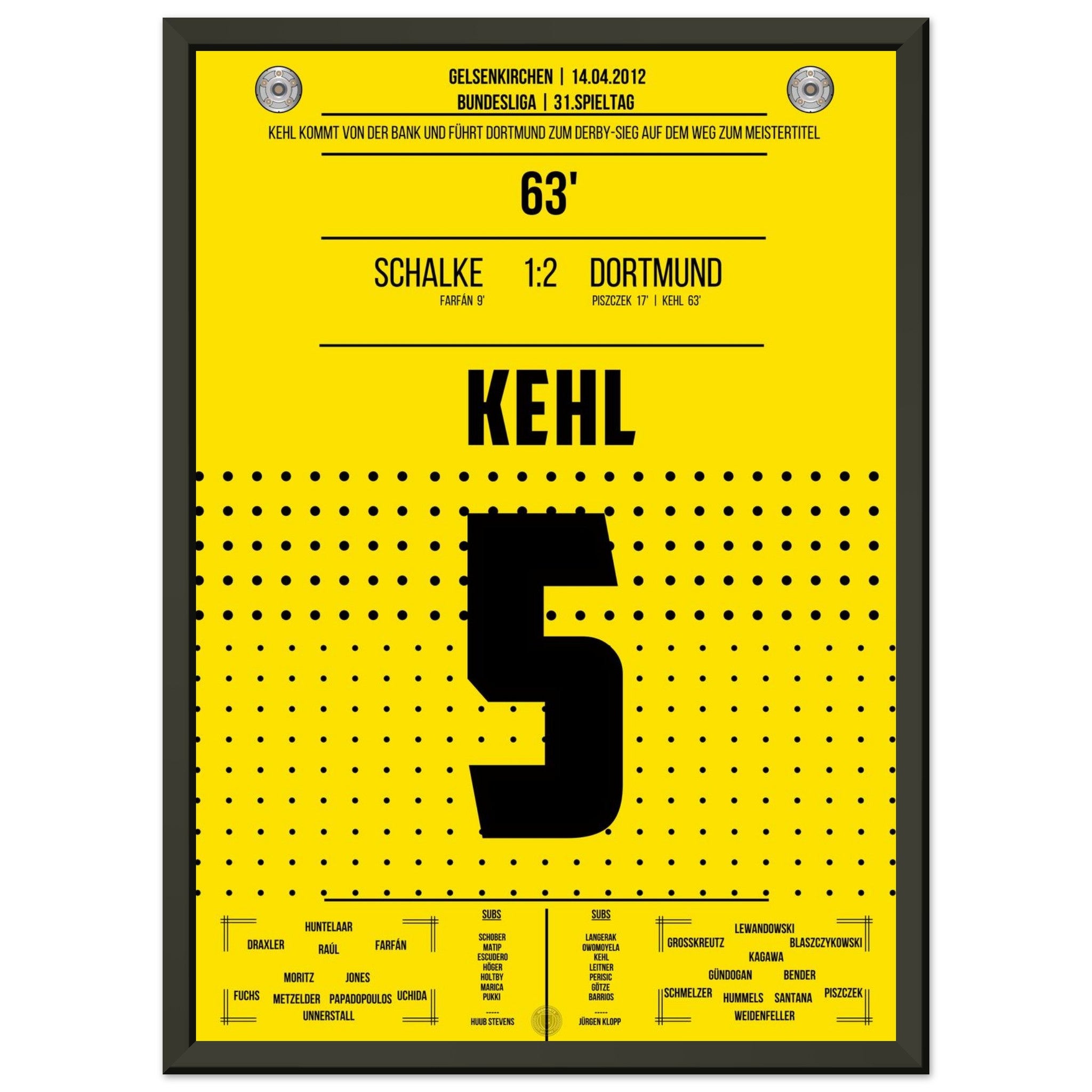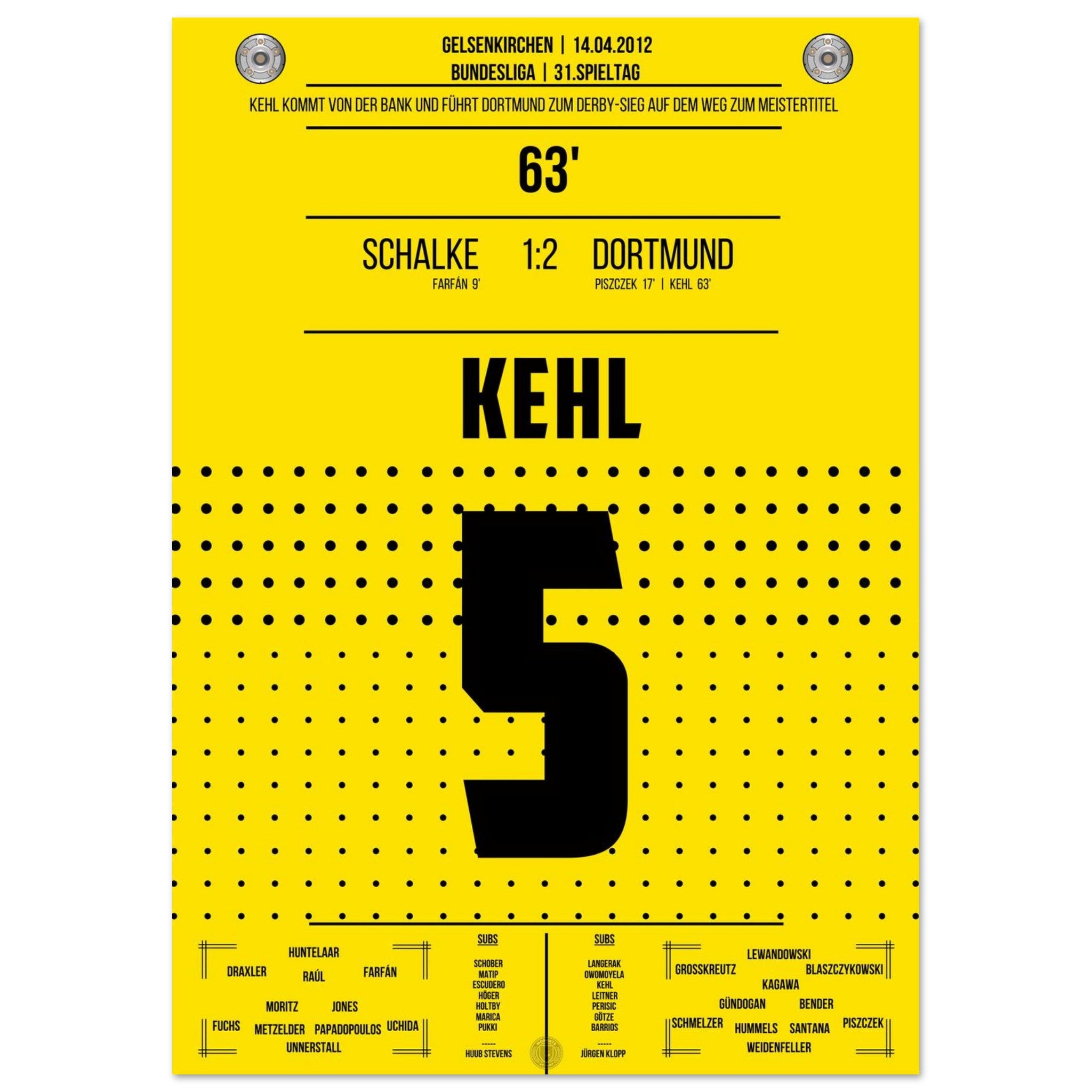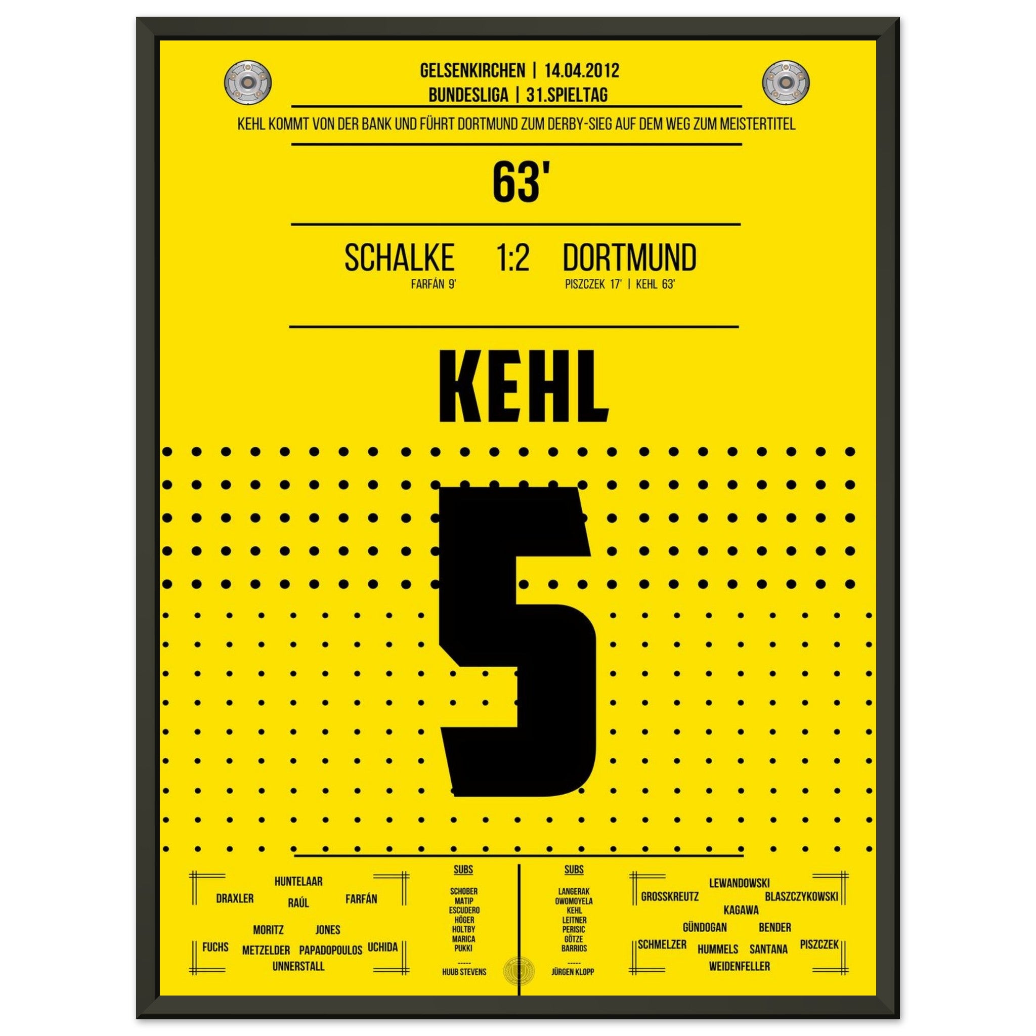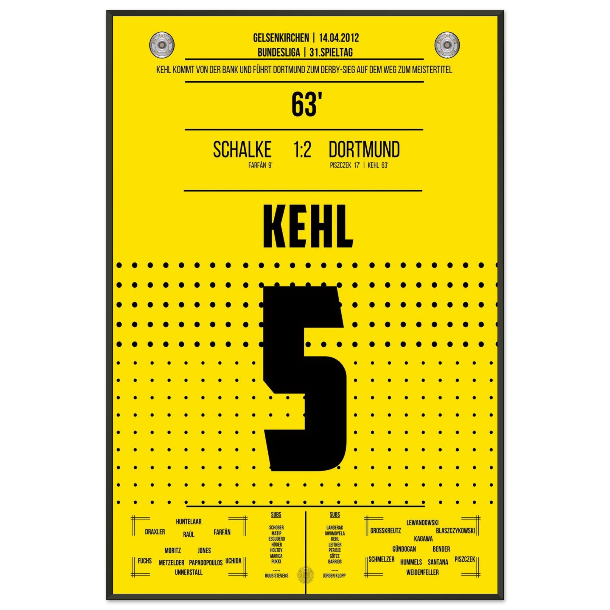 14. April 2012 – Schalke vs. Dortmund 1:2: Nach seiner Einwechslung trifft Sebastian Kehl in der 63. Minute im Revierderby zum 2:1 – und bringt Dortmund auf Titelkurs. Ein leidenschaftlicher Sieg im Feindesland, gekrönt vom Kapitän. Unser Poster verewigt diesen goldenen Derby-Moment für die Ewigkeit.