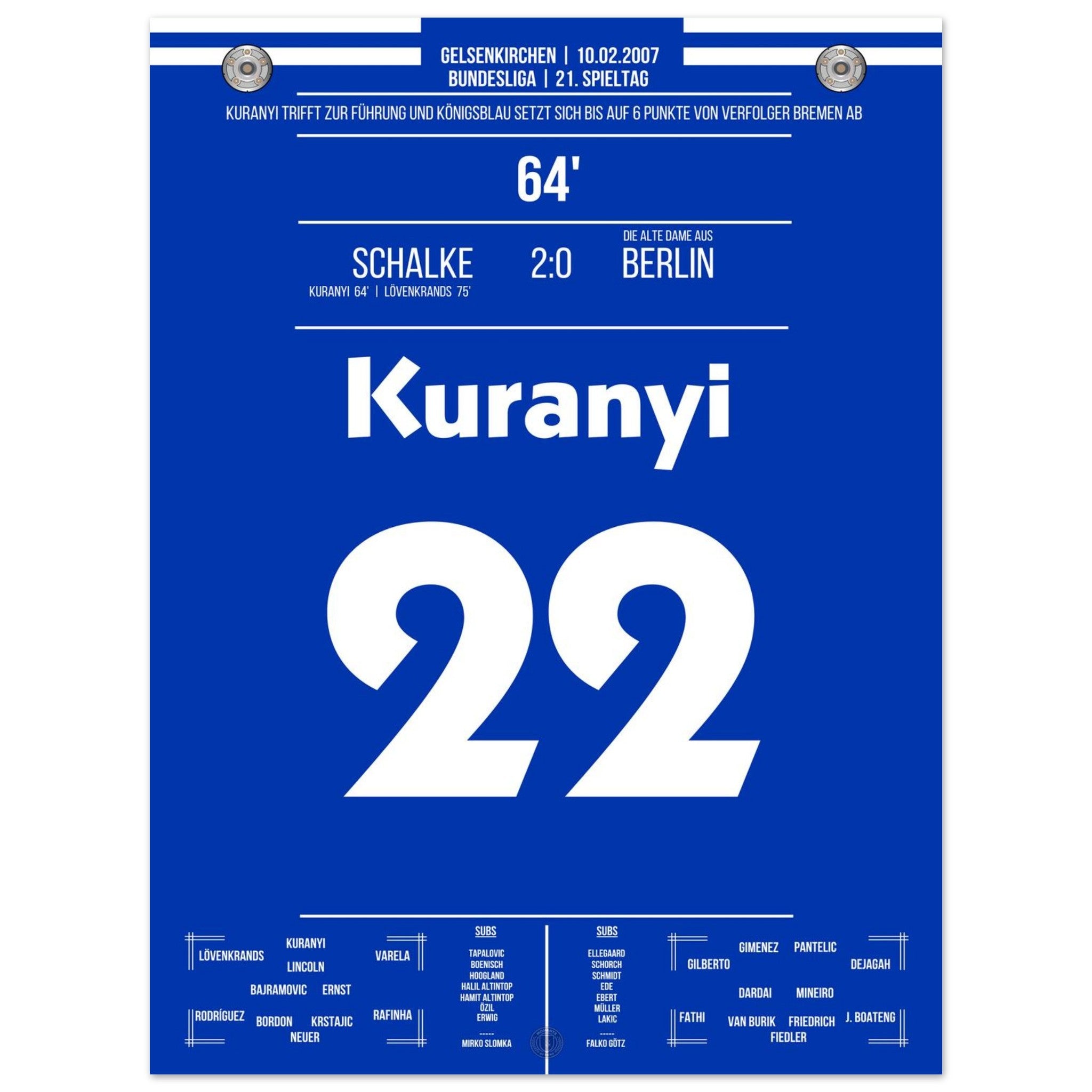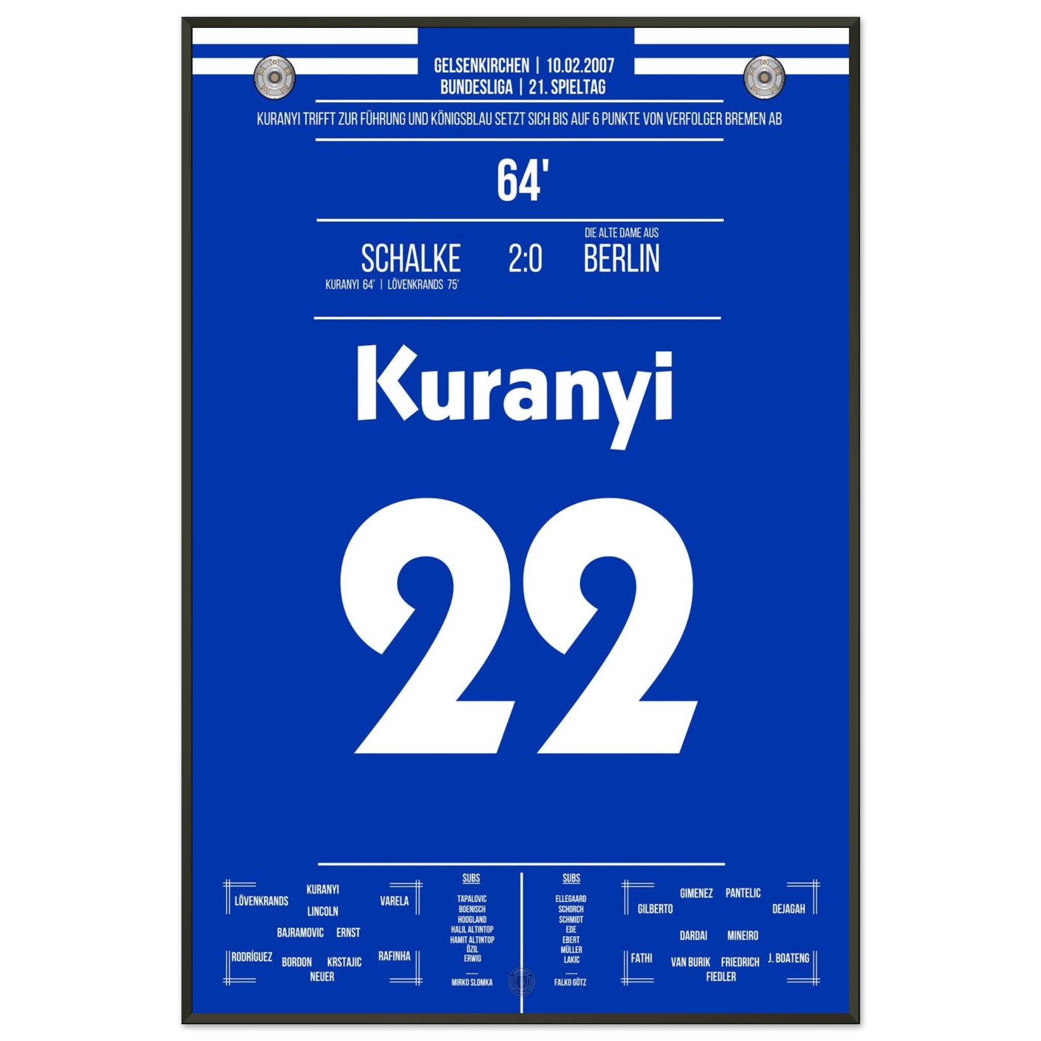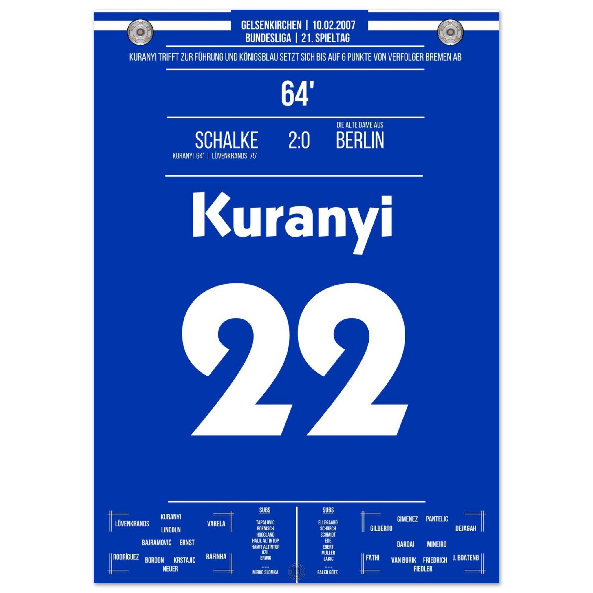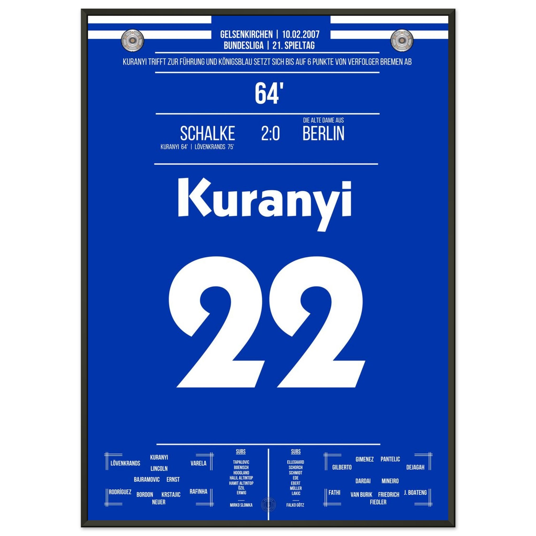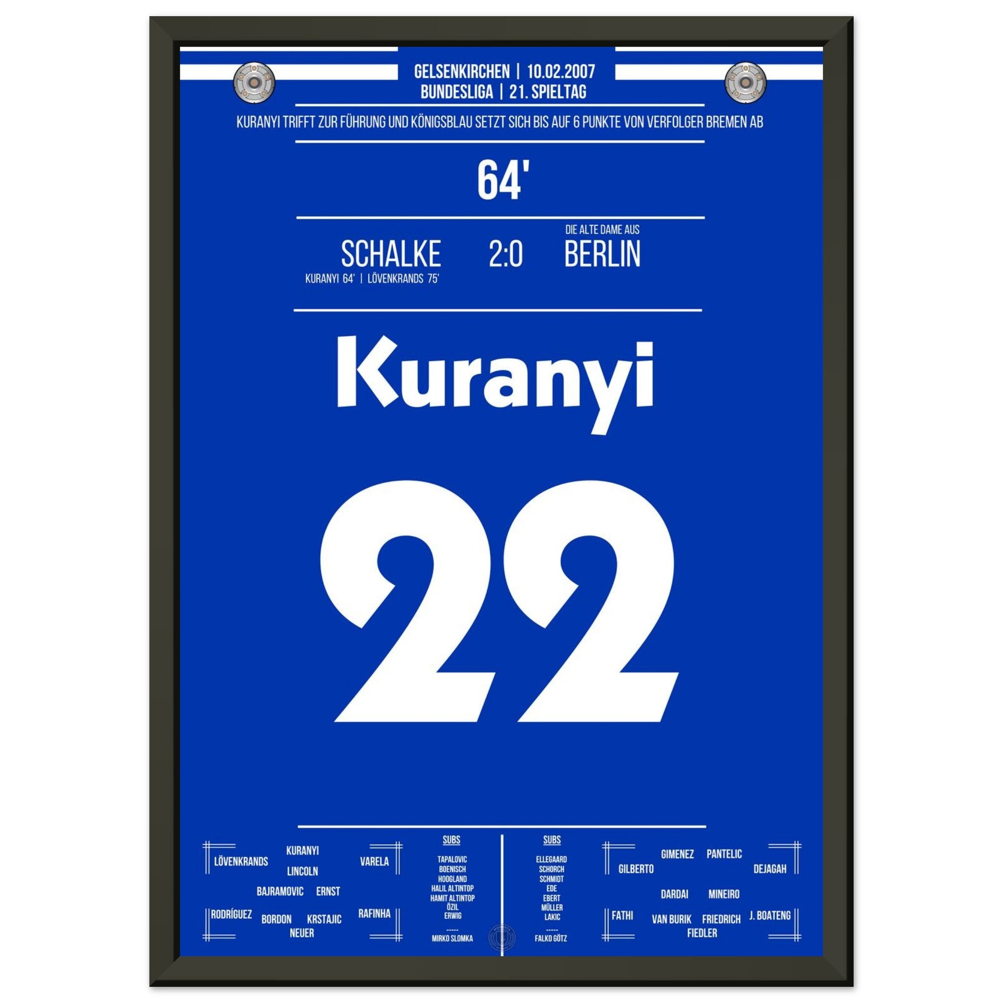 10. Februar 2007 – Schalke vs. Berlin 2:0: In der 64. Minute trifft Kevin Kurányi per Kopf zum 2:0 und bringt die Arena zum Kochen – Schalke verteidigt die Tabellenführung im Titelrennen. Ein Tor mit Wucht und Bedeutung. Unser Poster hält diesen Kurányi-Moment in Königsblau fest.