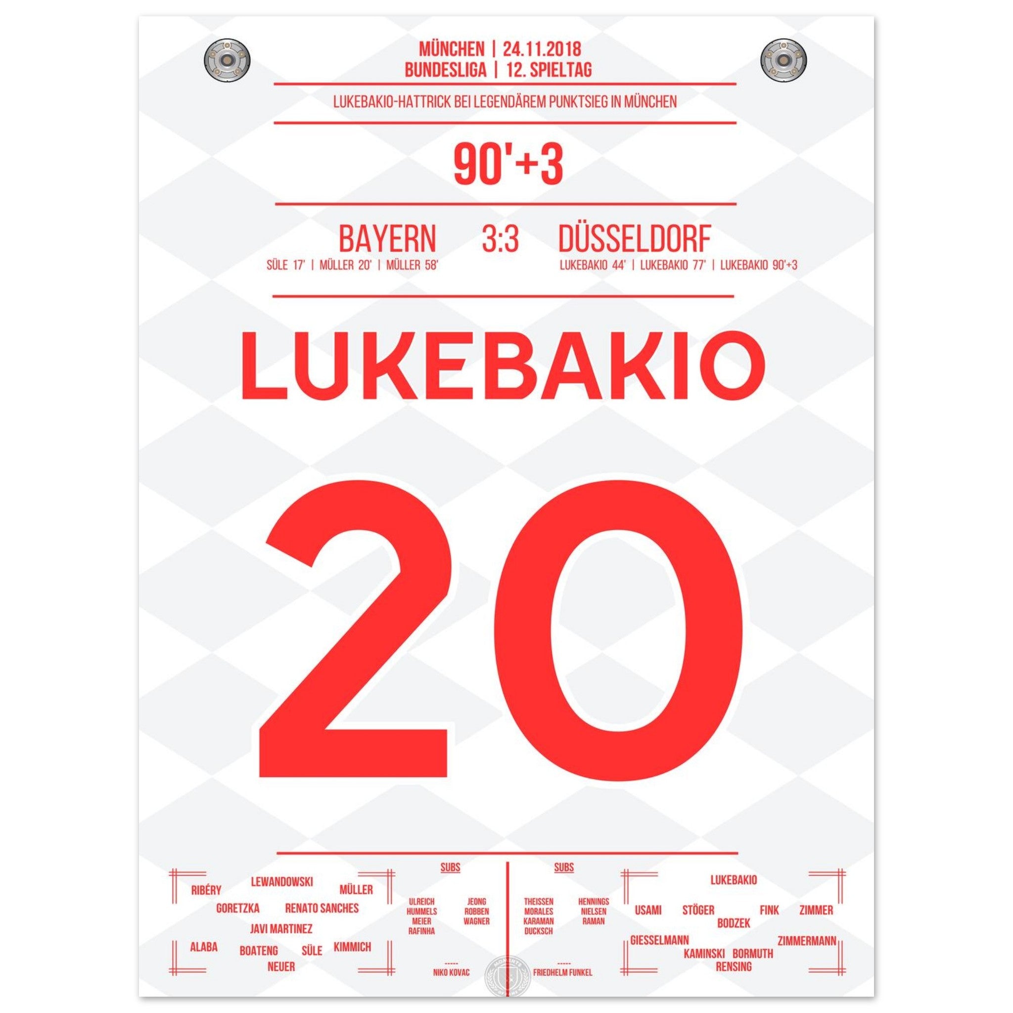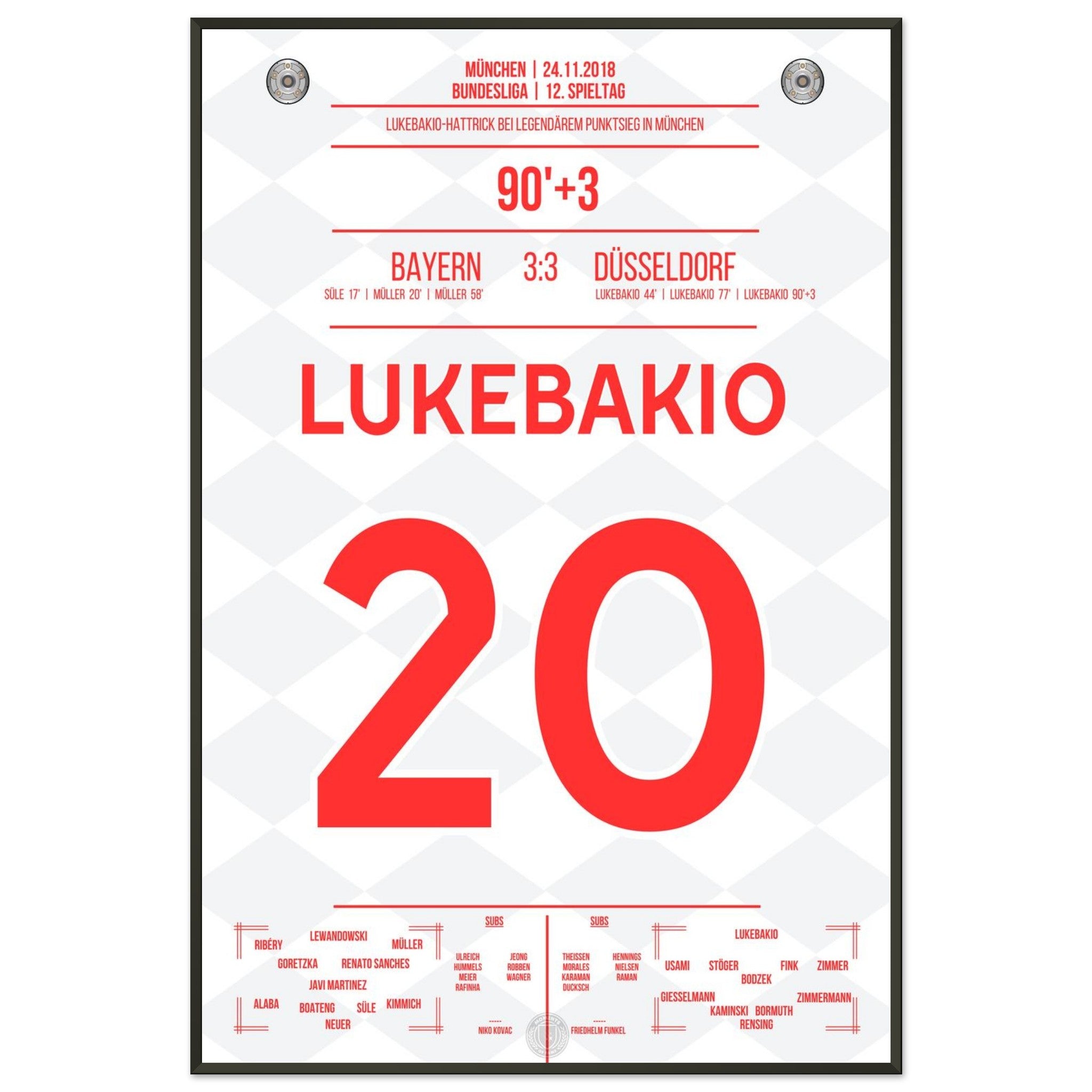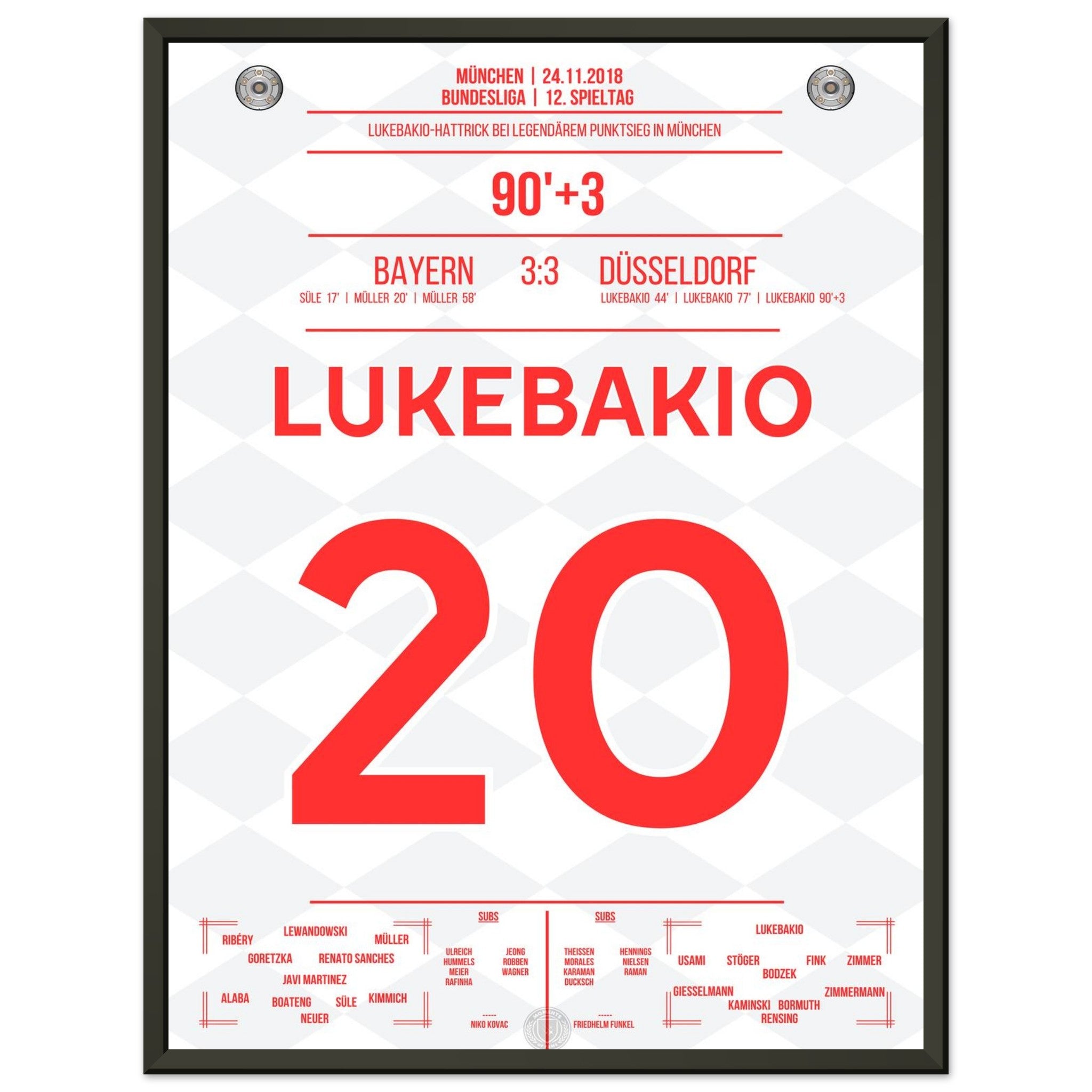 24. November 2018 – Bayern vs. Düsseldorf 3:3: Dodi Lukebakio schockt die Bayern mit einem historischen Hattrick in München und rettet Düsseldorf sensationell einen Punkt. Als erster Spieler überhaupt trifft er dreimal gegen Manuel Neuer in einem Bundesliga-Spiel. Unser Poster feiert diesen unvergesslichen Auftritt des Bayern-Schrecks.