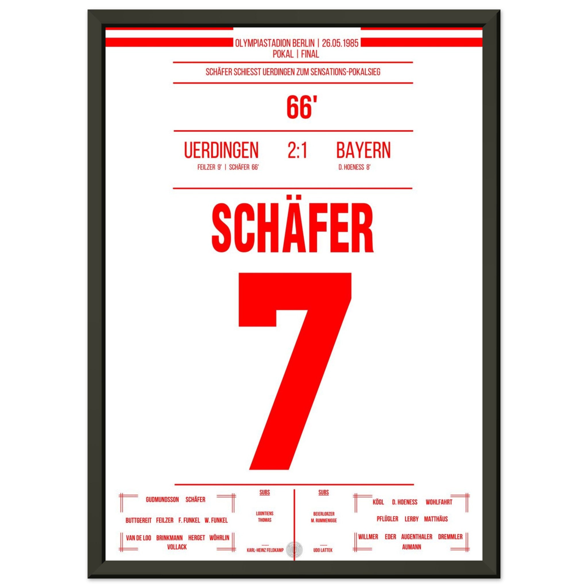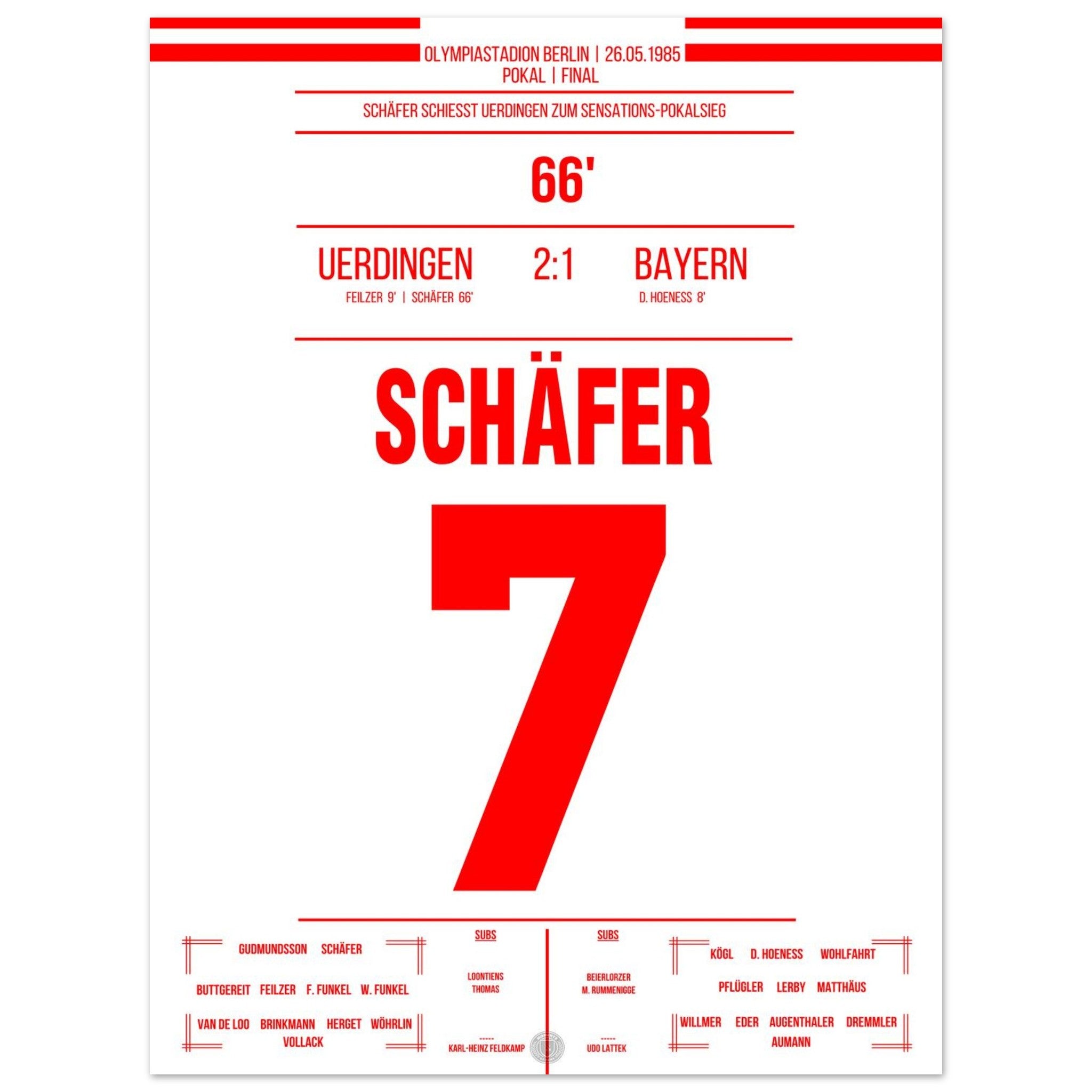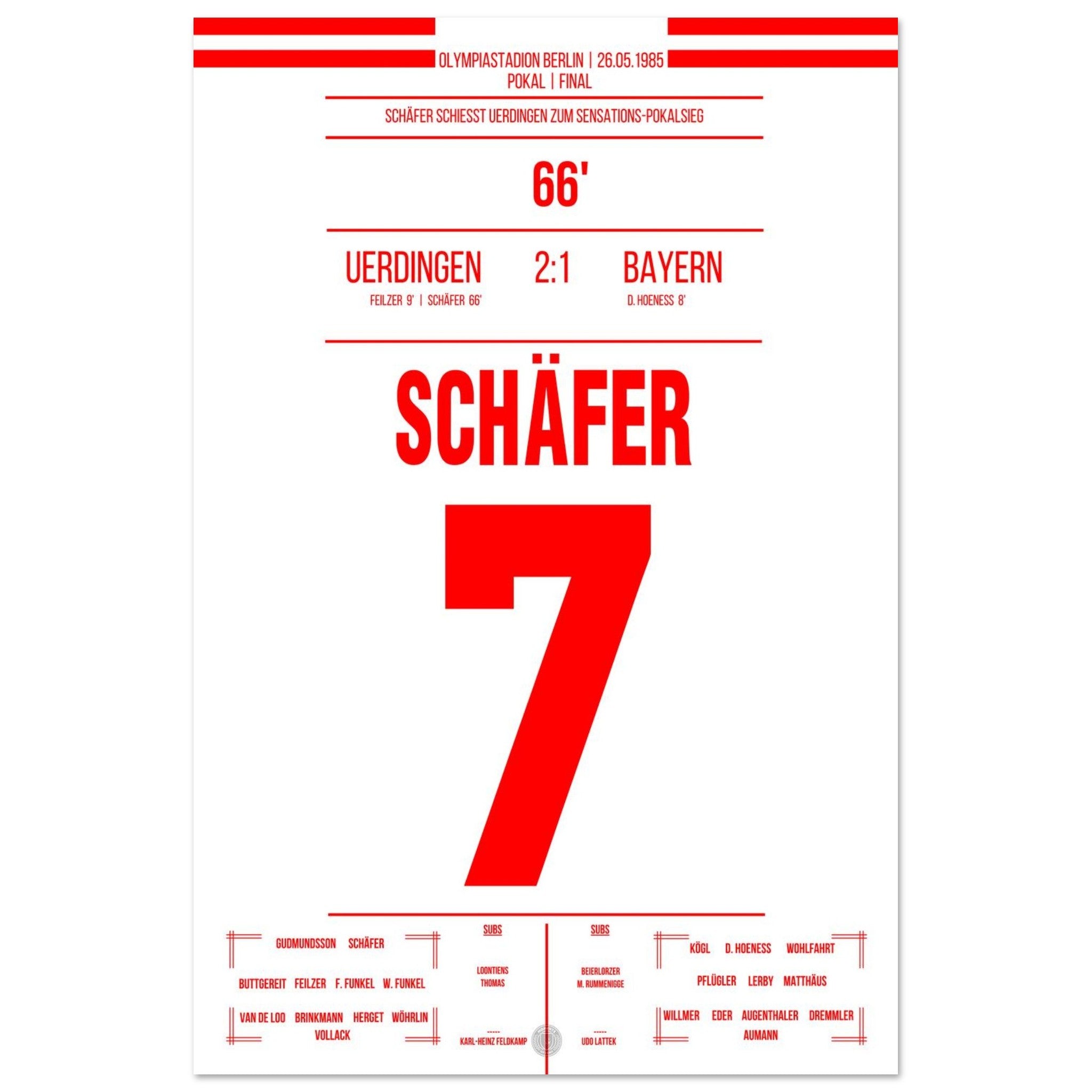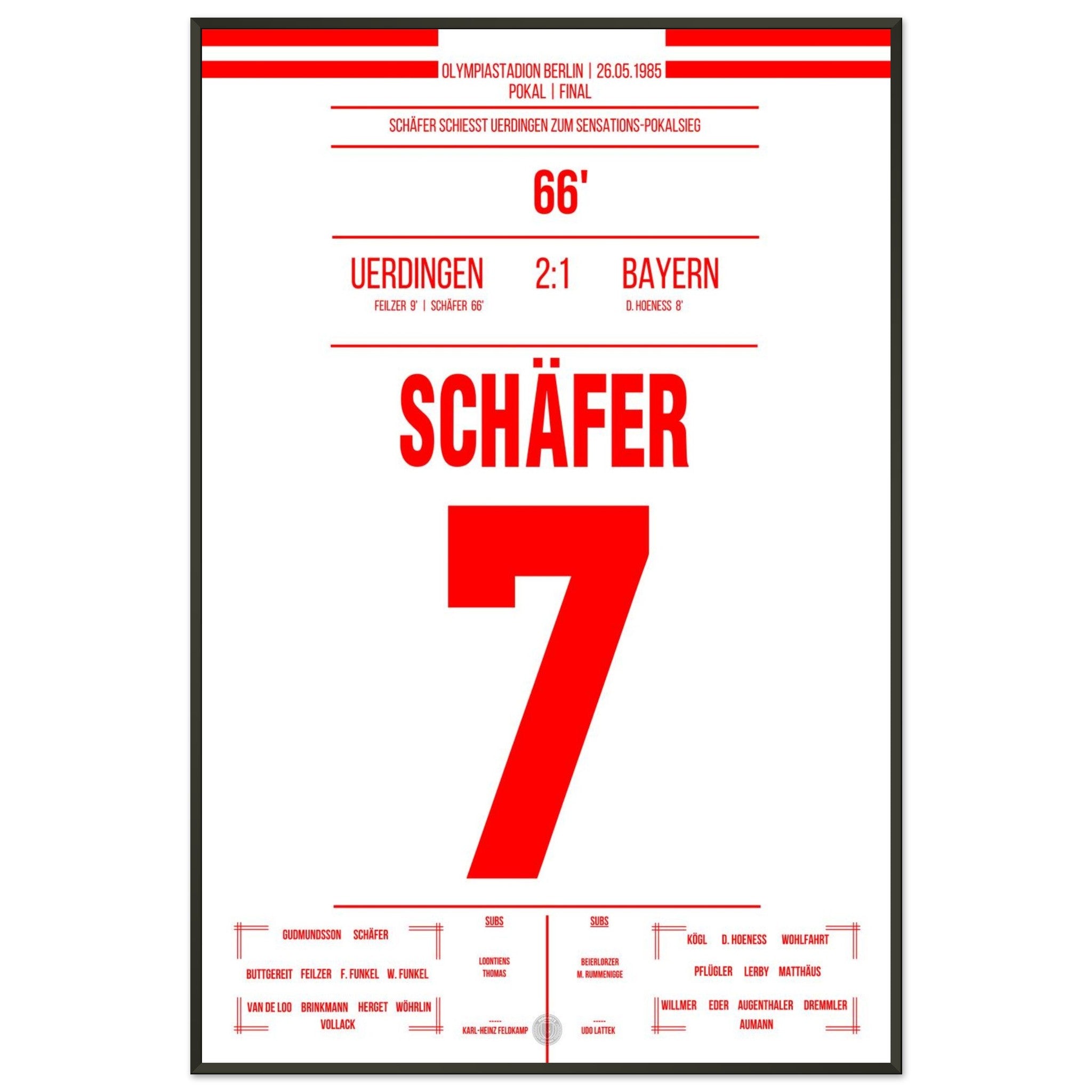 26. Mai 1985 – Bayern vs. Uerdingen 1:2: Es ist das Wunder von Berlin: Bayer Uerdingen dreht das Pokalfinale gegen den haushohen Favoriten aus München und schreibt Fußballgeschichte. Nach Rückstand kämpft sich das Team leidenschaftlich zurück – Wolfgang Schäfer gleicht aus, und in der 81. Minute sorgt Horst Feilzer mit seinem Treffer für Ekstase. Uerdingen krönt sich zum Pokalsieger und bringt die Schale mit an den Niederrhein. Unser Poster feiert diesen unvergesslichen Triumph im Olympiastadion.