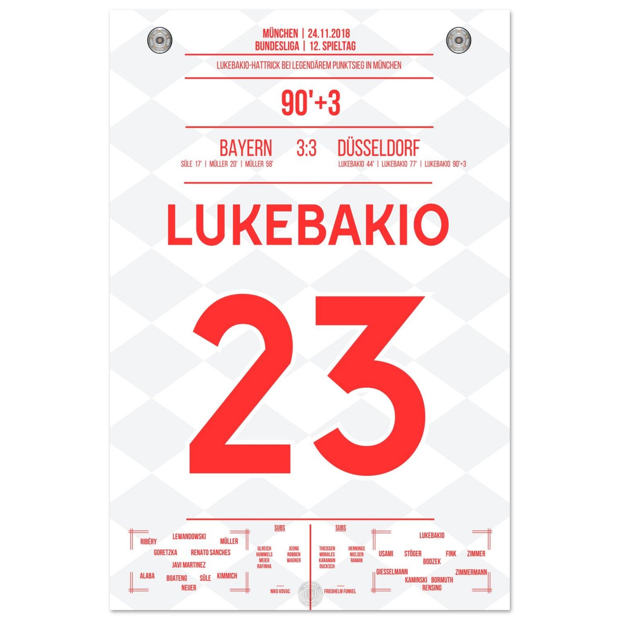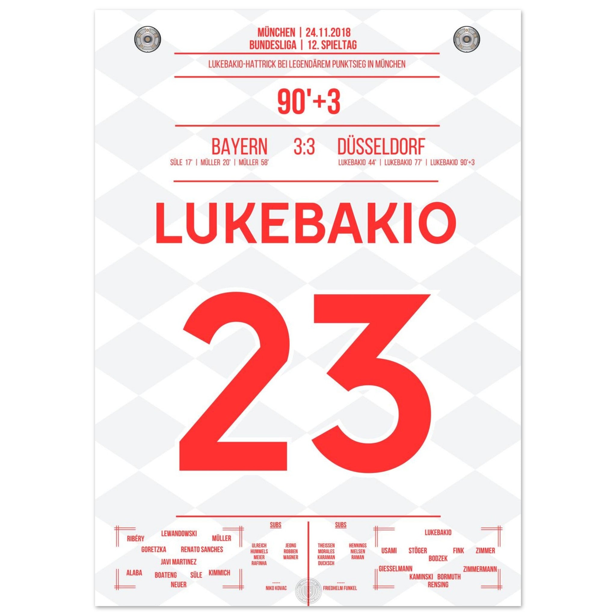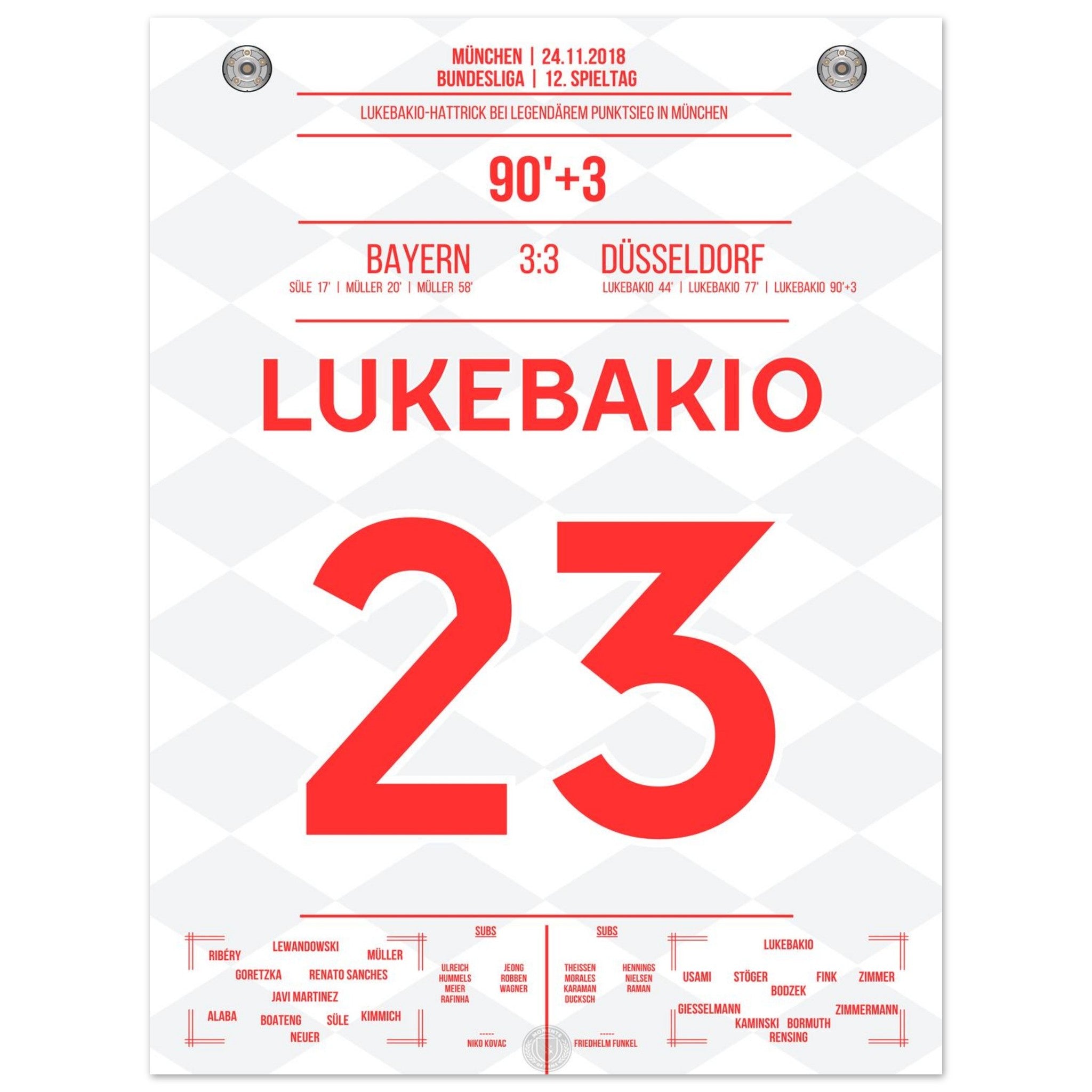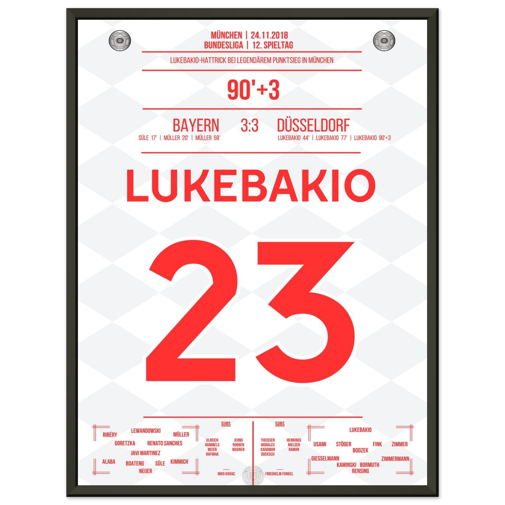 24. November 2018 – Bayern vs. Düsseldorf 3:3: Dodi Lukebakio schockt die Bayern mit einem historischen Hattrick in München und rettet Düsseldorf sensationell einen Punkt. Als erster Spieler überhaupt trifft er dreimal gegen Manuel Neuer in einem Bundesliga-Spiel. Unser Poster feiert diesen unvergesslichen Auftritt des Bayern-Schrecks.