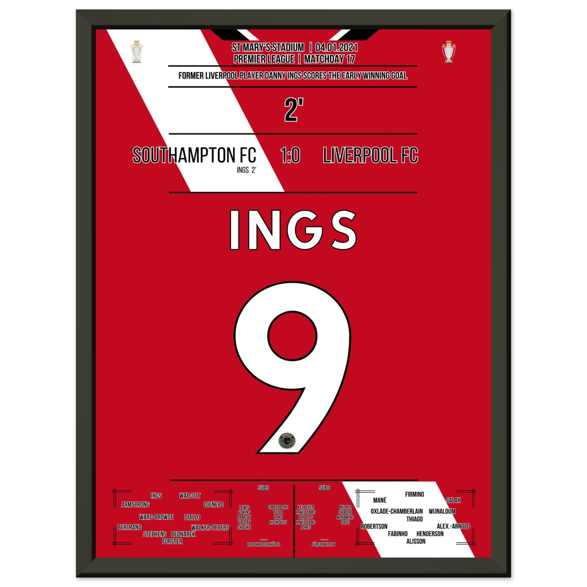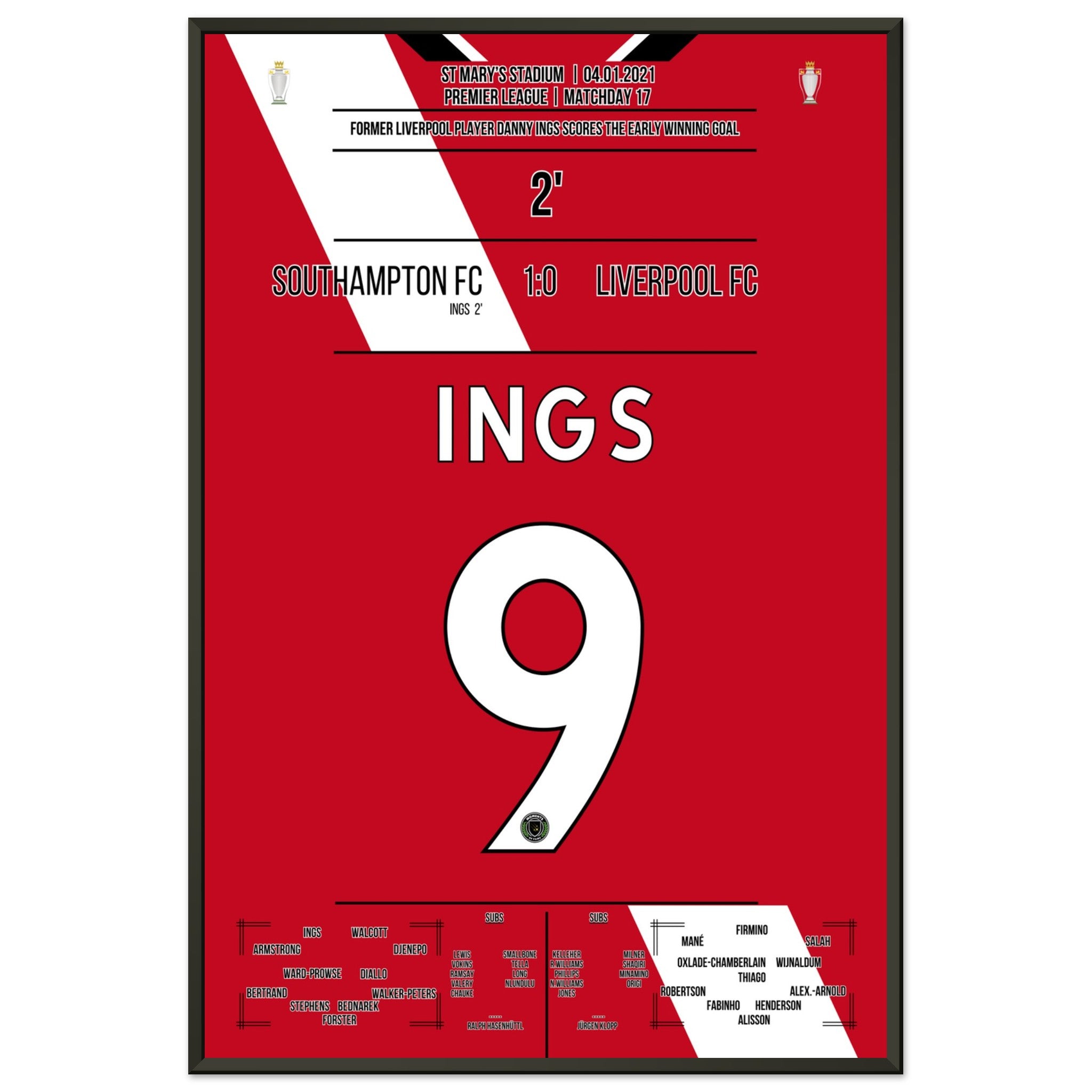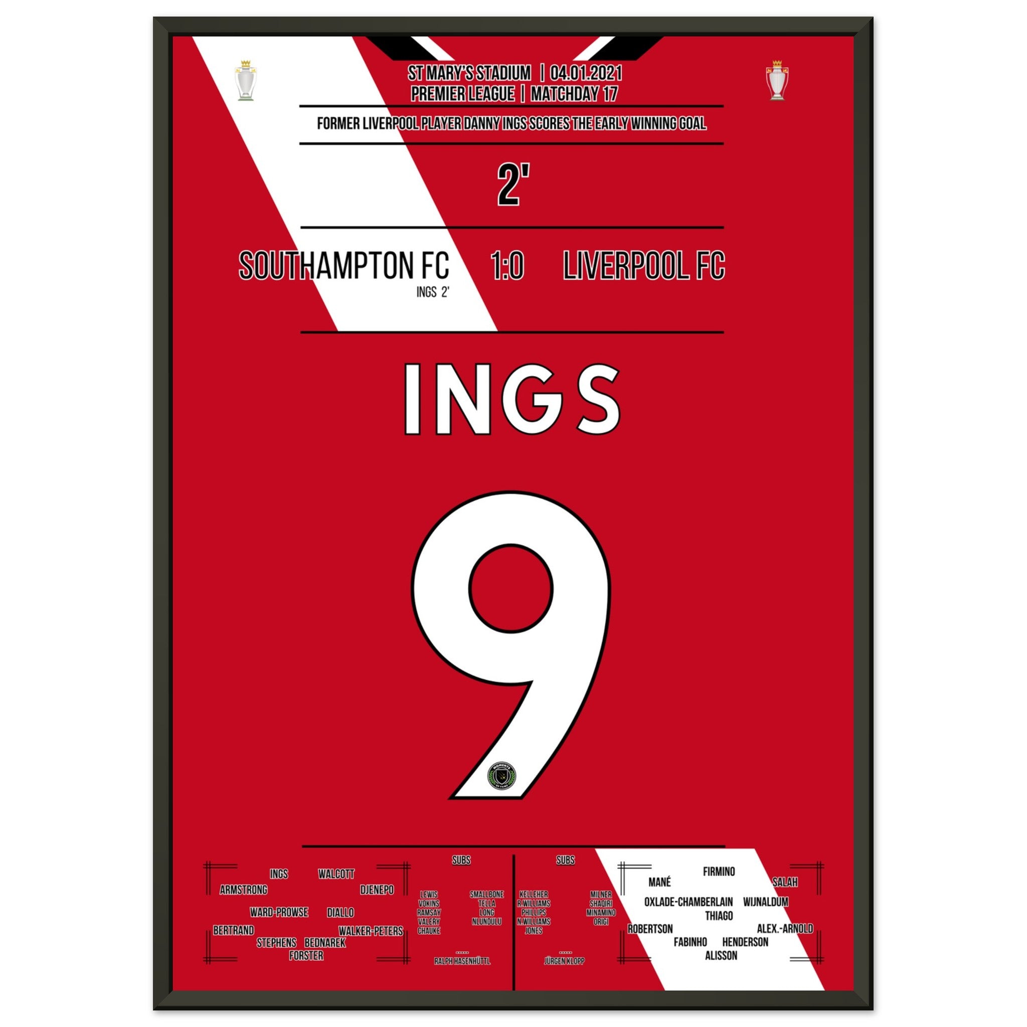 Sie können sicher sein, dass jedes Poster und jeder Rahmen in einer robusten Verpackung versandt wird, damit es in tadellosem Zustand ankommt. Es ist die perfekte Ergänzung für die Sammlung eines jeden Fußballfans oder das perfekte Geschenk für den eingefleischten Fußball-Fan ihres Freundes- oder Familienkreises.