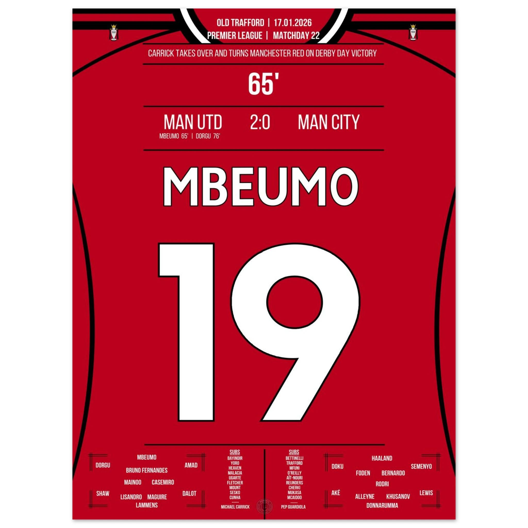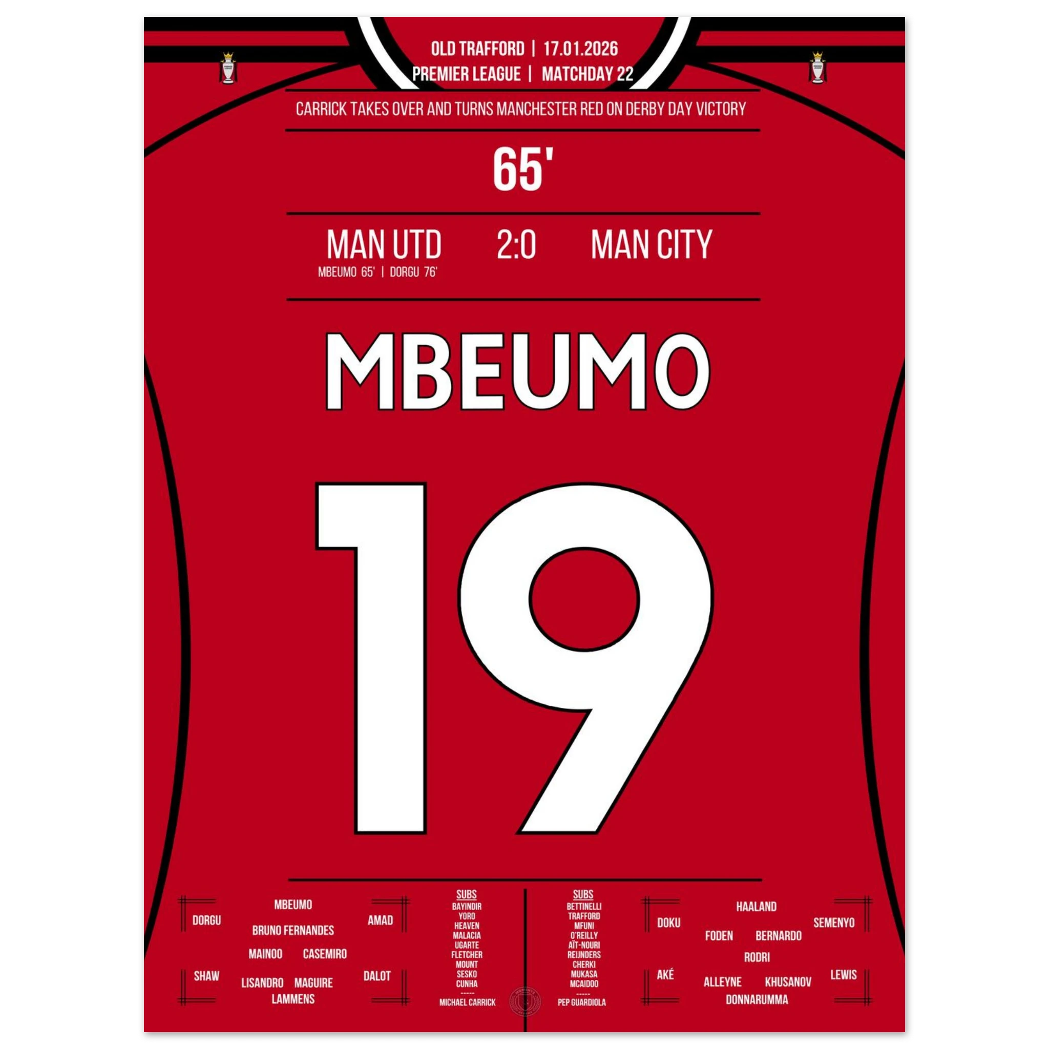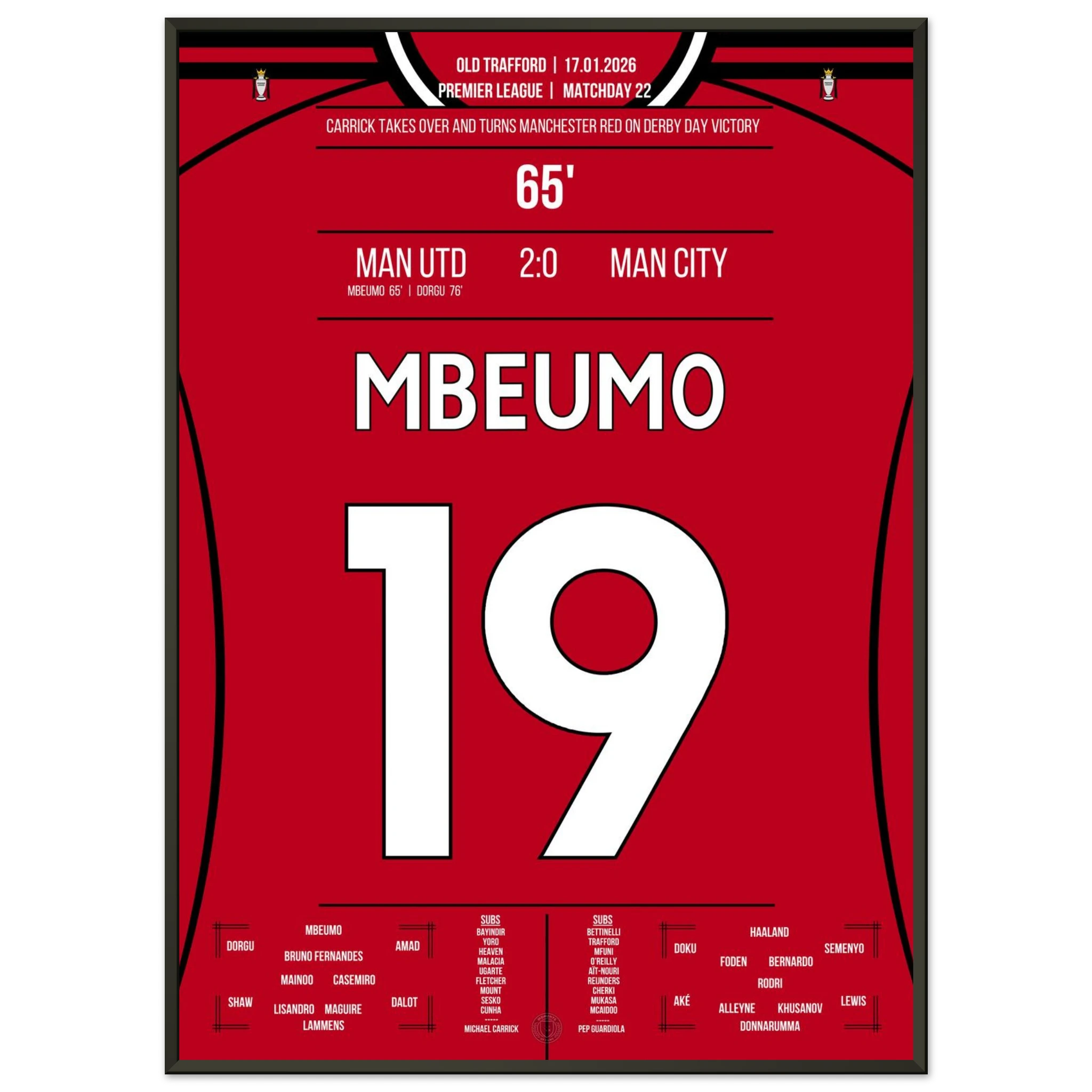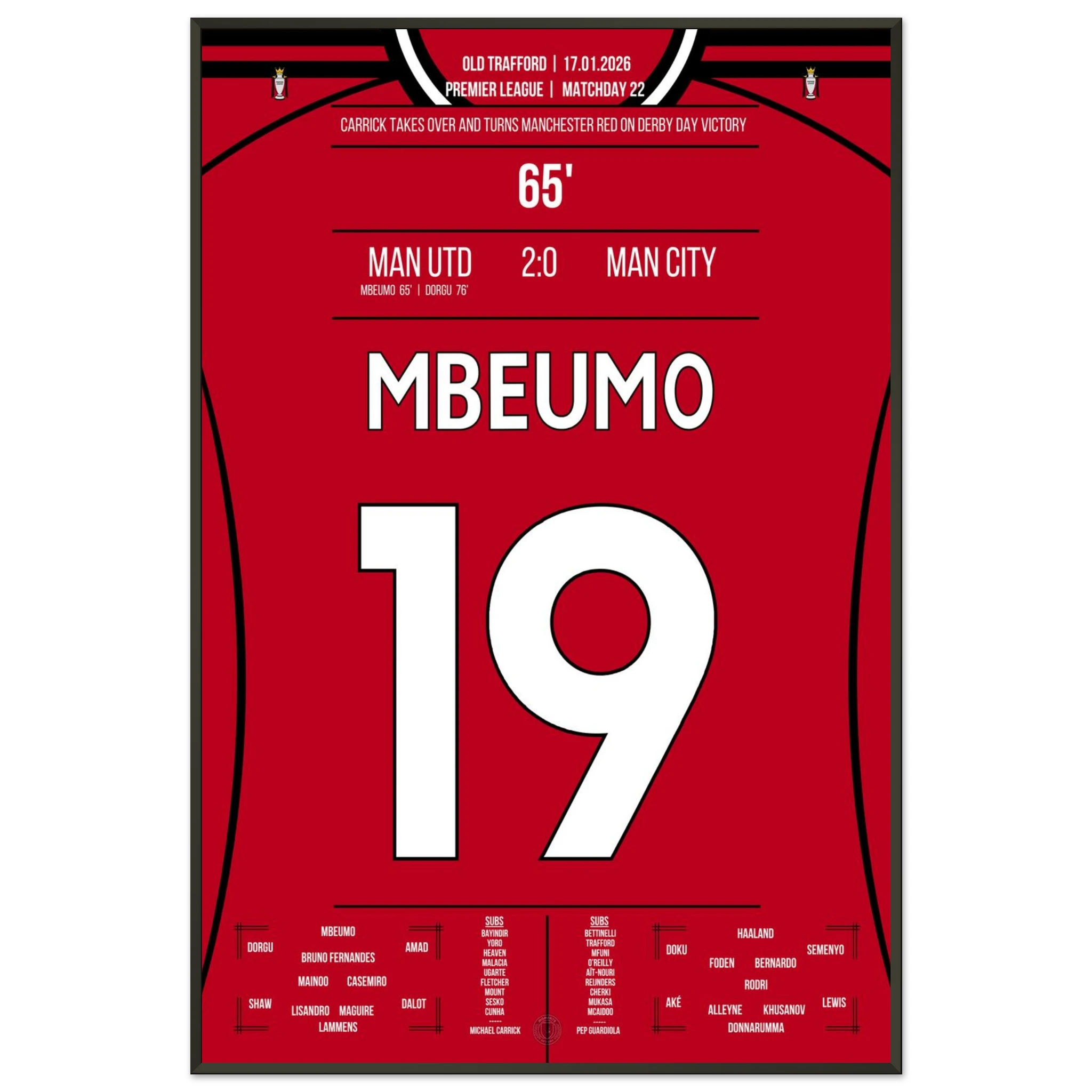Dieses Poster feiert den Moment, in dem Mbeumo mit einem Schlag das rote Manchester zum Jubeln brachte – Derbyglanz für die Ewigkeit.