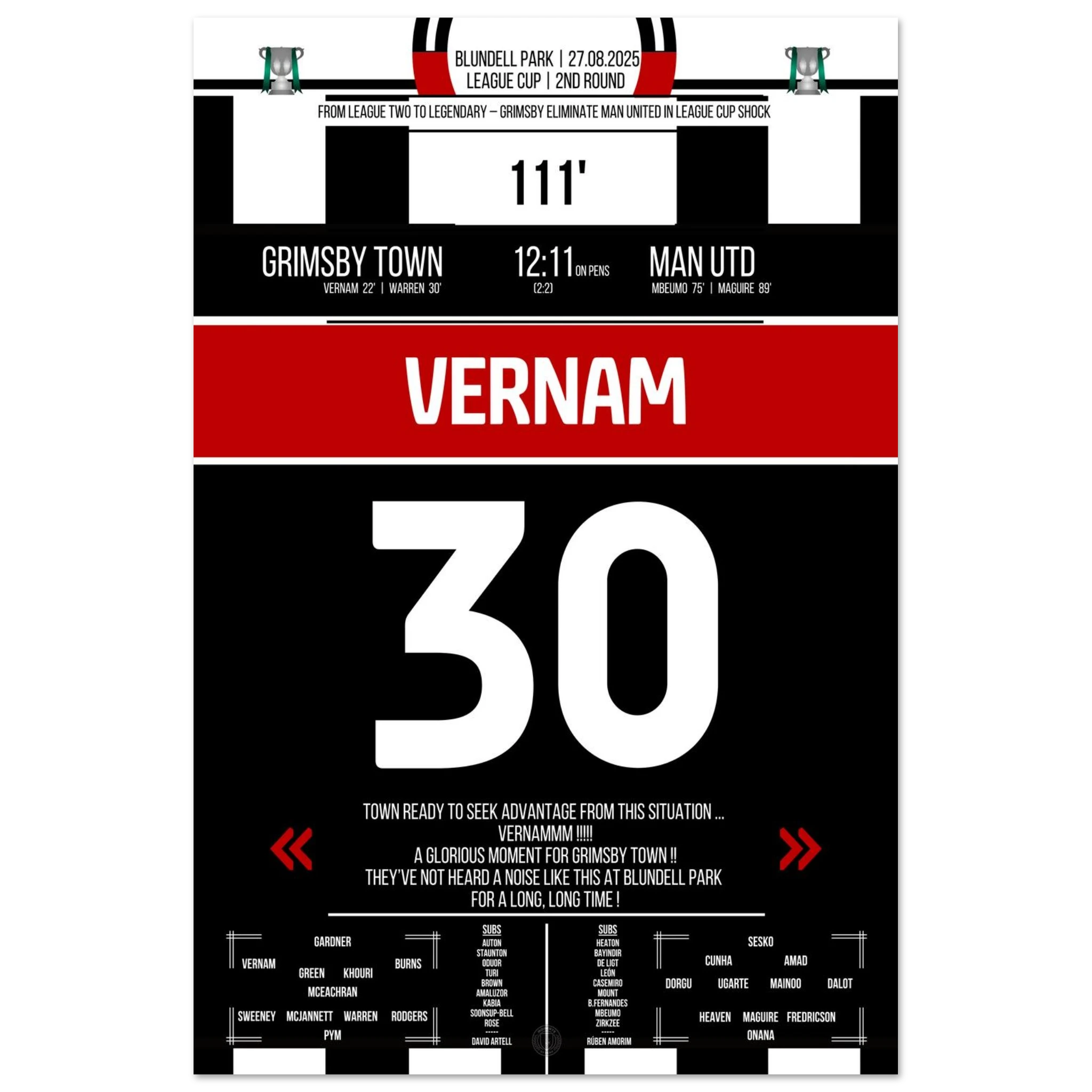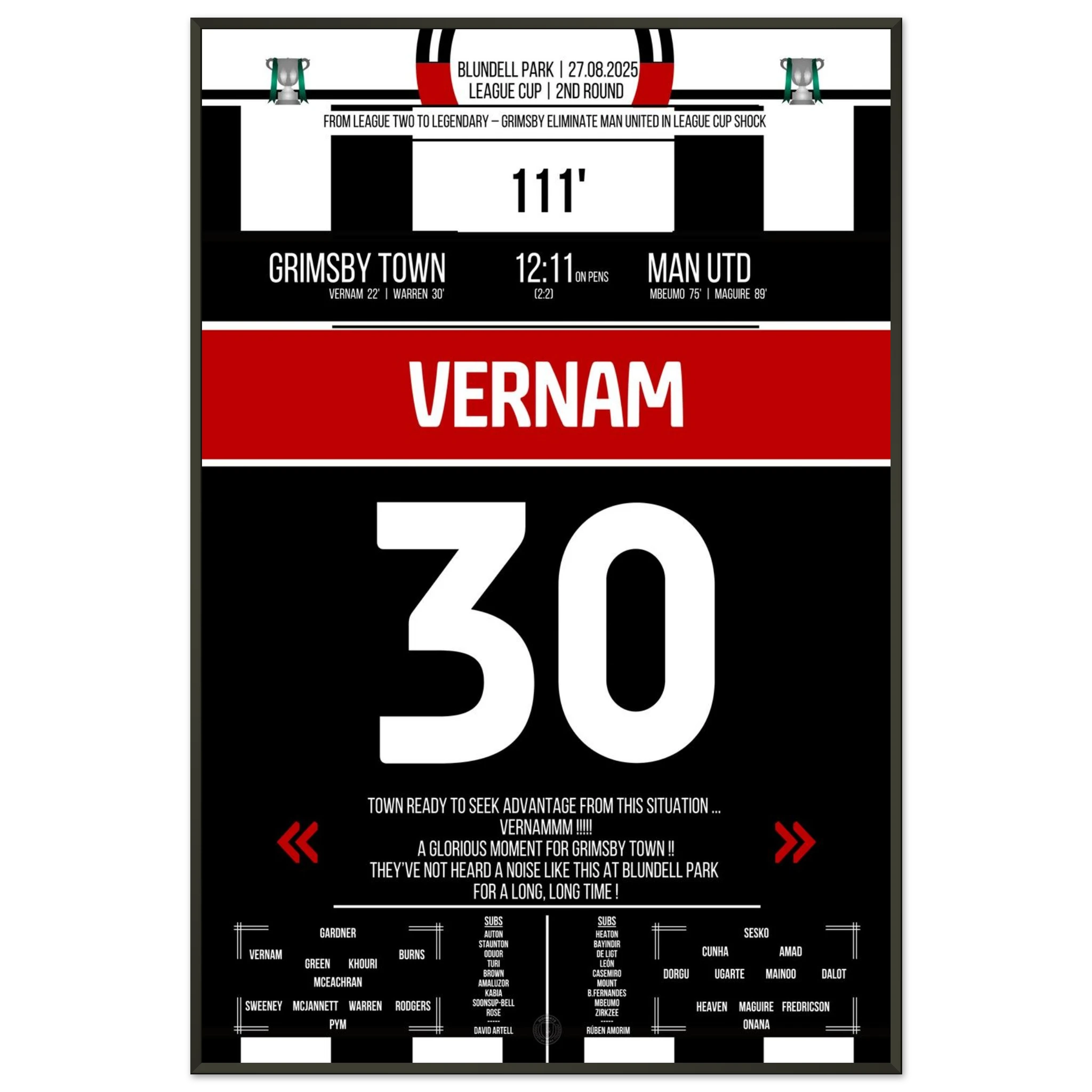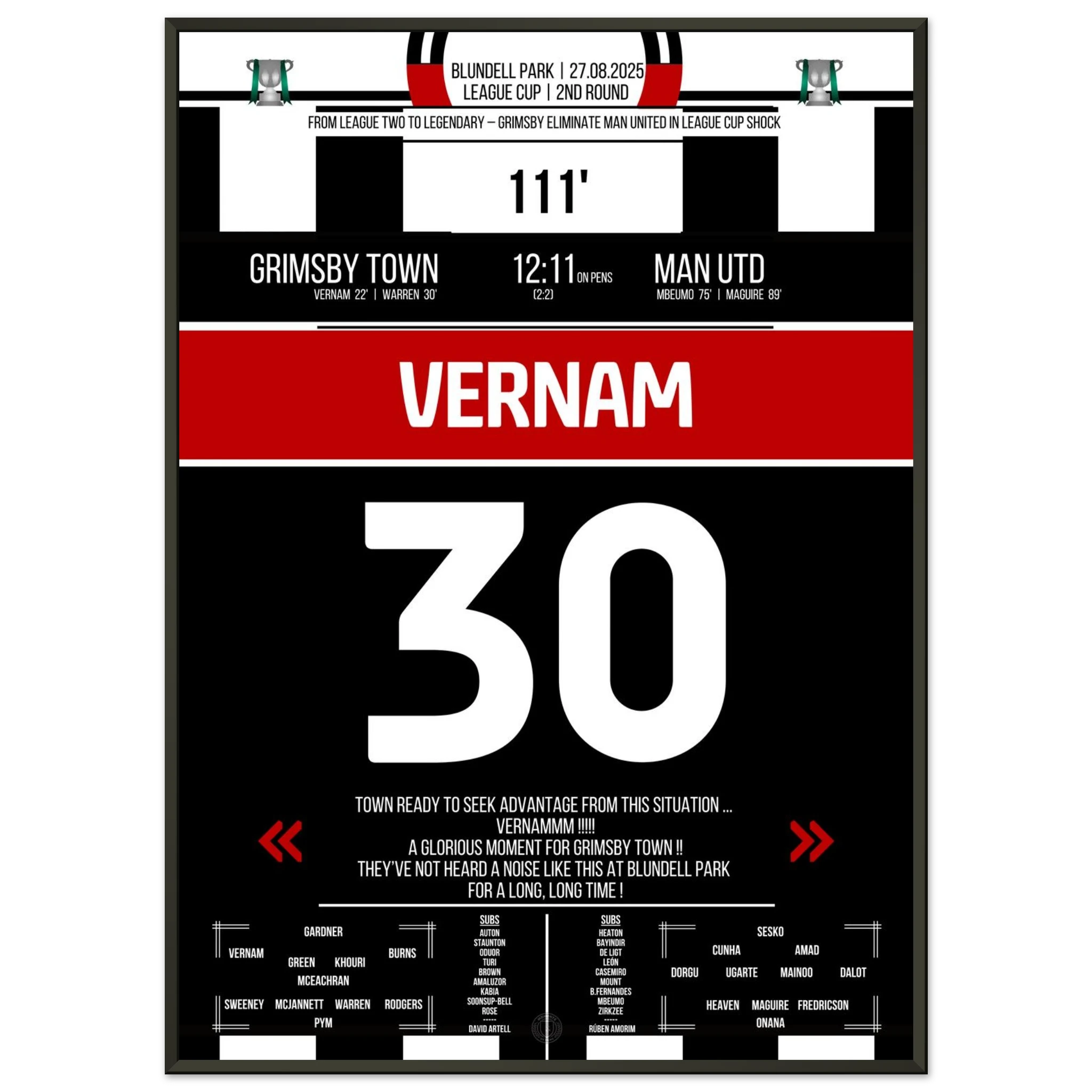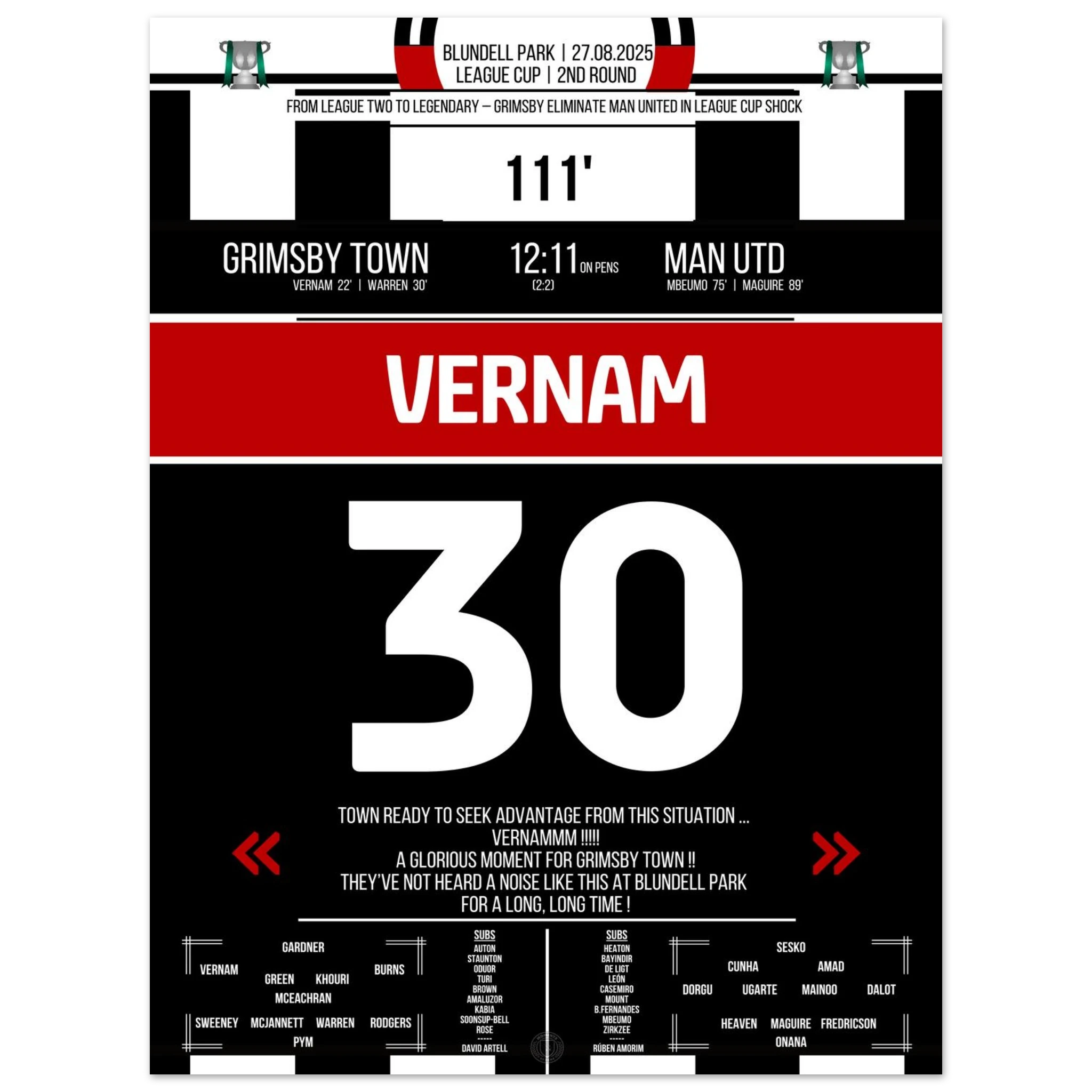 Unser Poster feiert diesen unvergesslichen Abend – der Moment, in dem ganz Grimsby an Wunder glaubte. ⚫⚪✨