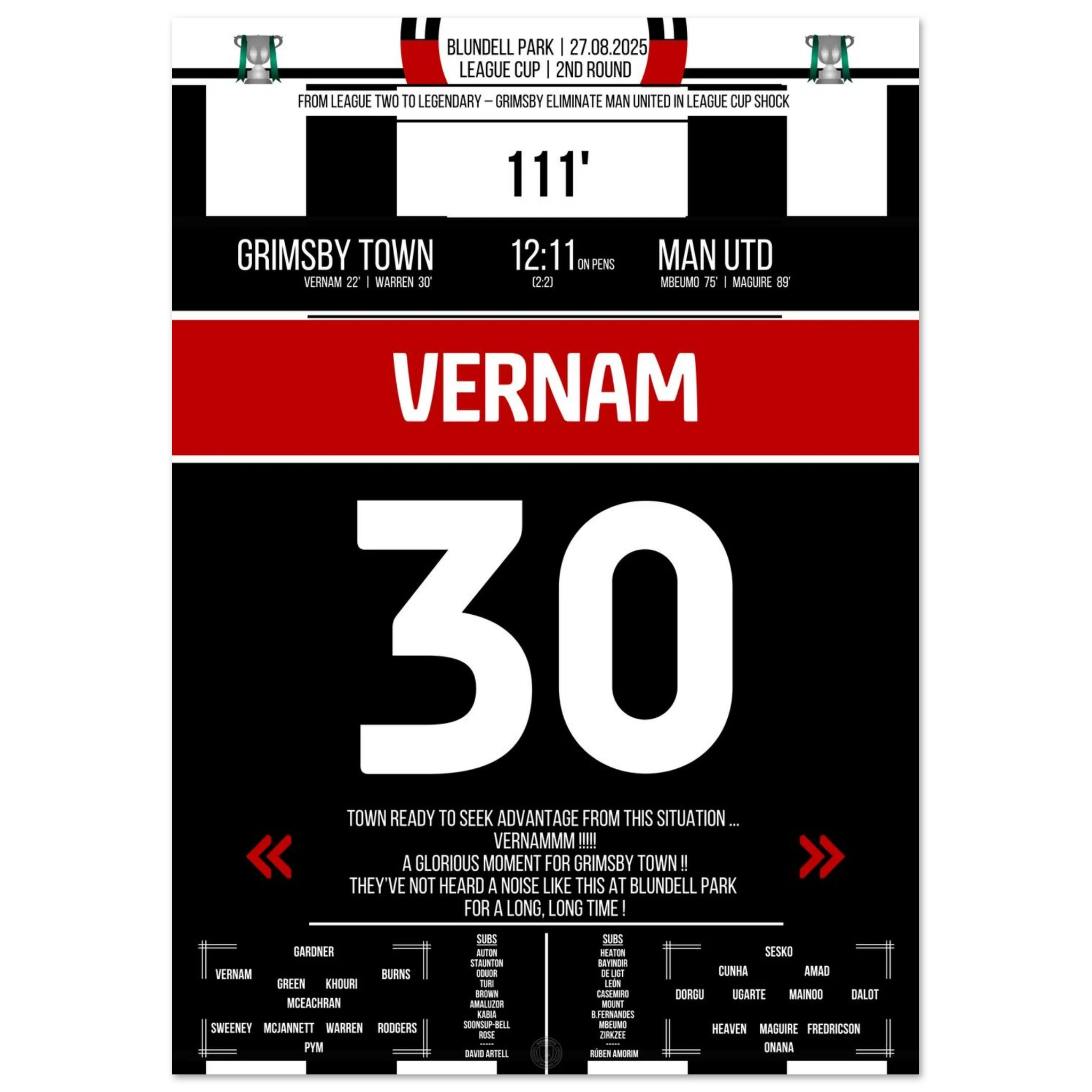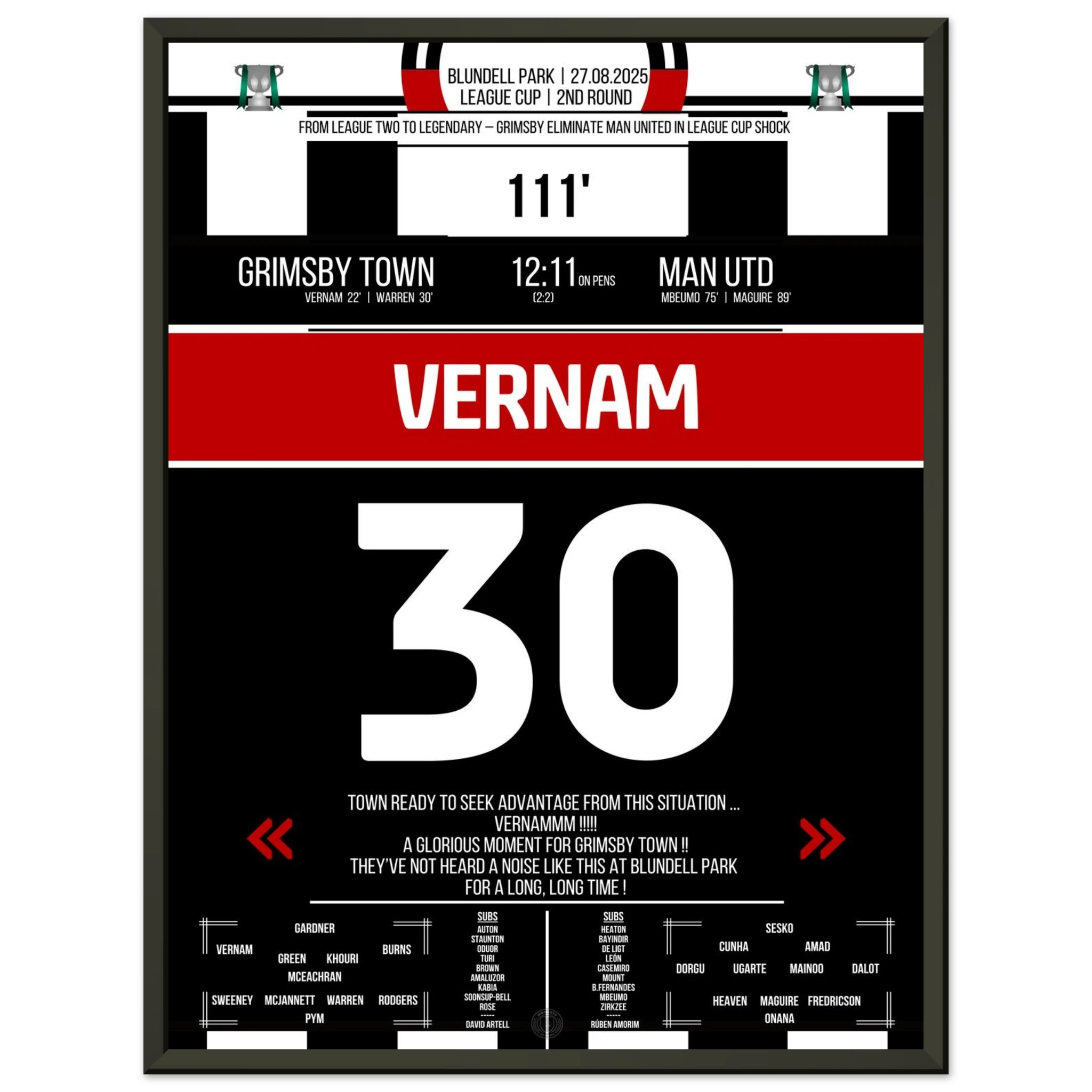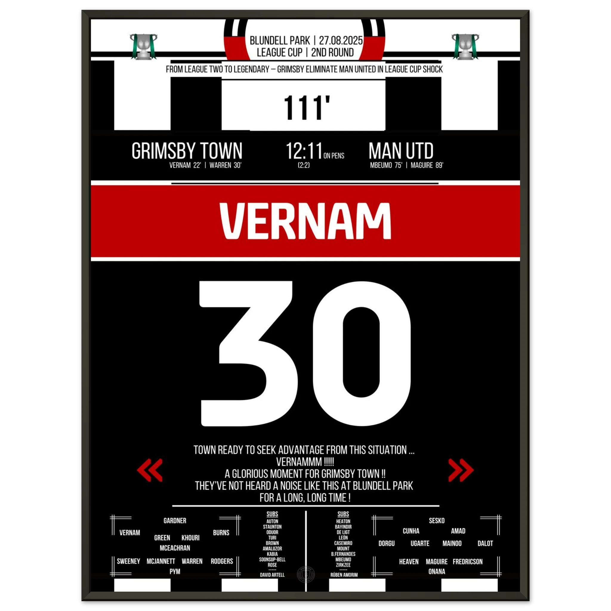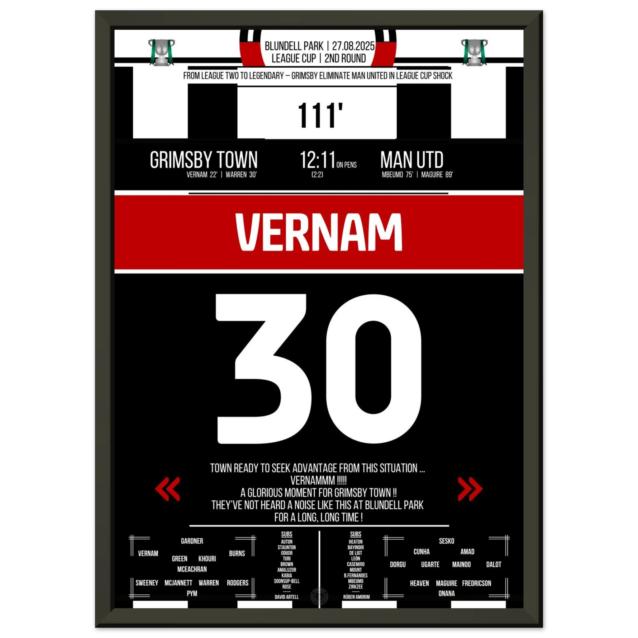 Unser Poster feiert diesen unvergesslichen Abend – der Moment, in dem ganz Grimsby an Wunder glaubte. ⚫⚪✨