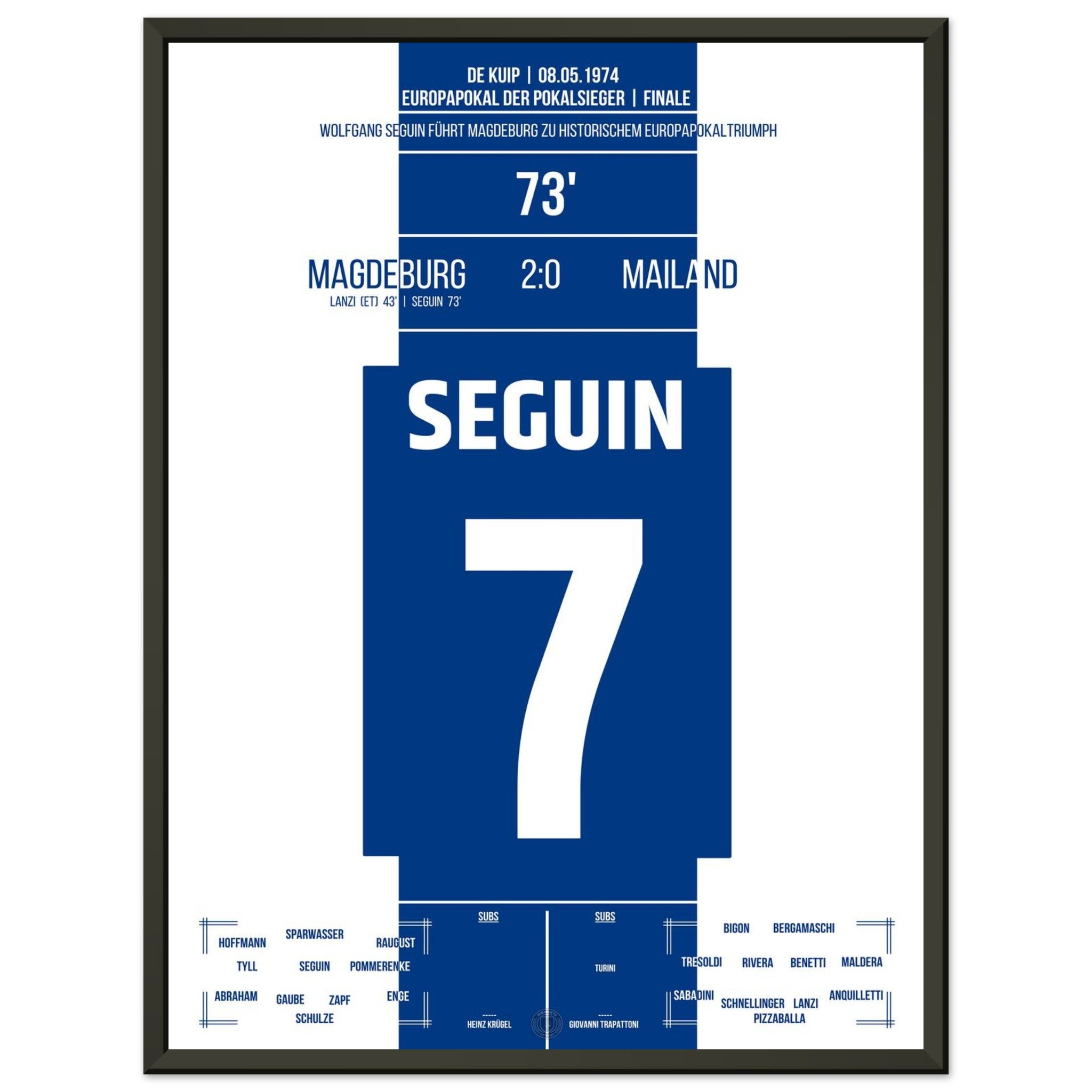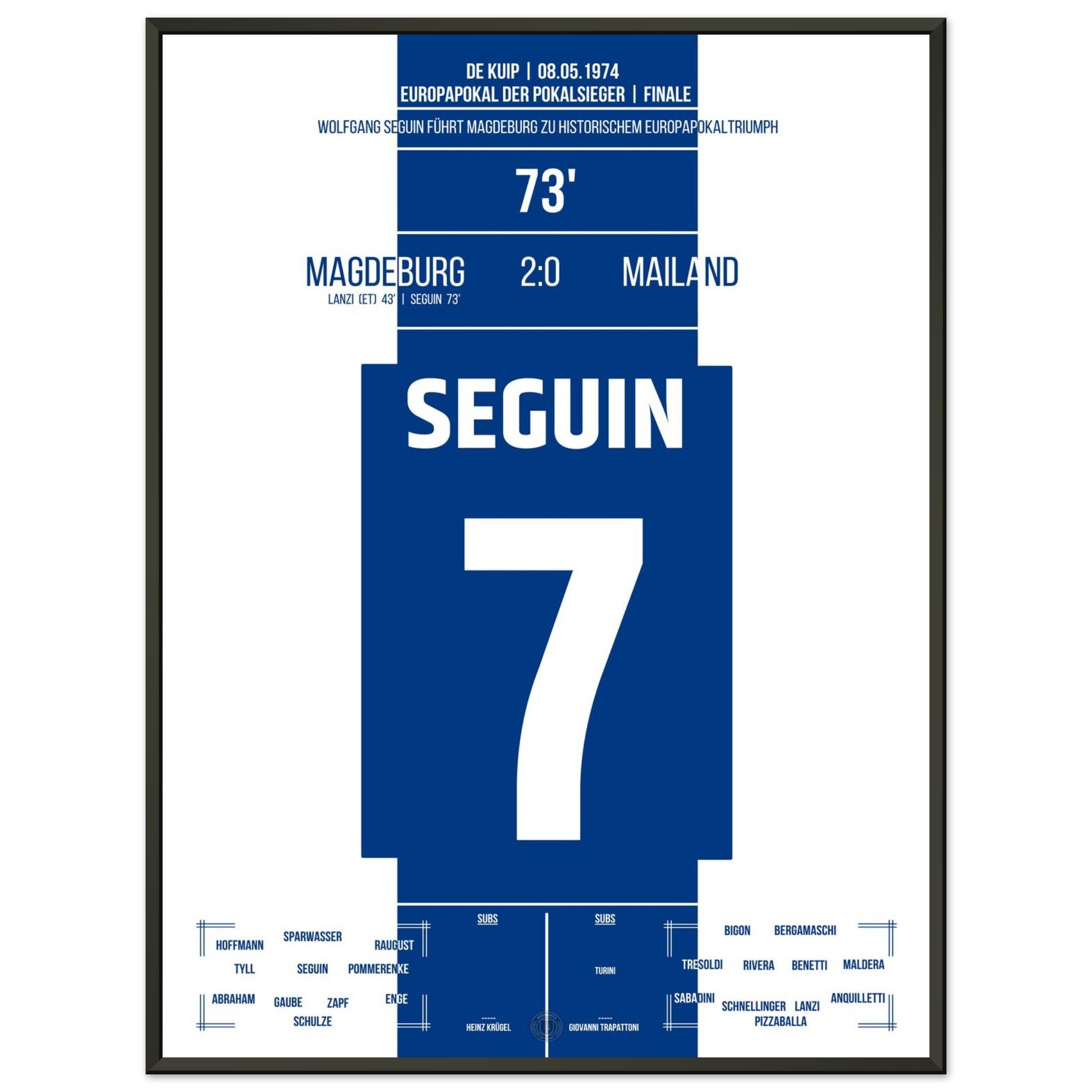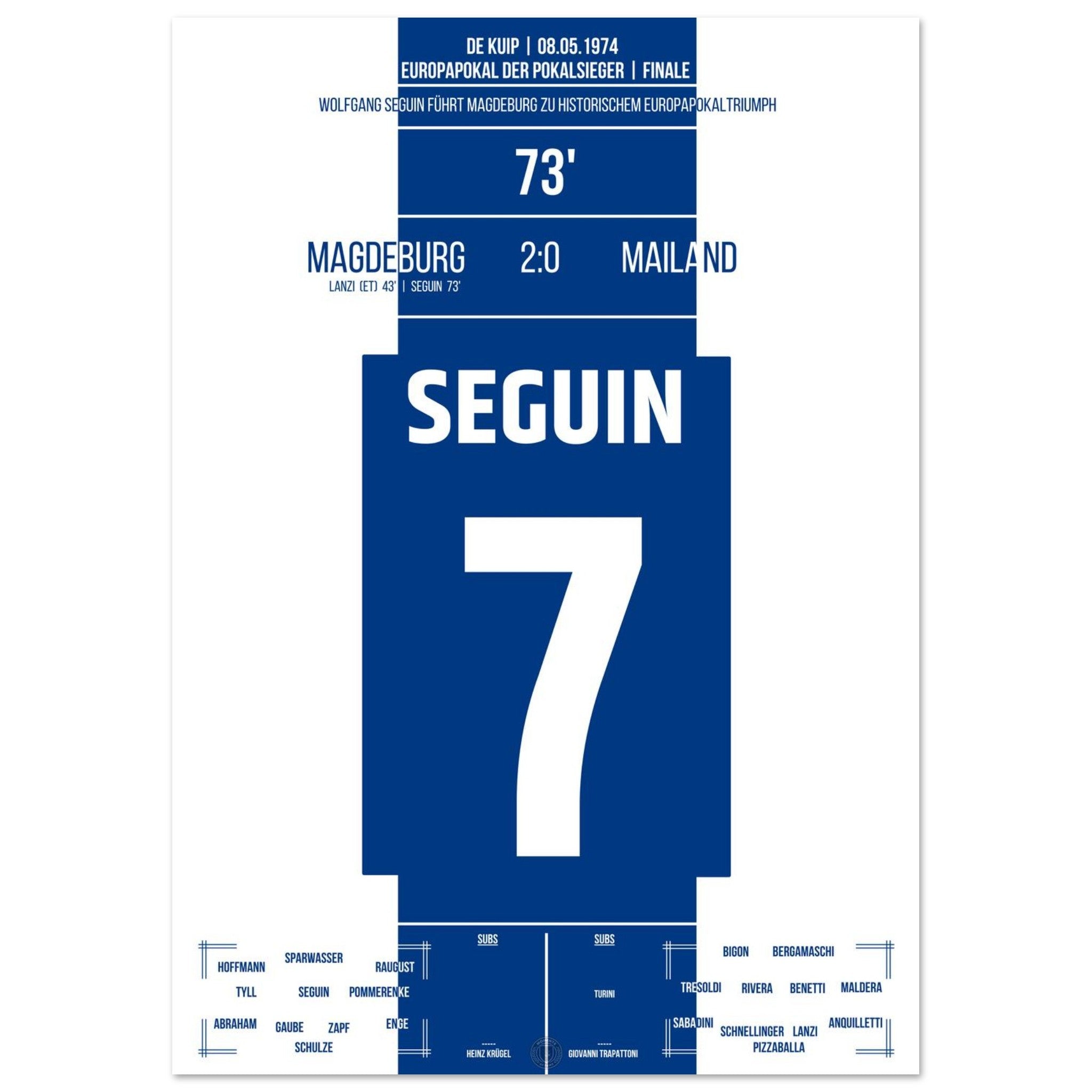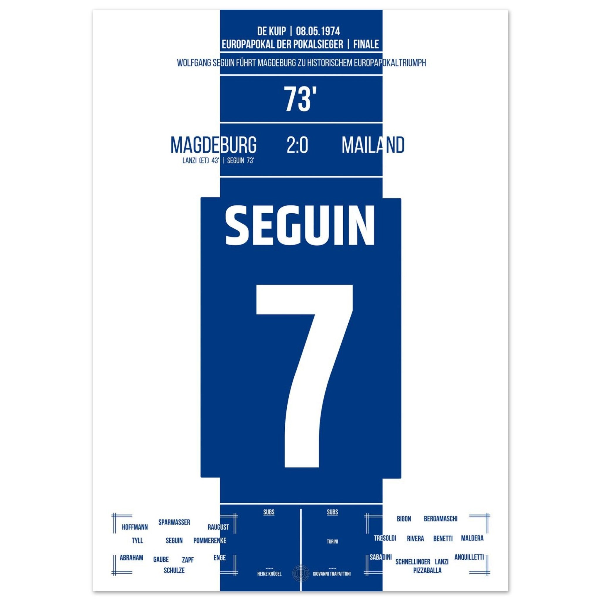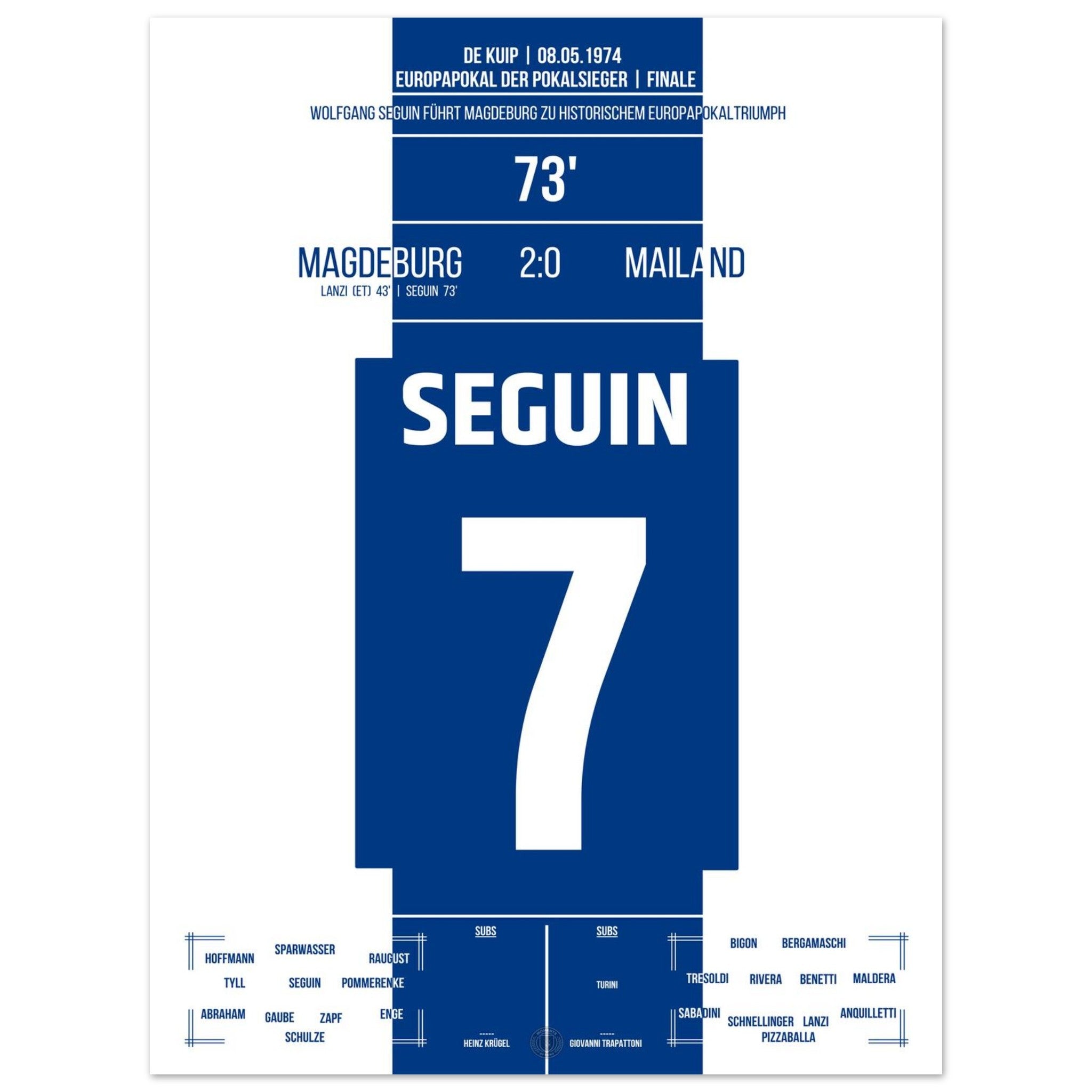 8. Mai 1974 – Magdeburg vs. Mailand 2:0: Im Finale des Europapokals der Pokalsieger besiegt Magdeburg den Mailand mit 2:0 – dank eines Eigentors und dem Treffer von Wolfgang Seguin. Vor über 7.000 mitgereisten Fans schreibt der Club aus der DDR Fußballgeschichte und holt als einziger ostdeutscher Verein einen Europapokal. Unser Poster verewigt diesen größten Triumph der Vereinsgeschichte.