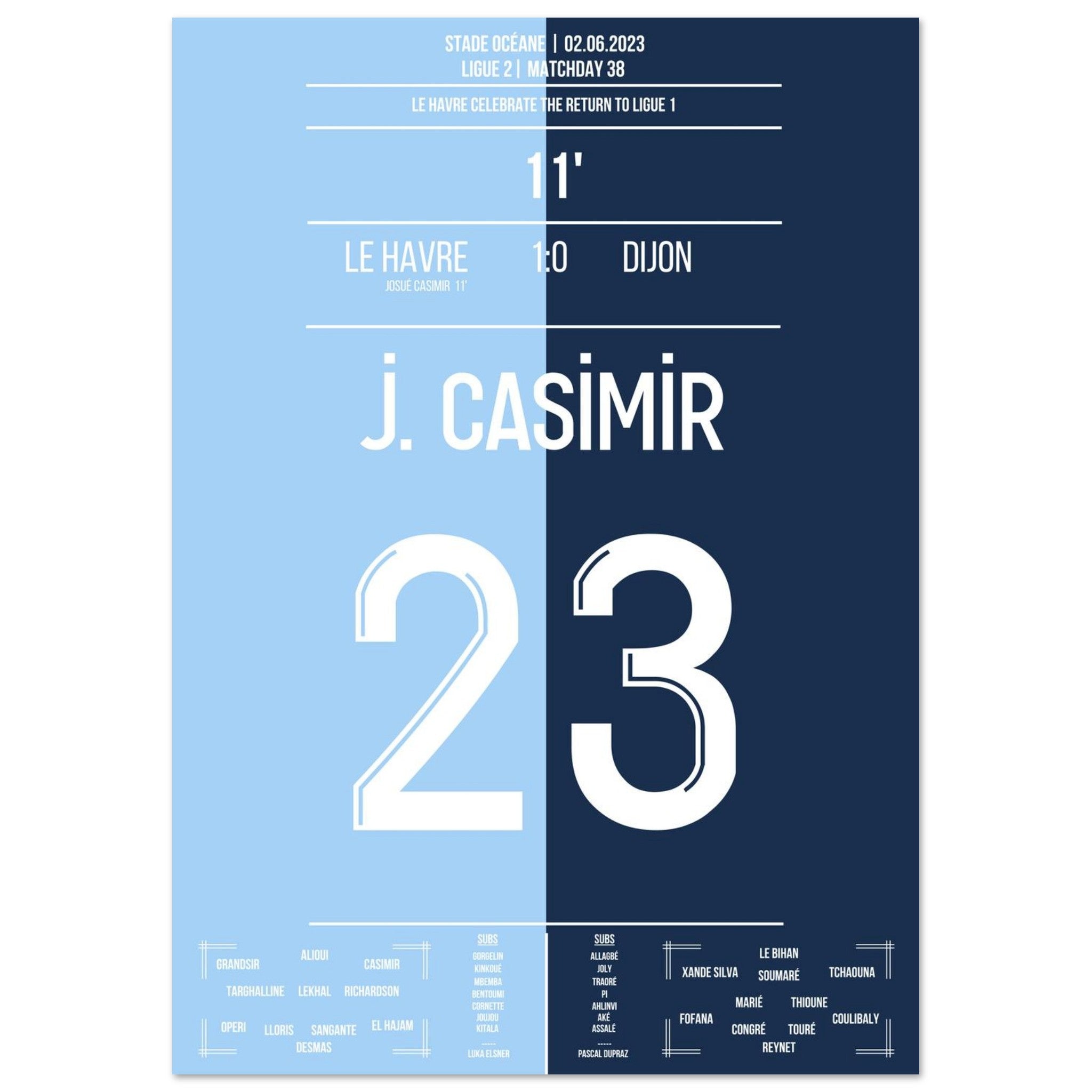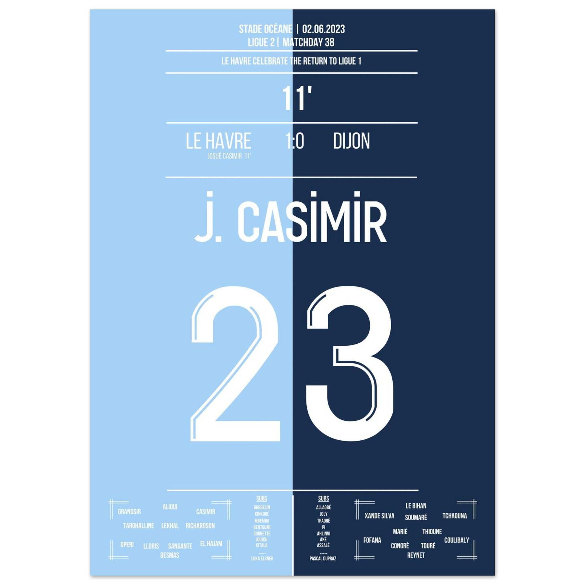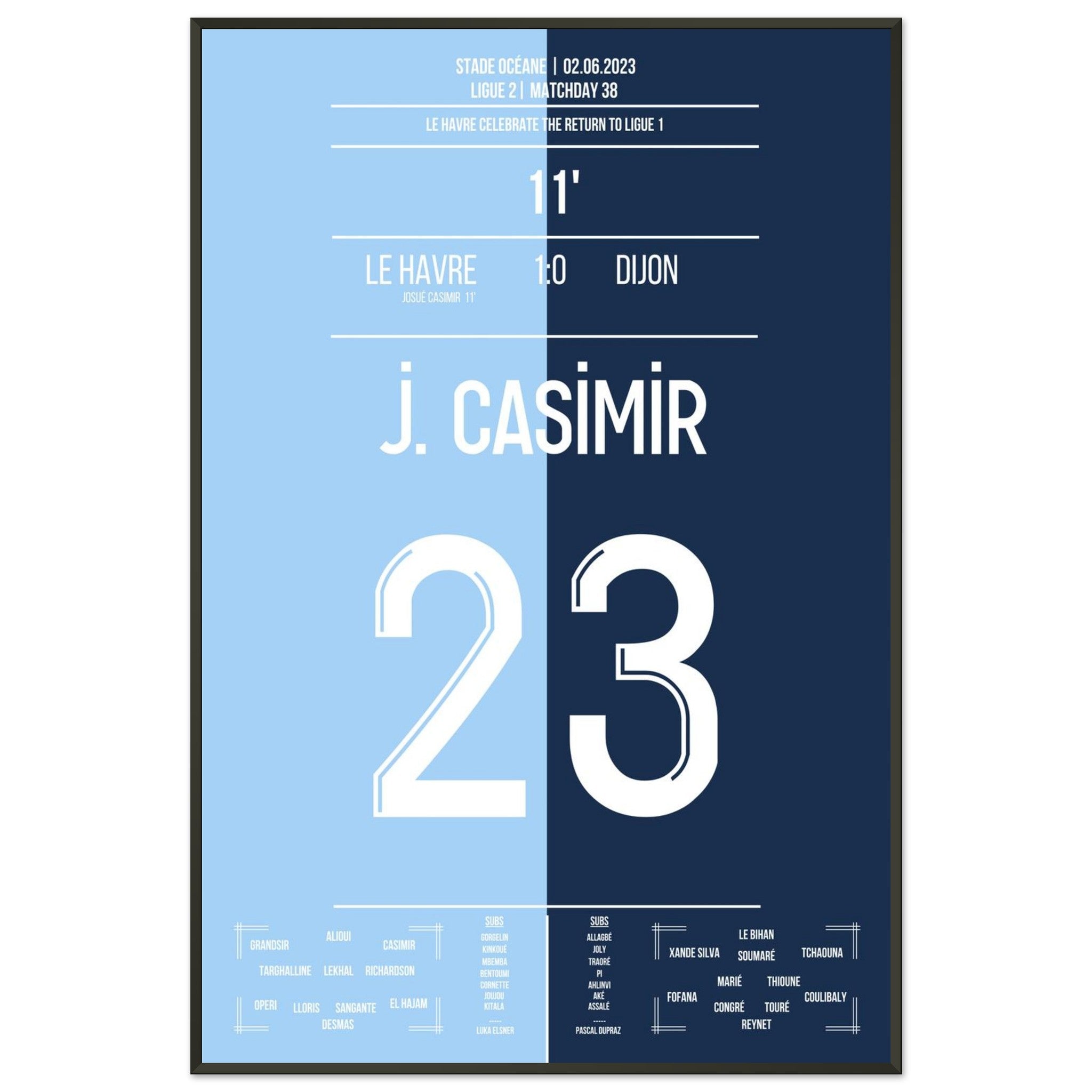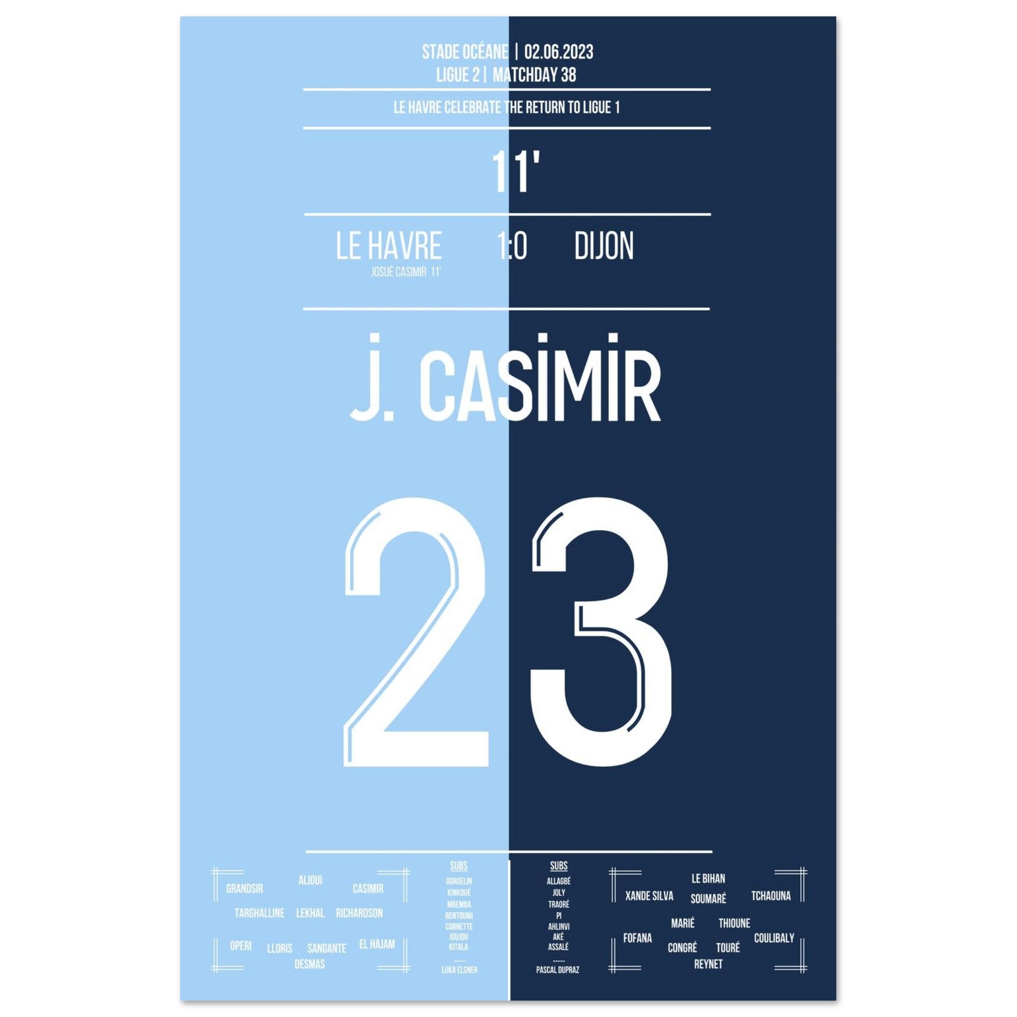02. Juni 2023 – Le Havre vs. Dijon 1:0: Vor heimischer Kulisse krönt sich Le Havre zum Zweitligameister – dank des entscheidenden Treffers von Josué Casimir. In einer Saison voller Disziplin und Konstanz markiert sein Tor den Moment des Aufstiegs. Unser Poster hält den Augenblick fest, in dem ein ganzes Stadion vor Freude explodierte.