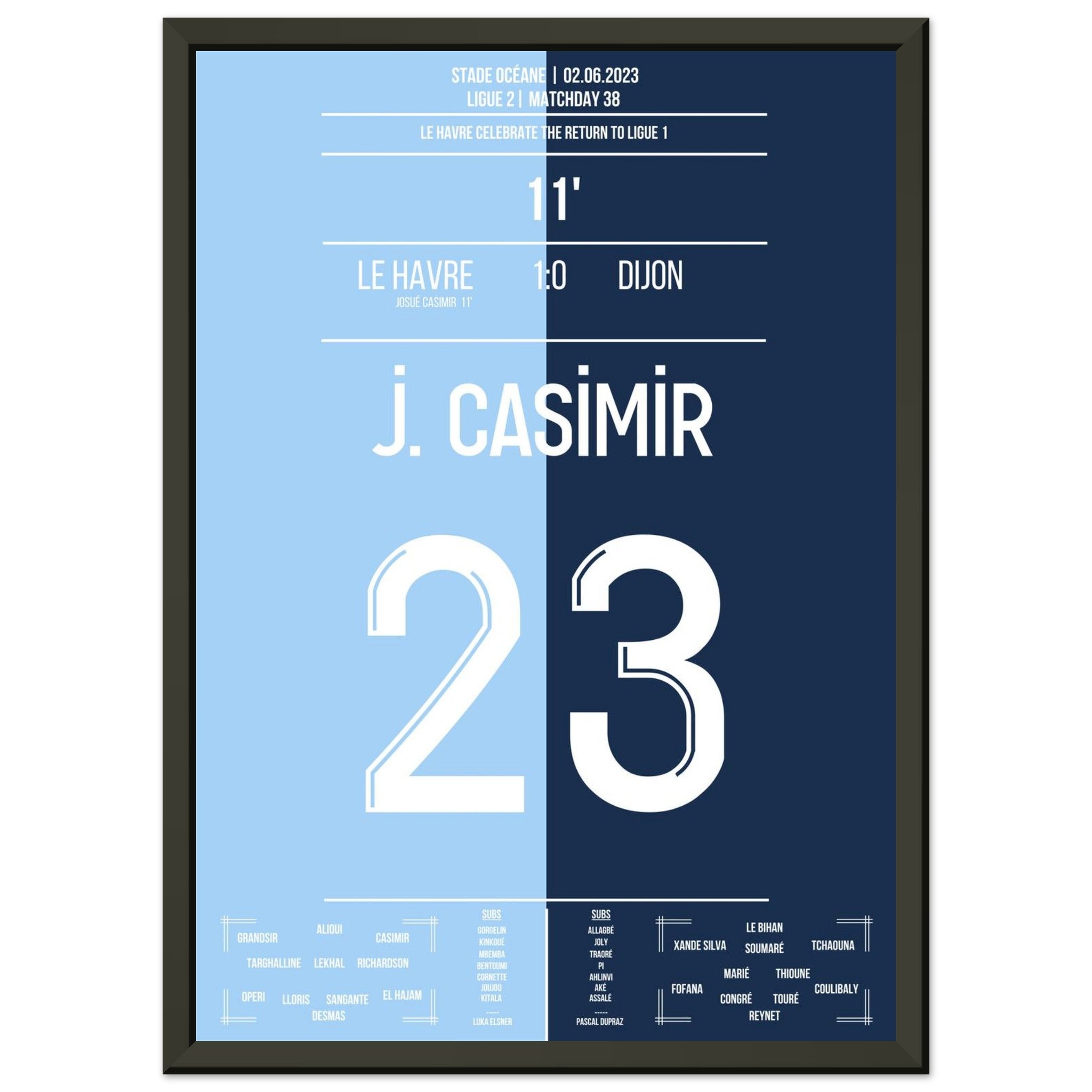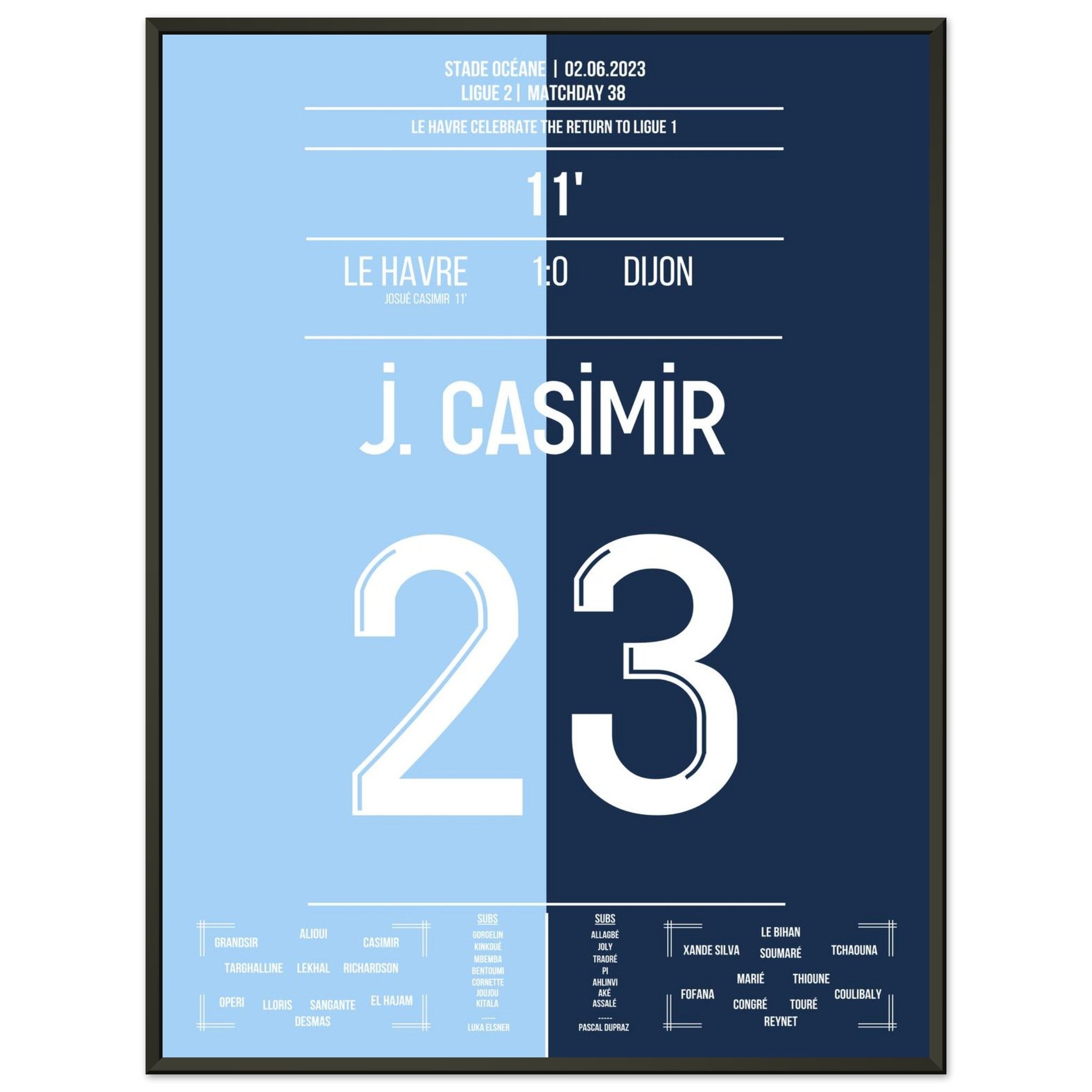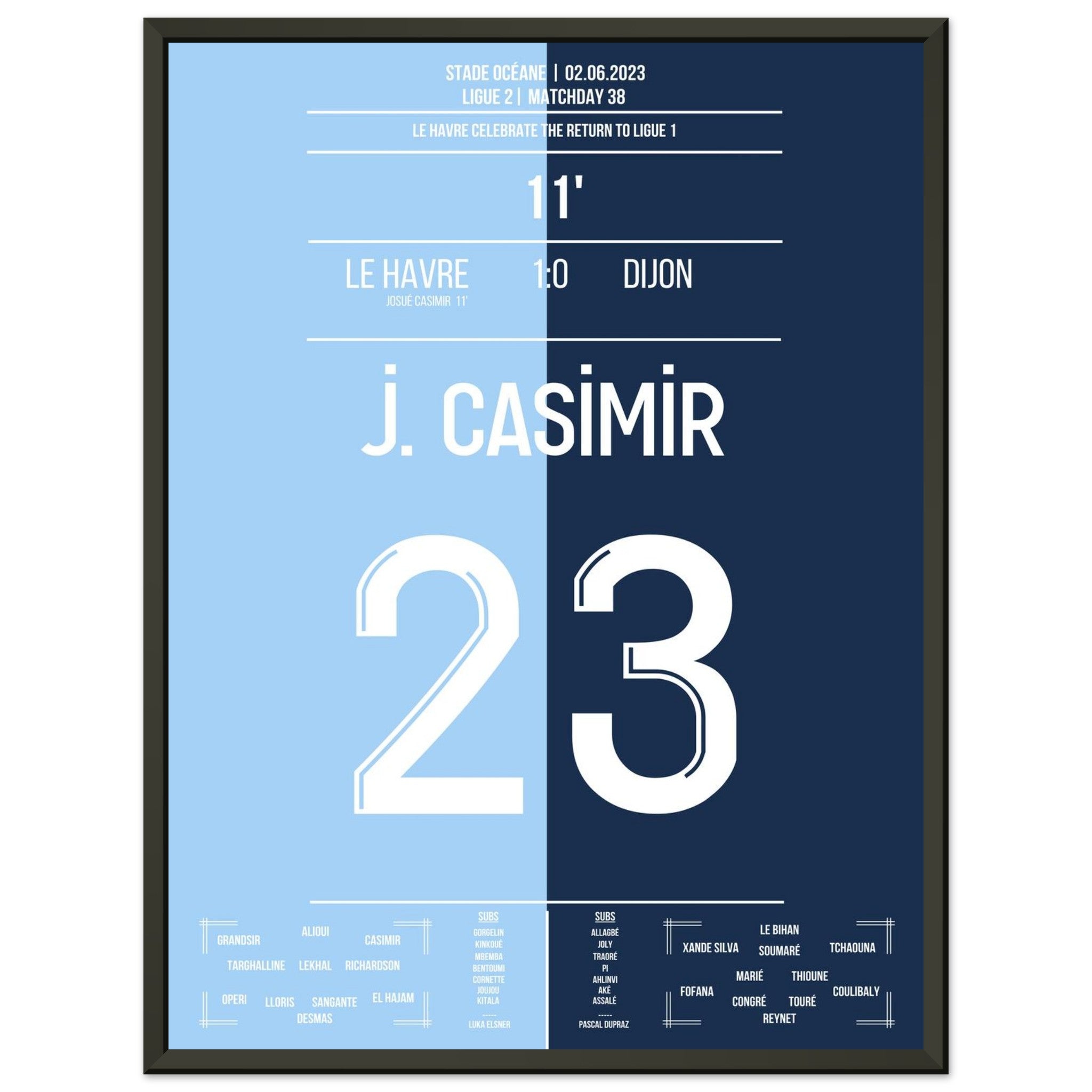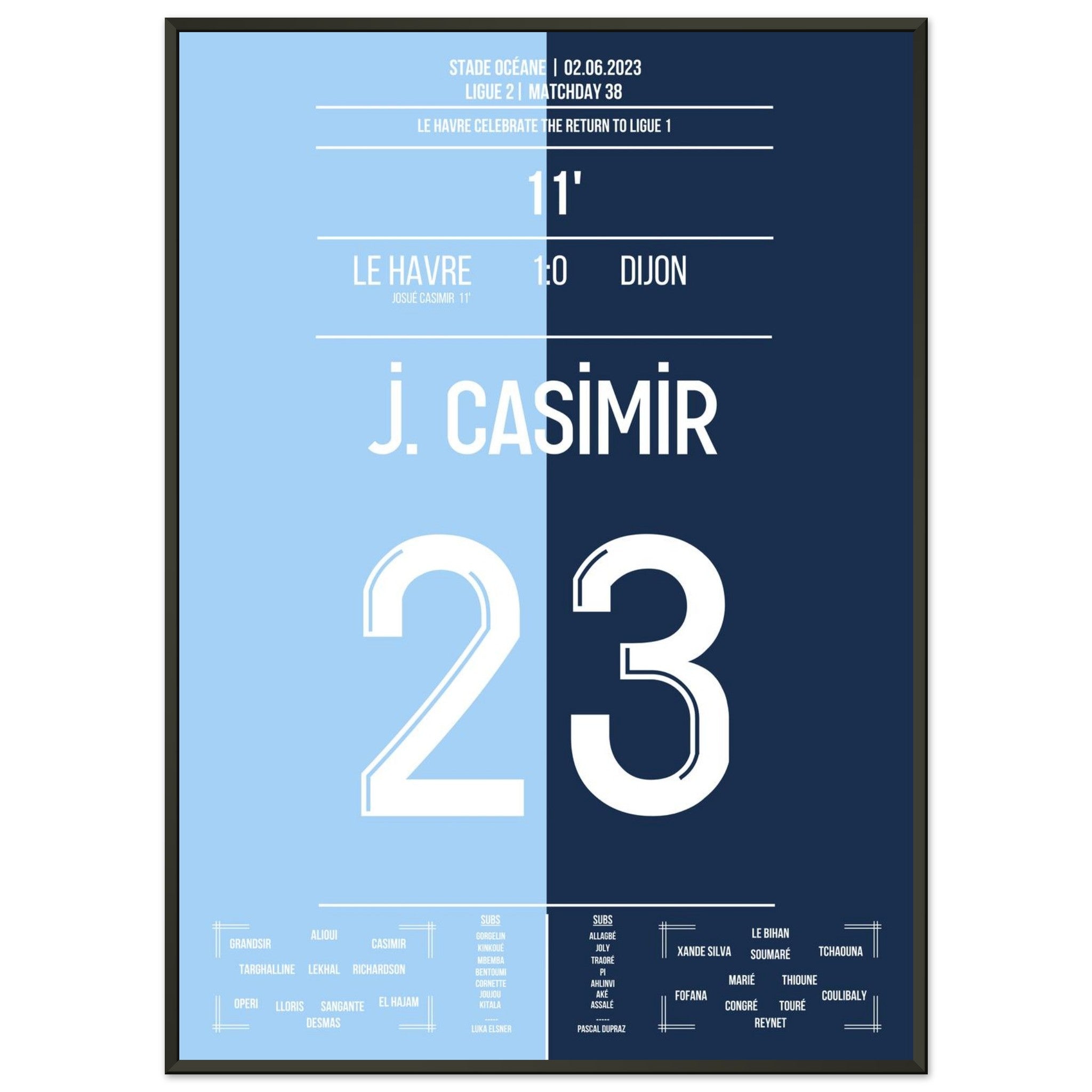 02. Juni 2023 – Le Havre vs. Dijon 1:0: Vor heimischer Kulisse krönt sich Le Havre zum Zweitligameister – dank des entscheidenden Treffers von Josué Casimir. In einer Saison voller Disziplin und Konstanz markiert sein Tor den Moment des Aufstiegs. Unser Poster hält den Augenblick fest, in dem ein ganzes Stadion vor Freude explodierte.