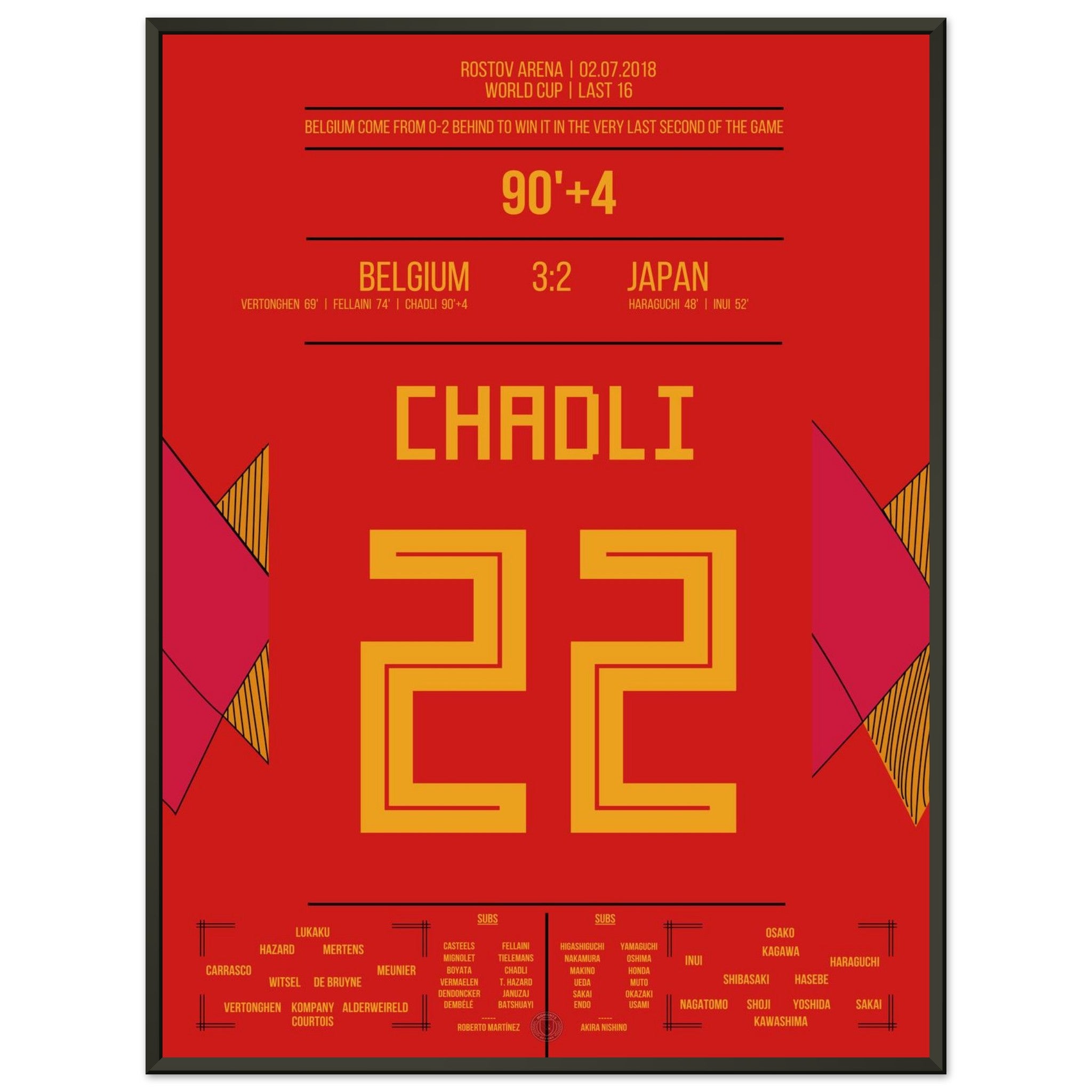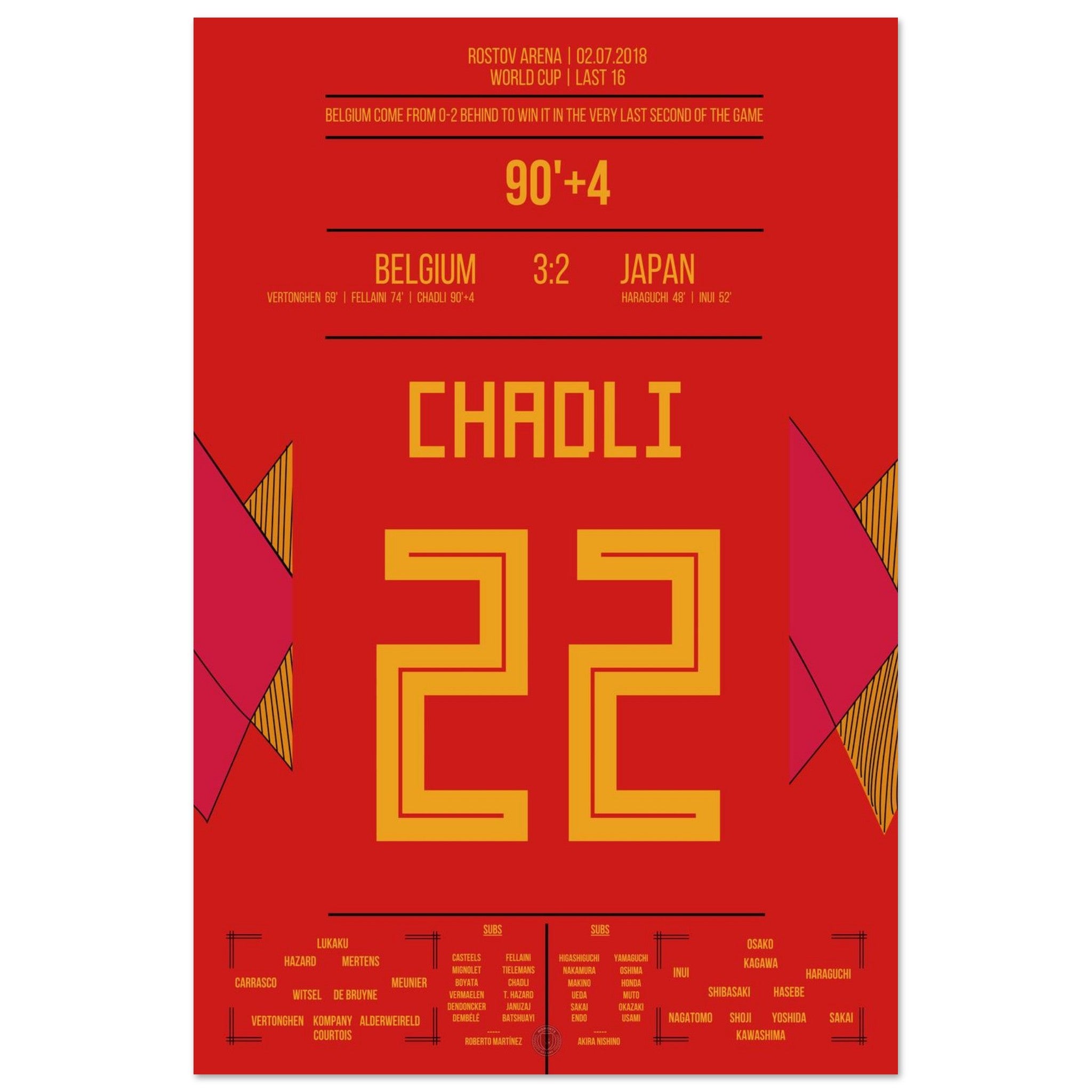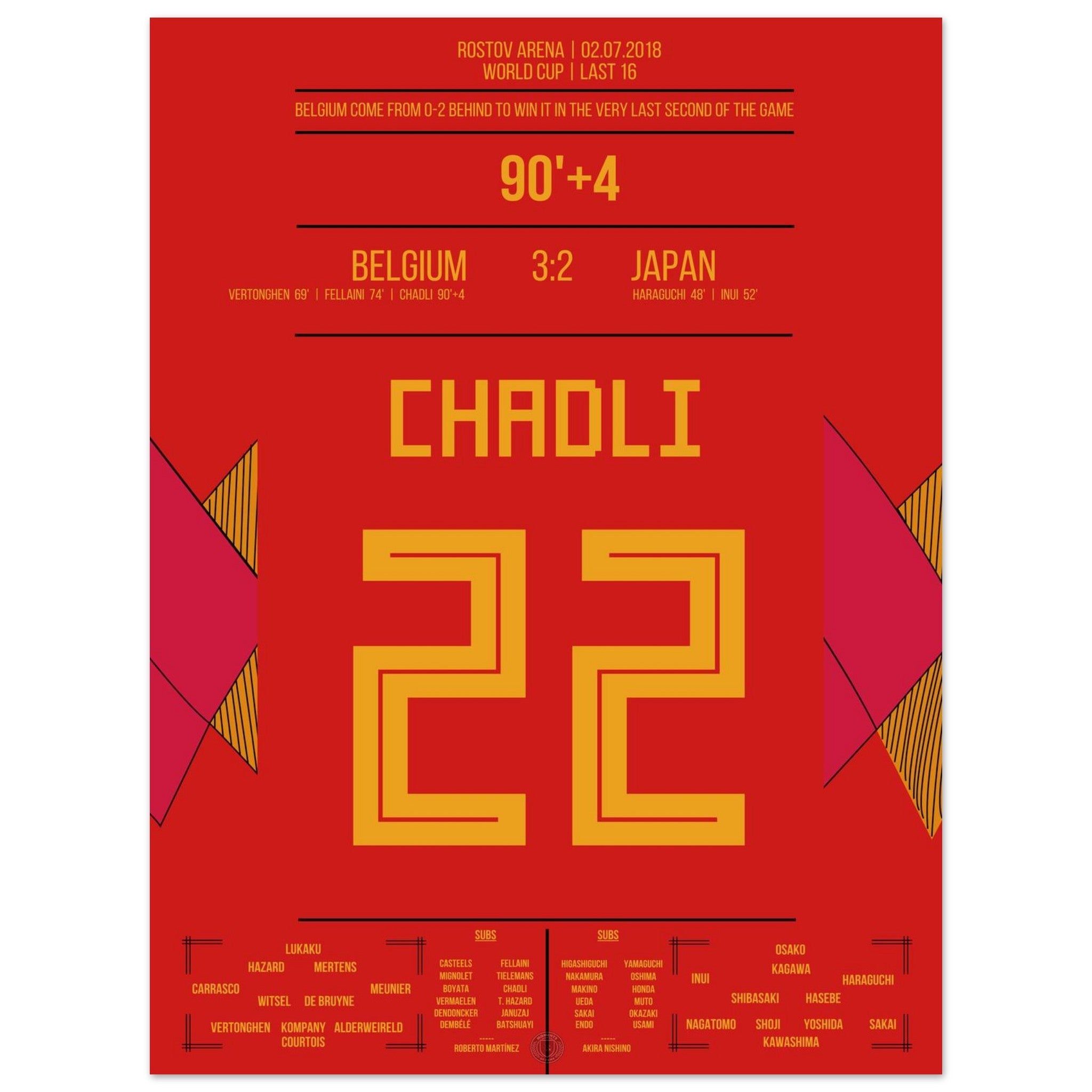 Ein WM-Spiel für die Ewigkeit: Japan führt sensationell 2:0, doch Belgien startet die große Aufholjagd. Vertonghen und Fellaini gleichen aus, bevor Chadli in der 94. Minute nach einem perfekten Konter den Sieg vollendet – das vielleicht schönste Last-Minute-Tor der Turniergeschichte.