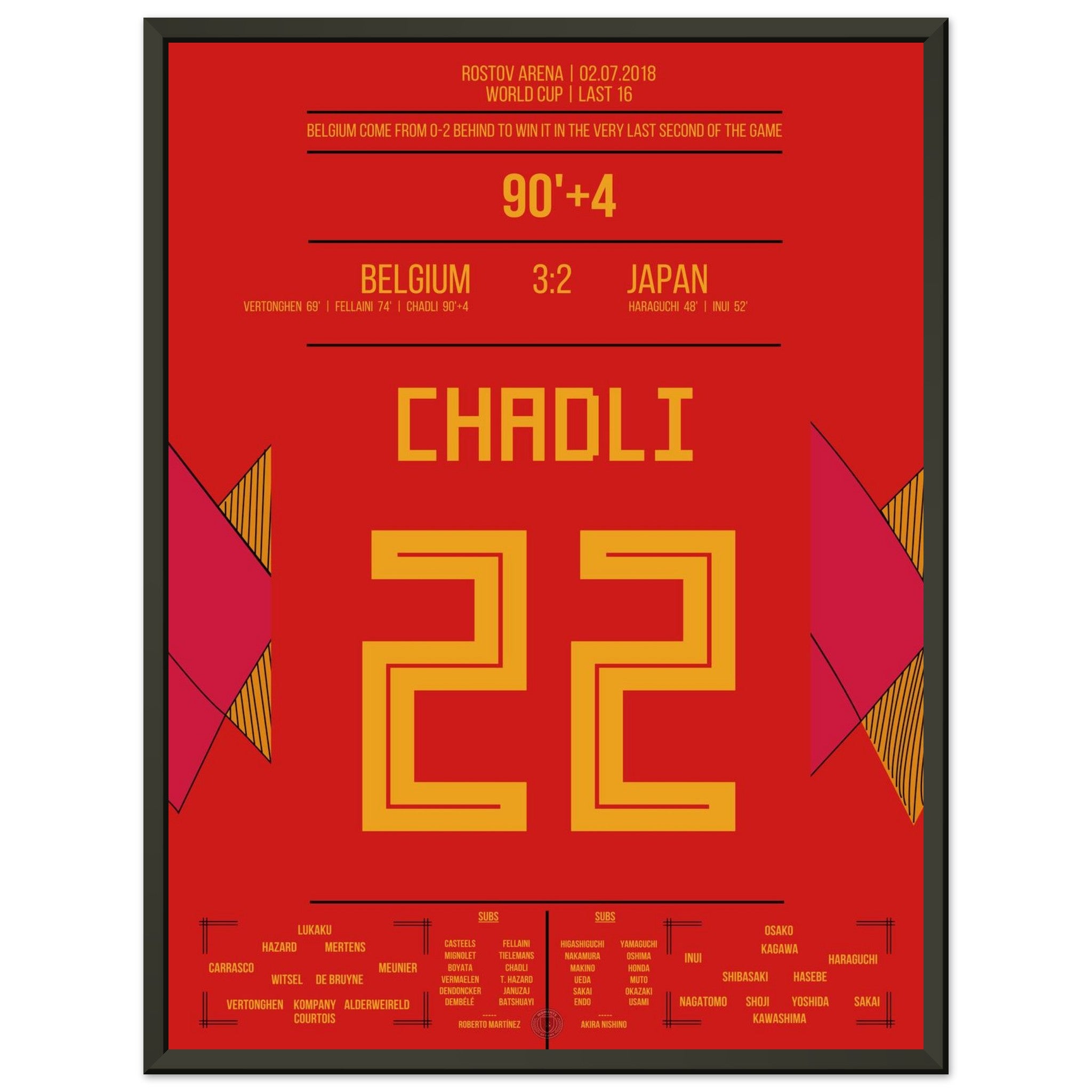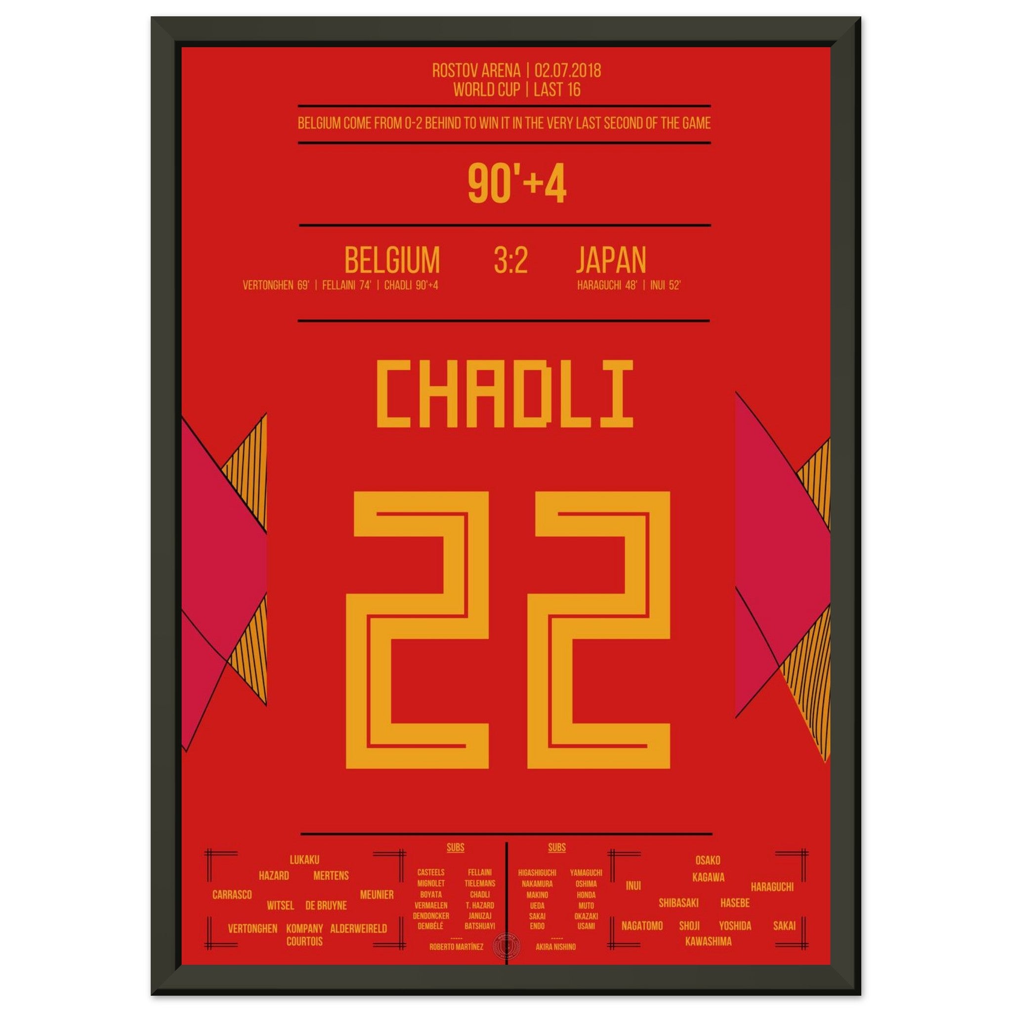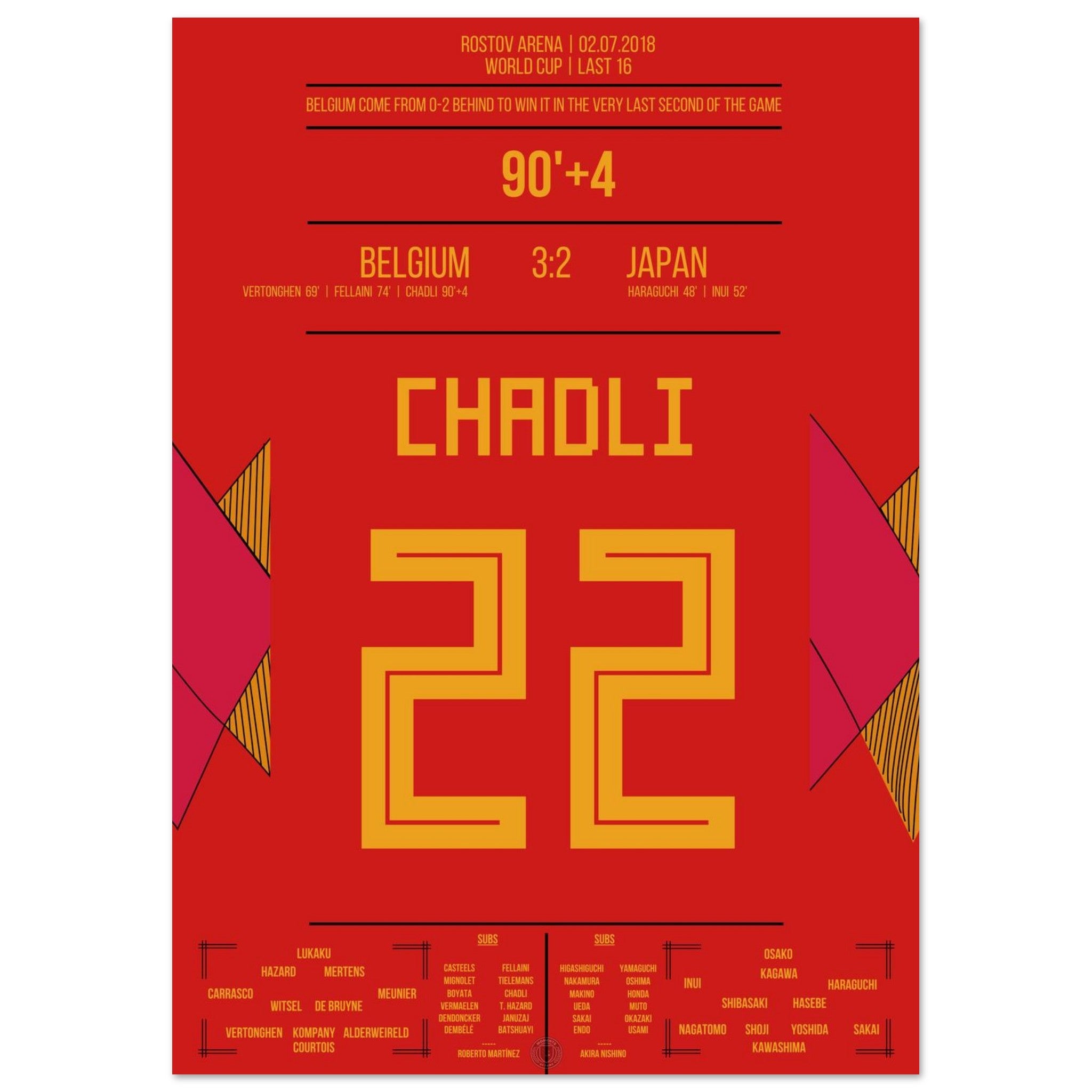Ein WM-Spiel für die Ewigkeit: Japan führt sensationell 2:0, doch Belgien startet die große Aufholjagd. Vertonghen und Fellaini gleichen aus, bevor Chadli in der 94. Minute nach einem perfekten Konter den Sieg vollendet – das vielleicht schönste Last-Minute-Tor der Turniergeschichte.