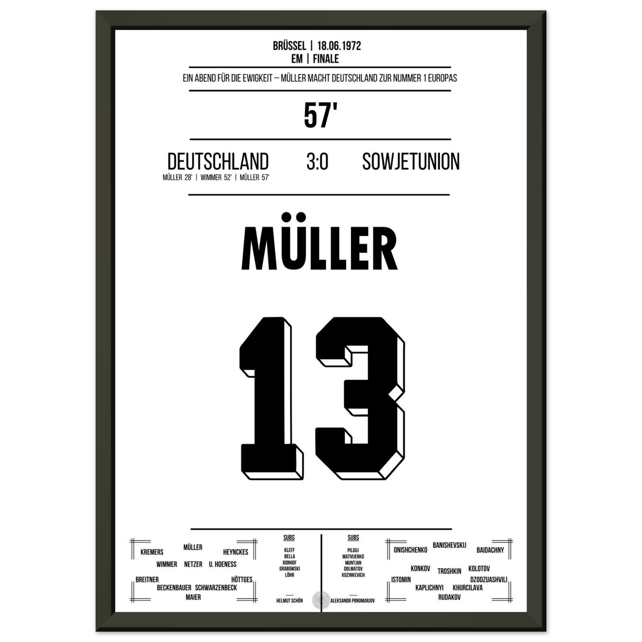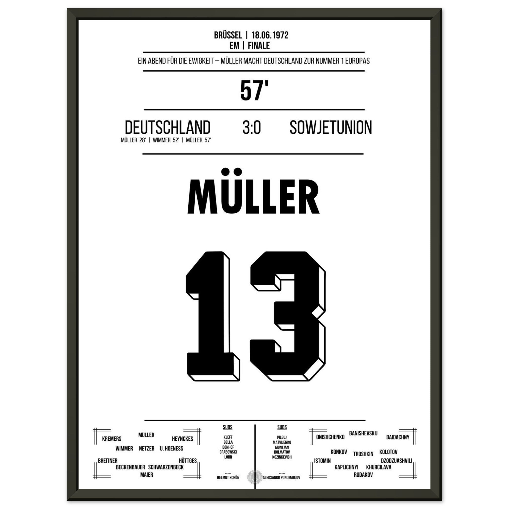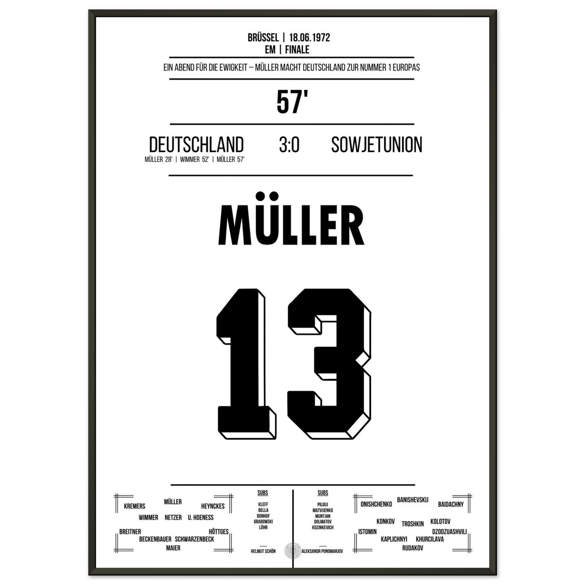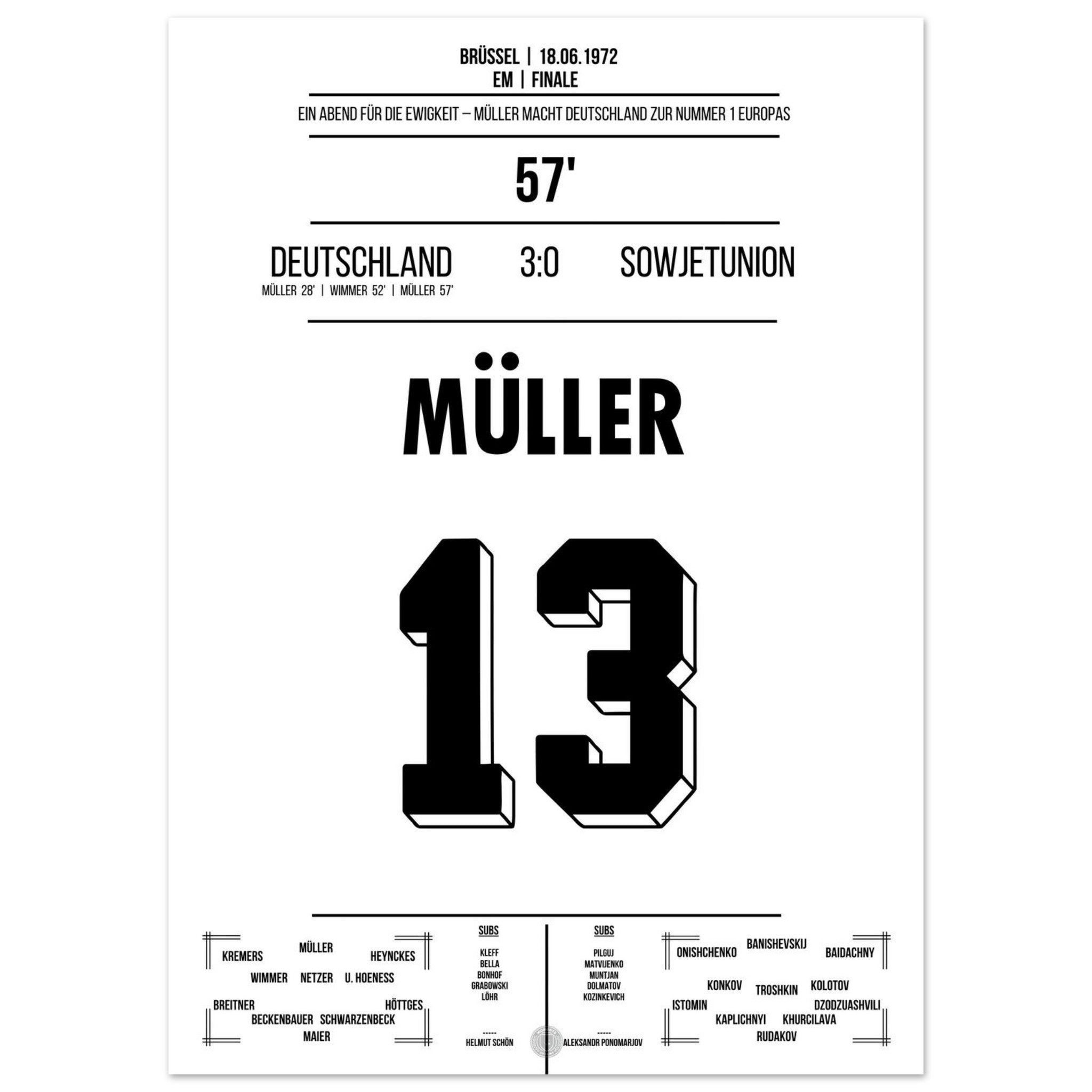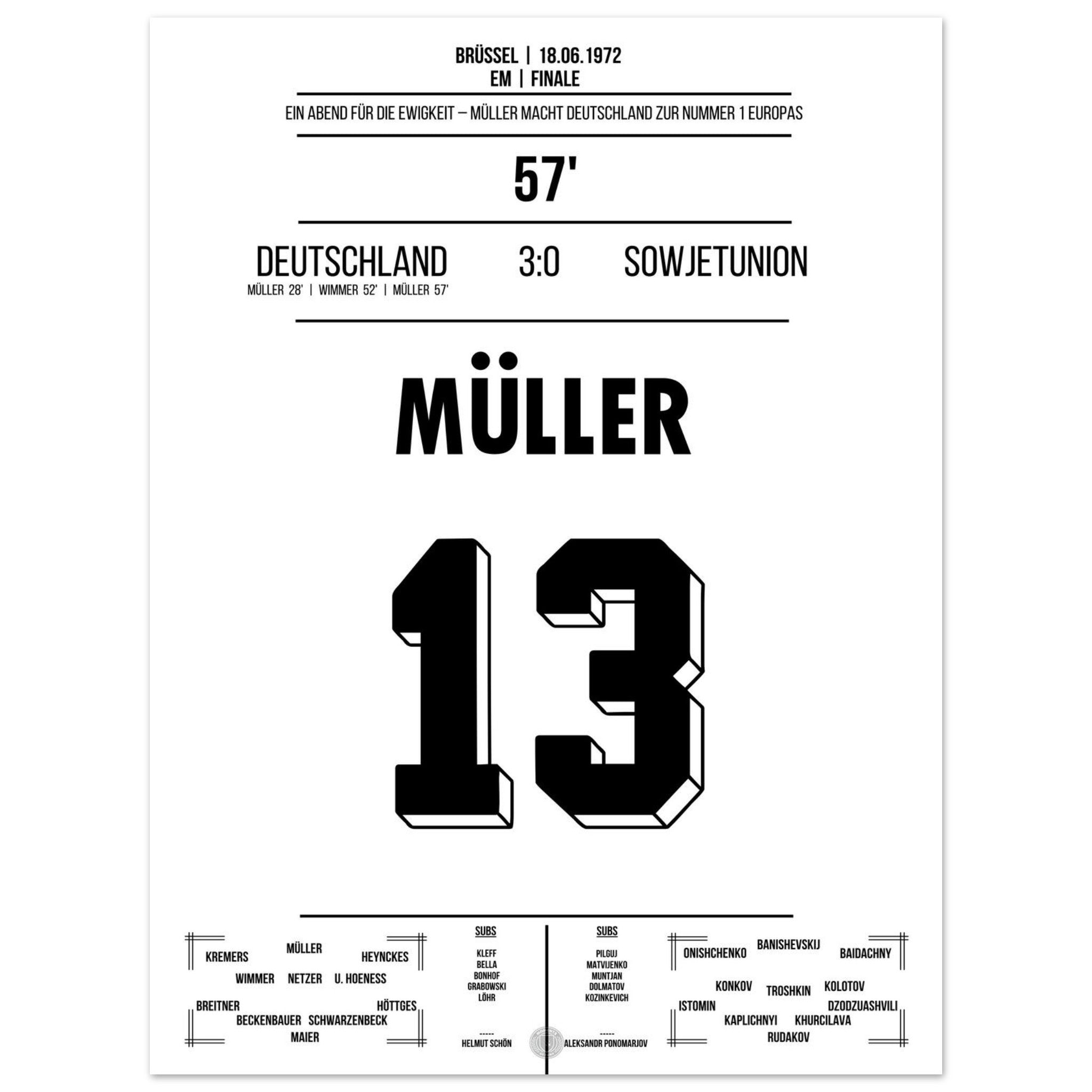 18. Juni 1972 – Deutschland vs. Sowjetunion 3:0: Im EM-Finale zeigt Gerd Müller einmal mehr seinen Torinstinkt und trifft doppelt gegen die Sowjetunion. Deutschland krönt sich zum ersten Mal zum Europameister – angeführt vom „Bomber der Nation“. Unser Poster feiert Müllers Meisterstück in Brüssel.