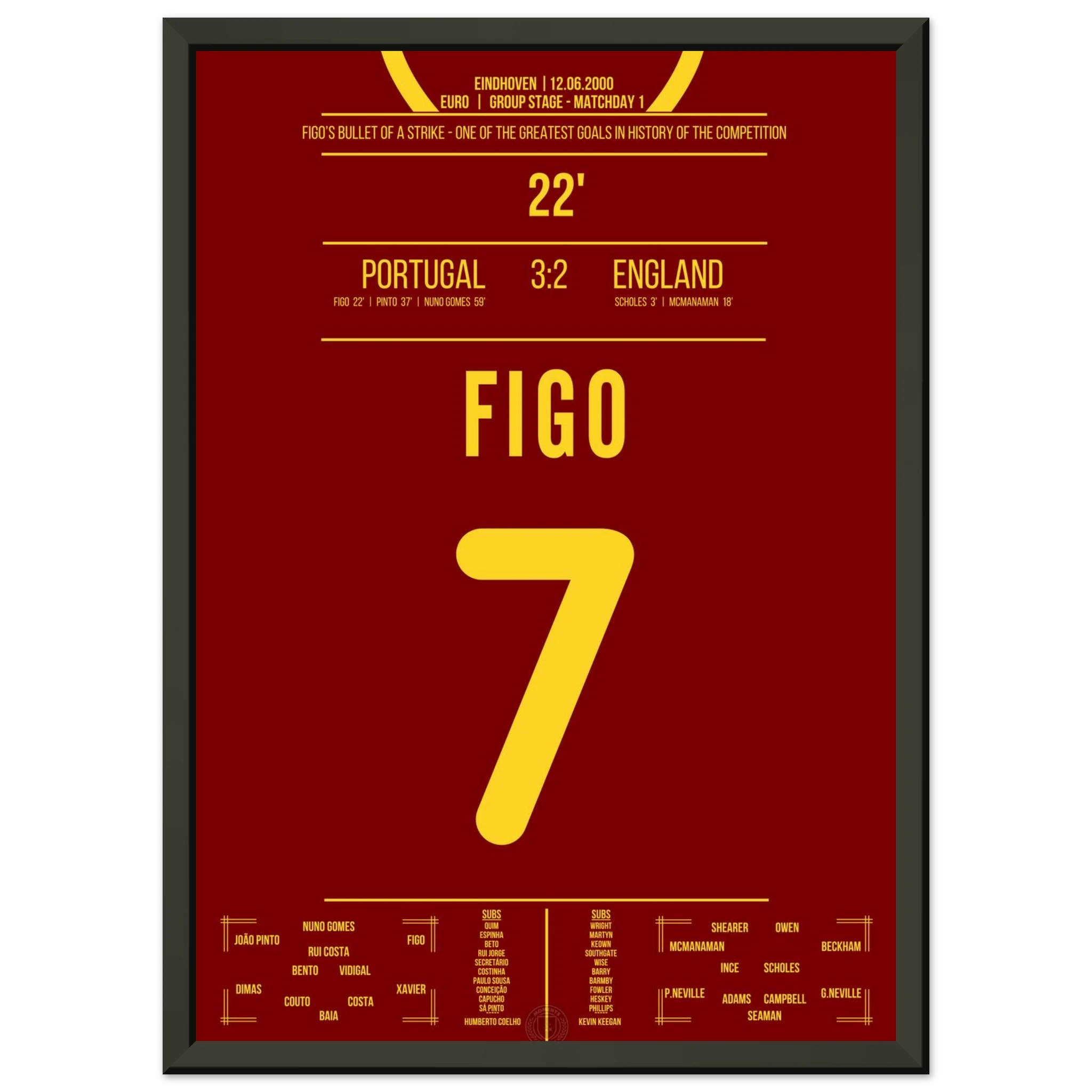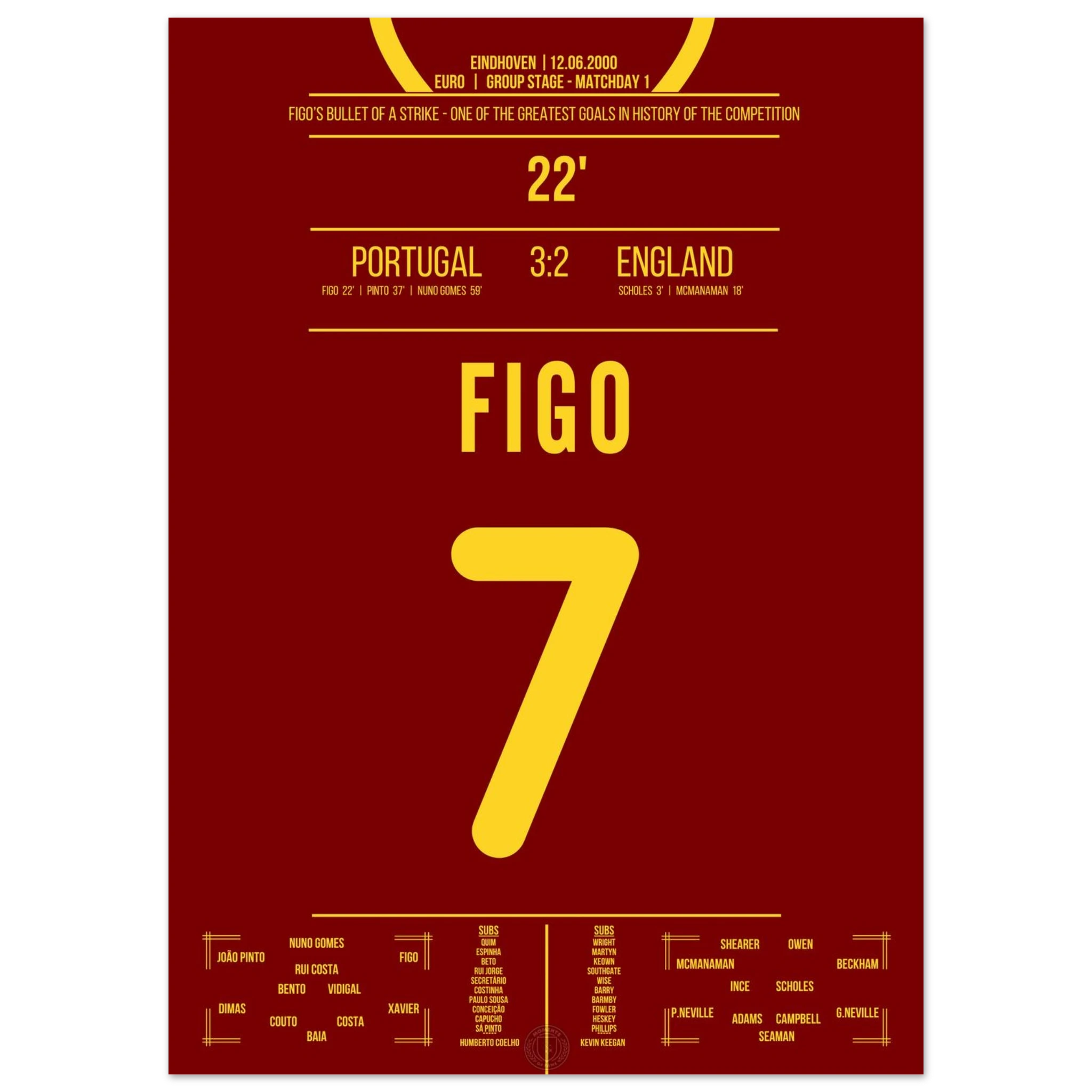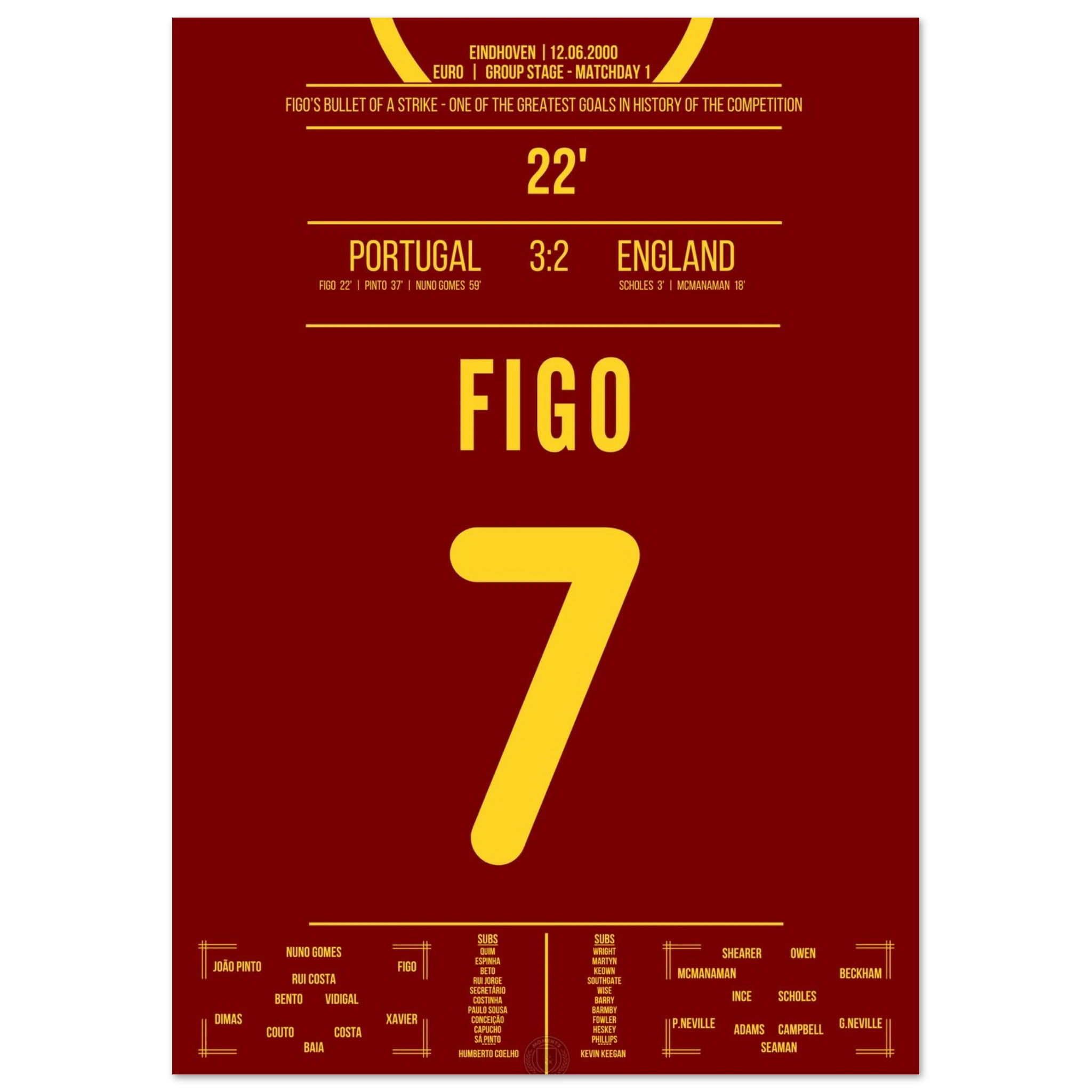 England führt früh mit 2:0, doch dann nimmt Luis Figo das Spiel in die Hand. In der 22. Minute zieht er aus der Distanz ab und trifft spektakulär zum 1:2-Anschluss. Dieser Treffer leitet die legendäre portugiesische Wende ein.