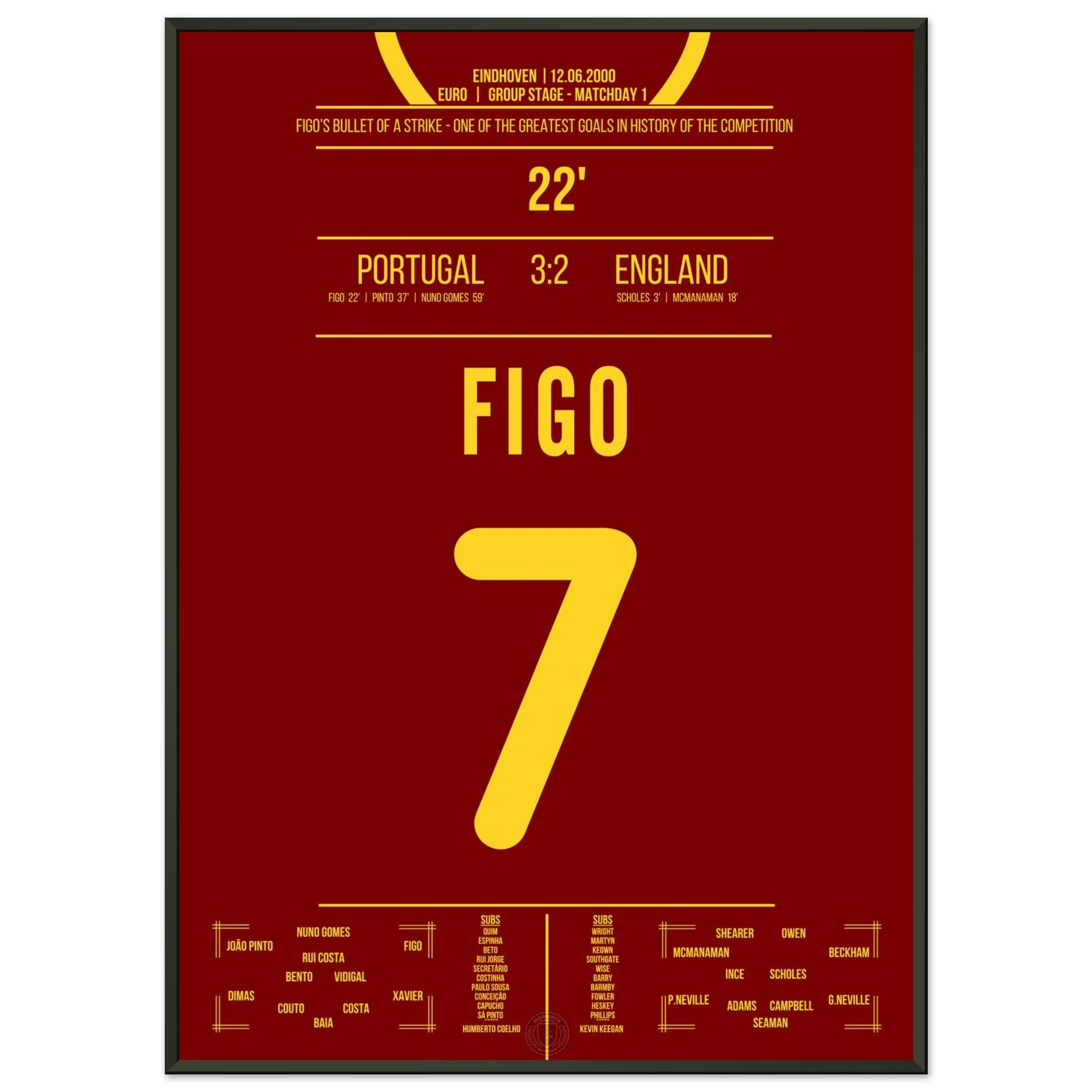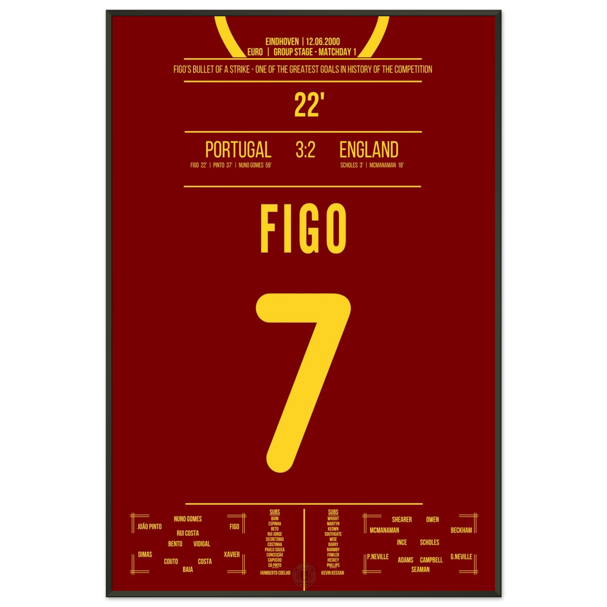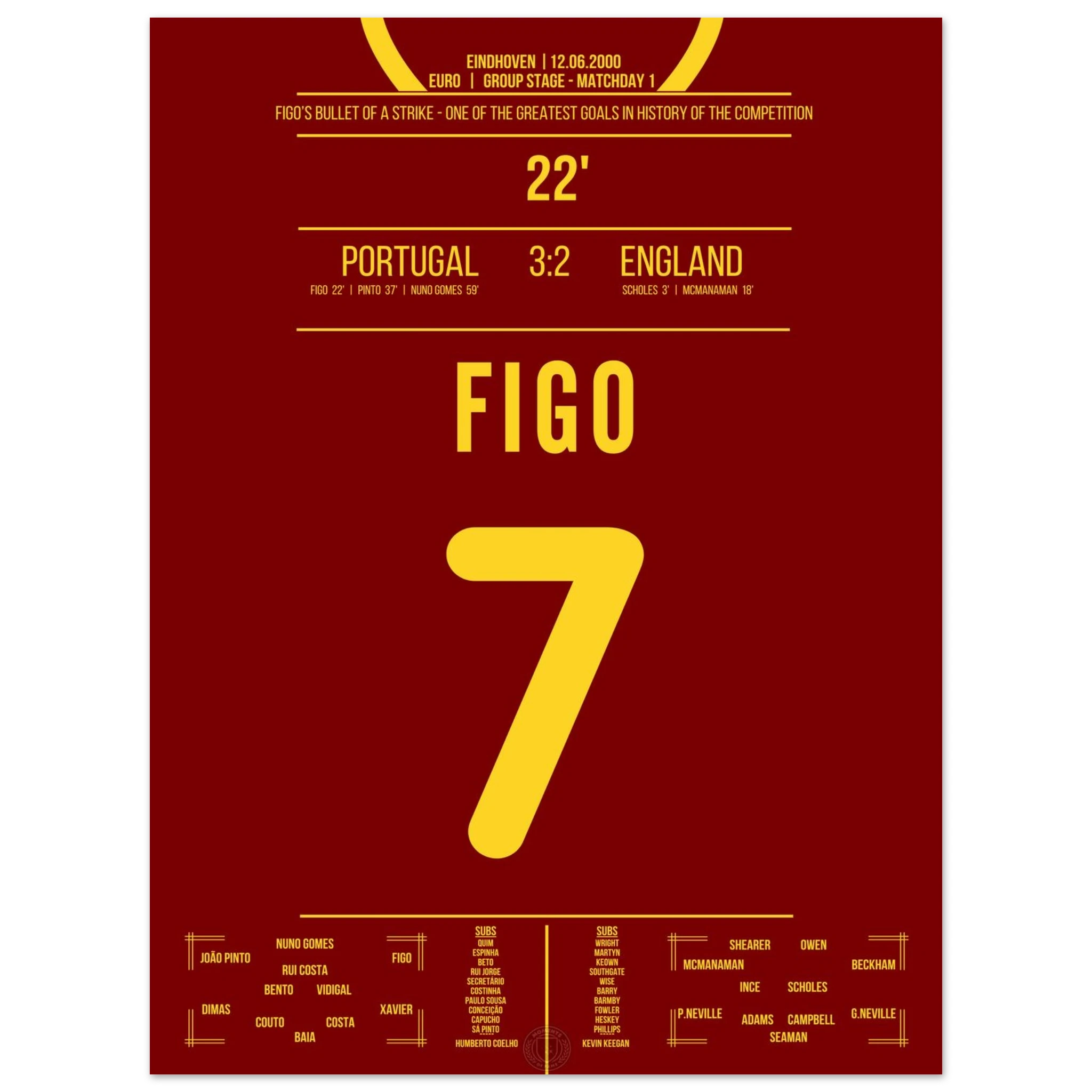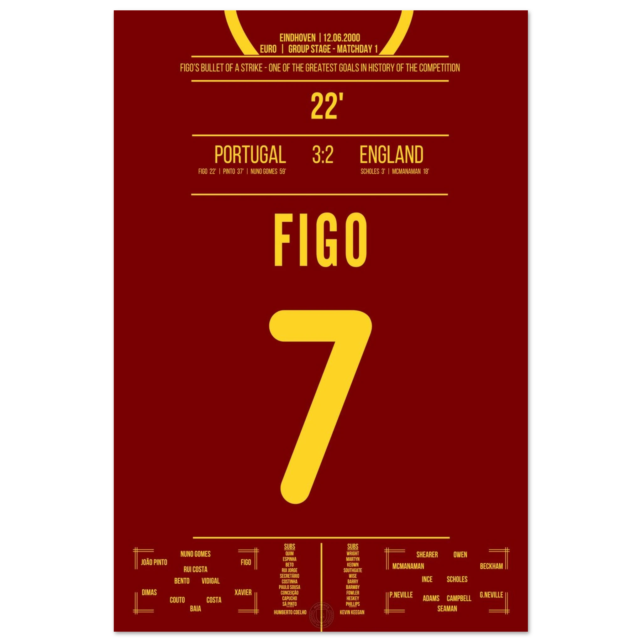 England führt früh mit 2:0, doch dann nimmt Luis Figo das Spiel in die Hand. In der 22. Minute zieht er aus der Distanz ab und trifft spektakulär zum 1:2-Anschluss. Dieser Treffer leitet die legendäre portugiesische Wende ein.
