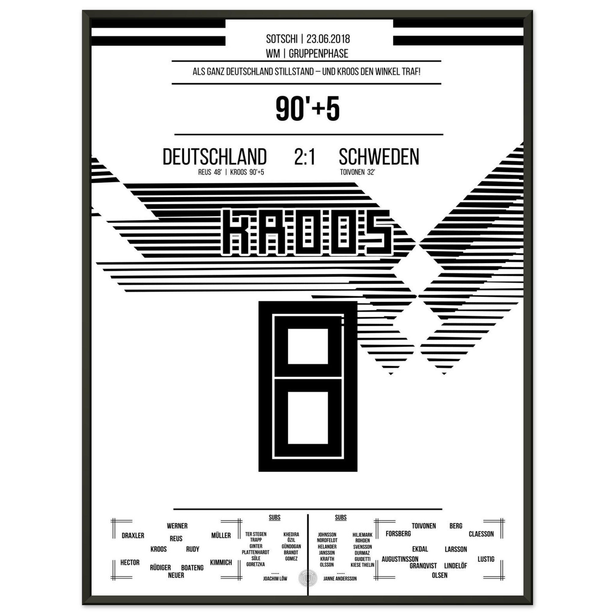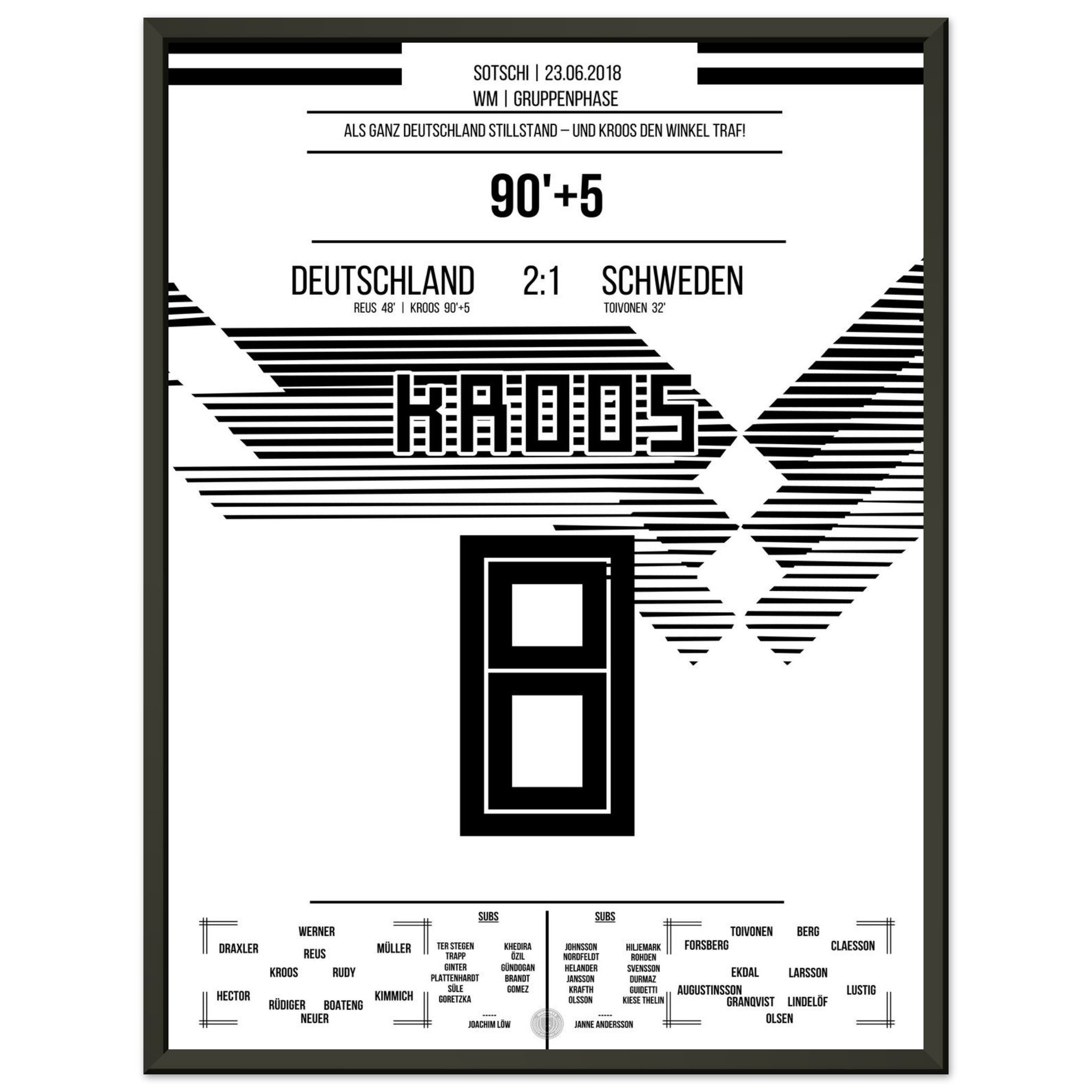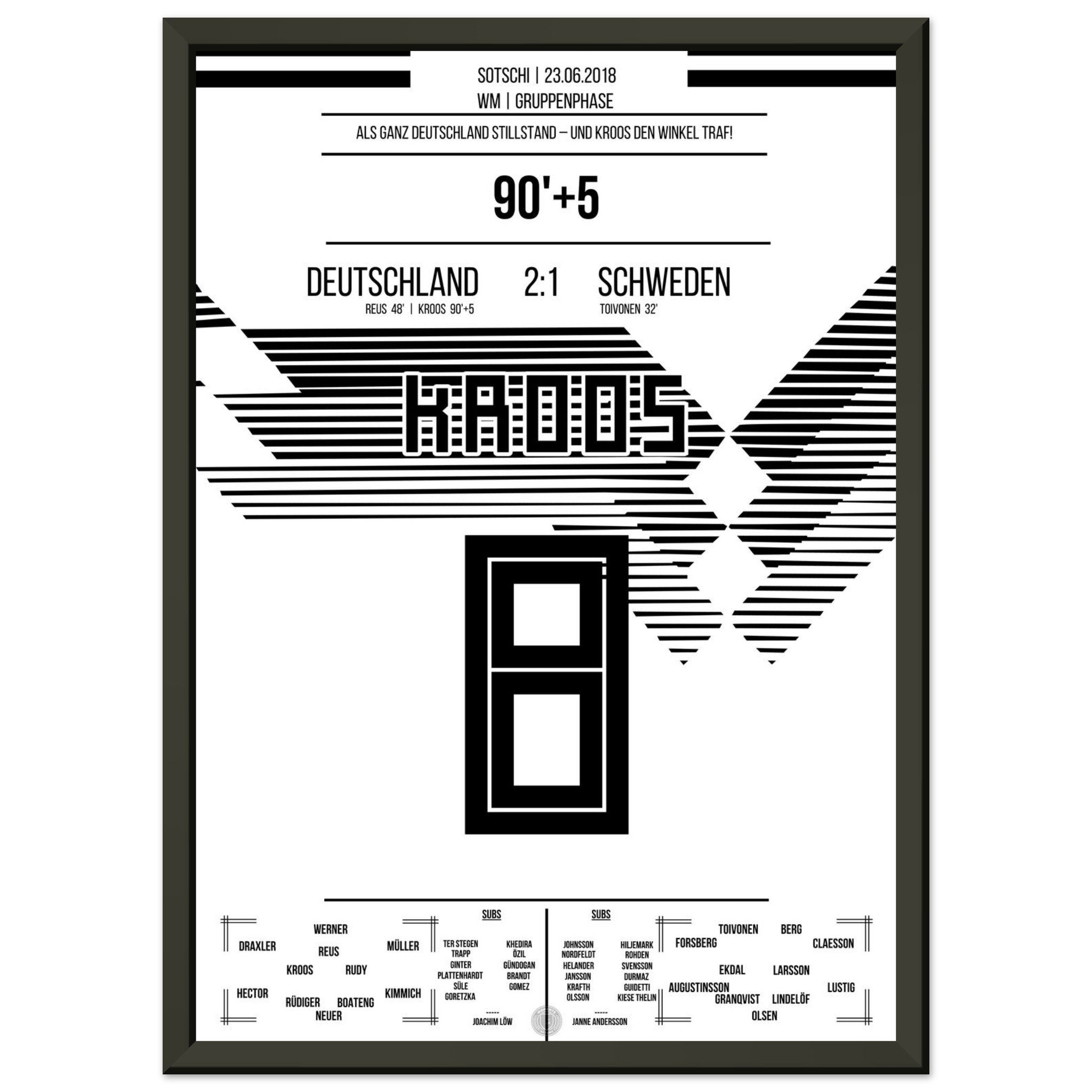 23. Juni 2018 – Deutschland vs. Schweden 2:1: In der 95. Minute dreht Toni Kroos den Ball nach einem kurzen Anspiel traumhaft ins lange Eck – ein Last-Minute-Freistoß wie aus dem Bilderbuch, der Deutschland bei der WM 2018 vor dem Aus bewahrt. Unser Poster fängt diesen magischen Moment im Sonnenuntergang von Sotschi ein.