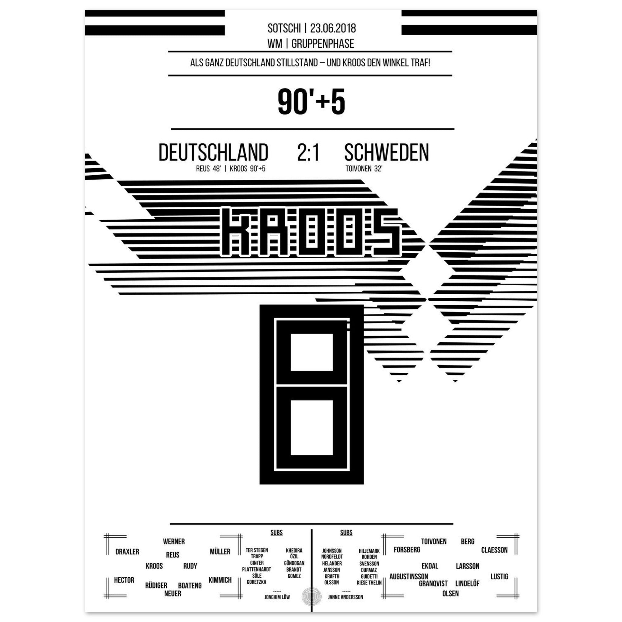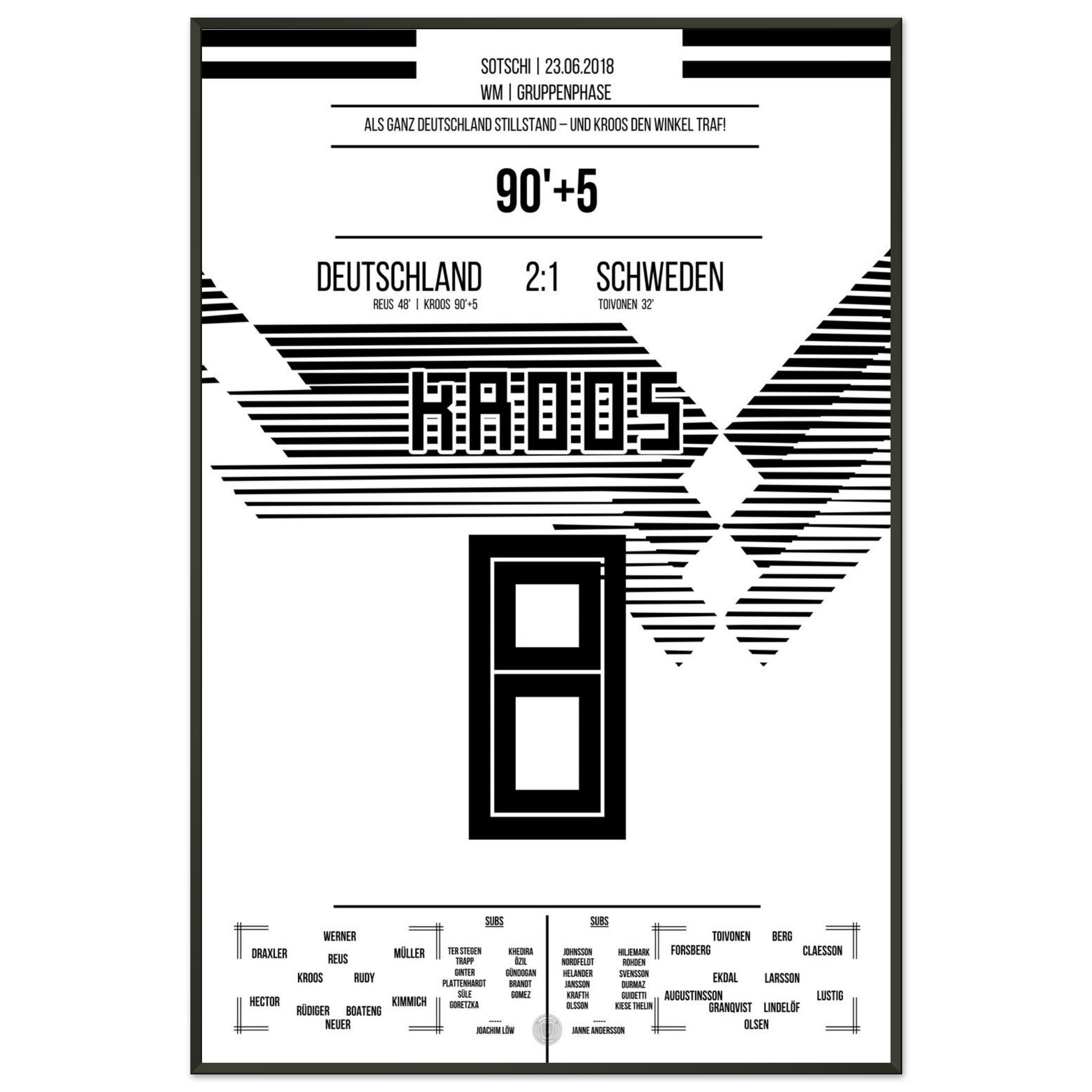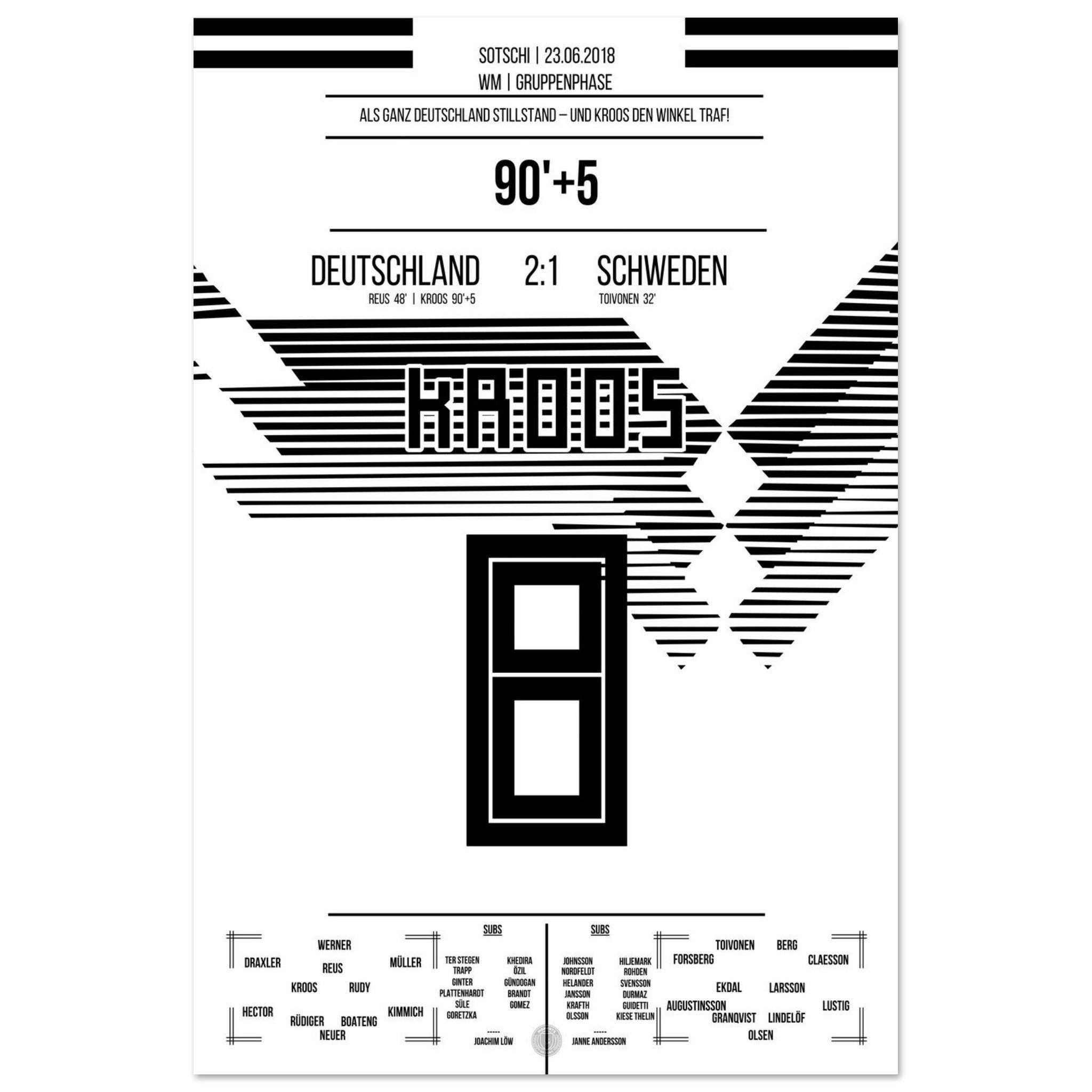 23. Juni 2018 – Deutschland vs. Schweden 2:1: In der 95. Minute dreht Toni Kroos den Ball nach einem kurzen Anspiel traumhaft ins lange Eck – ein Last-Minute-Freistoß wie aus dem Bilderbuch, der Deutschland bei der WM 2018 vor dem Aus bewahrt. Unser Poster fängt diesen magischen Moment im Sonnenuntergang von Sotschi ein.