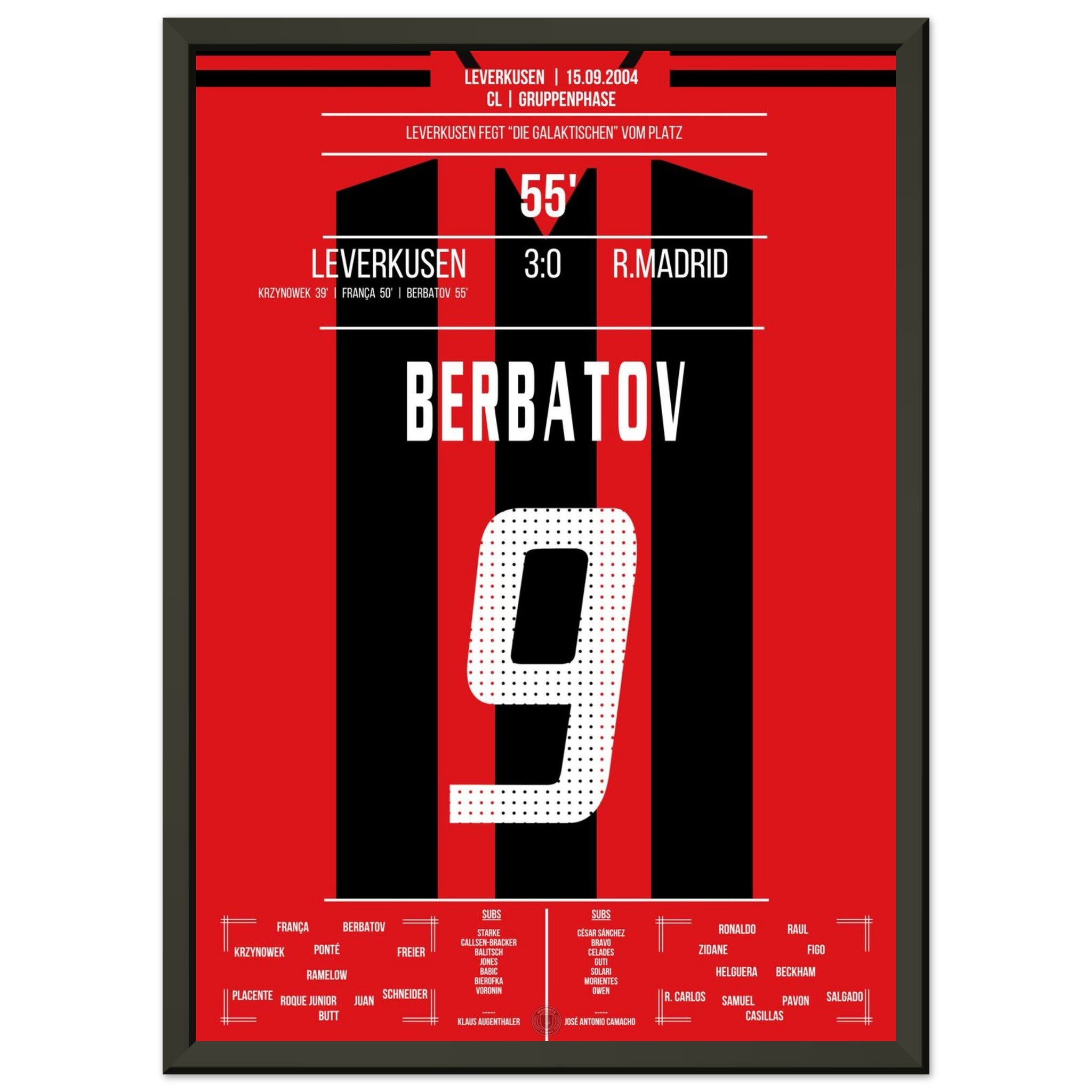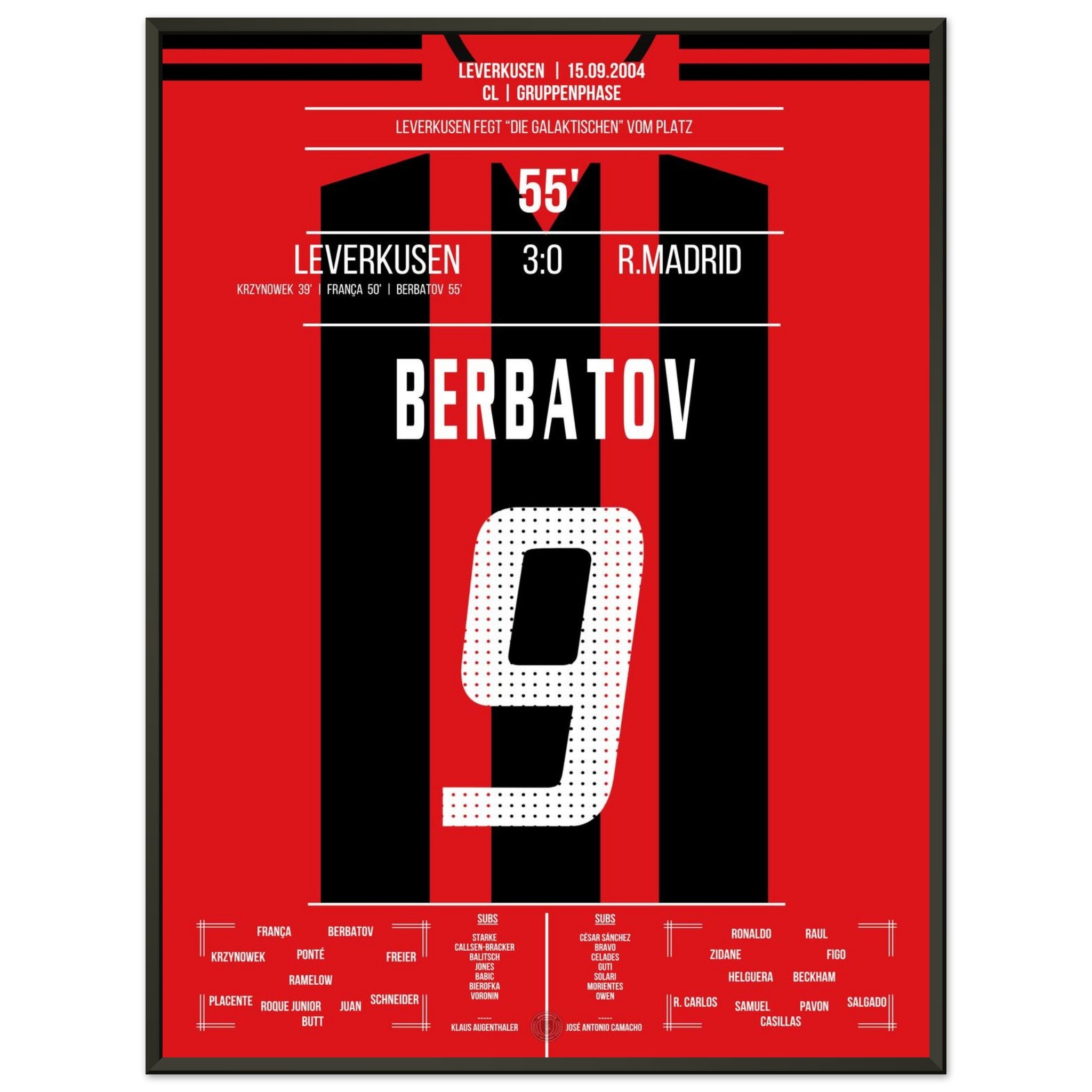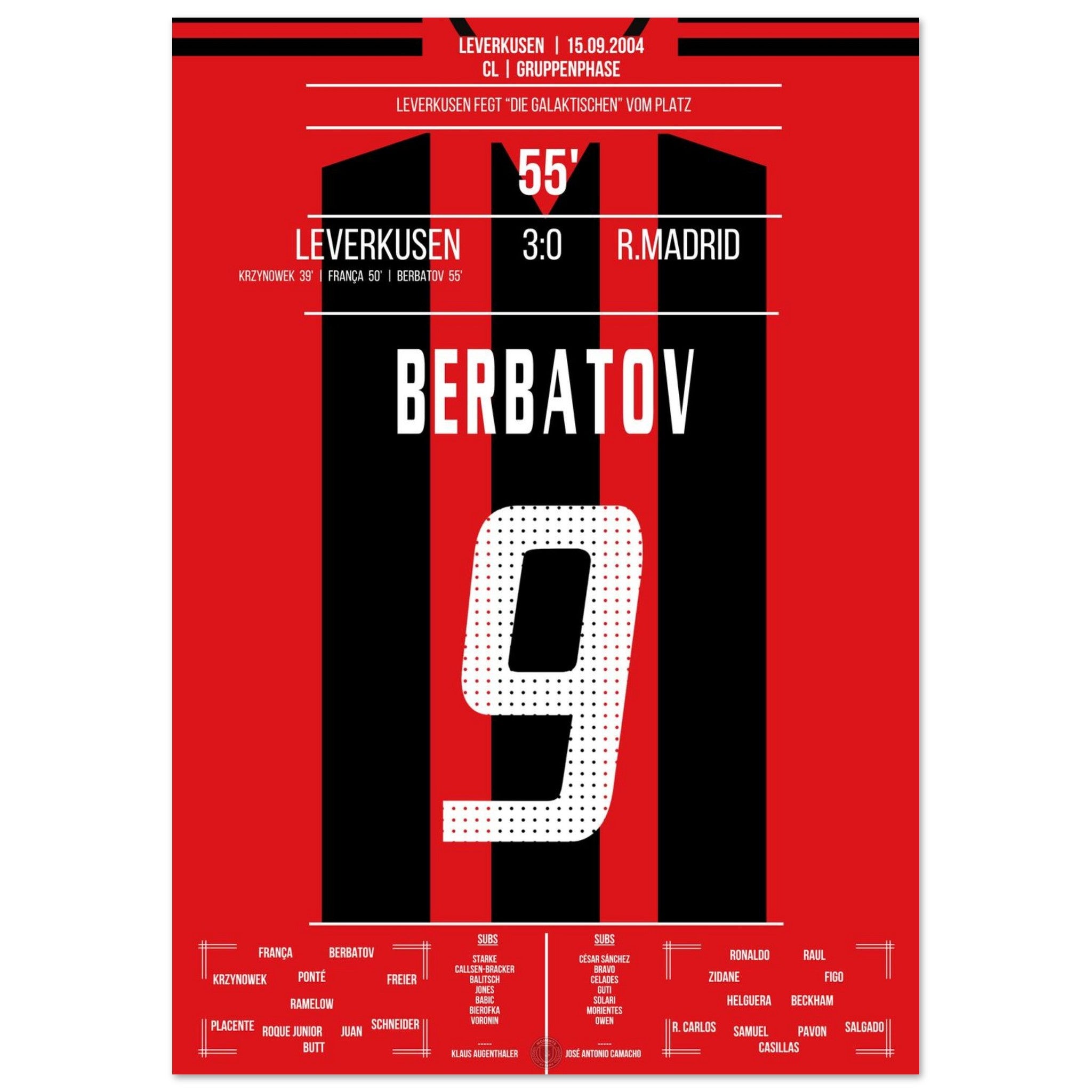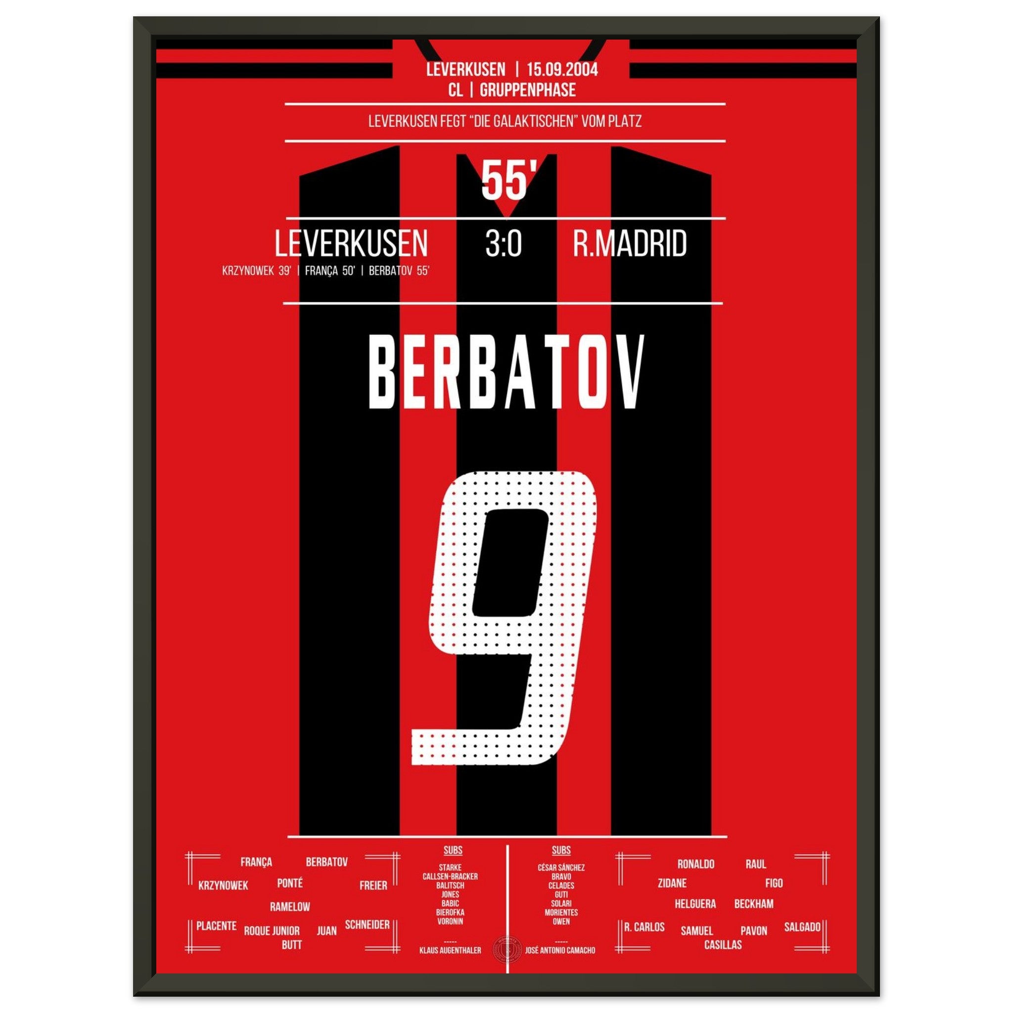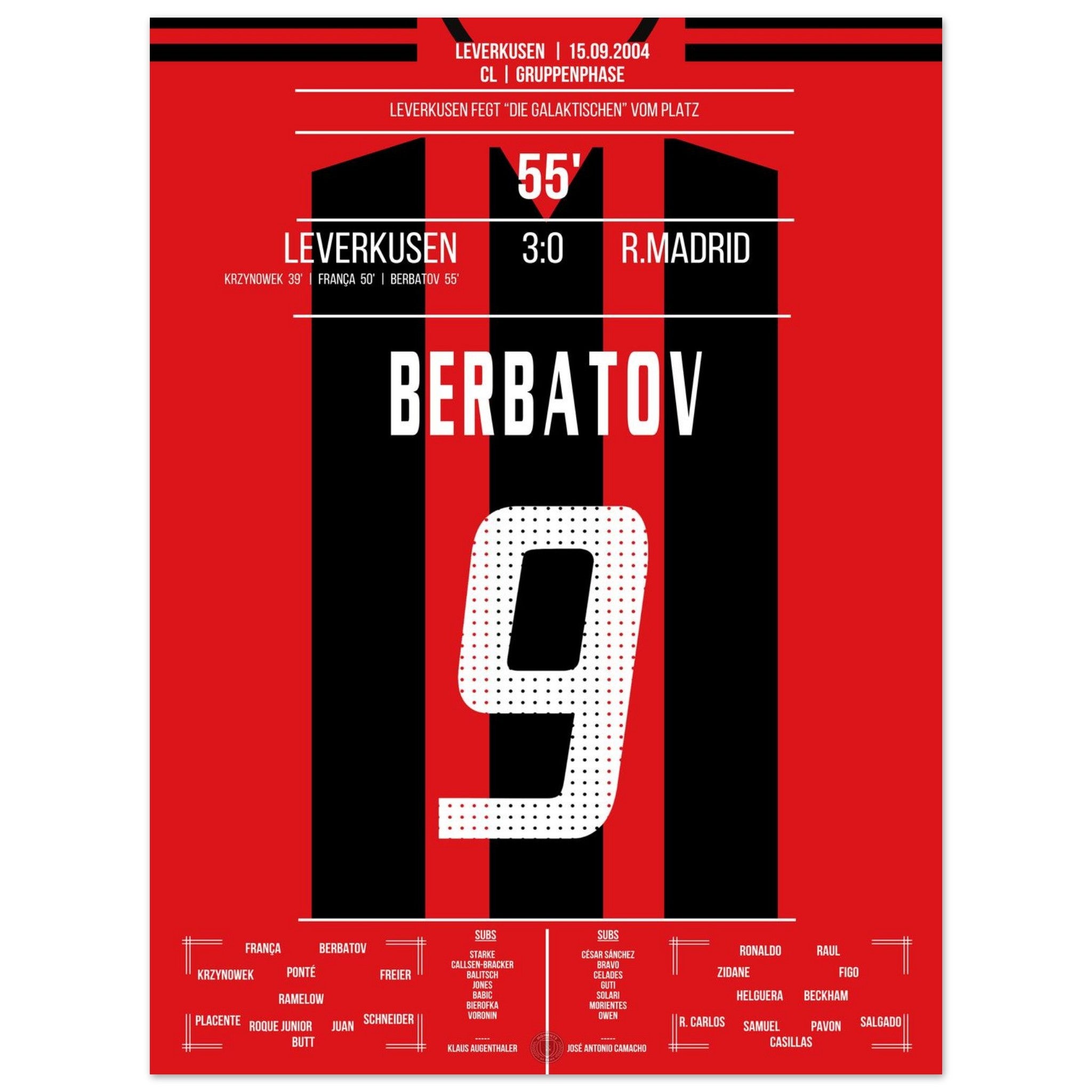 15. September 2004 – Leverkusen vs. R.Madrid 3:0: In der 55. Minute trifft Dimitar Berbatov traumhaft zum 3:0 und bringt das Stadion gegen Real endgültig zum Kochen. Technik, Coolness, Klasse – ein europäischer Abend für die Geschichtsbücher. Unser Poster hält diesen magischen Berbatov-Moment in Schwarz-Rot fest.
