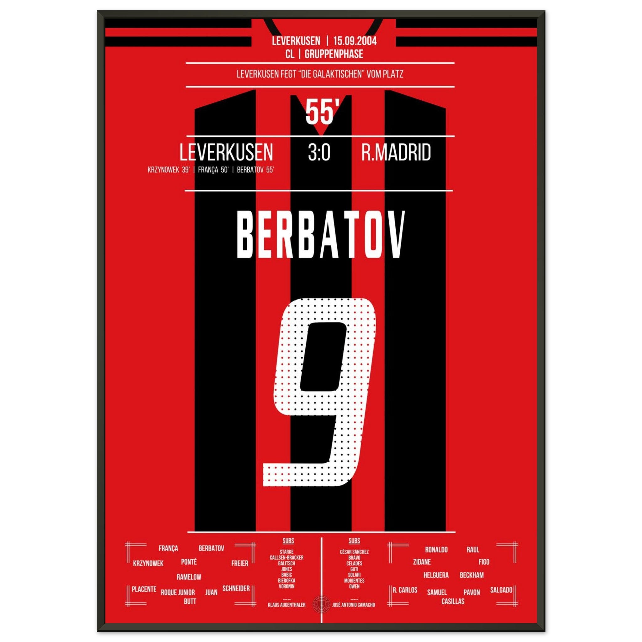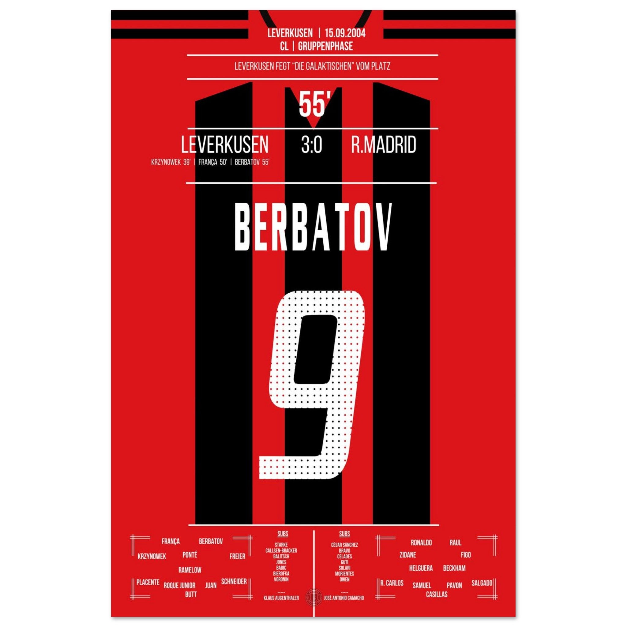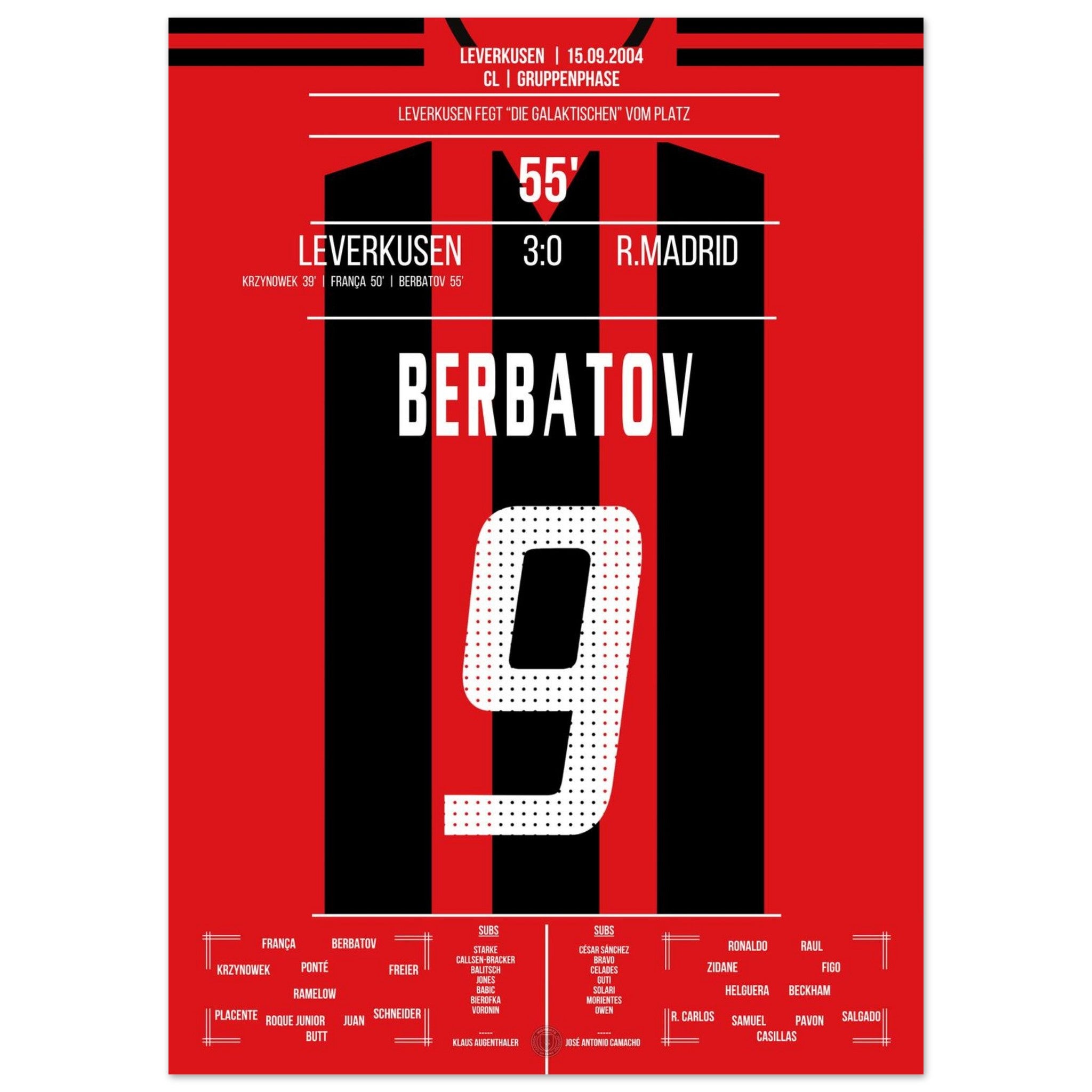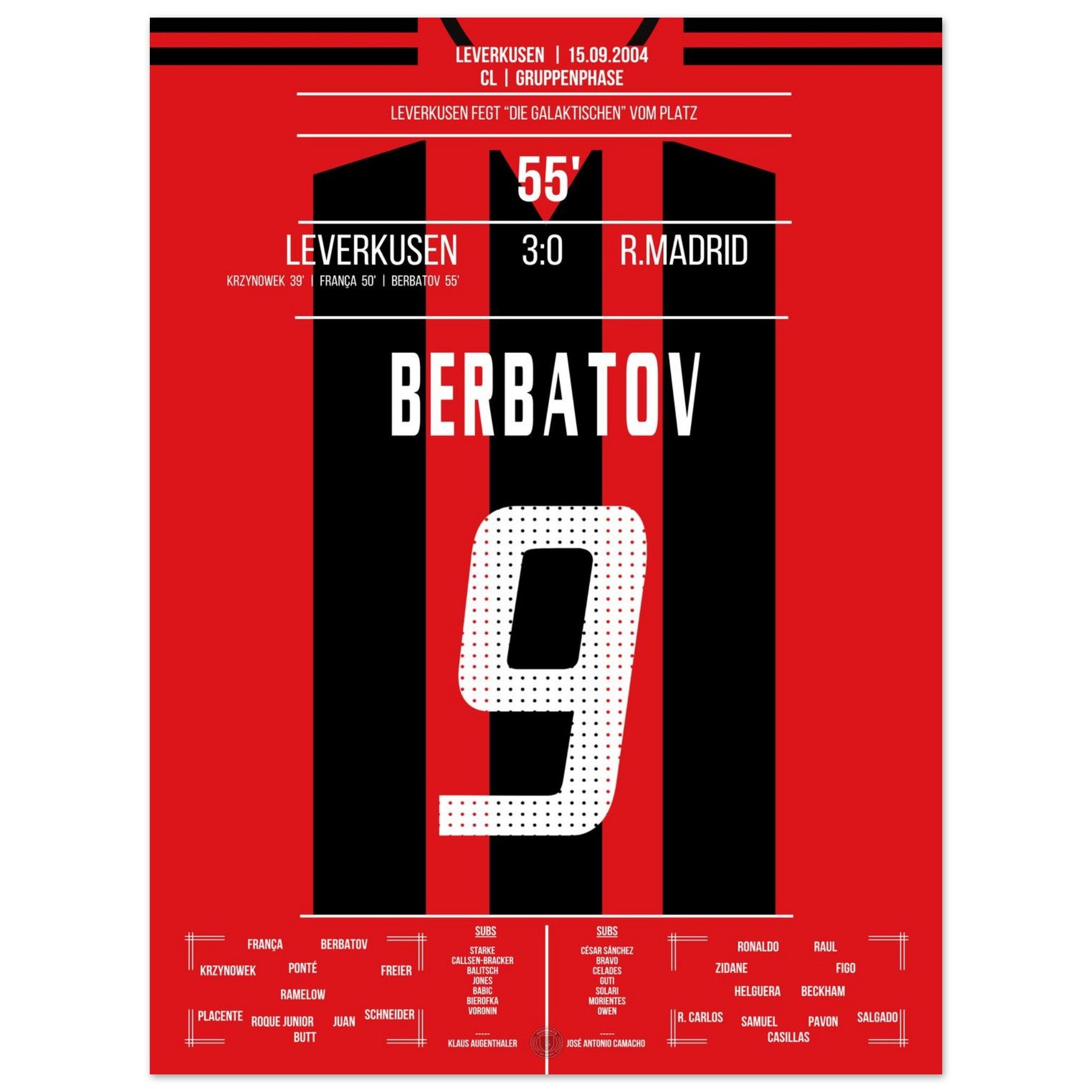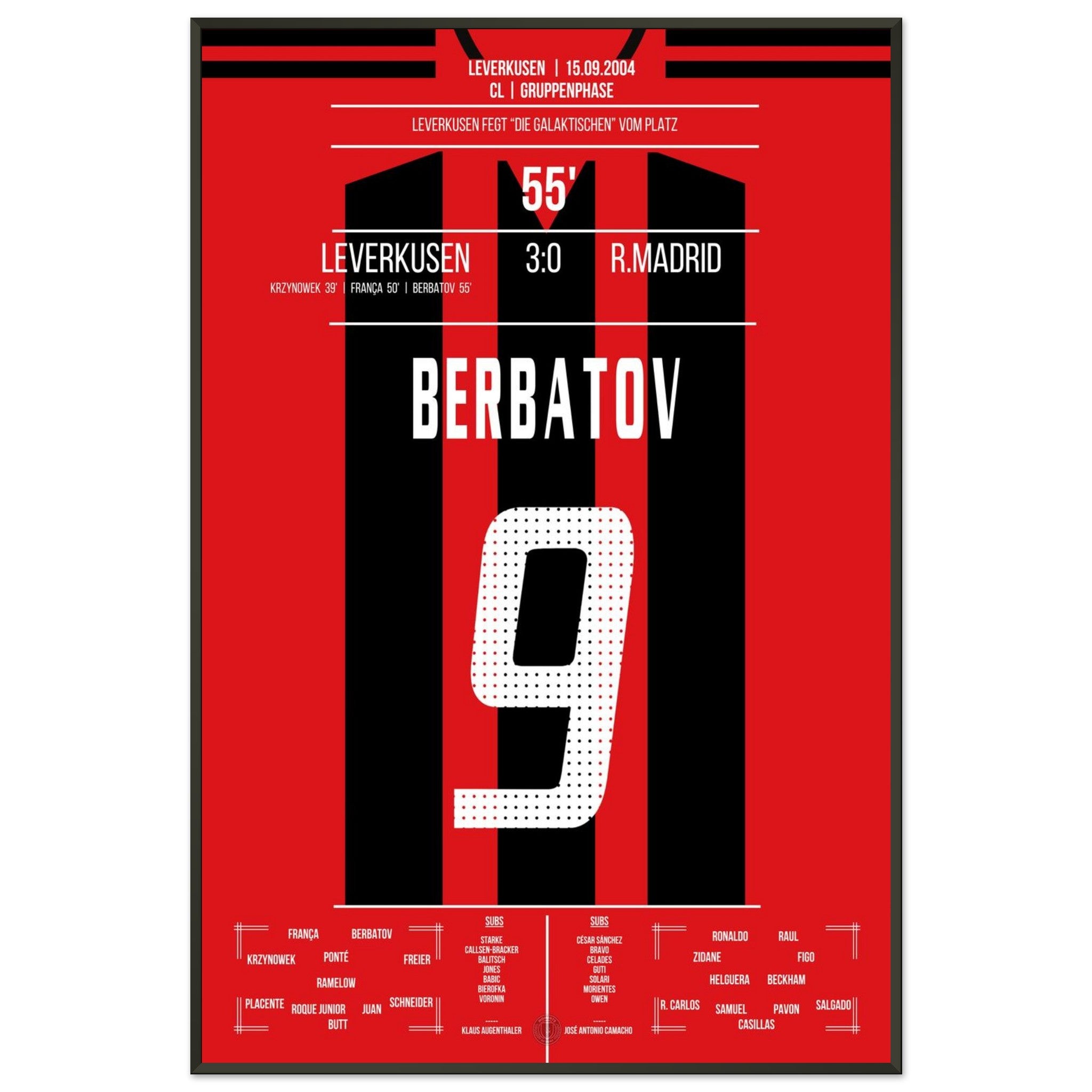 15. September 2004 – Leverkusen vs. R.Madrid 3:0: In der 55. Minute trifft Dimitar Berbatov traumhaft zum 3:0 und bringt das Stadion gegen Real endgültig zum Kochen. Technik, Coolness, Klasse – ein europäischer Abend für die Geschichtsbücher. Unser Poster hält diesen magischen Berbatov-Moment in Schwarz-Rot fest.