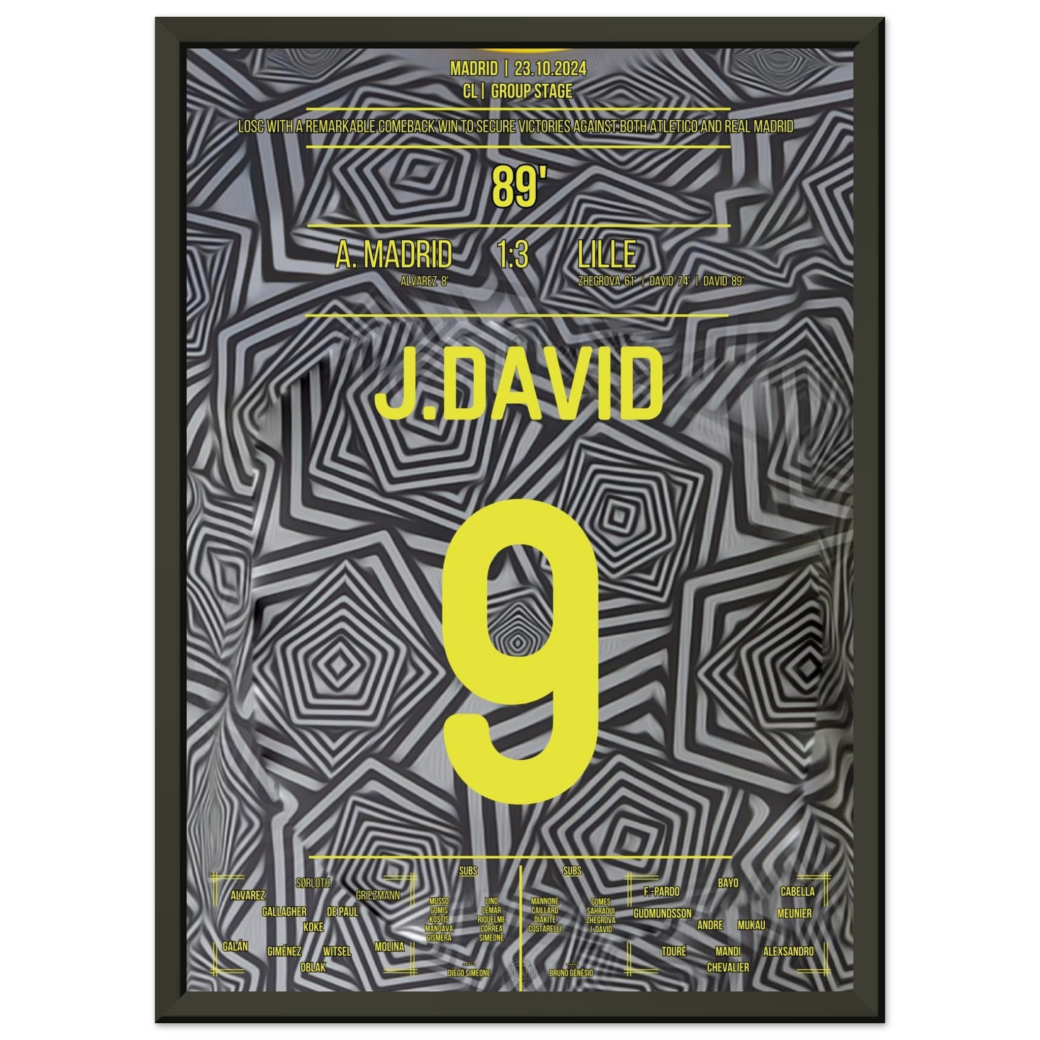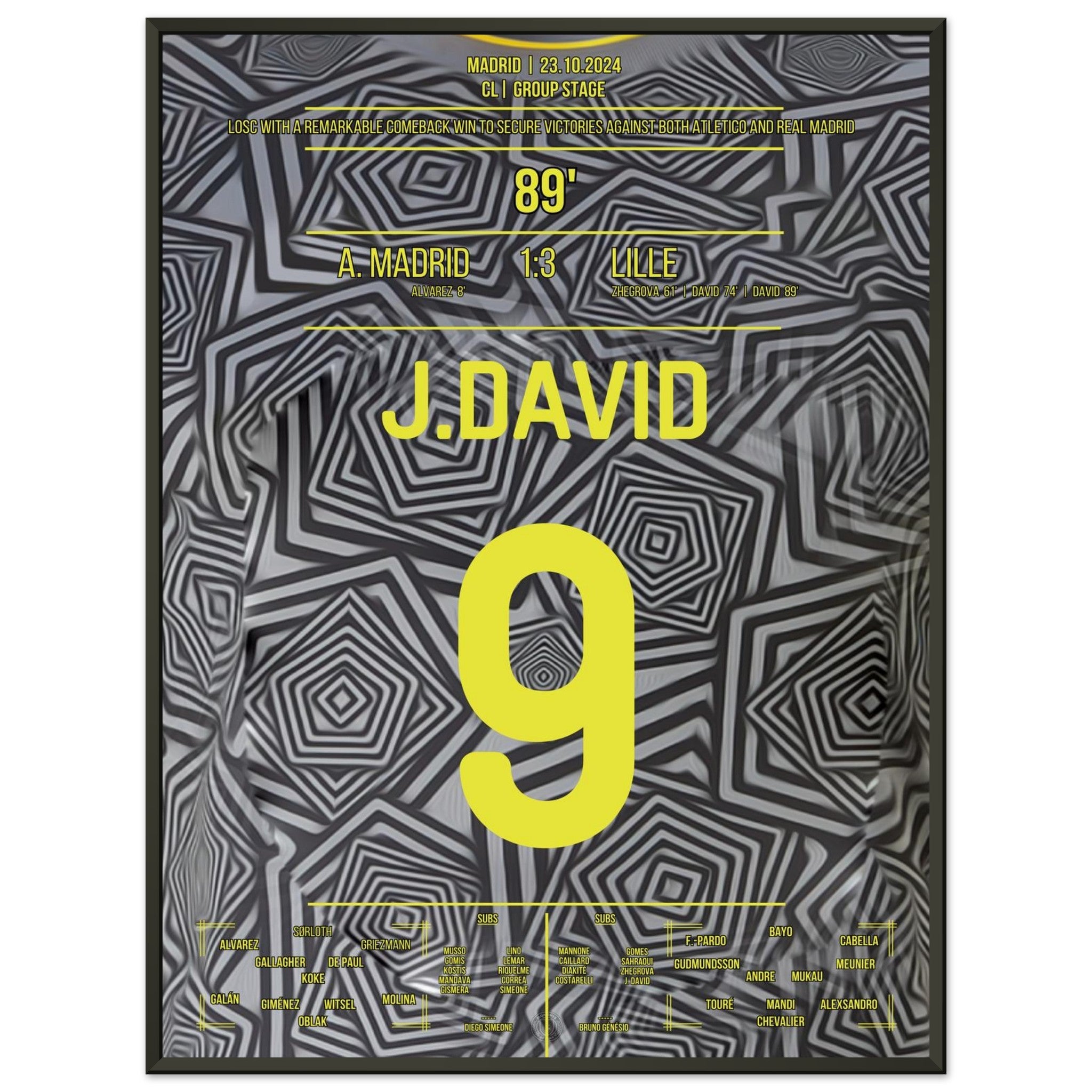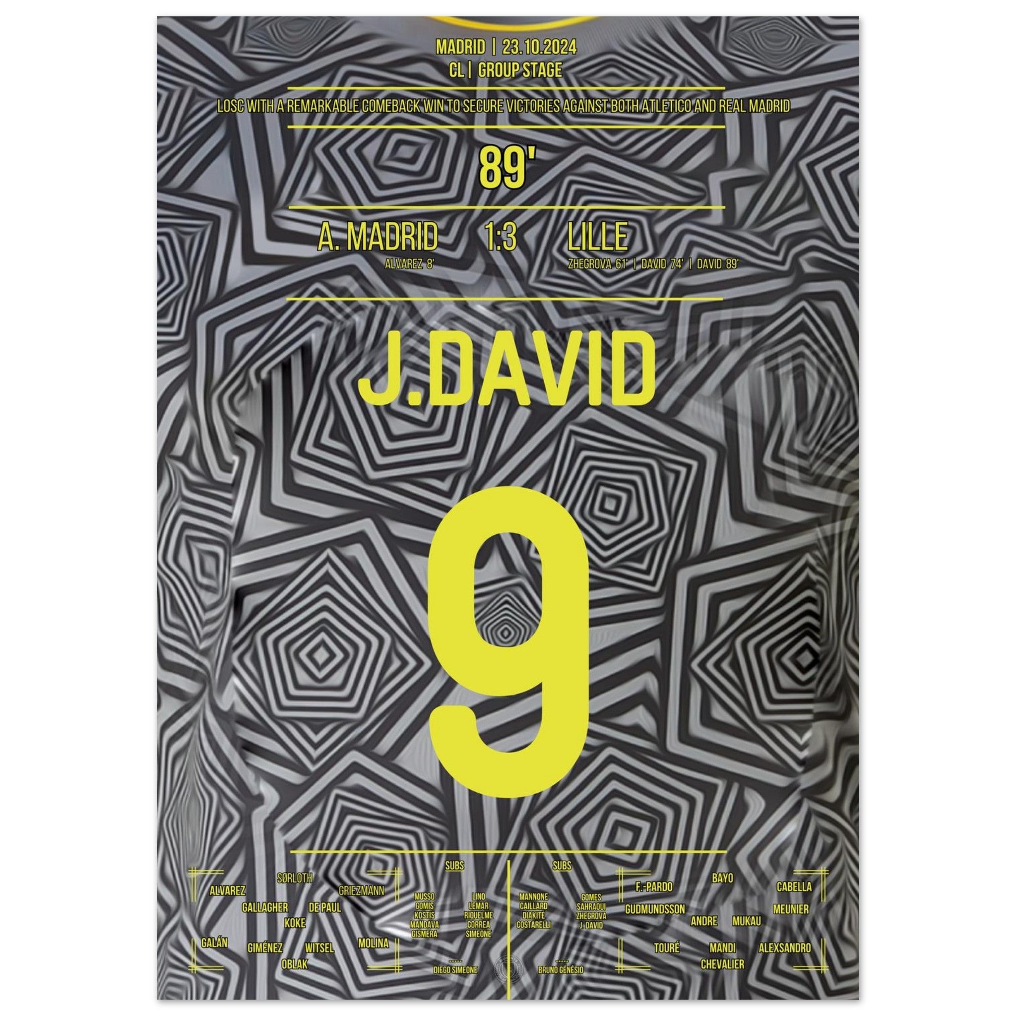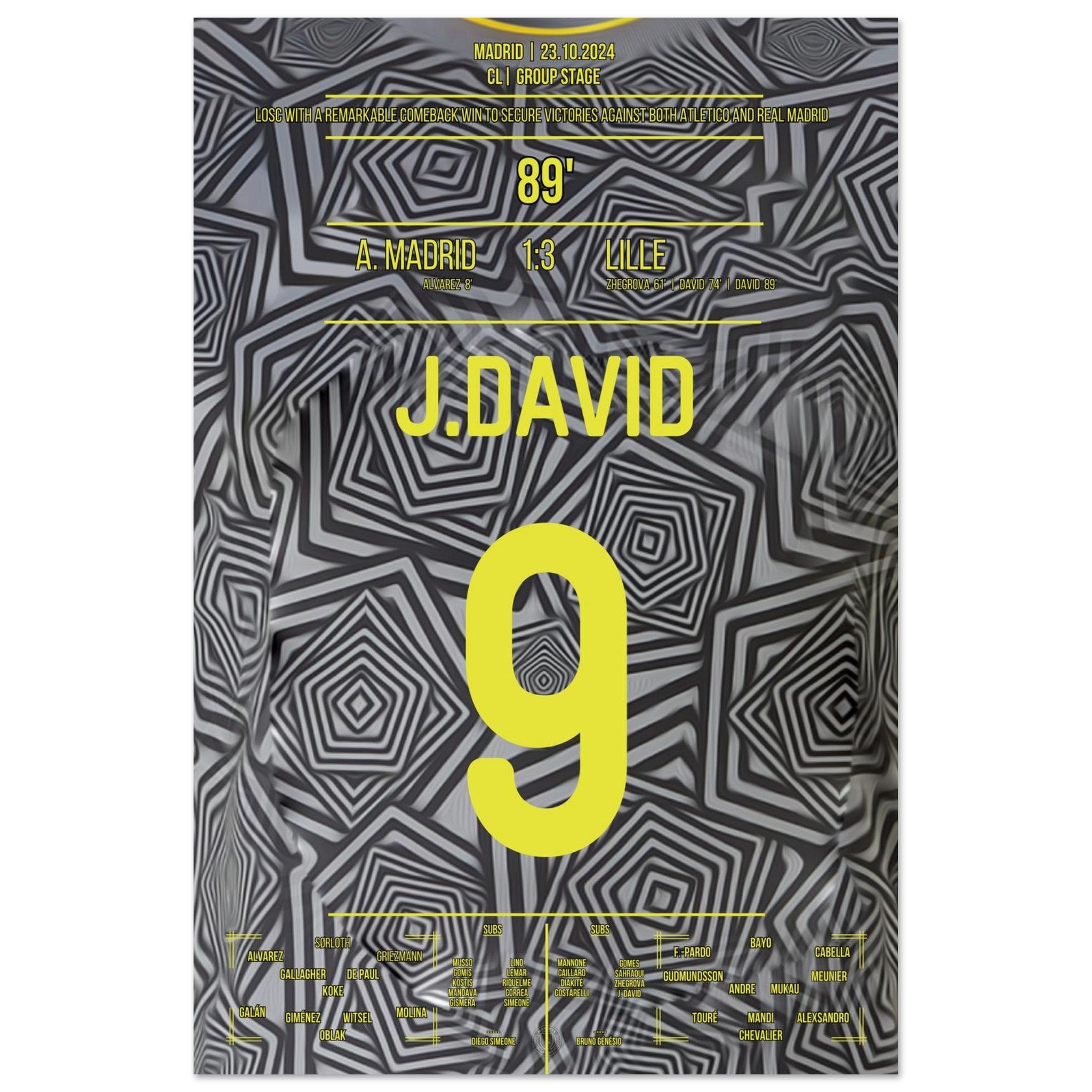 23. Oktober 2024 – Atlético vs. Lille 1:3: In einer magischen Europapokal-Nacht in Madrid bringt Jonathan David Lille mit seinem Tor endgültig auf die Siegerstraße. Mit Tempo, Technik und Kaltschnäuzigkeit lässt er die Rojiblancos alt aussehen – und schreibt ein neues Kapitel europäischer Außenseiter-Geschichte. Unser Poster fängt diesen Triumphmoment für die Ewigkeit ein.