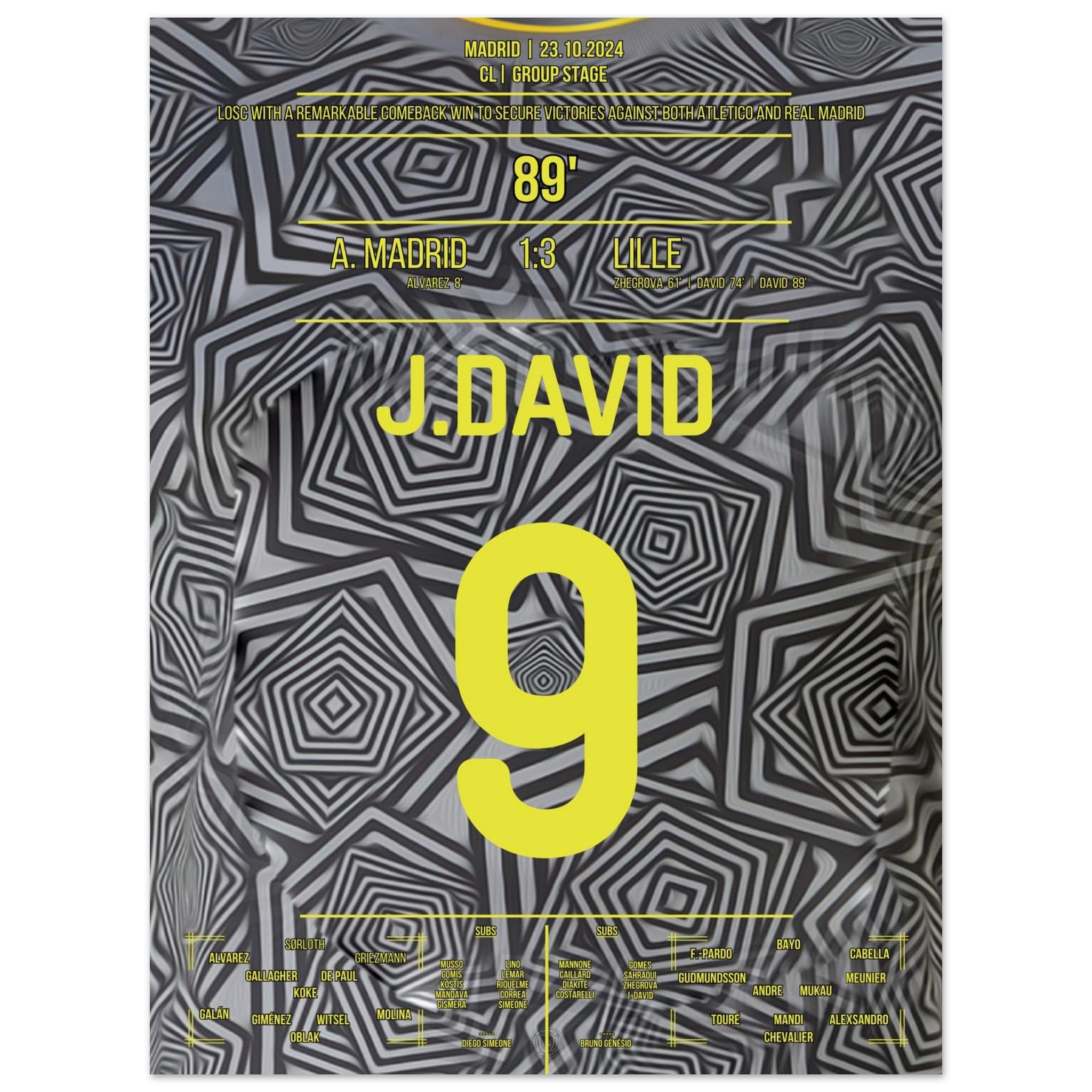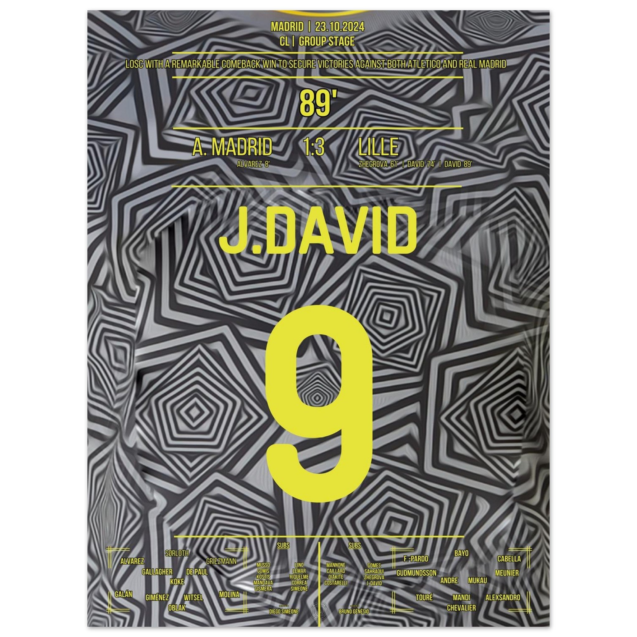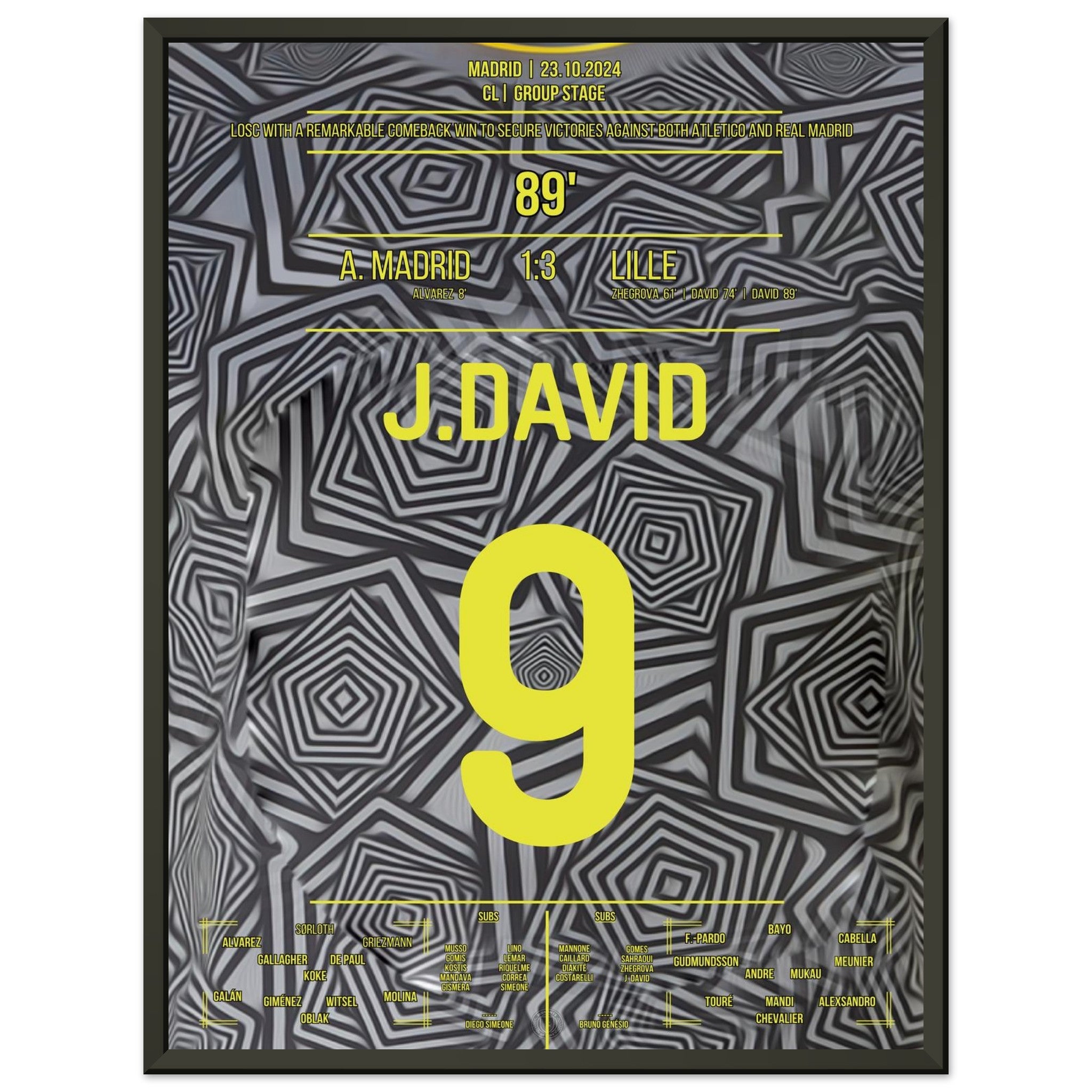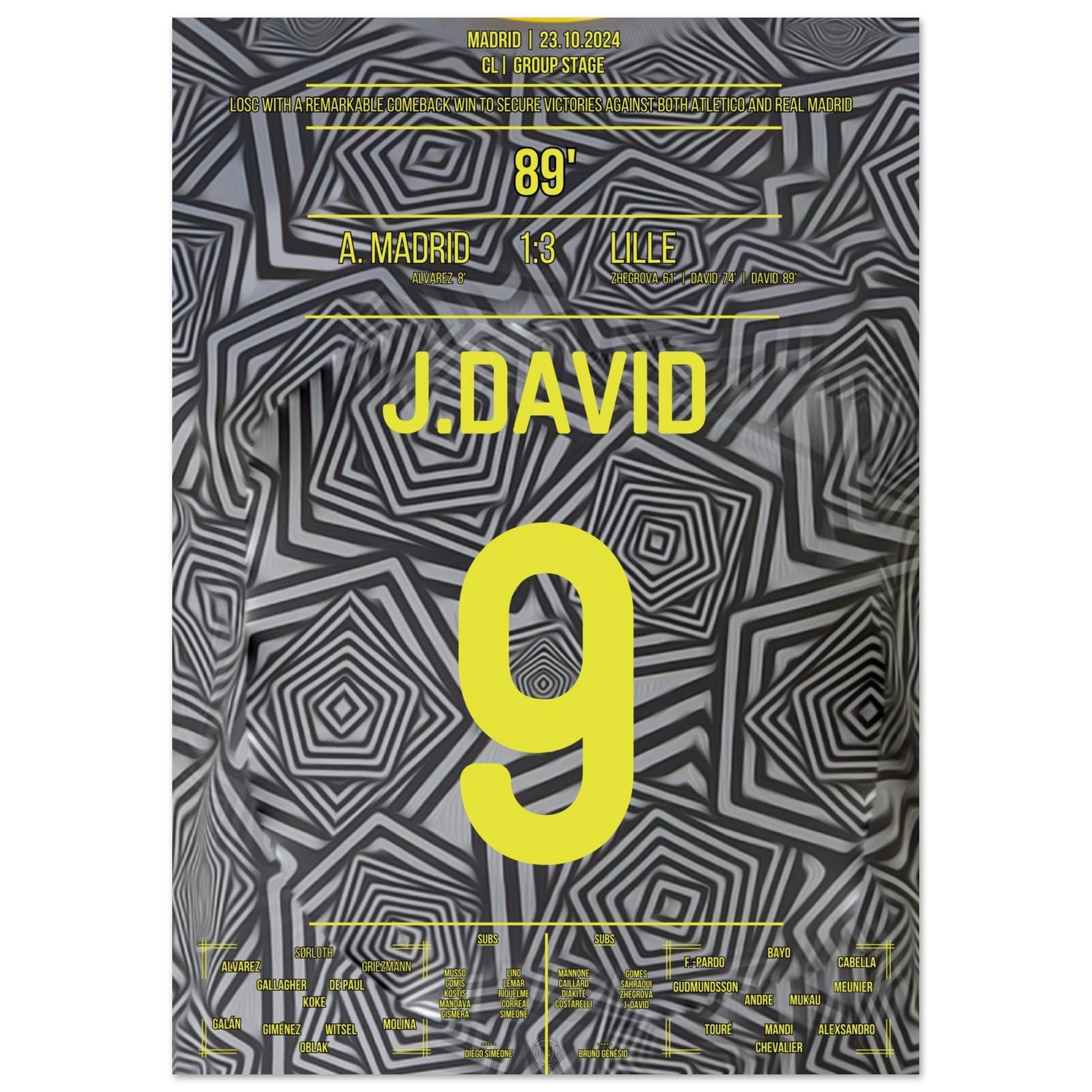 23. Oktober 2024 – Atlético vs. Lille 1:3: In einer magischen Europapokal-Nacht in Madrid bringt Jonathan David Lille mit seinem Tor endgültig auf die Siegerstraße. Mit Tempo, Technik und Kaltschnäuzigkeit lässt er die Rojiblancos alt aussehen – und schreibt ein neues Kapitel europäischer Außenseiter-Geschichte. Unser Poster fängt diesen Triumphmoment für die Ewigkeit ein.