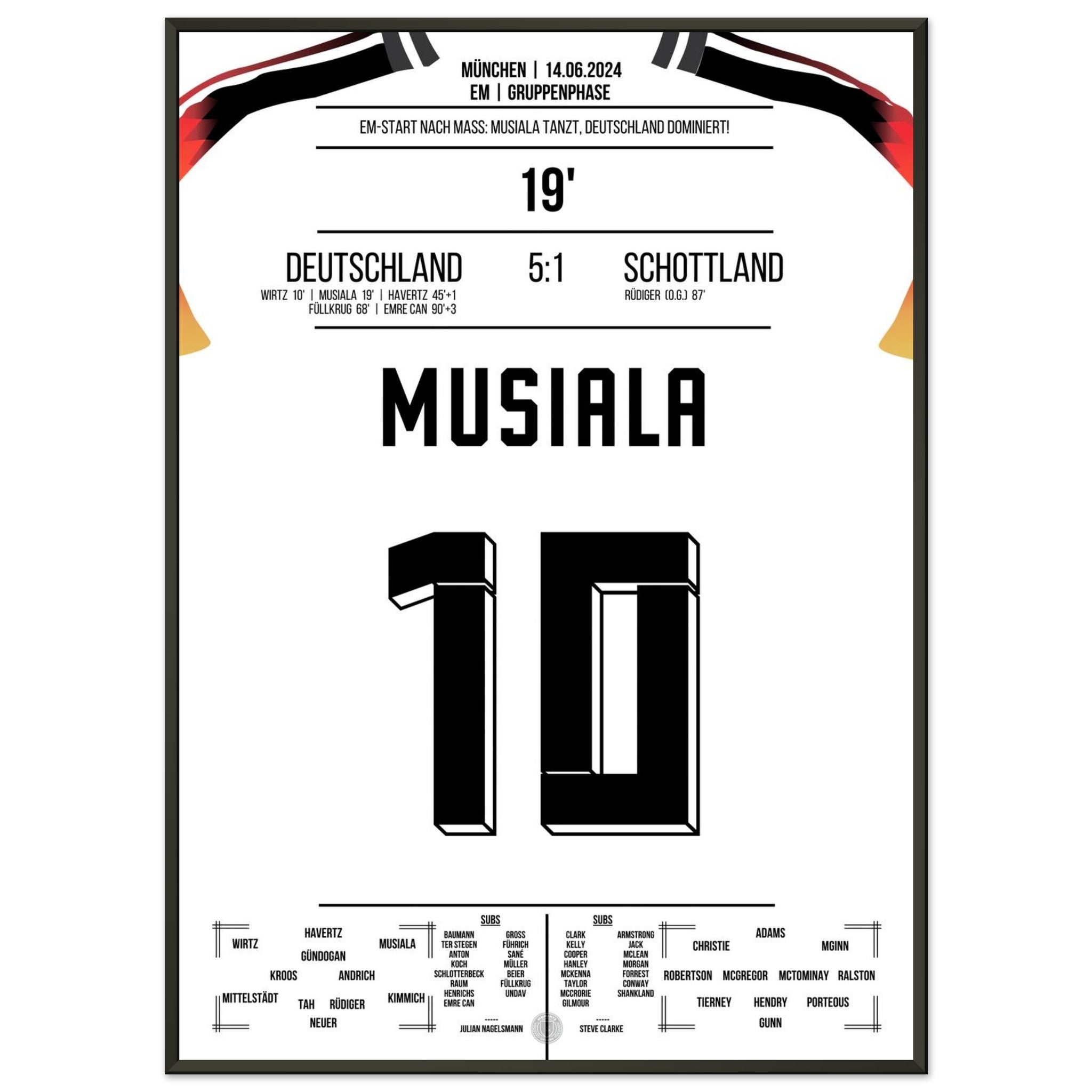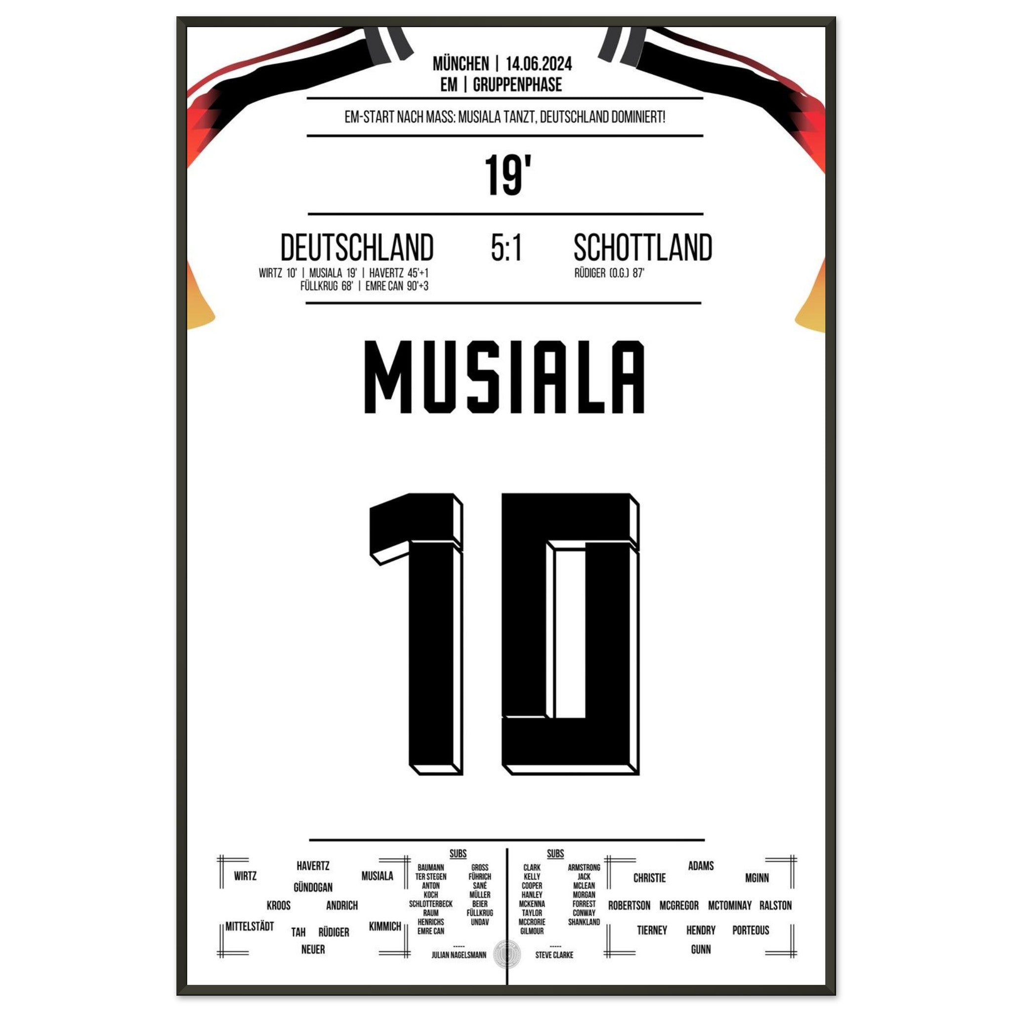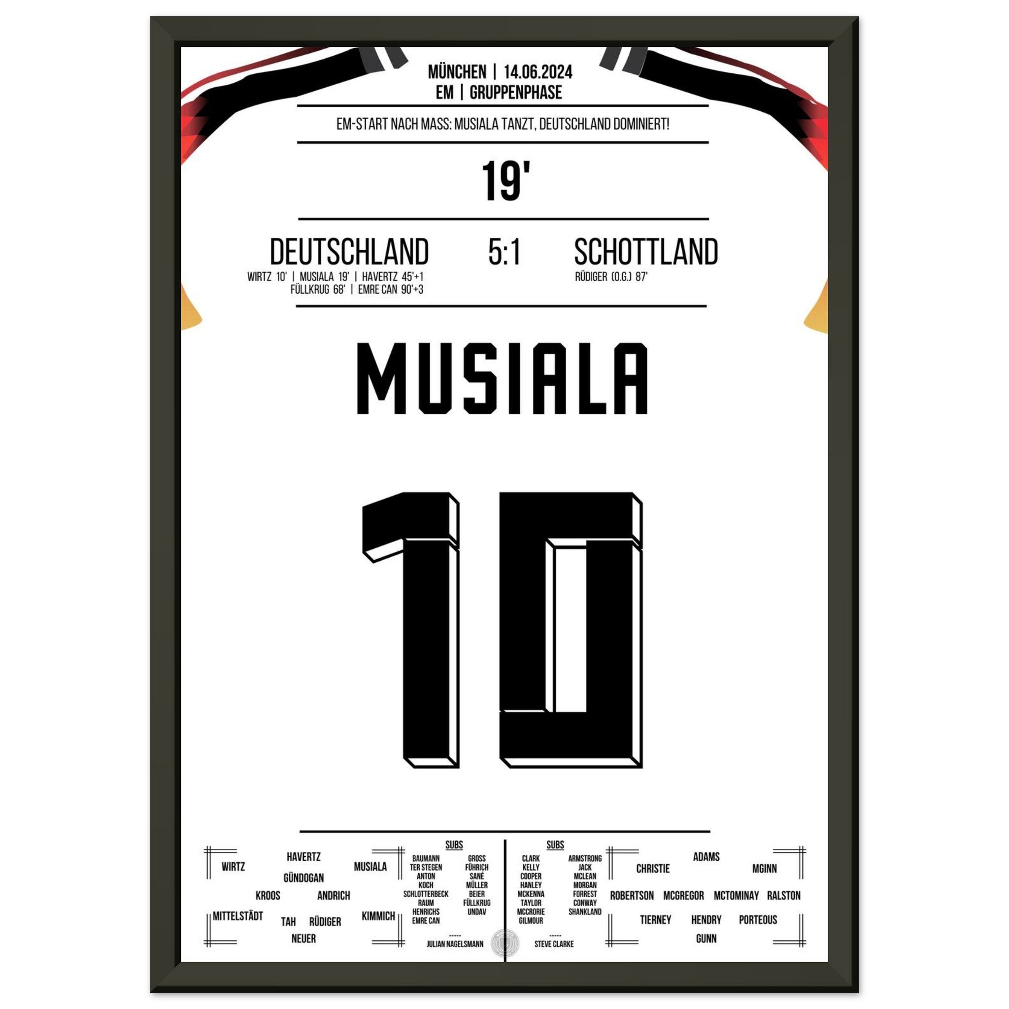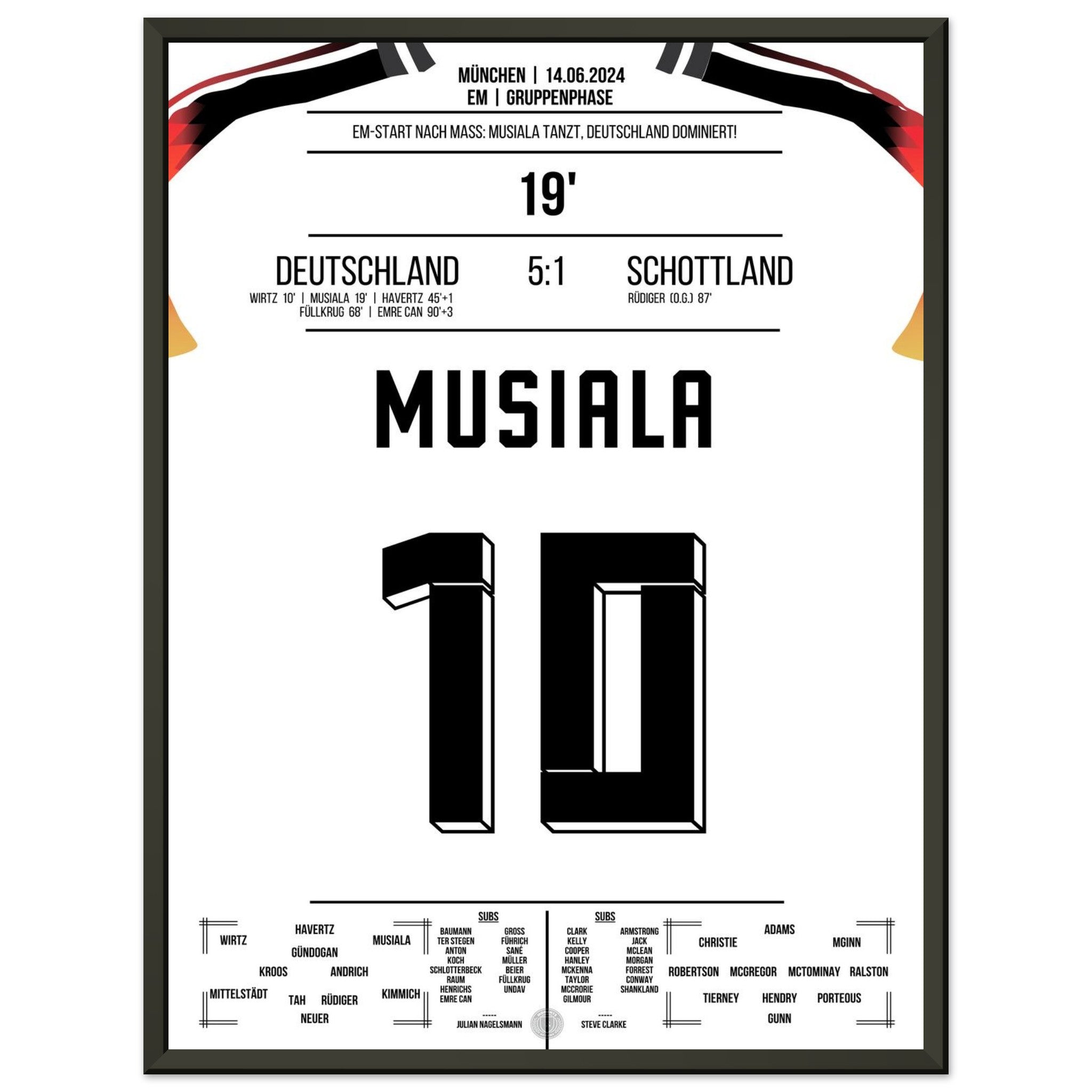 14. Juni 2024 – Deutschland vs. Schottland 5:1: Jamal Musiala verzaubert das EM-Eröffnungsspiel mit Tempo, Technik und einem Traumtor zum 2:0. Der Youngster lässt die Arena beben – und ganz Deutschland träumen. Unser Poster hält diesen magischen Auftaktmoment in München fest.