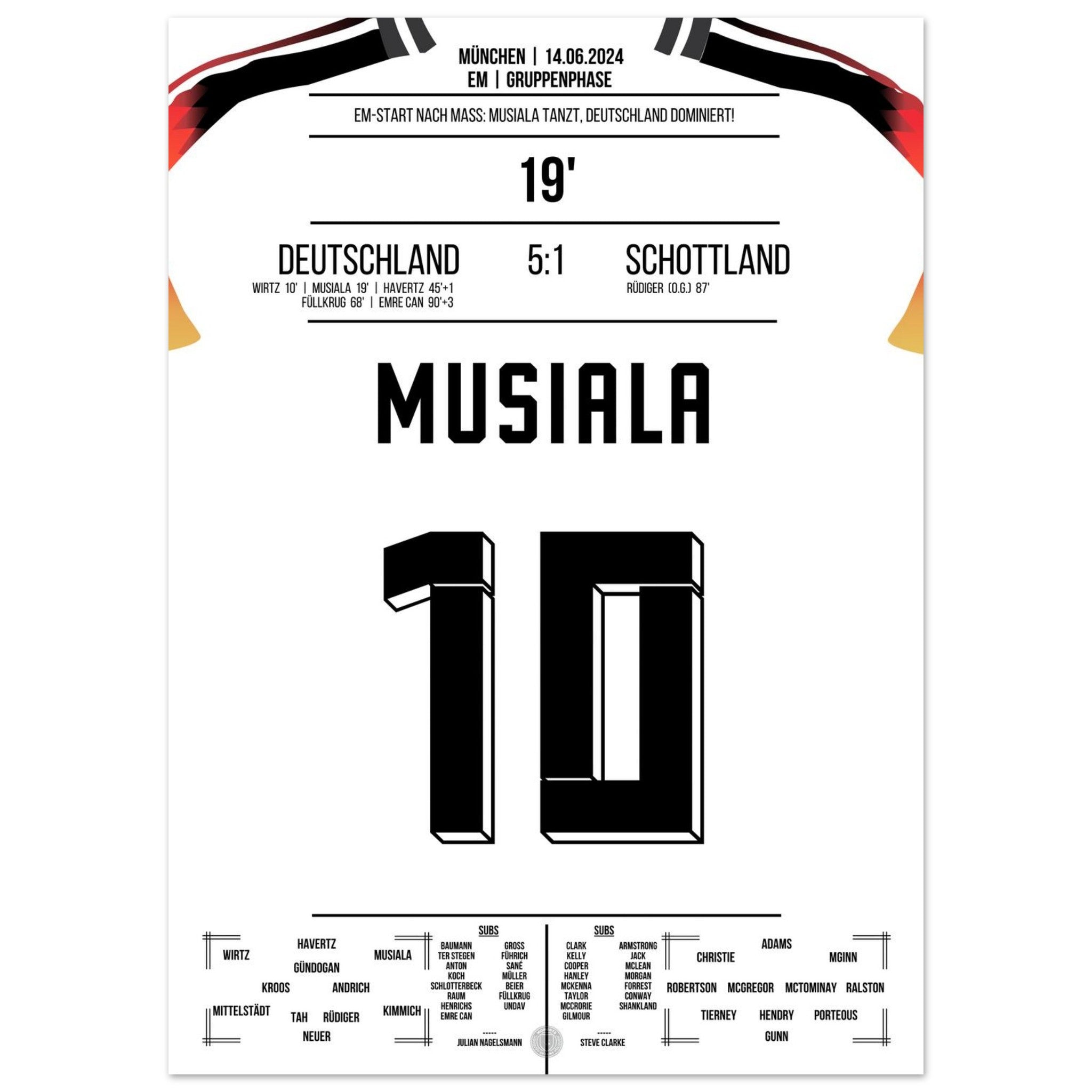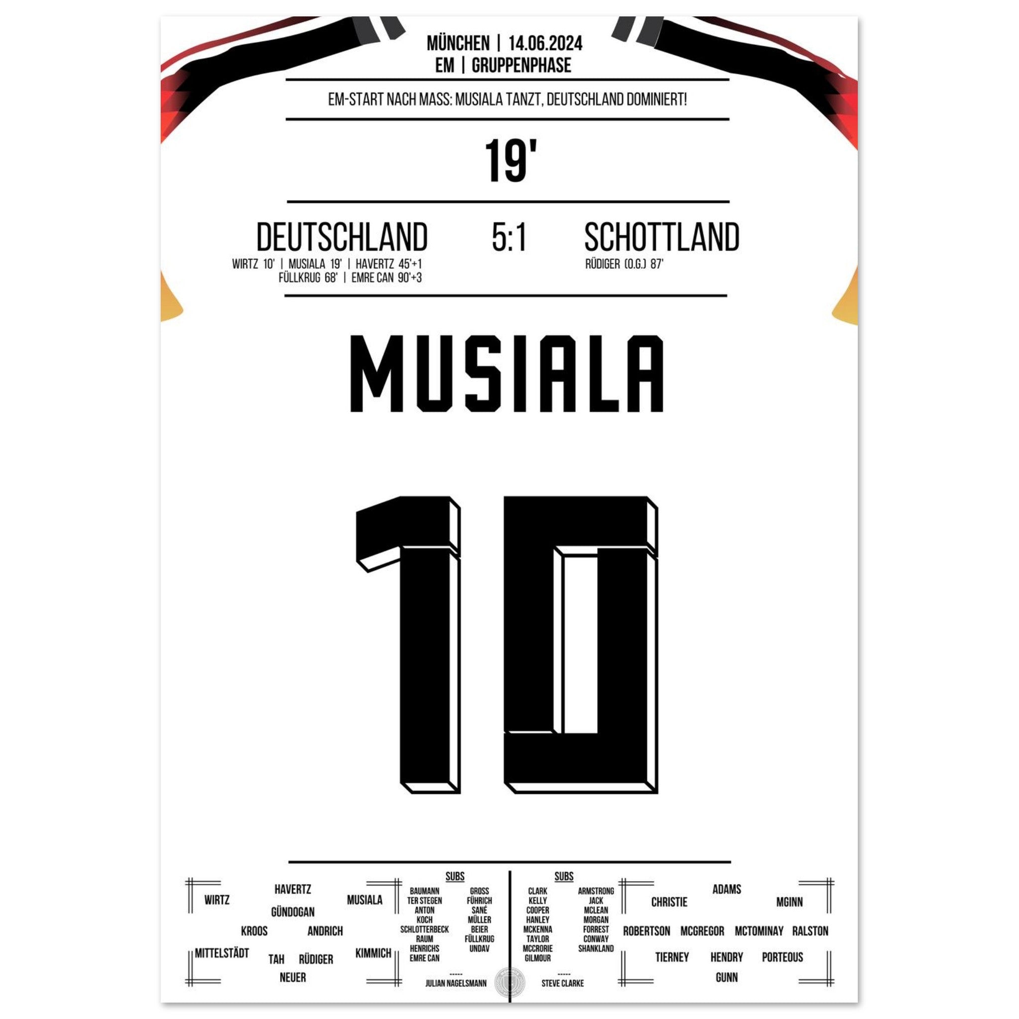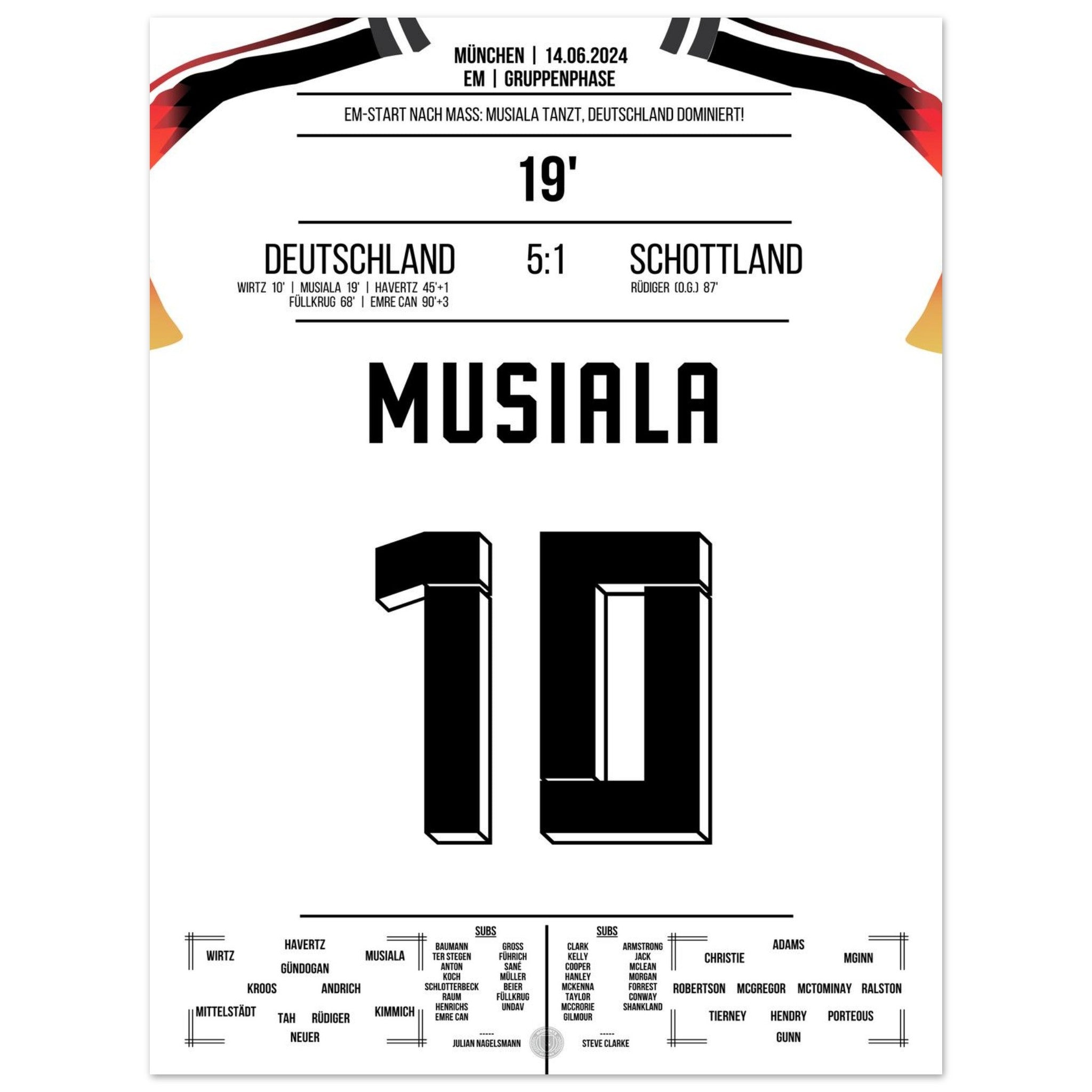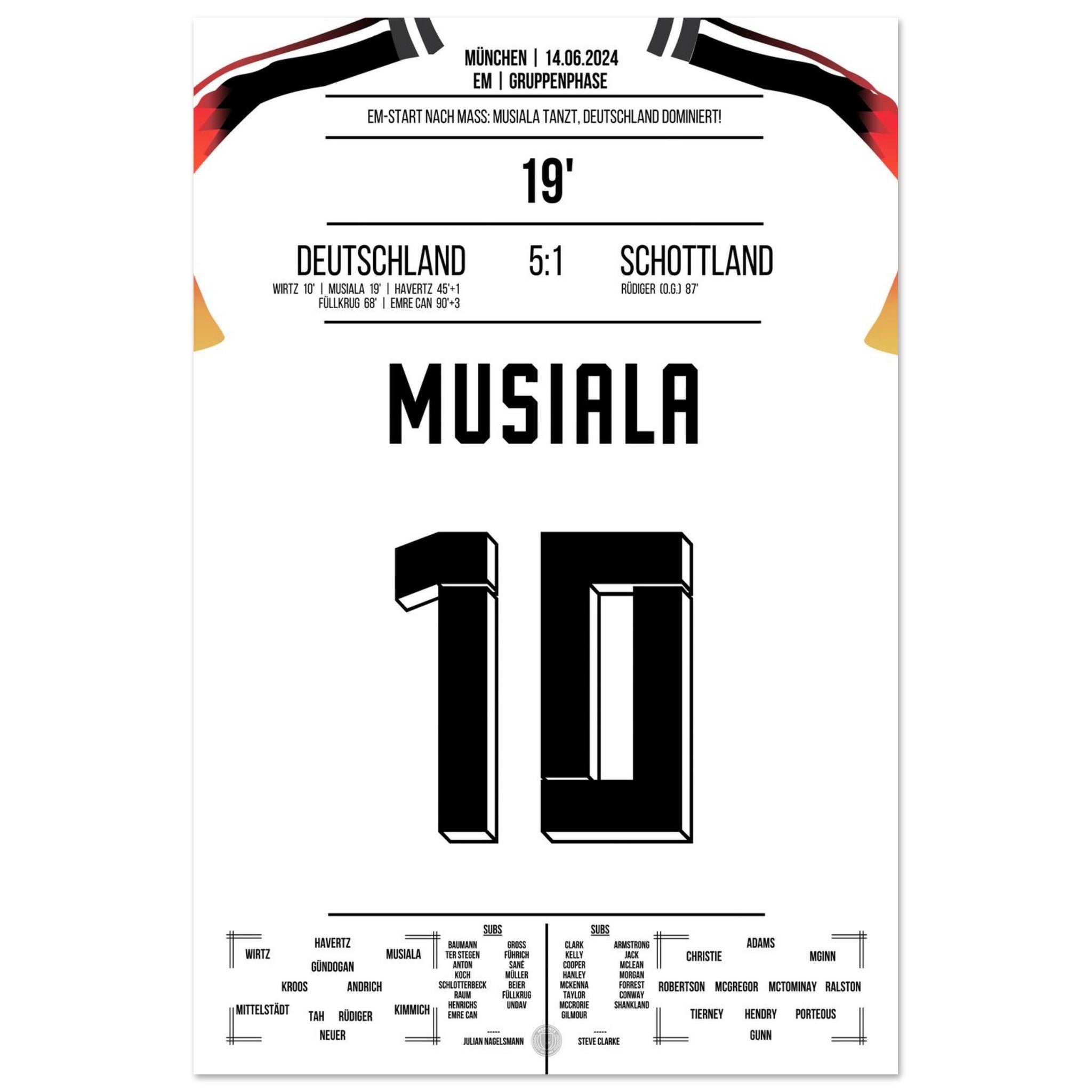 14. Juni 2024 – Deutschland vs. Schottland 5:1: Jamal Musiala verzaubert das EM-Eröffnungsspiel mit Tempo, Technik und einem Traumtor zum 2:0. Der Youngster lässt die Arena beben – und ganz Deutschland träumen. Unser Poster hält diesen magischen Auftaktmoment in München fest.