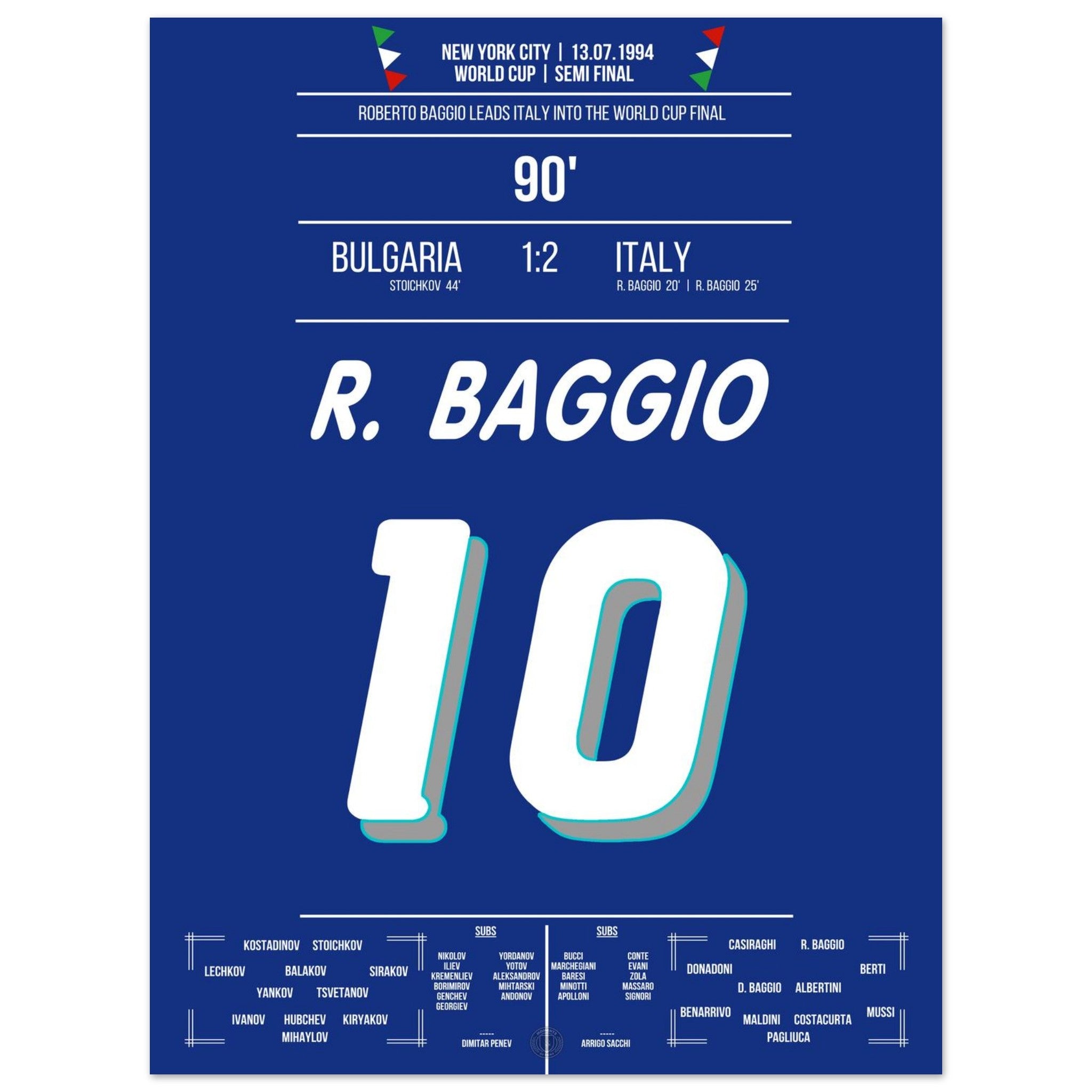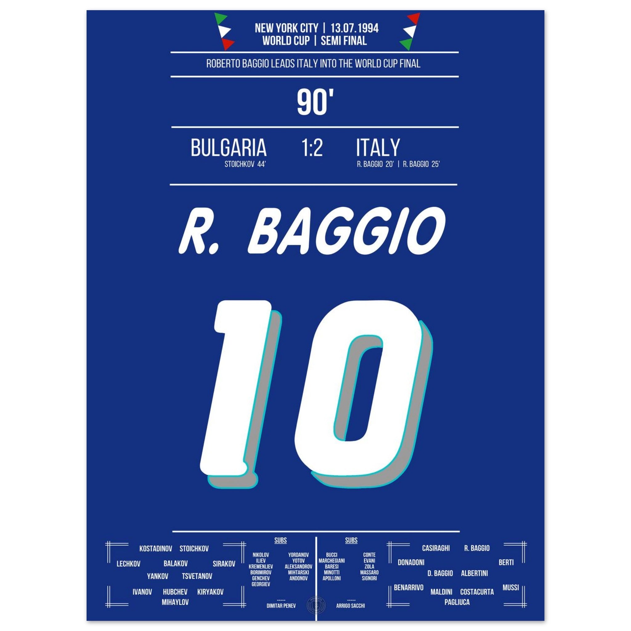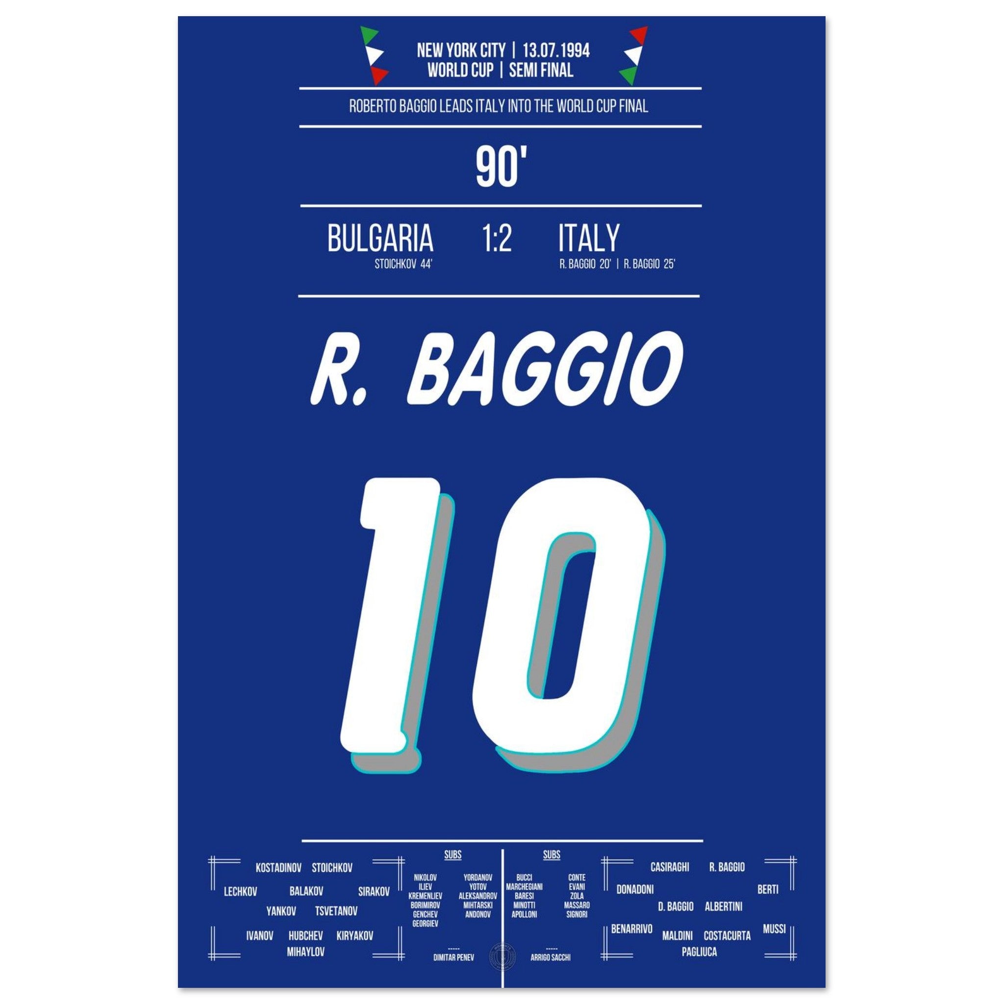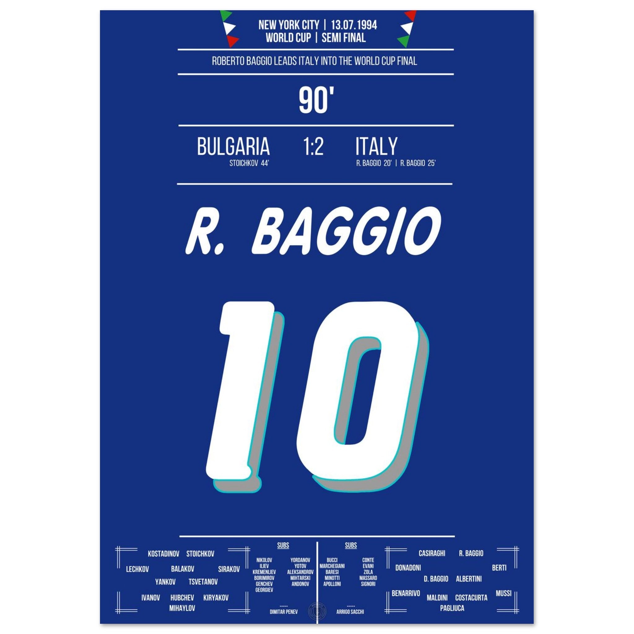Im WM-Halbfinale von New York entscheidet Roberto Baggio mit zwei Geniestreichen die Partie. Mit Eleganz, Ruhe und unnachahmlicher Technik schießt er Italien zum 2:1-Sieg und ins Endspiel. Ein Auftritt, der ihn endgültig zur Legende macht.