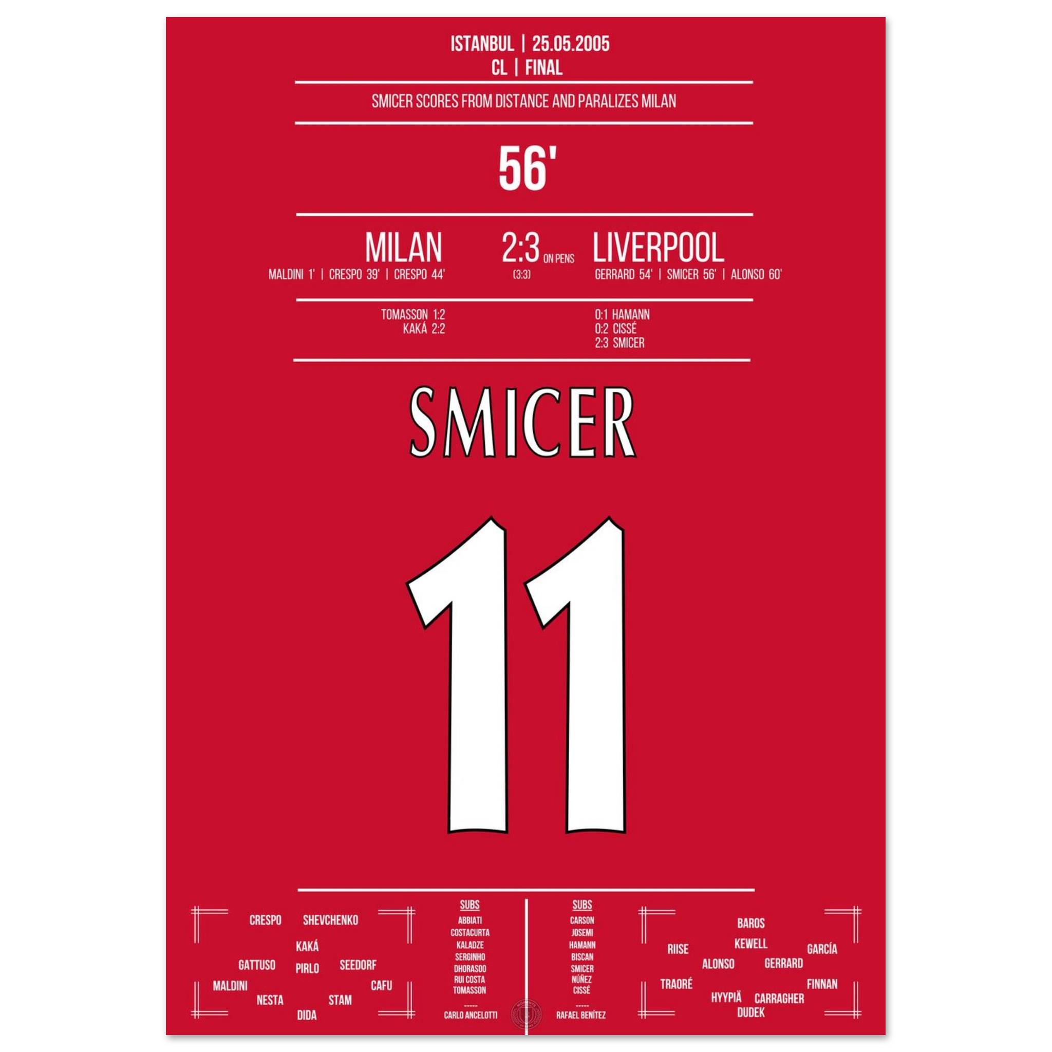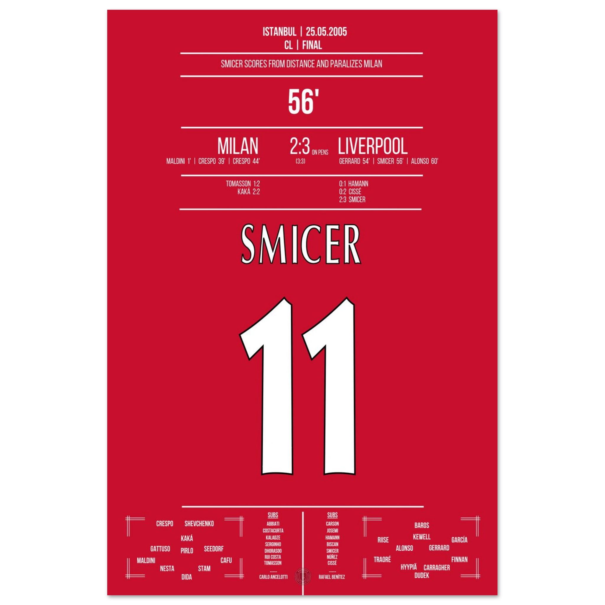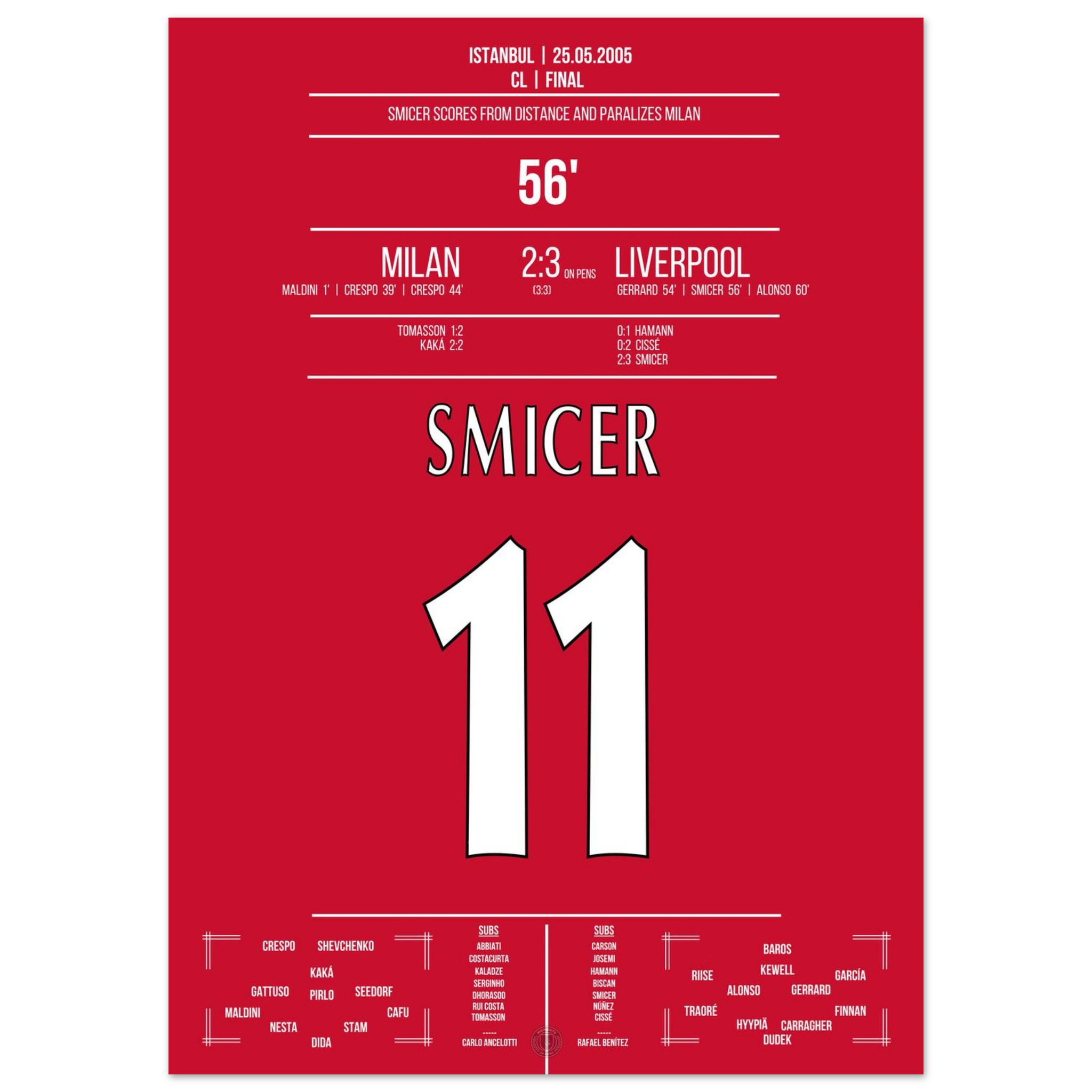 Nur zwei Minuten nach Gerrards Kopfball trifft Vladimir Smicer mit einem präzisen Schuss aus der Distanz zum 2:3 – das Stadion bebt, der Glaube ist zurück. Sein Treffer lässt das Wunder von Istanbul greifbar werden.