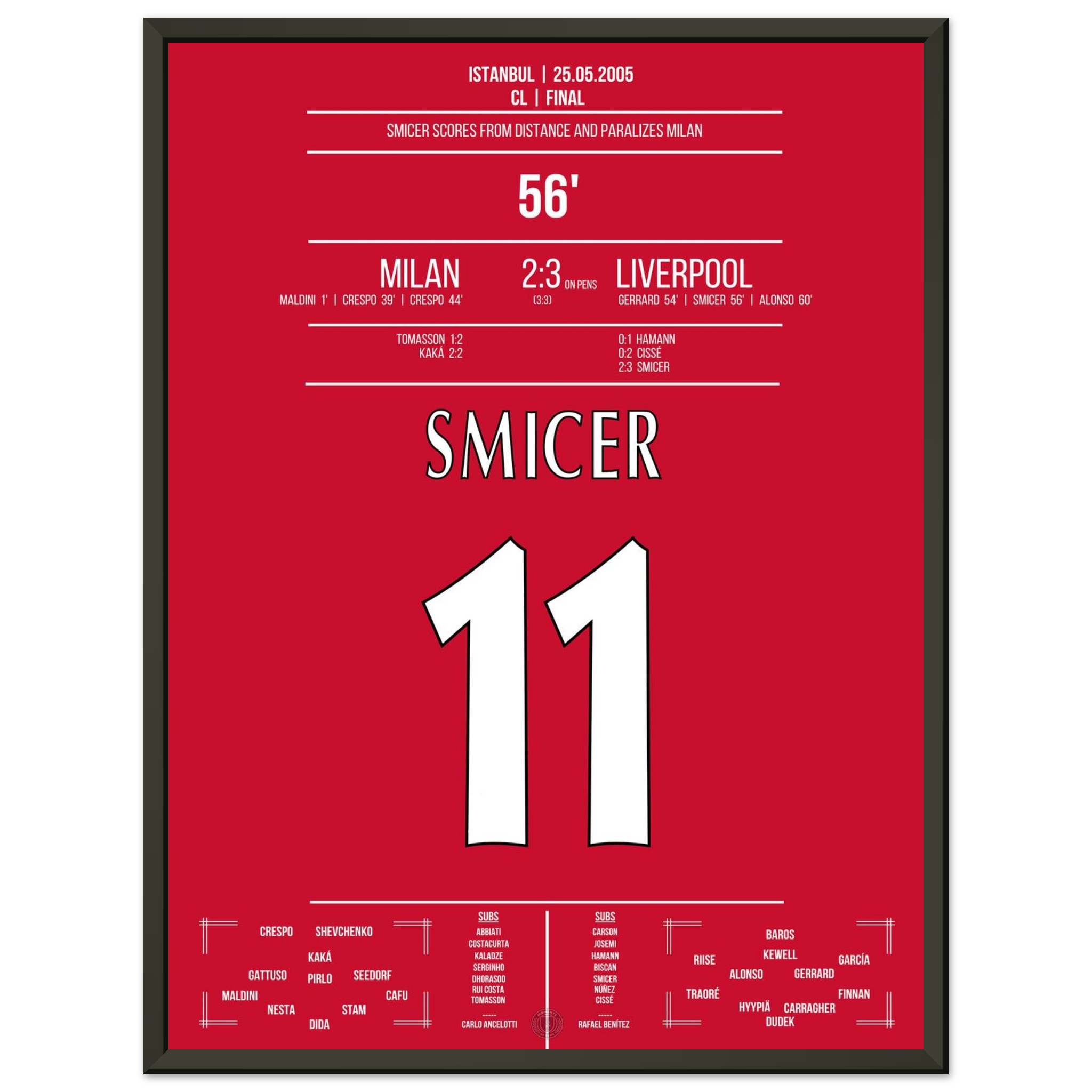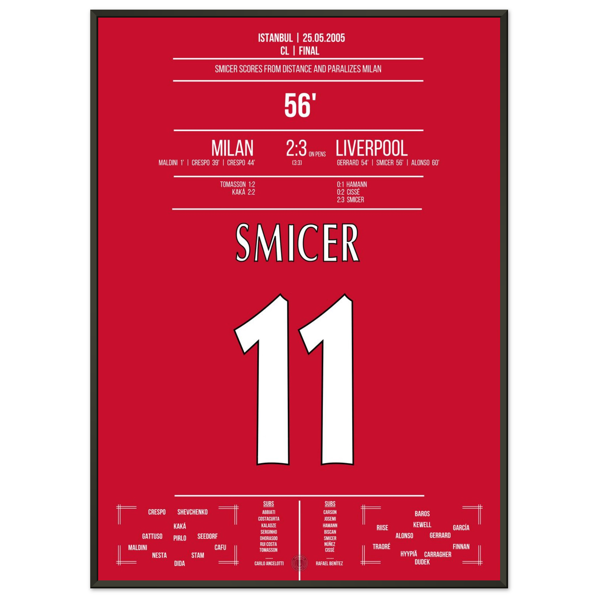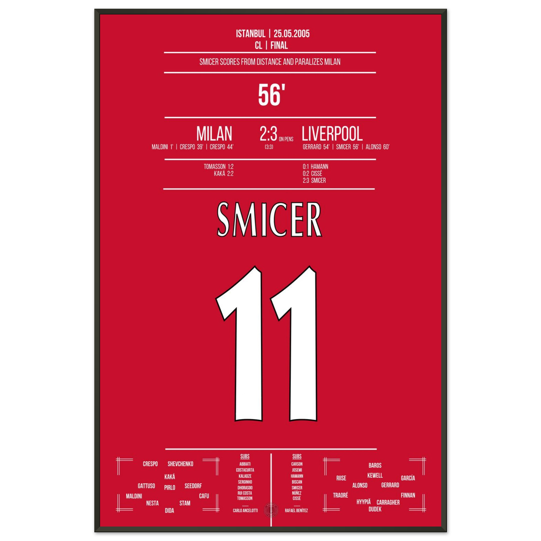 Nur zwei Minuten nach Gerrards Kopfball trifft Vladimir Smicer mit einem präzisen Schuss aus der Distanz zum 2:3 – das Stadion bebt, der Glaube ist zurück. Sein Treffer lässt das Wunder von Istanbul greifbar werden.