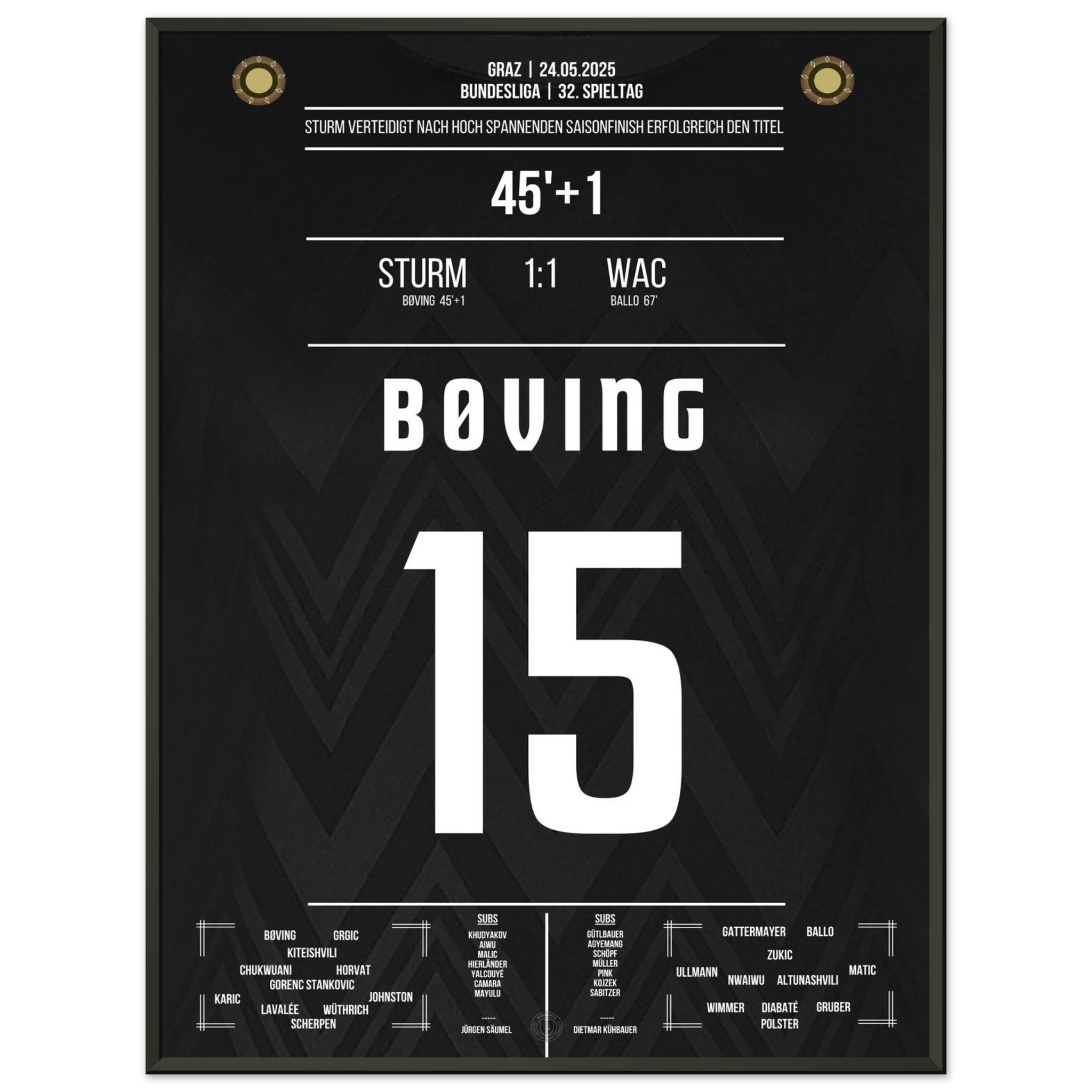 Trotz eines 1:1 gegen den WAC reicht Graz ein Punkt, um sich am letzten Spieltag den Meistertitel zu sichern. In einem nervenaufreibenden Saisonfinale belohnt sich das Team für eine konstant starke Spielzeit – und lässt das Stadion in Schwarz und Weiß explodieren.