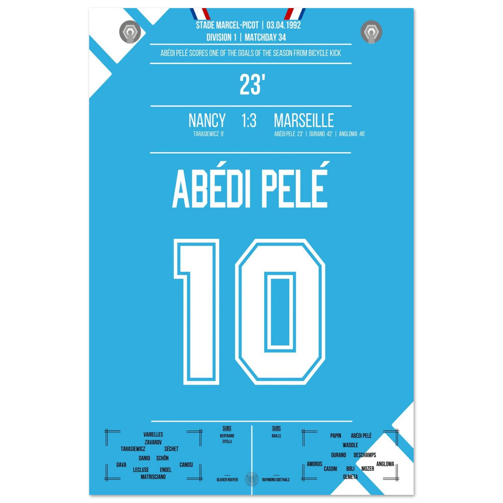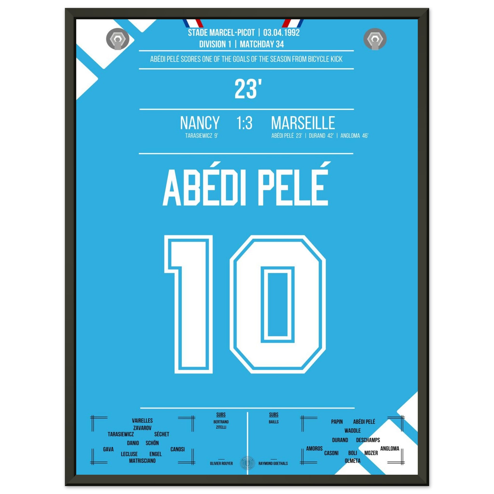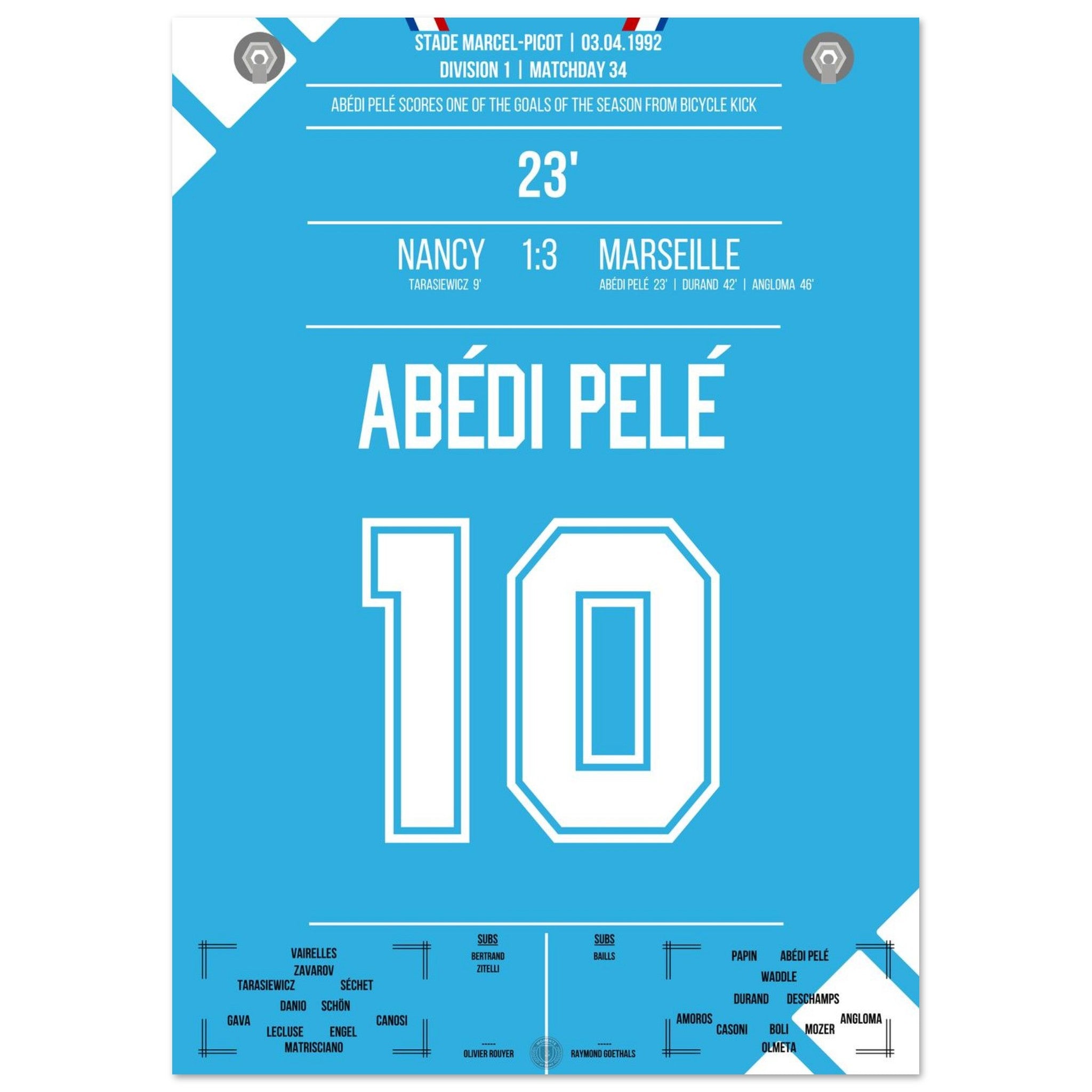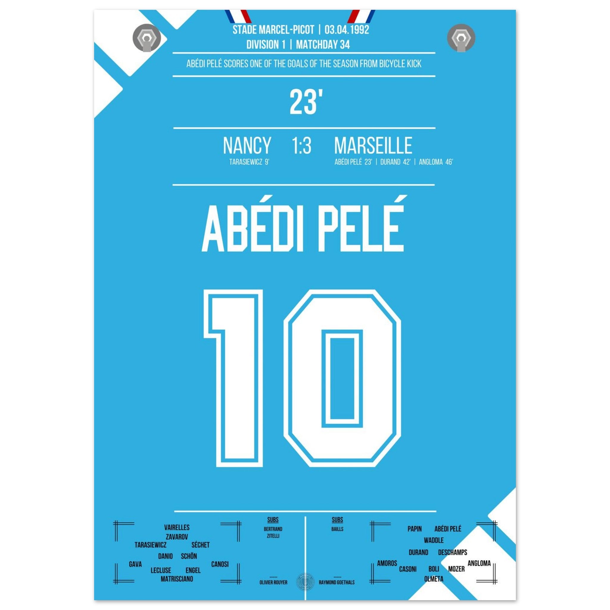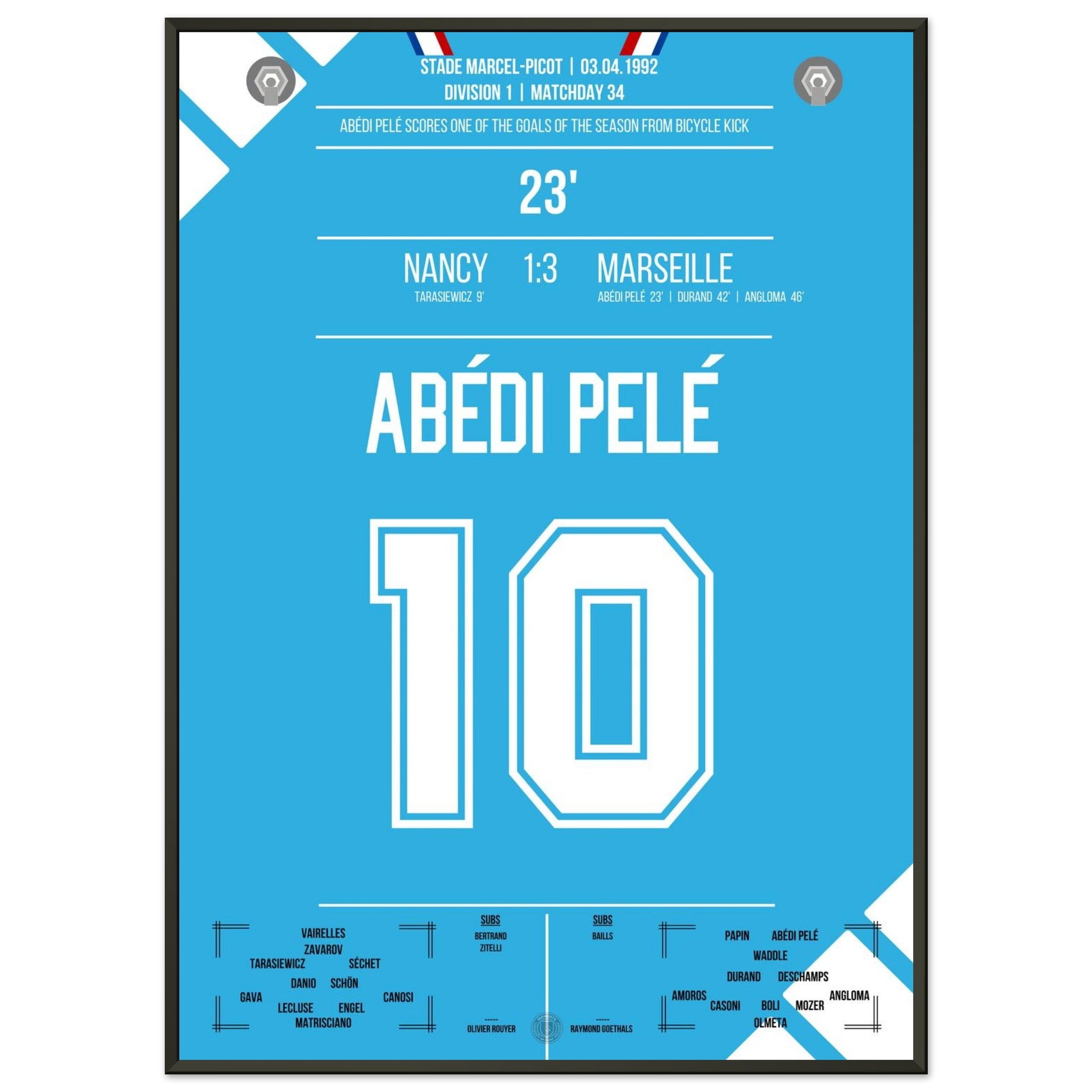 Abédi Pelé with a dream goal via a bicycle kick in the away victory in Nancy.