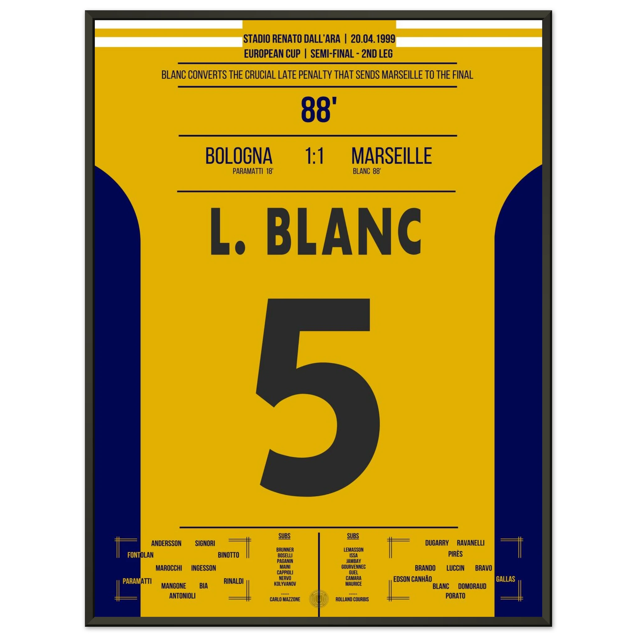In einer hart umkämpften Nacht in Italien sorgt Kapitän Laurent Blanc mit seinem Treffer für die Entscheidung. Sein Tor bringt Marseille ins Finale des europäischen Wettbewerbs – Erfahrung, Eleganz und Führungsstärke in Reinform.