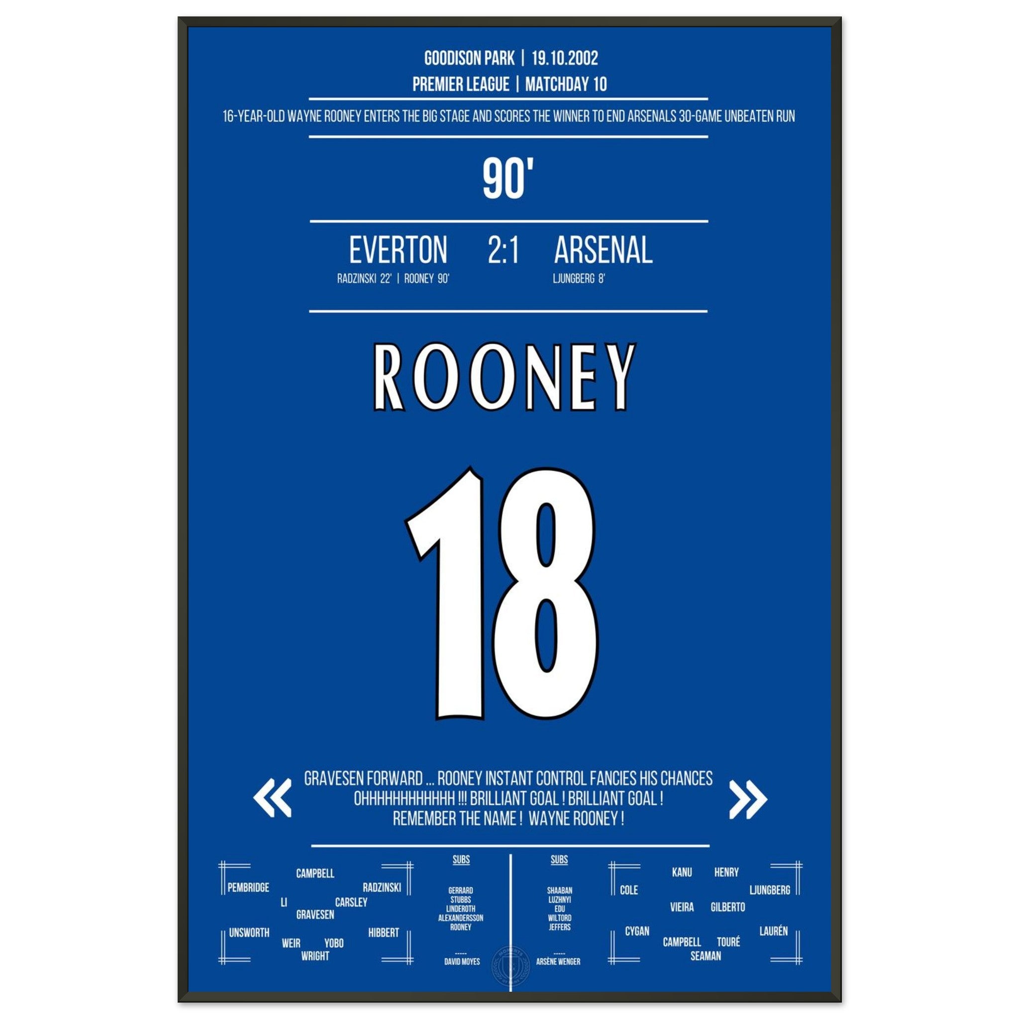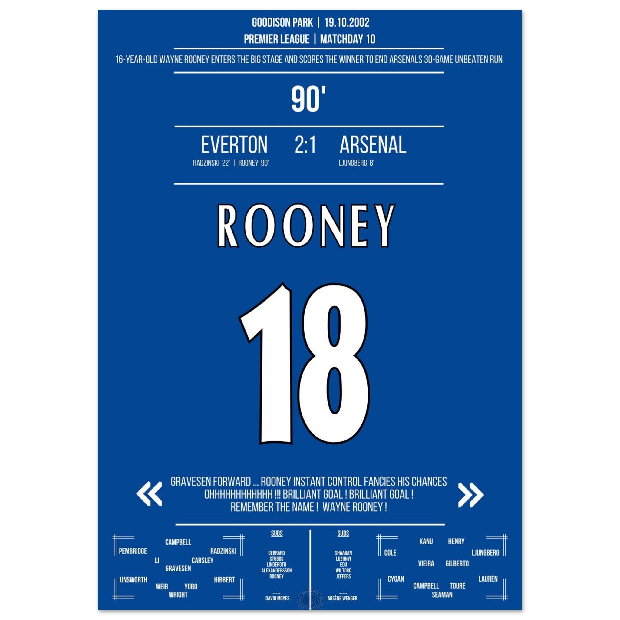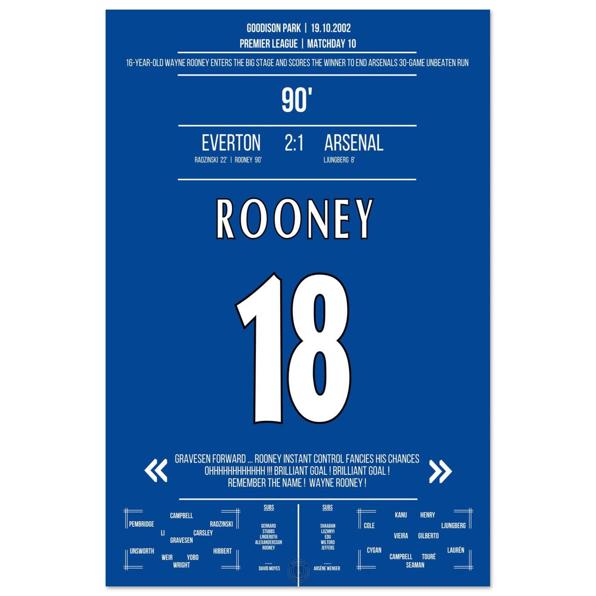 The 16-year-old Rooney steps onto the big stage with a winning goal in the 90th minute against Arsenal.