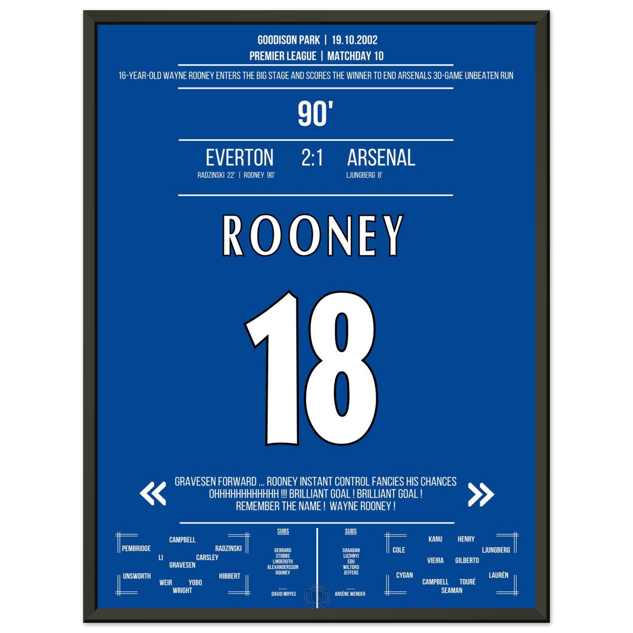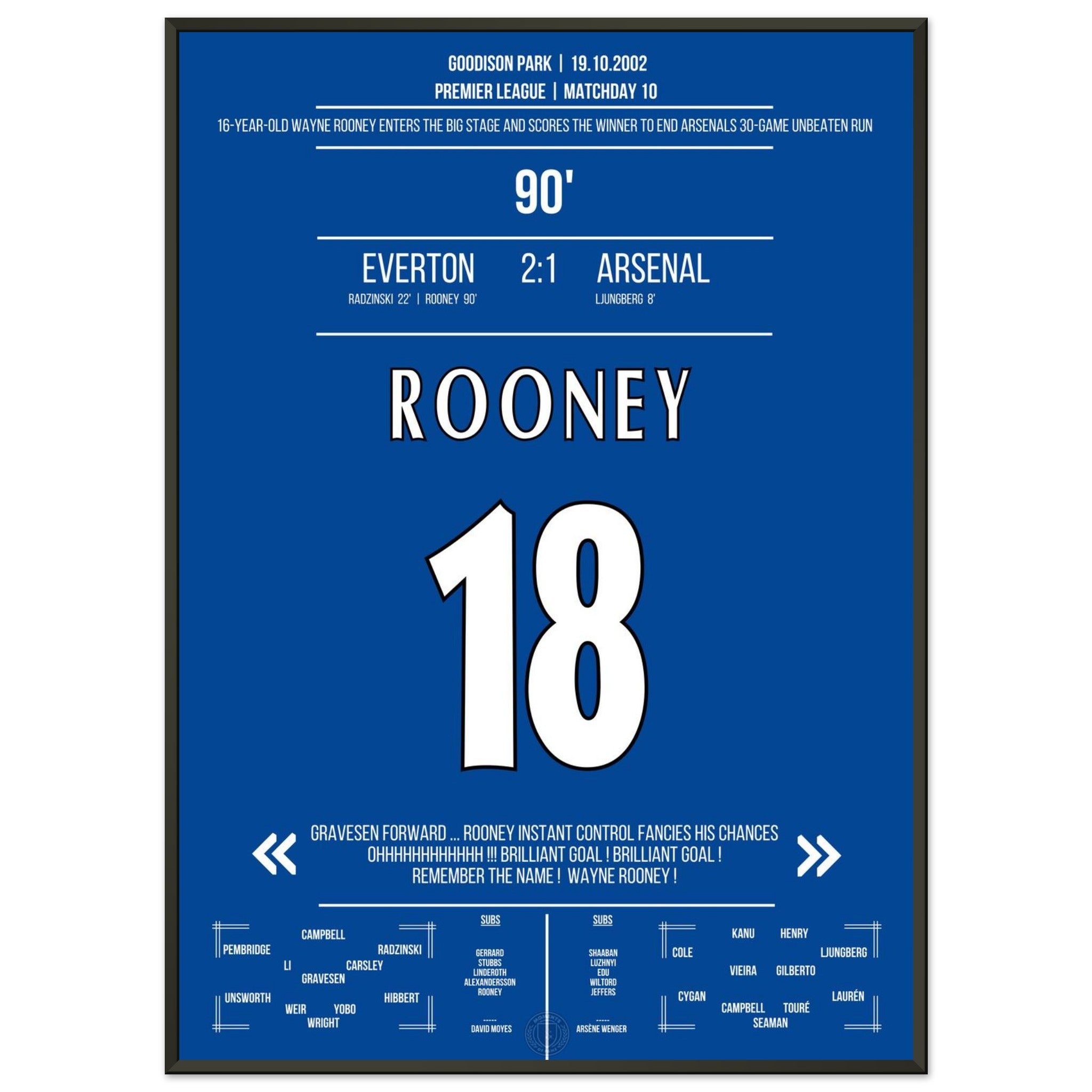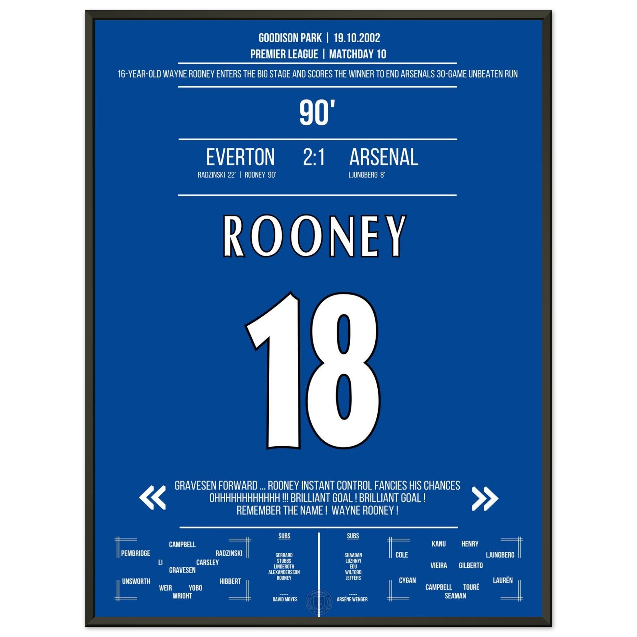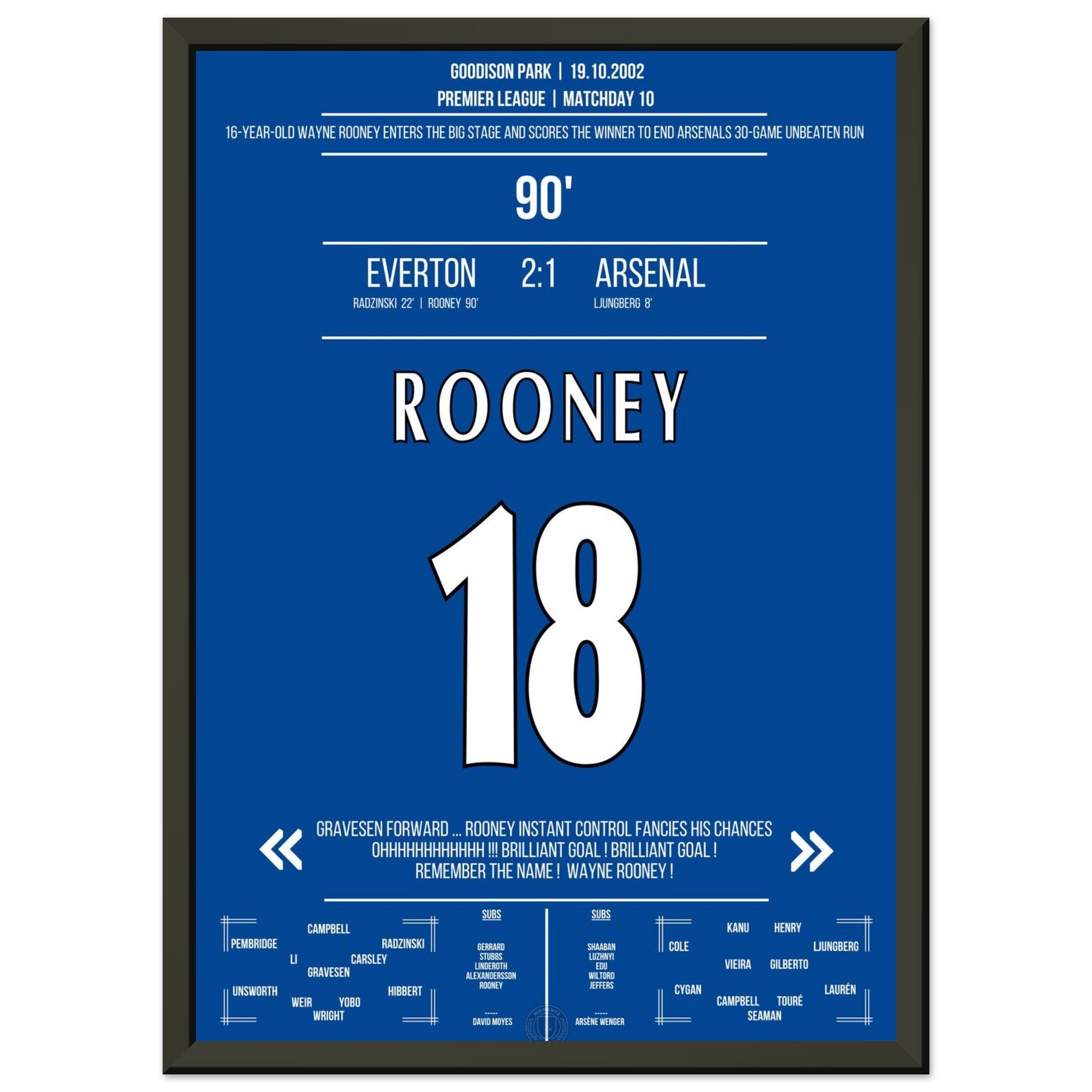 The 16-year-old Rooney steps onto the big stage with a winning goal in the 90th minute against Arsenal.