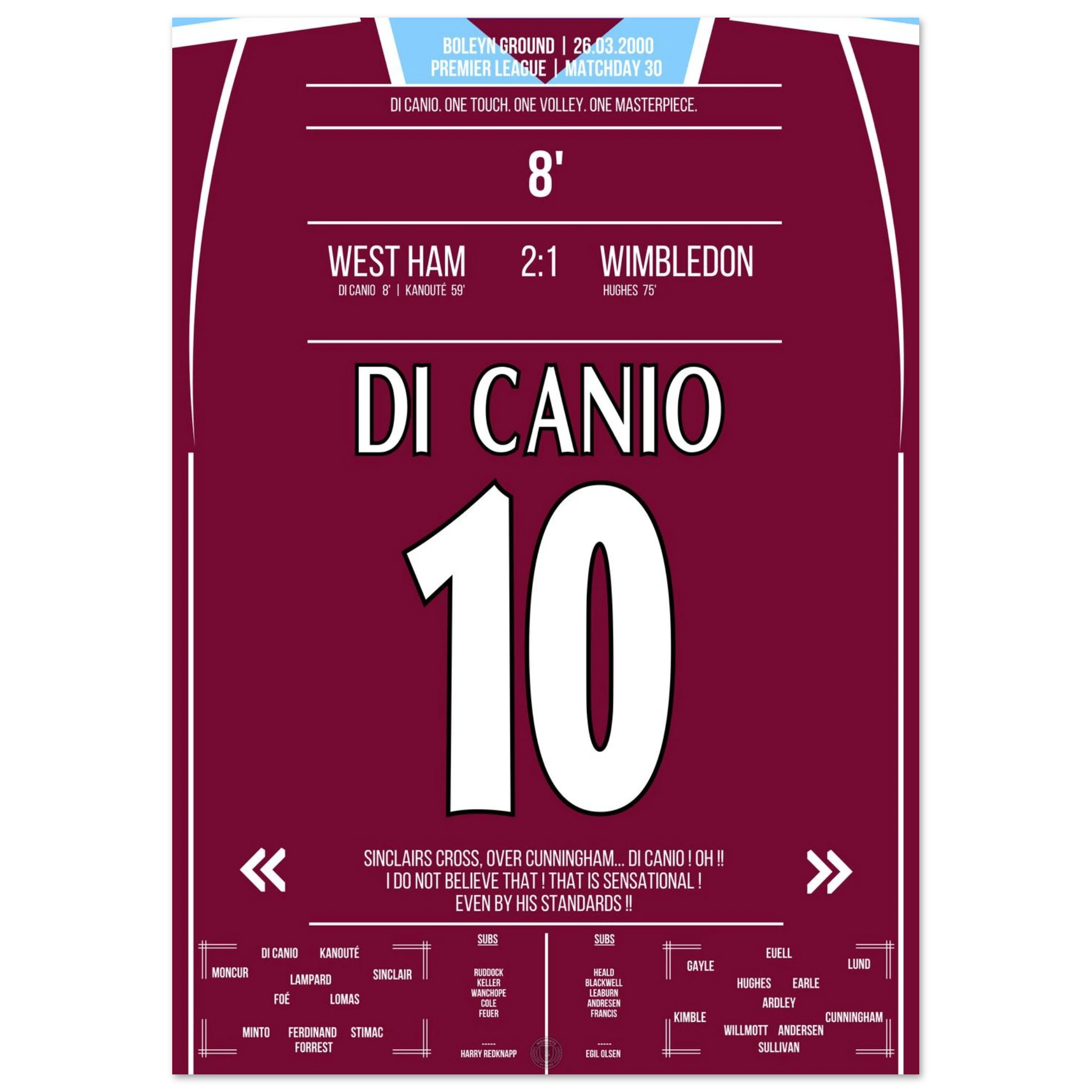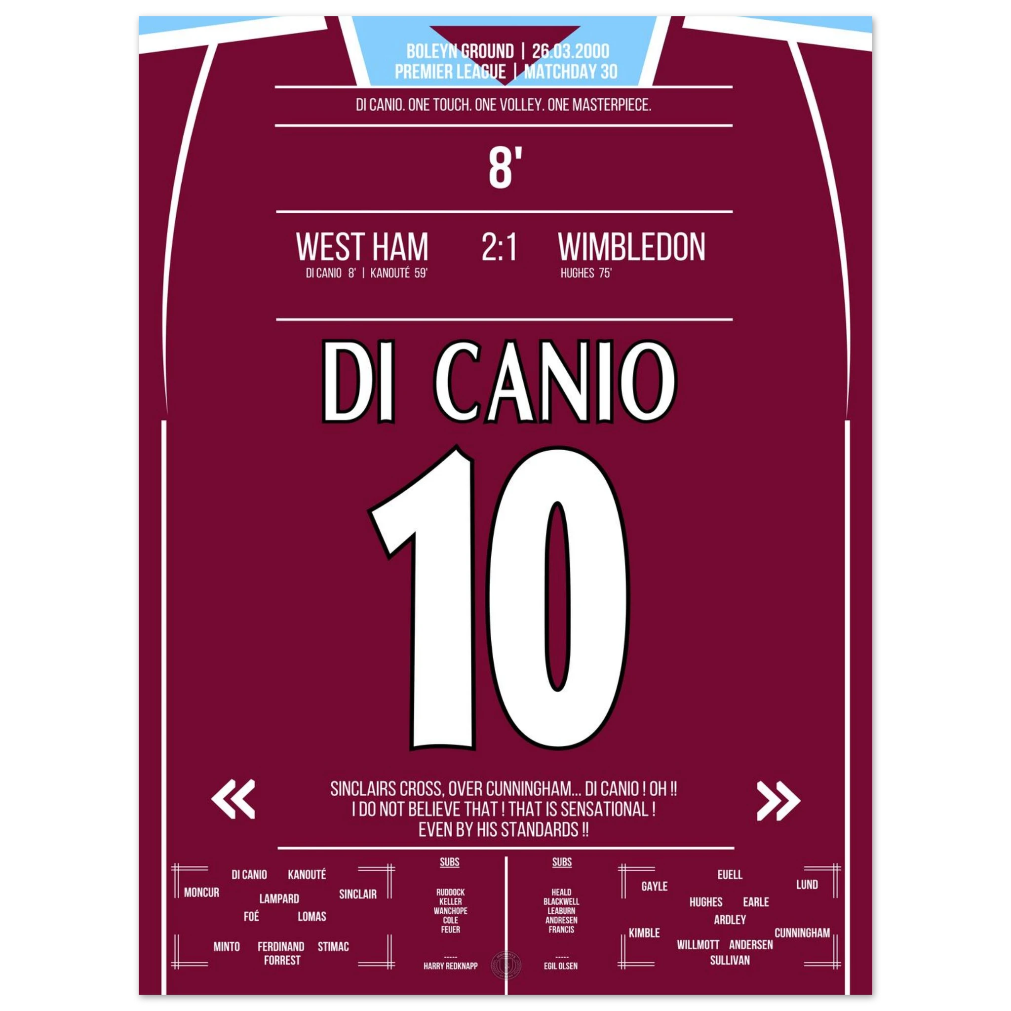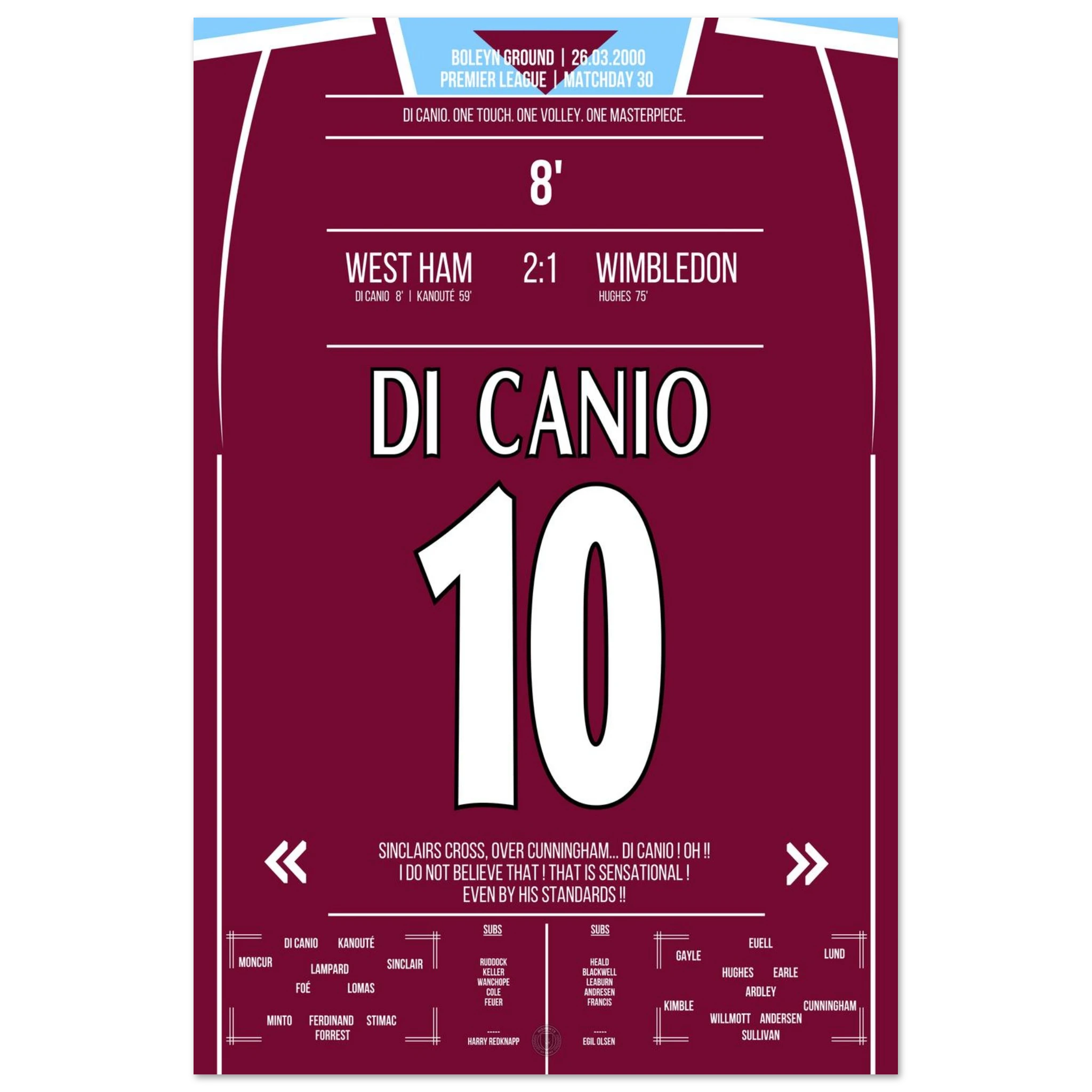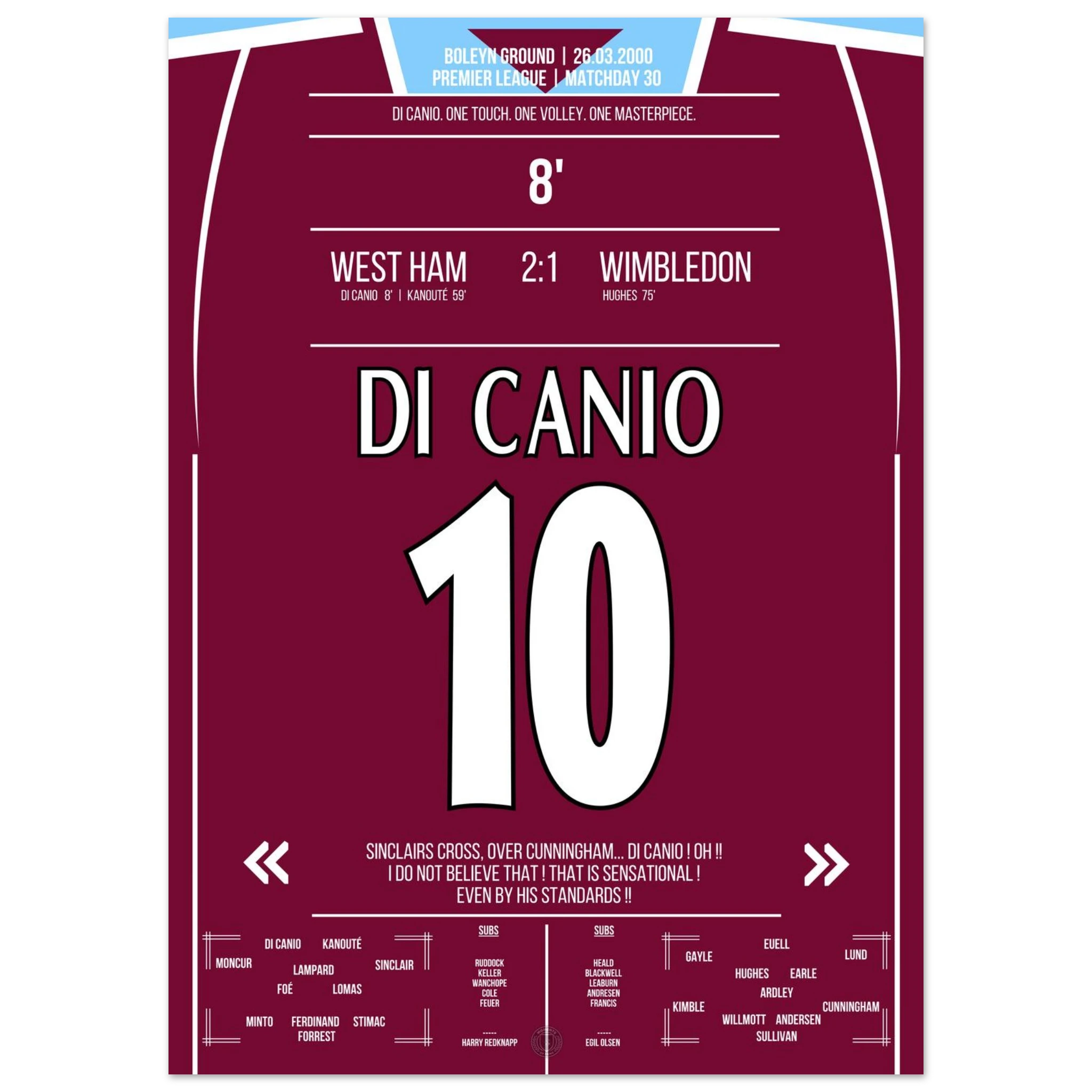 Unser Poster hält diesen magischen Moment fest – Di Canios Kunstwerk in Claret and Blue.