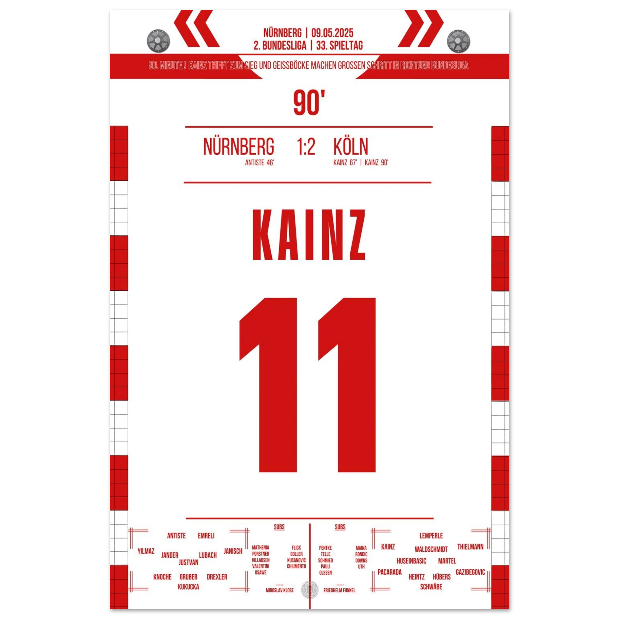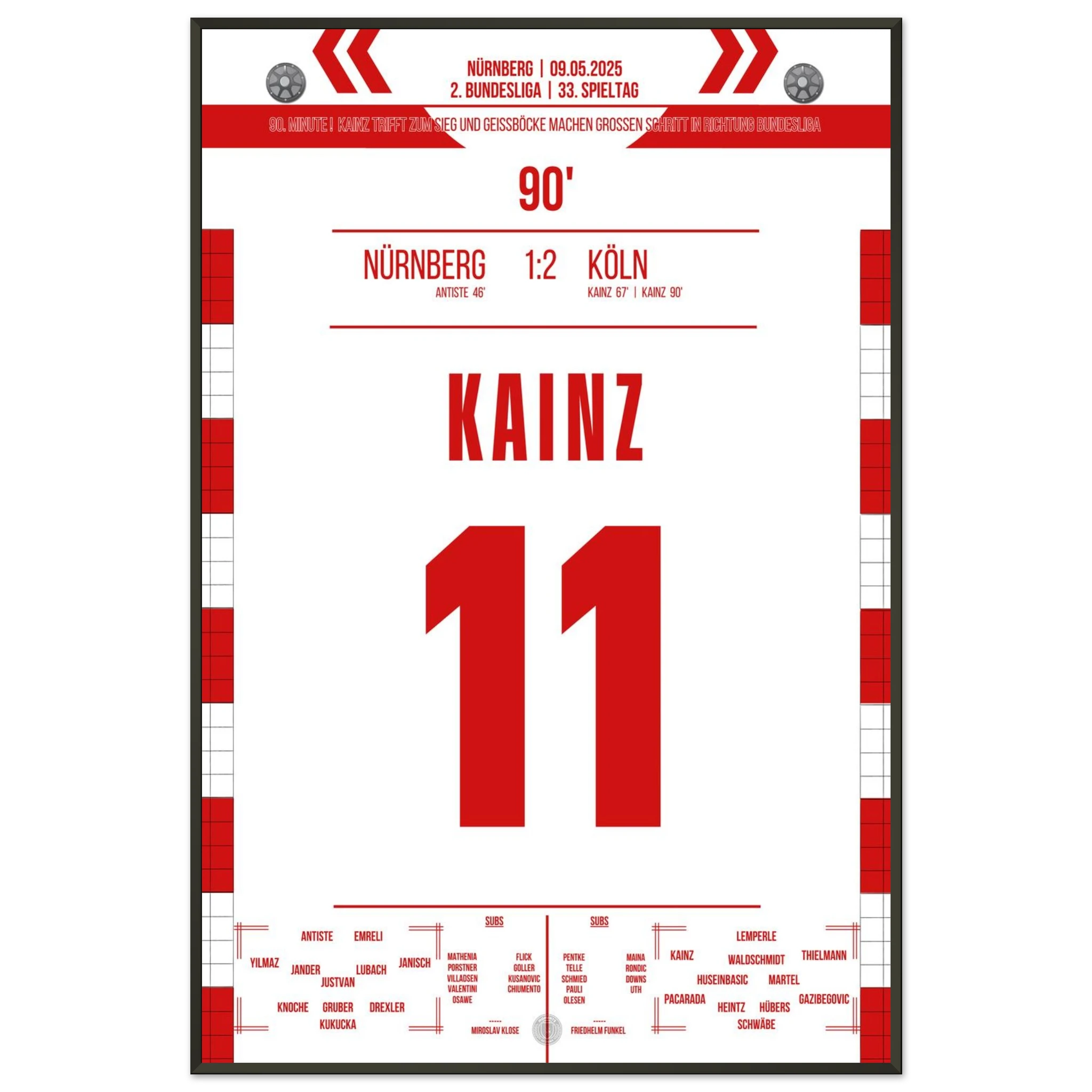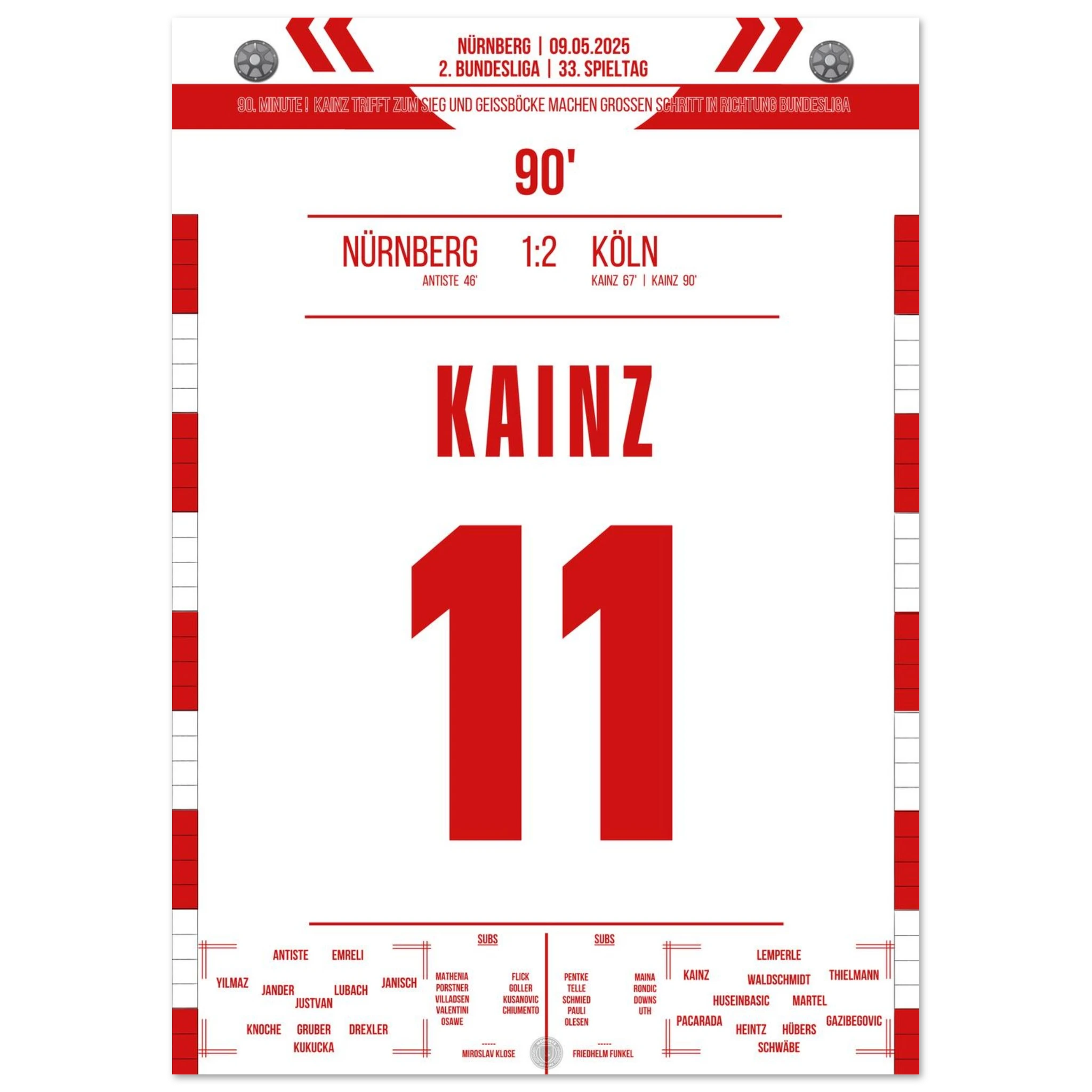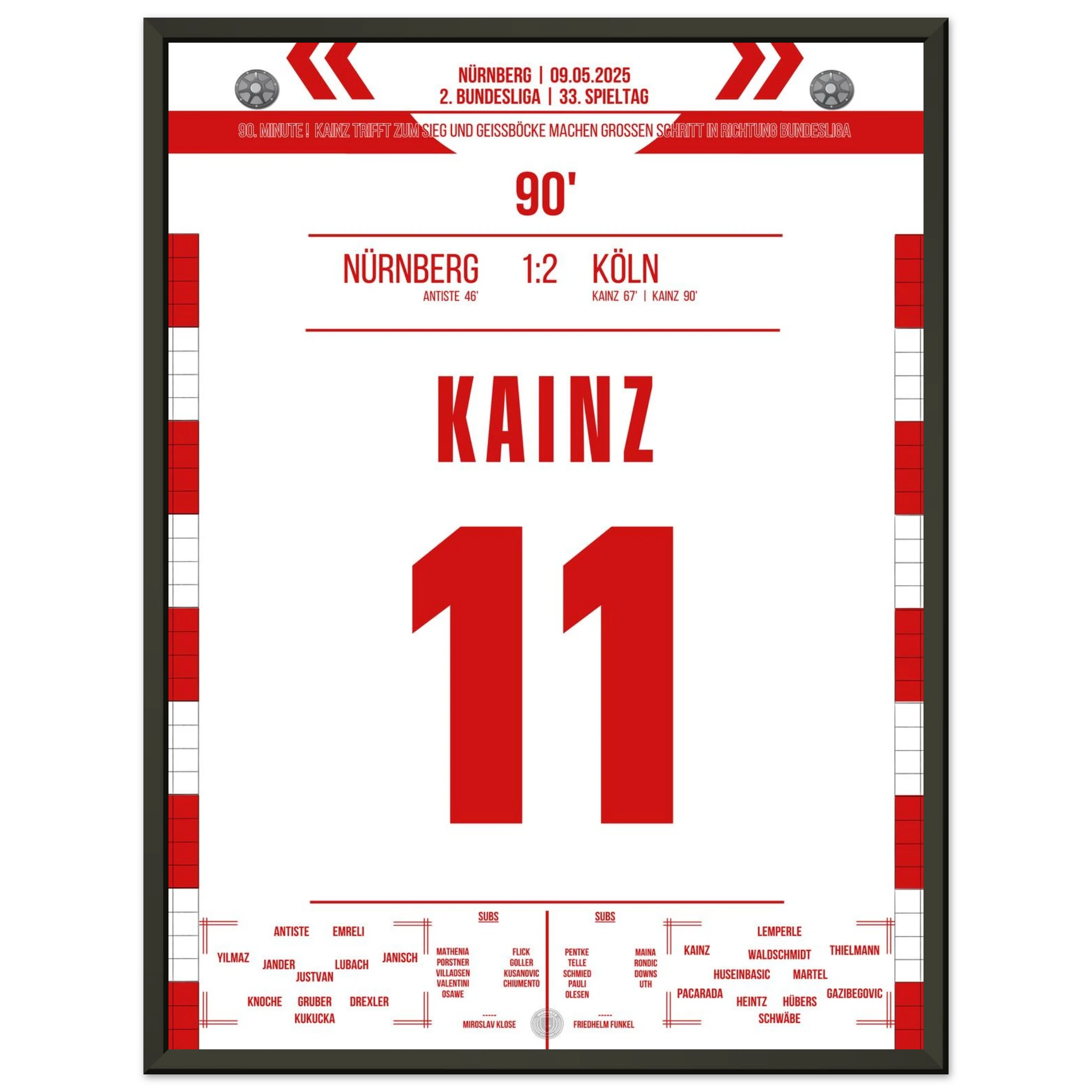 9. Mai 2025 – Nürnberg vs. Köln 1:2: In der 90. Minute sorgt Florian Kainz mit einem späten Treffer für die Entscheidung und lässt Köln in der Schlussphase jubeln. Ein Last-Minute-Sieg mit großer Wirkung im Saisonendspurt. Unser Poster hält diesen dramatischen Moment in Rot-Weiß fest.