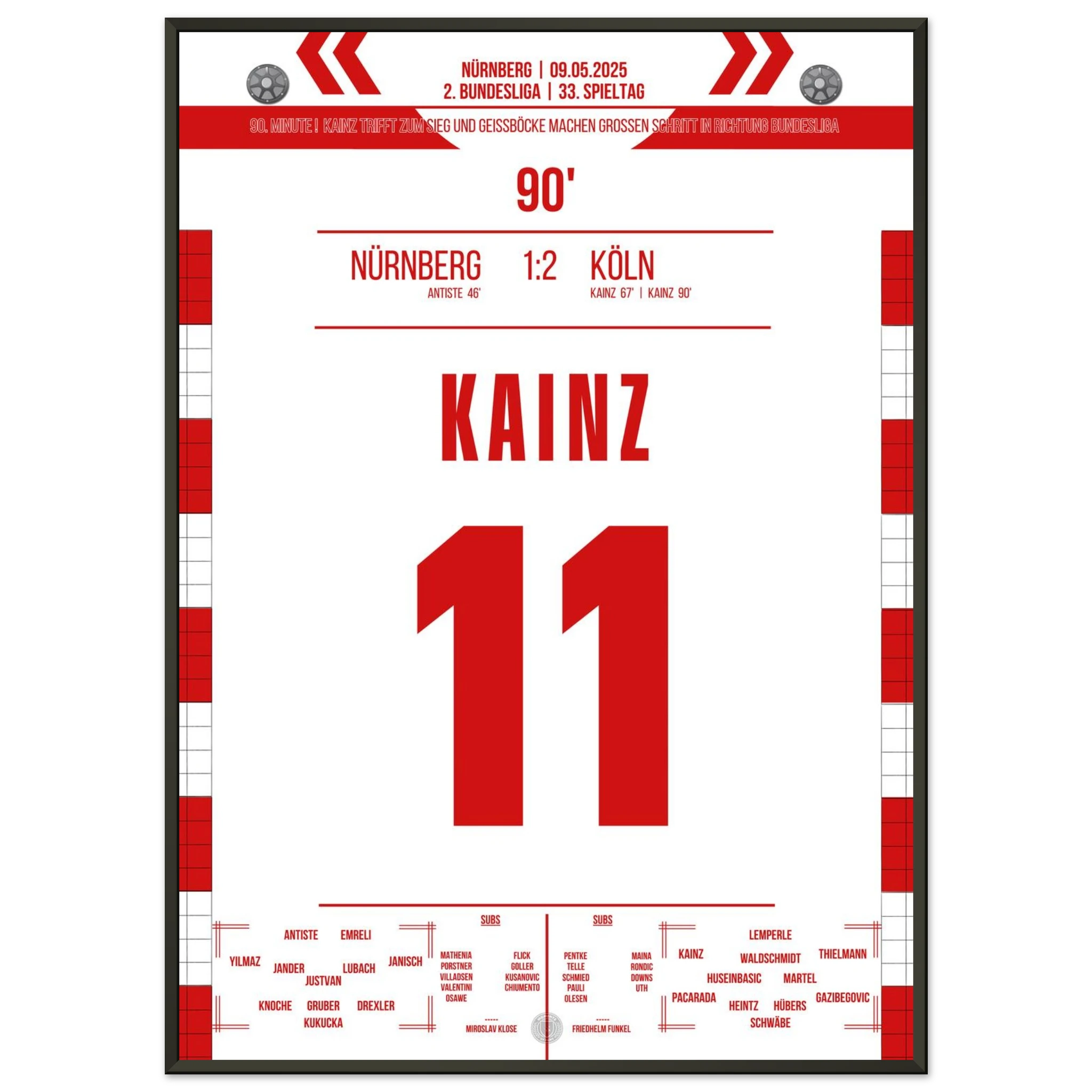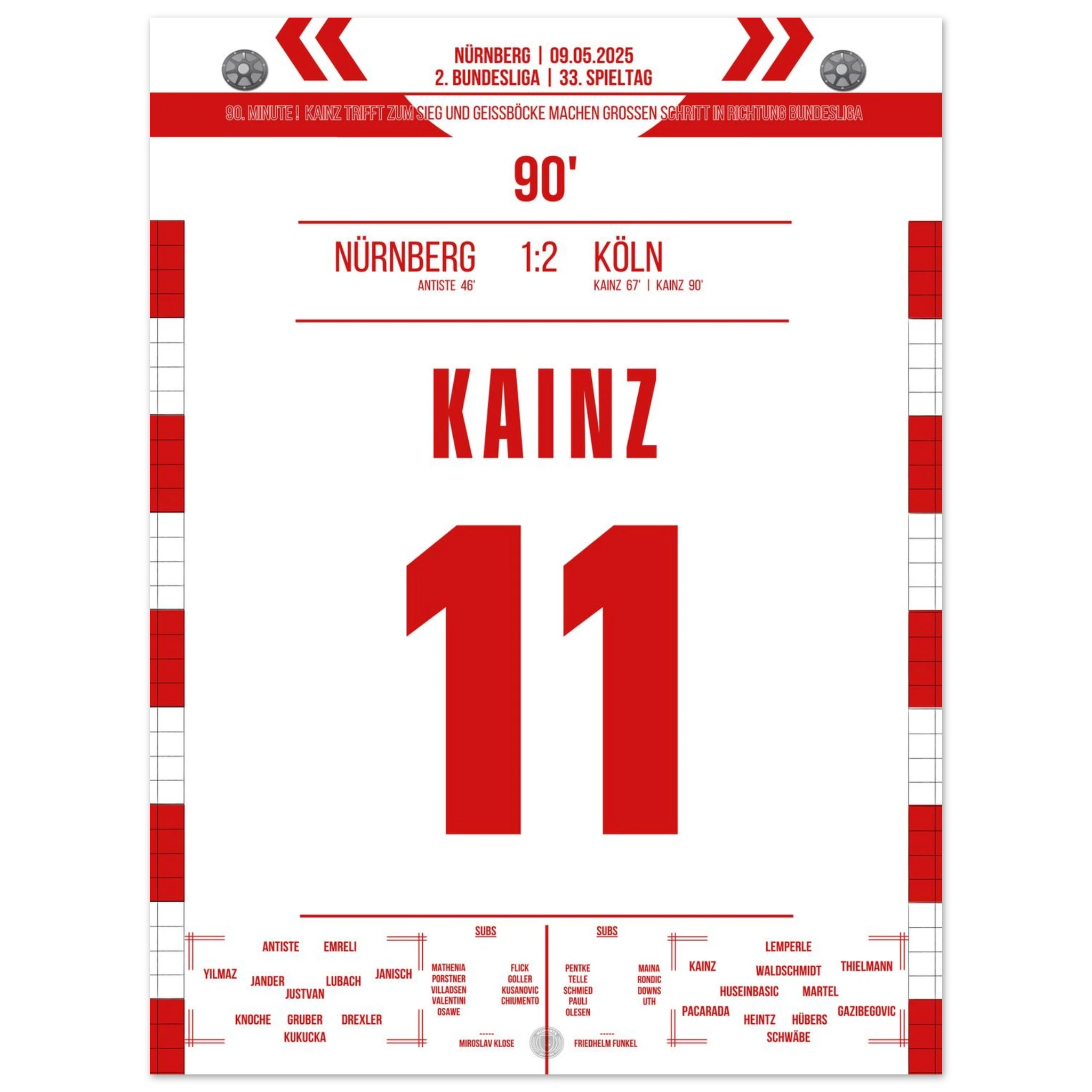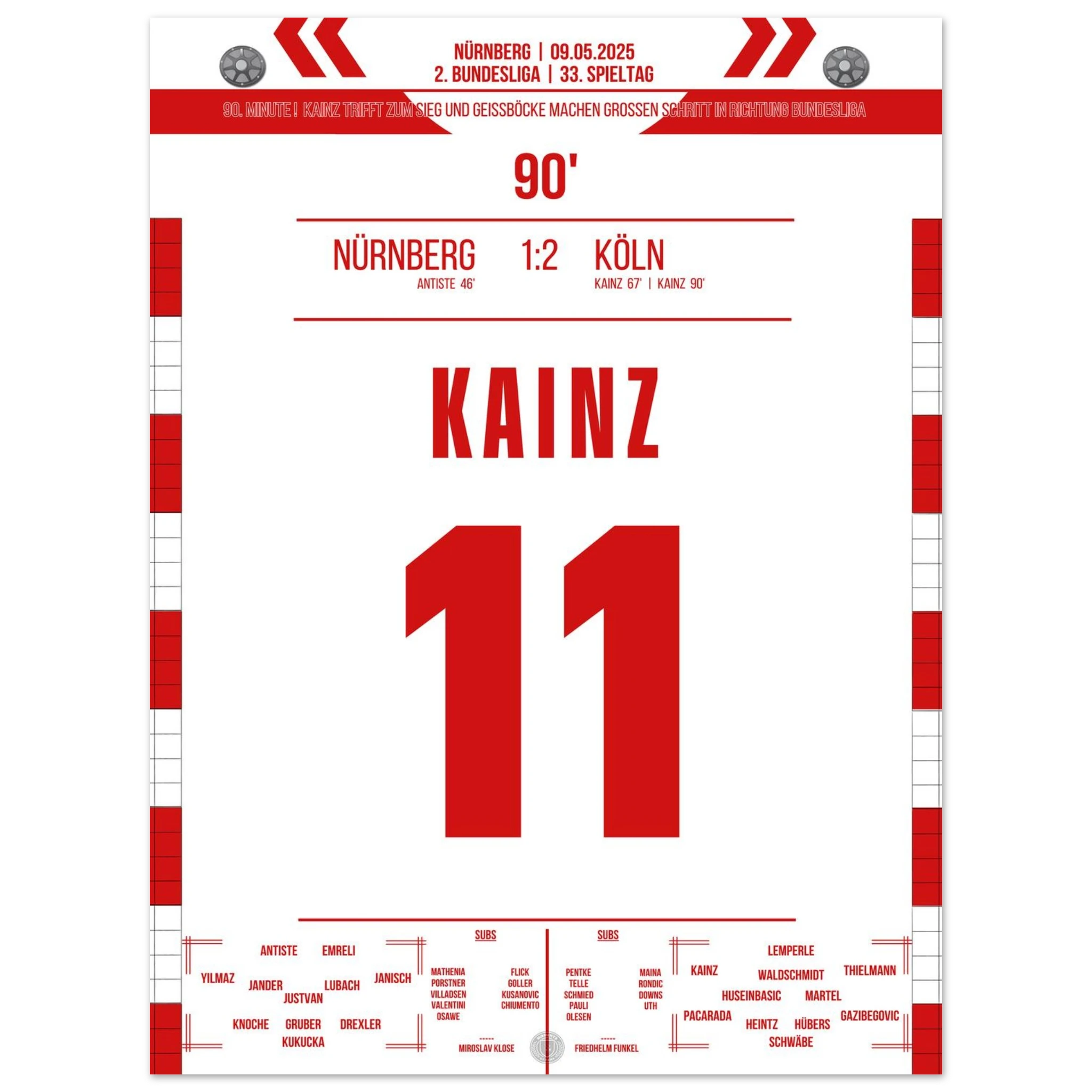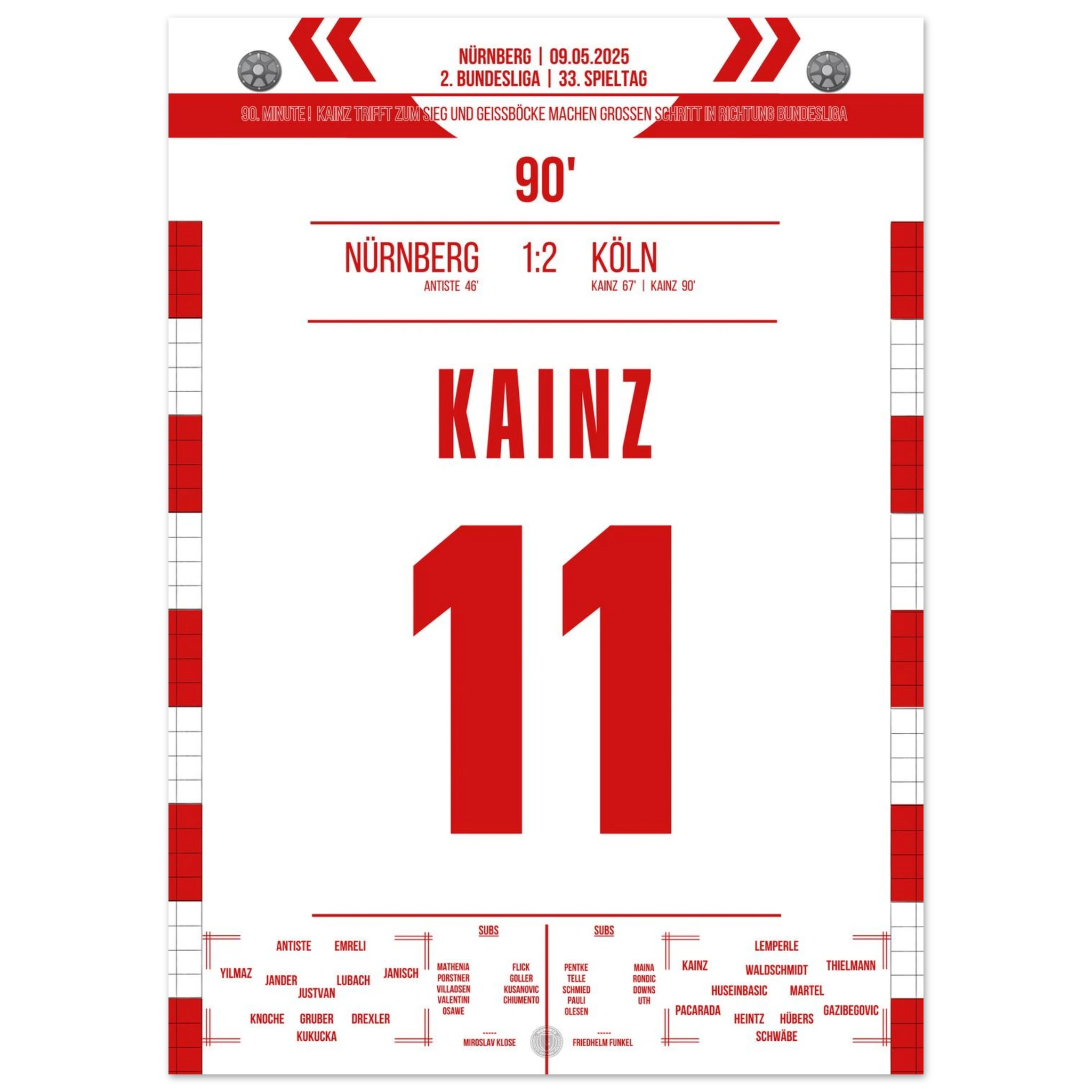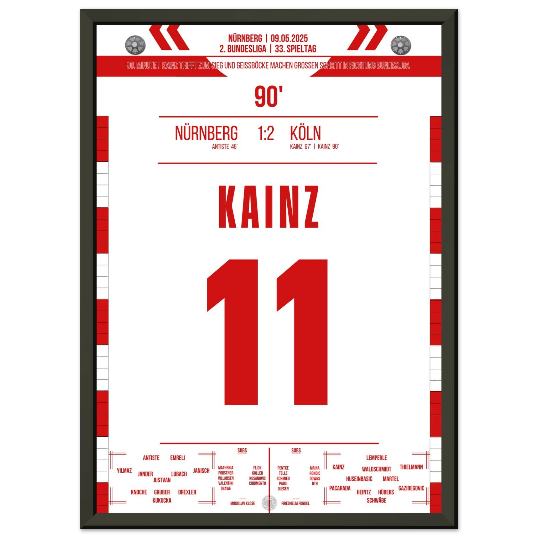 9. Mai 2025 – Nürnberg vs. Köln 1:2: In der 90. Minute sorgt Florian Kainz mit einem späten Treffer für die Entscheidung und lässt Köln in der Schlussphase jubeln. Ein Last-Minute-Sieg mit großer Wirkung im Saisonendspurt. Unser Poster hält diesen dramatischen Moment in Rot-Weiß fest.