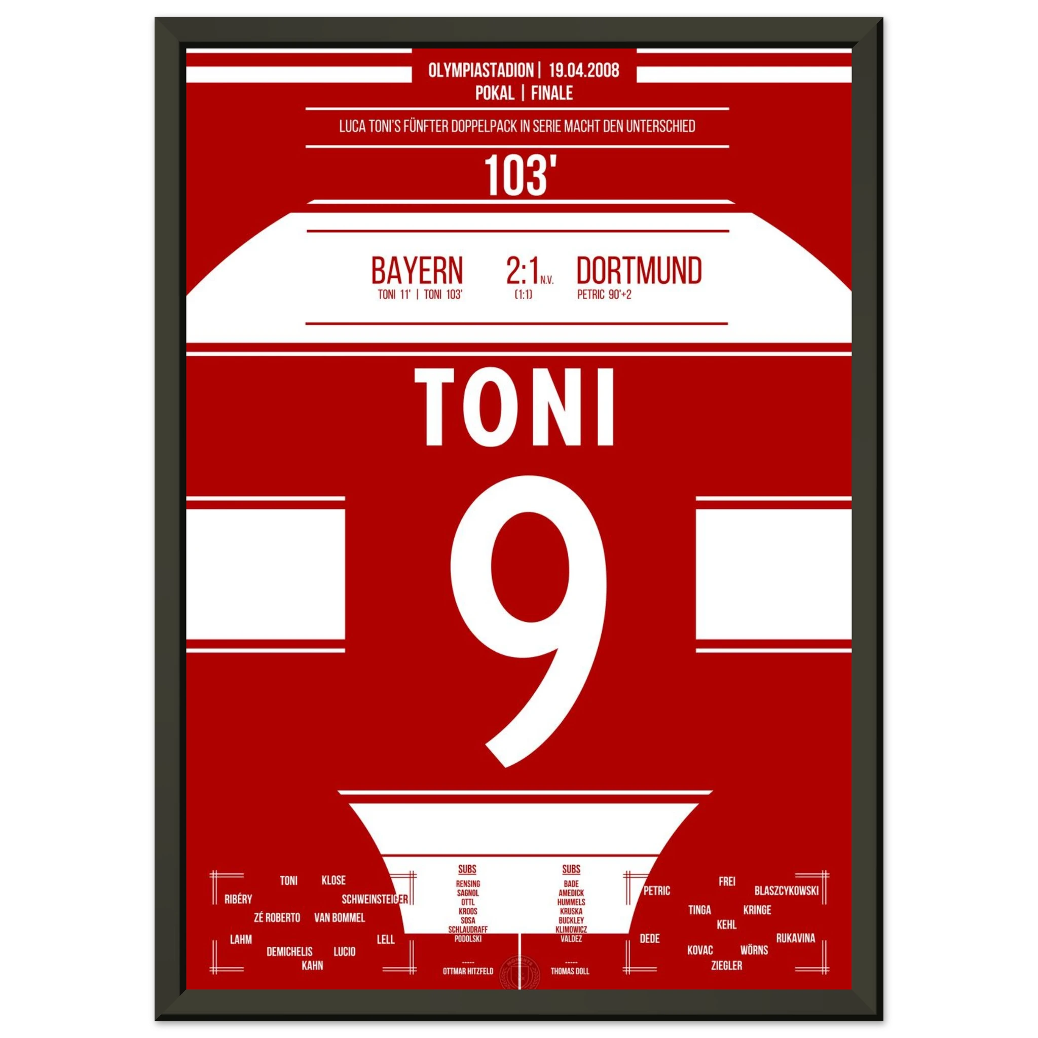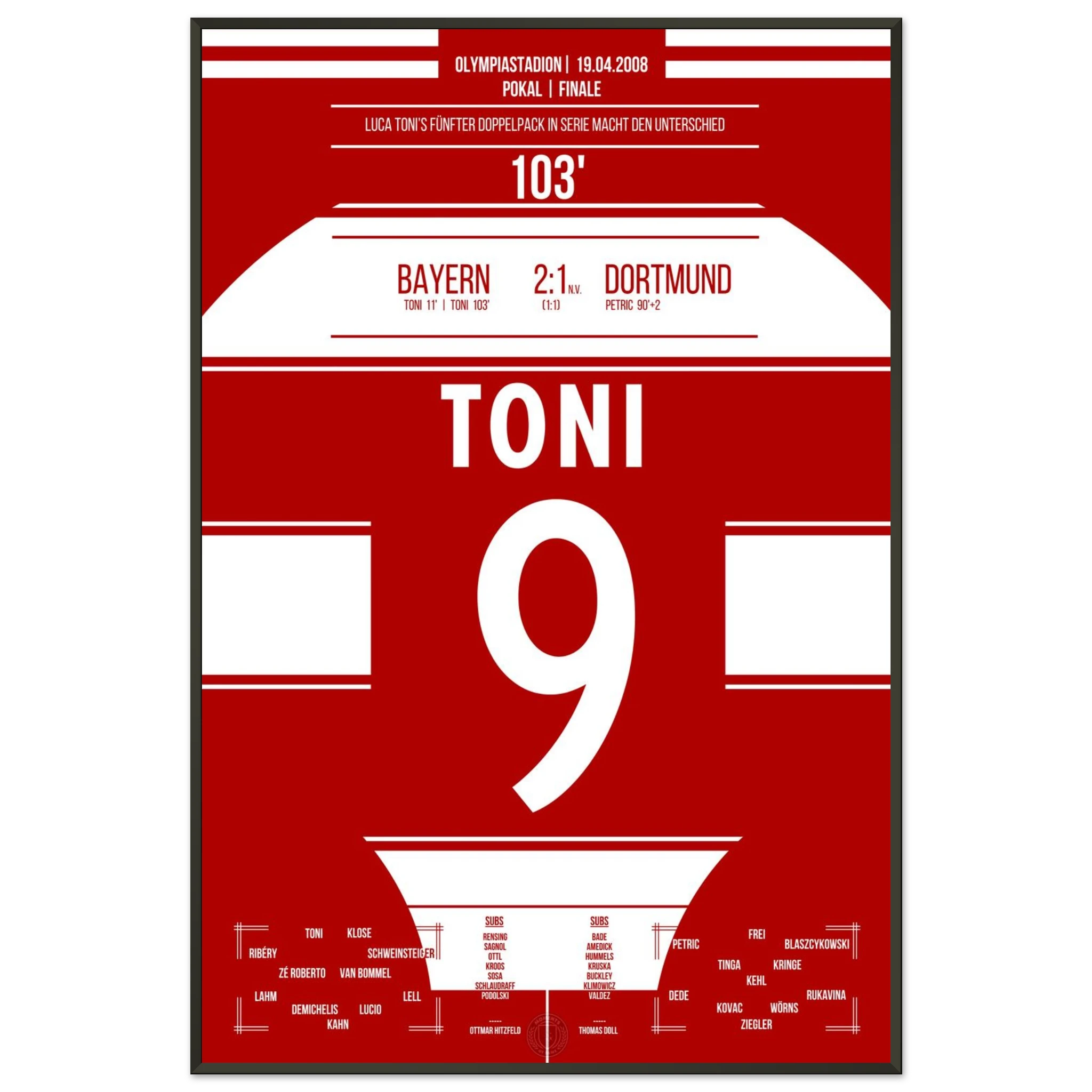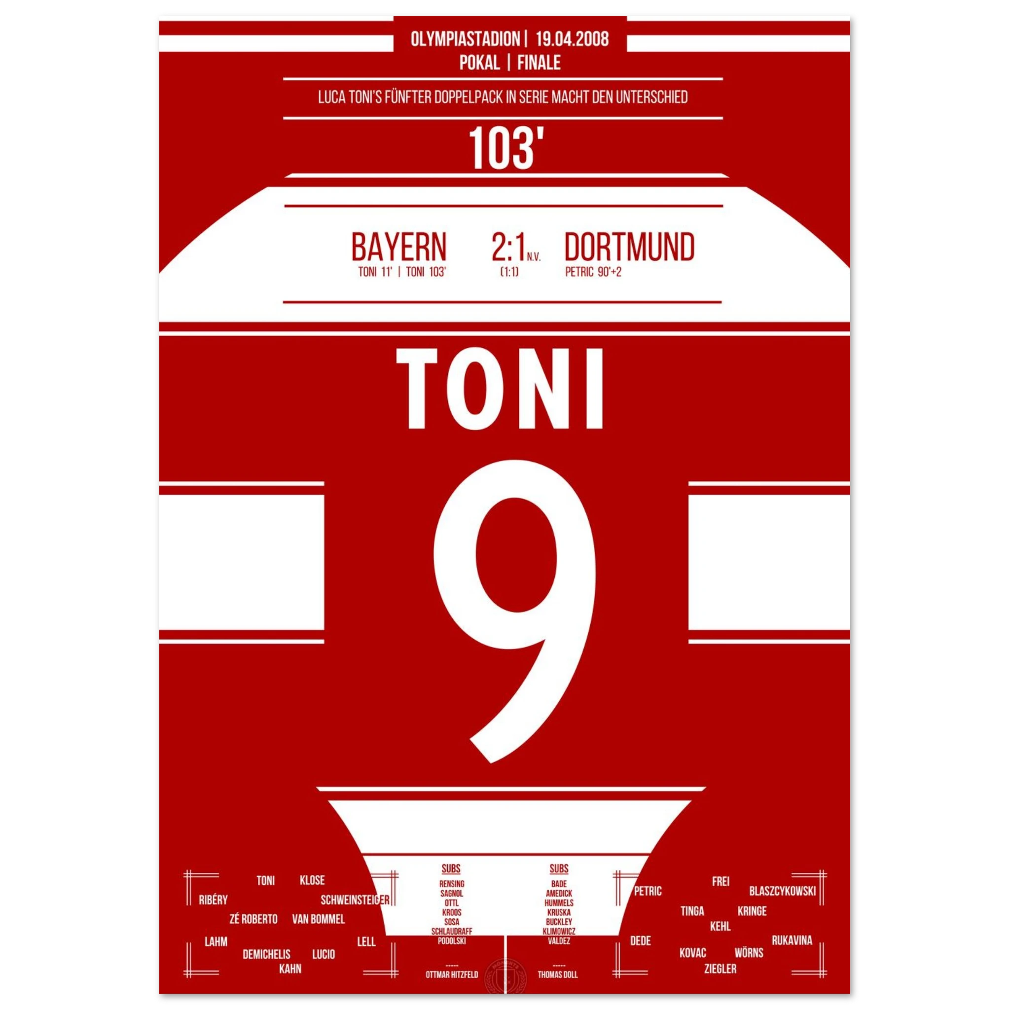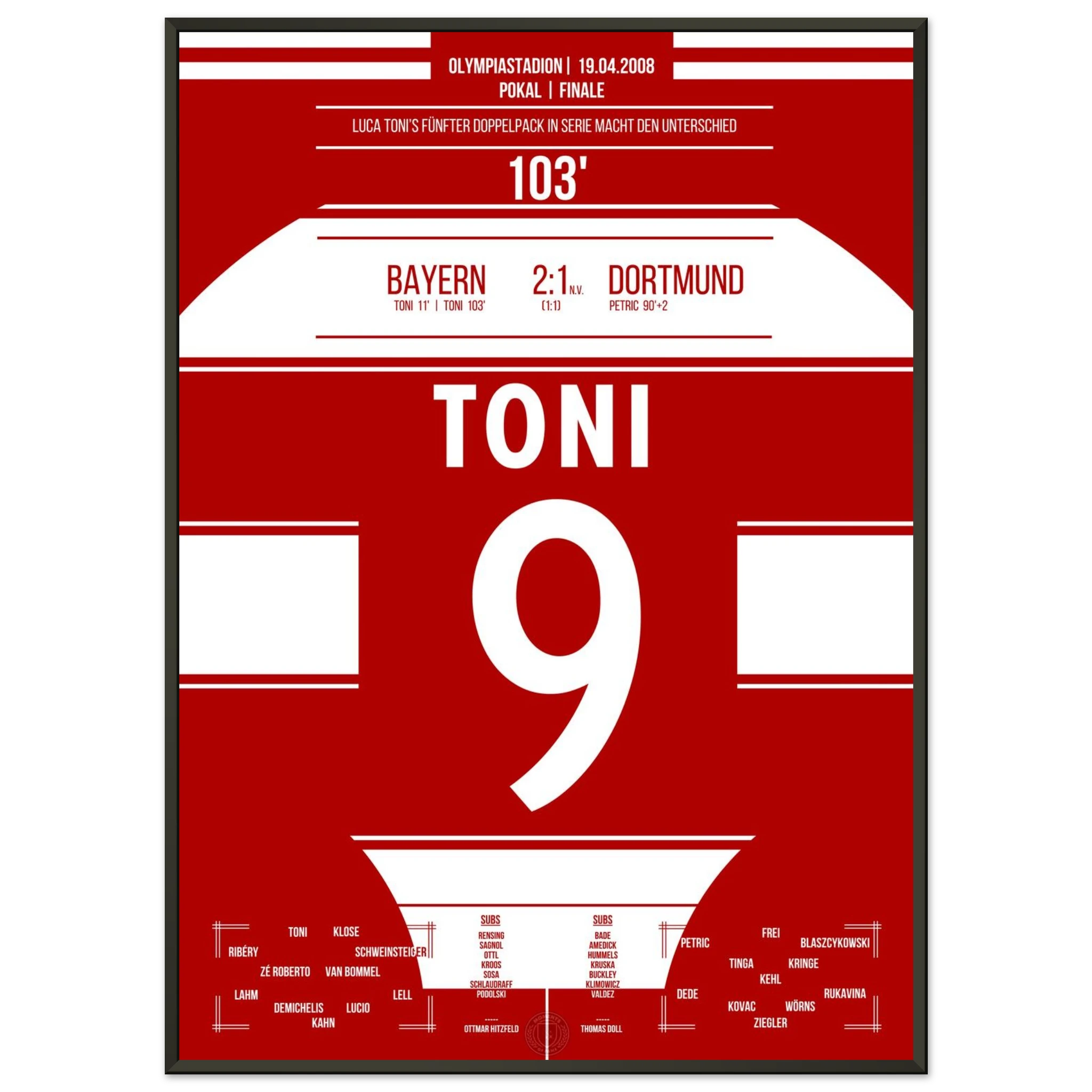 Im packenden Pokalfinale liefert Dortmund den Bayern einen großen Kampf. Nach dem späten Ausgleich durch Petrić geht es in die Verlängerung – dort entscheidet Luca Toni in der 103. Minute die Partie.