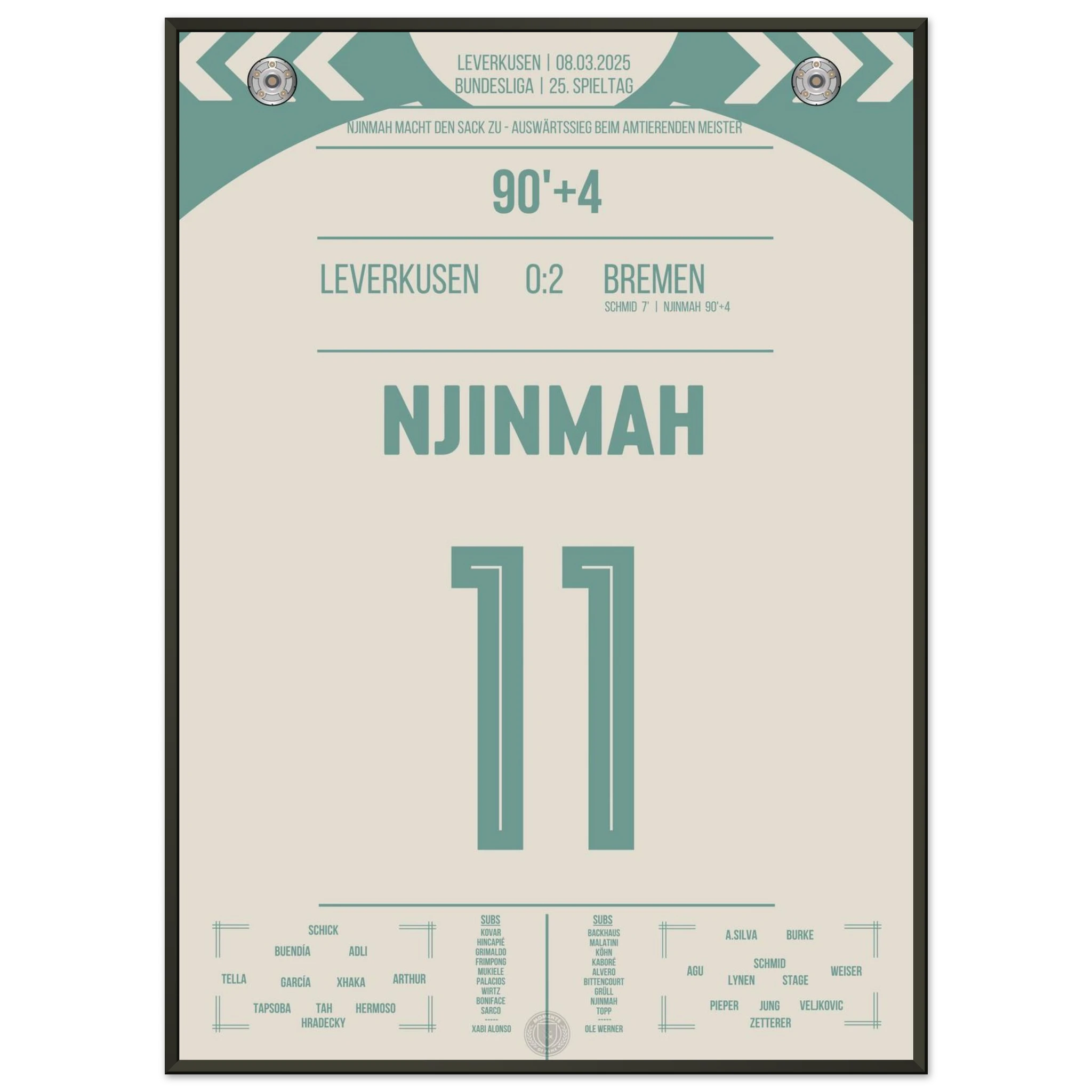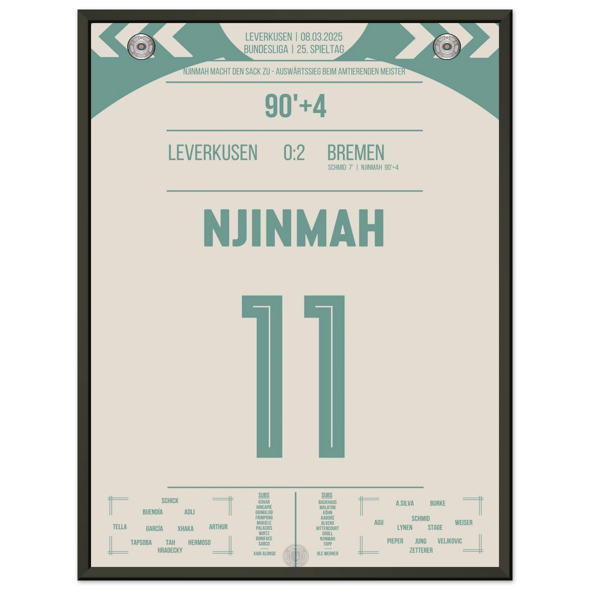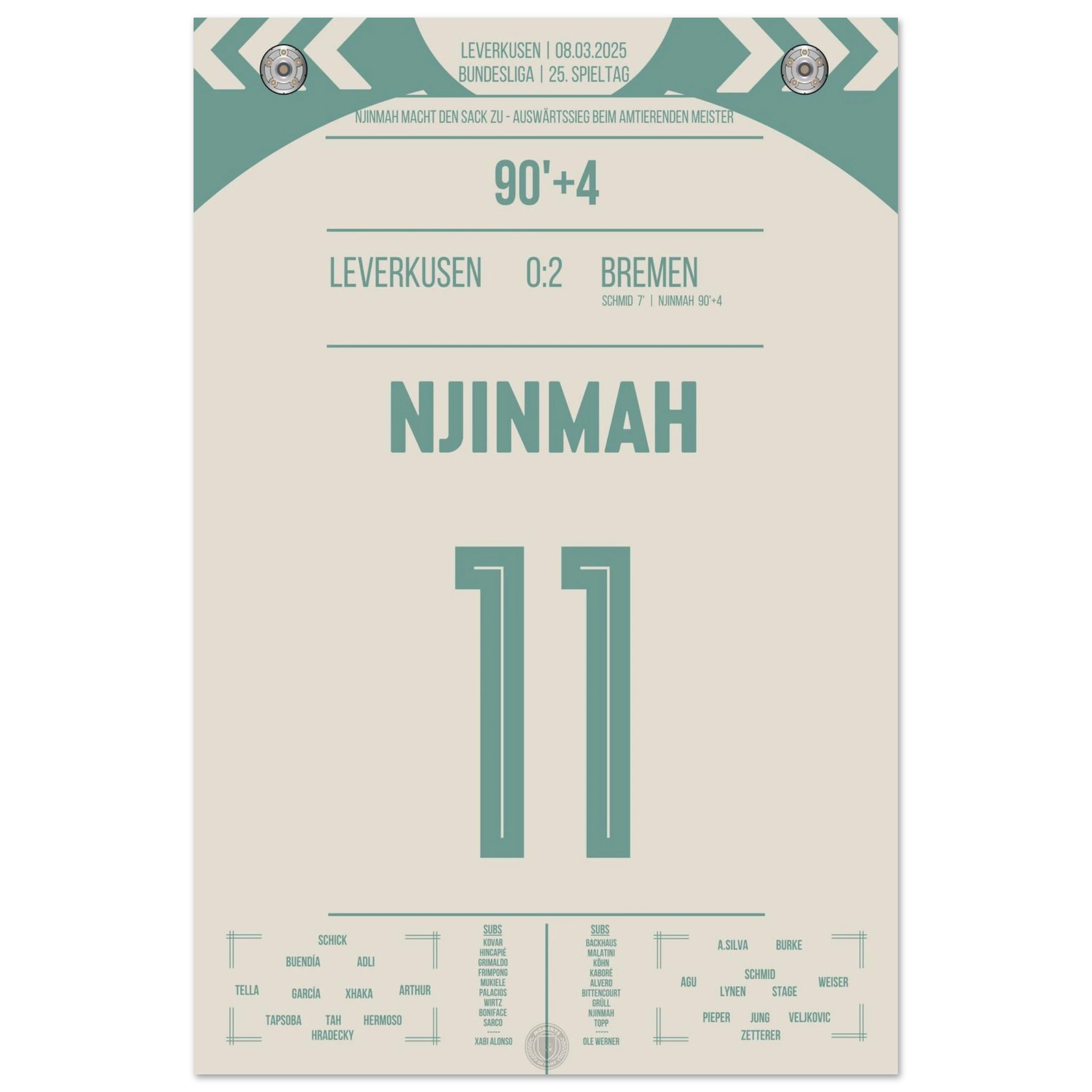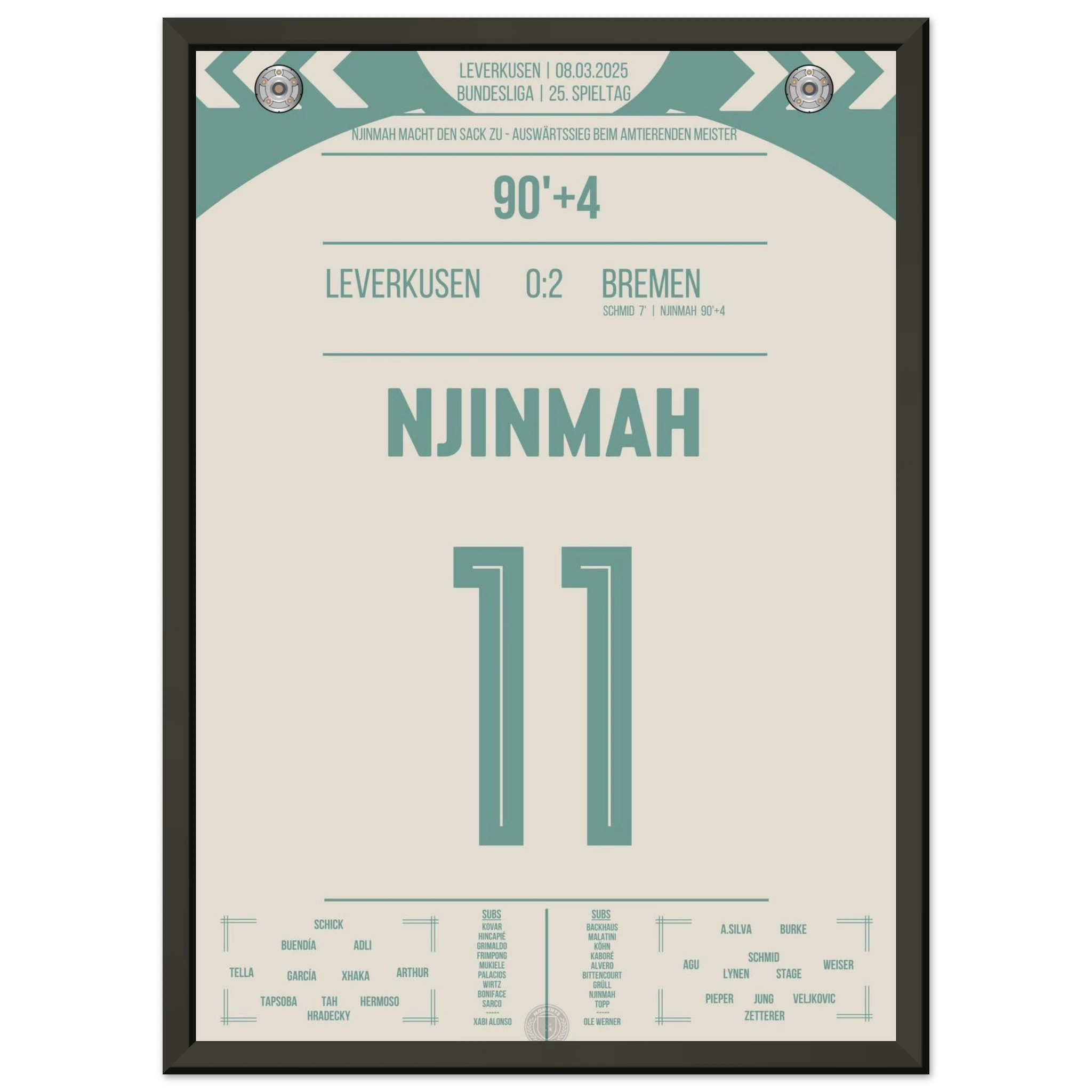 Justin Njinmah. Nachspielzeit. Eiskalt zum 2:0. Bremen schockt den Meister. Jetzt als Poster für deine Wand.