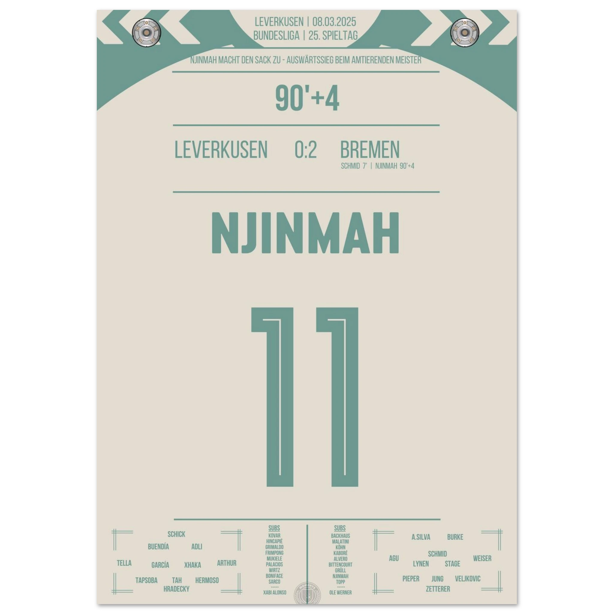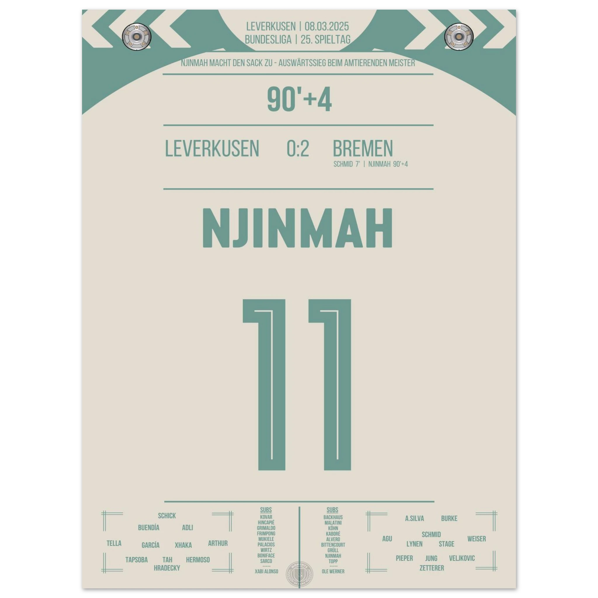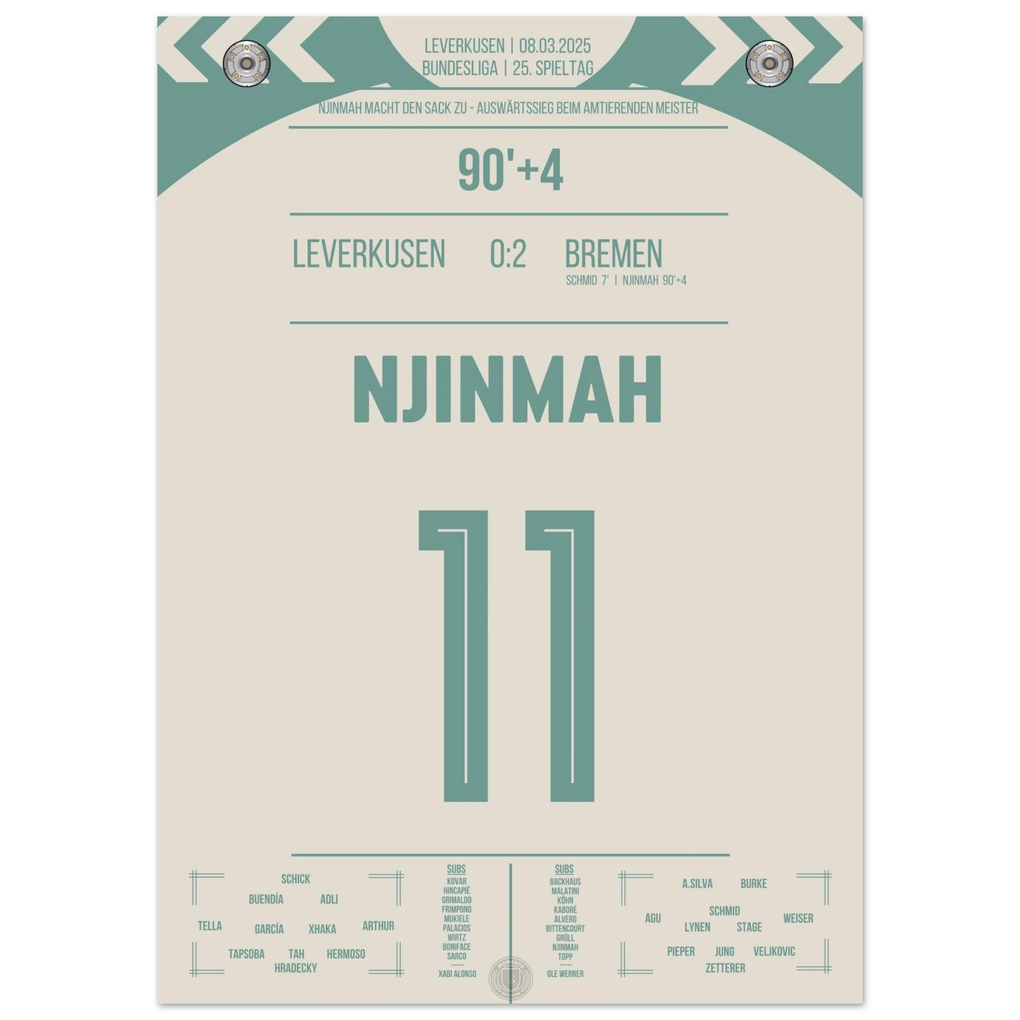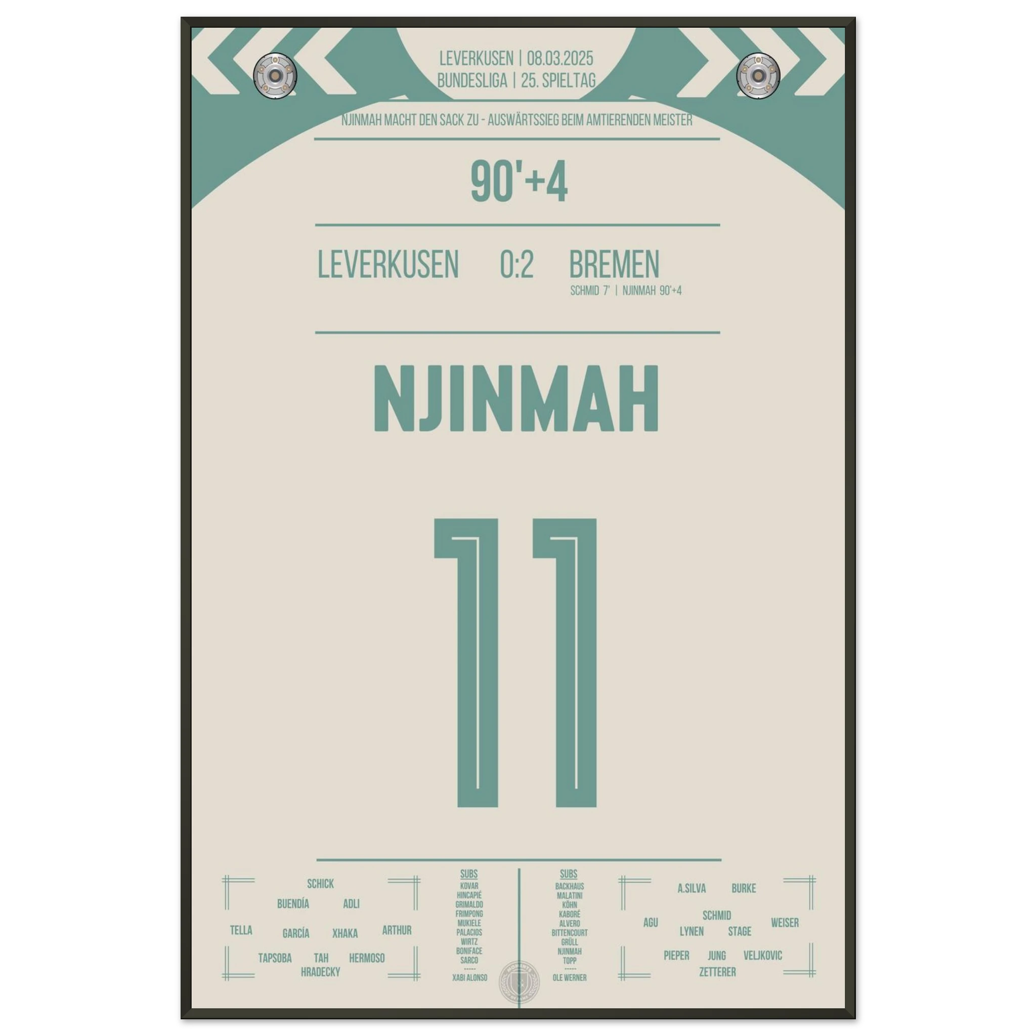 Justin Njinmah. Nachspielzeit. Eiskalt zum 2:0. Bremen schockt den Meister. Jetzt als Poster für deine Wand.
