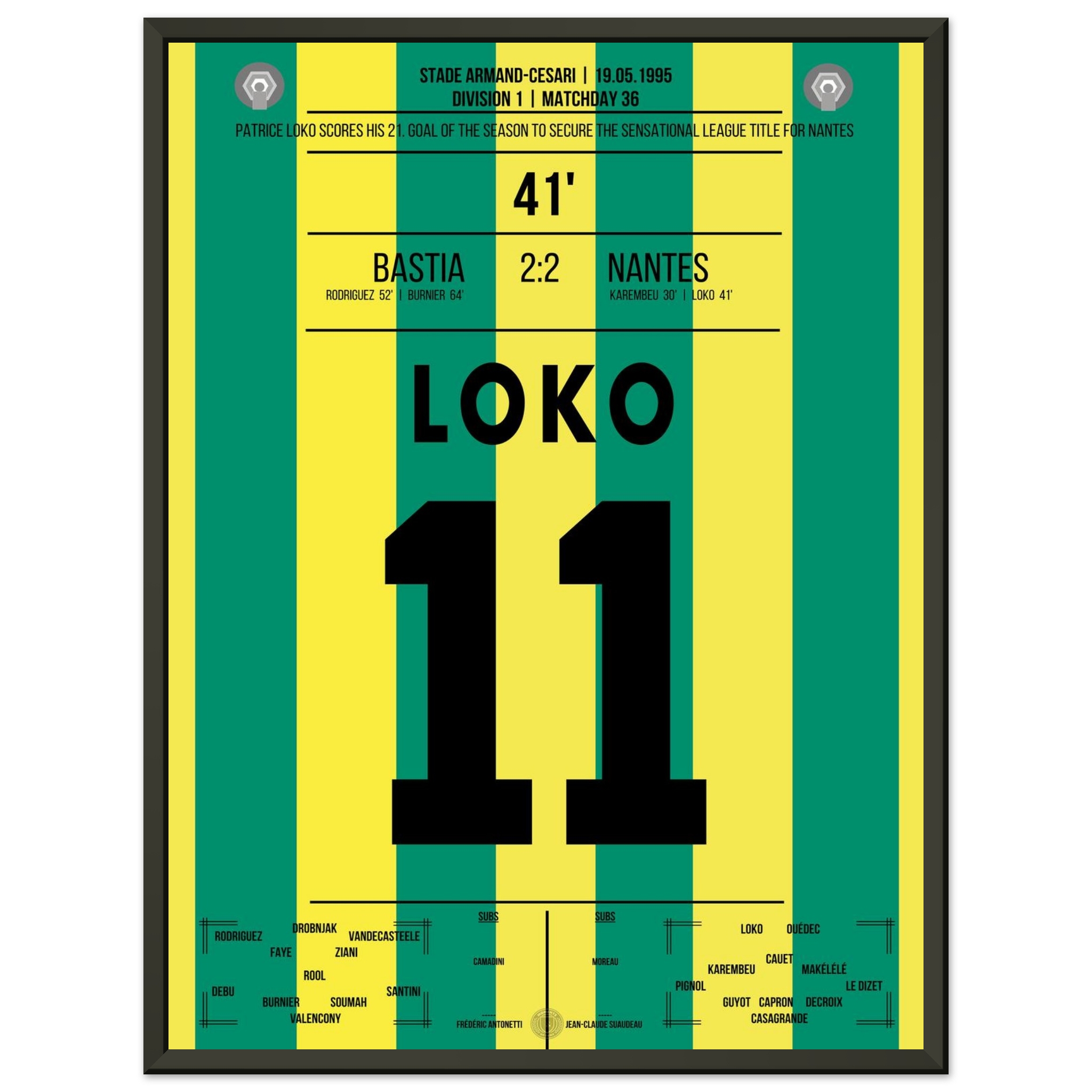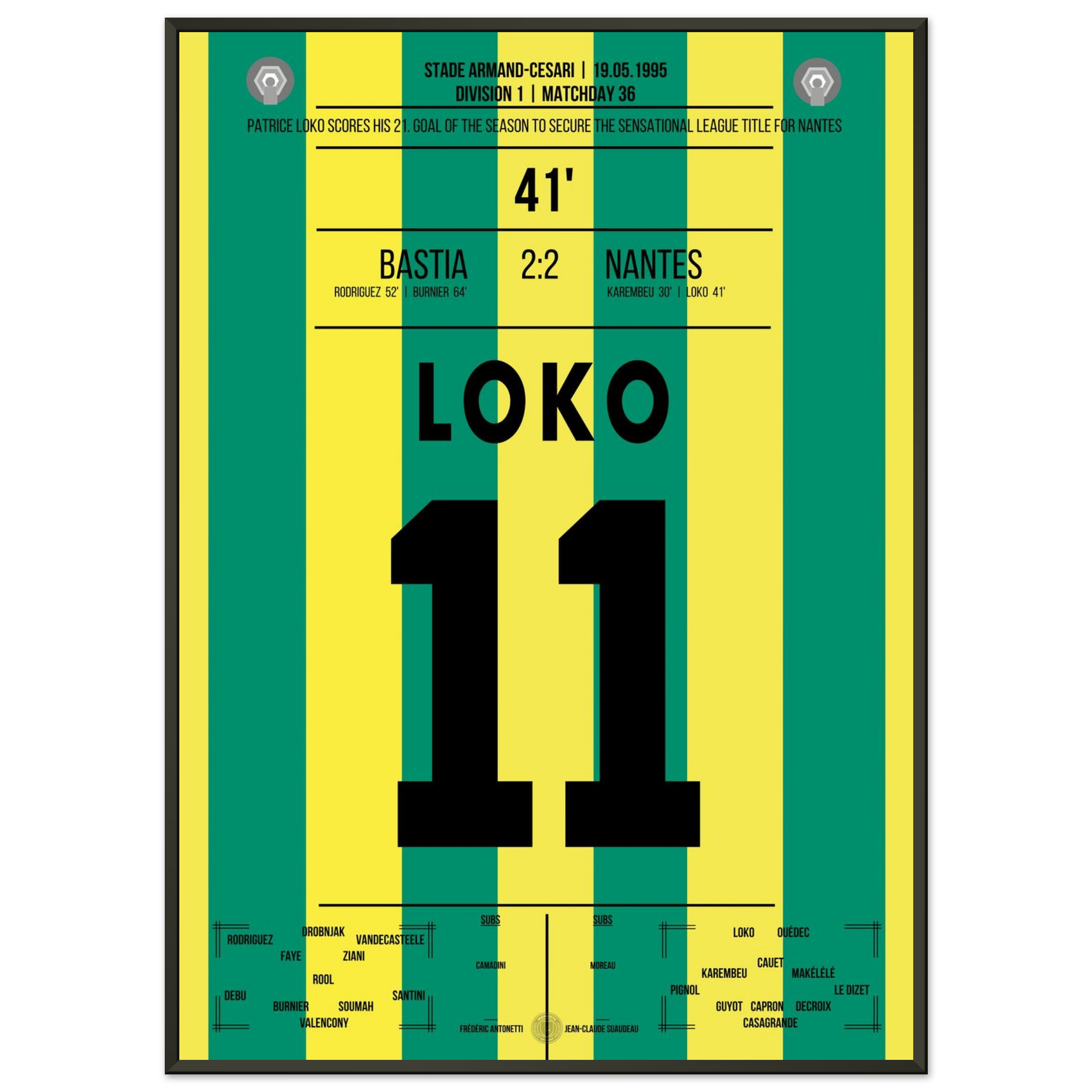 Ein Abend für die Geschichtsbücher: Patrice Loko erzielt den entscheidenden Treffer, der Nantes nach einer überragenden Saison den Meistertitel sichert – ungeschlagen in 32 Spielen!