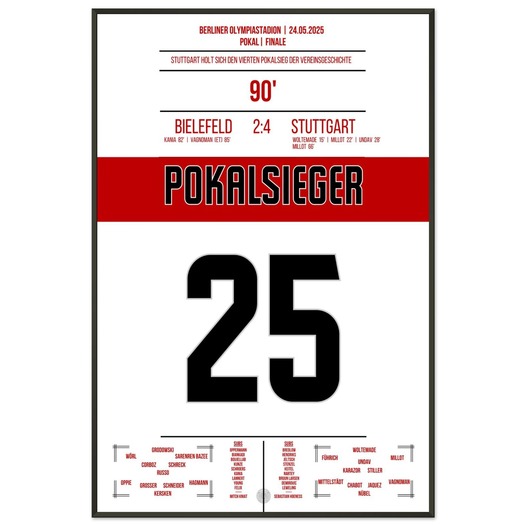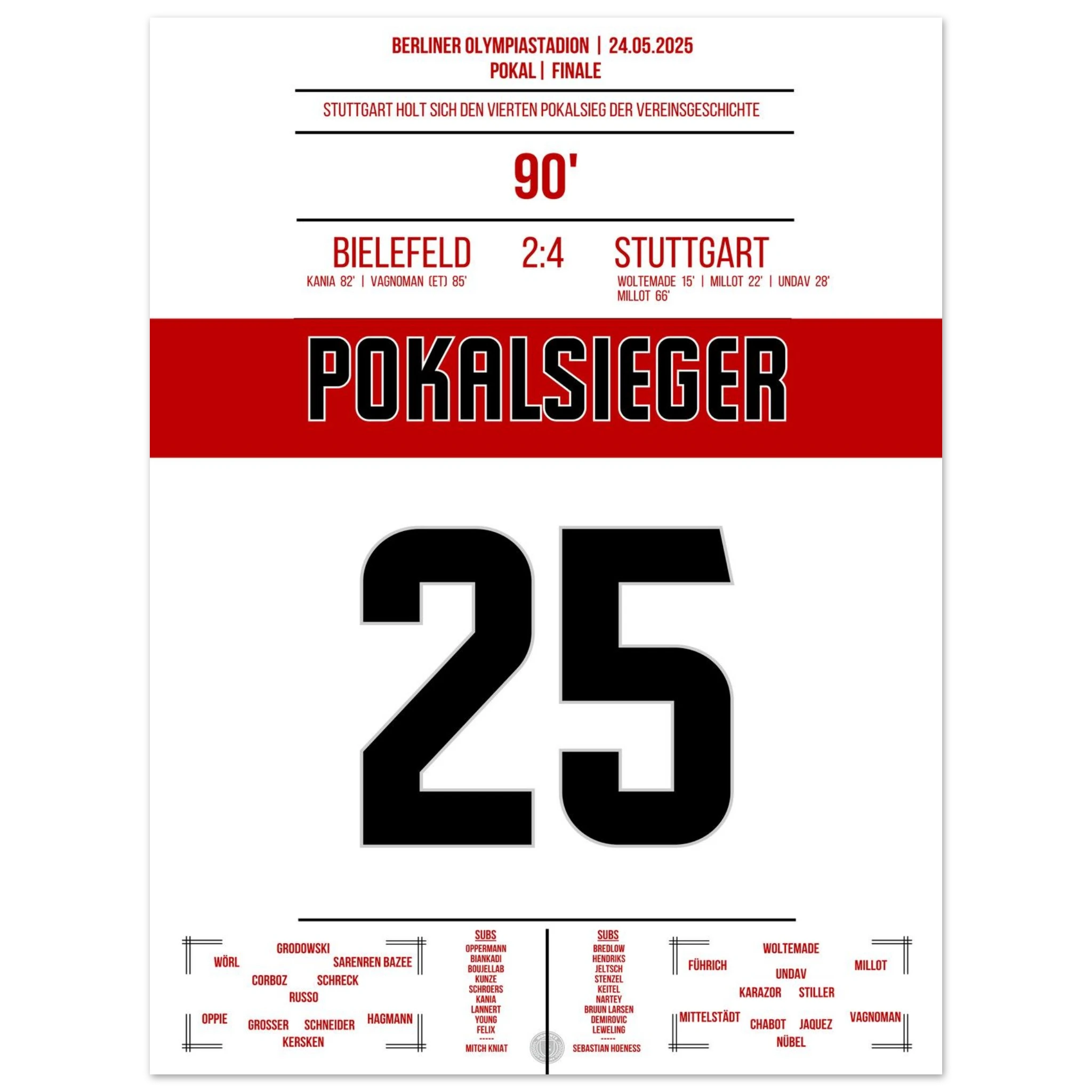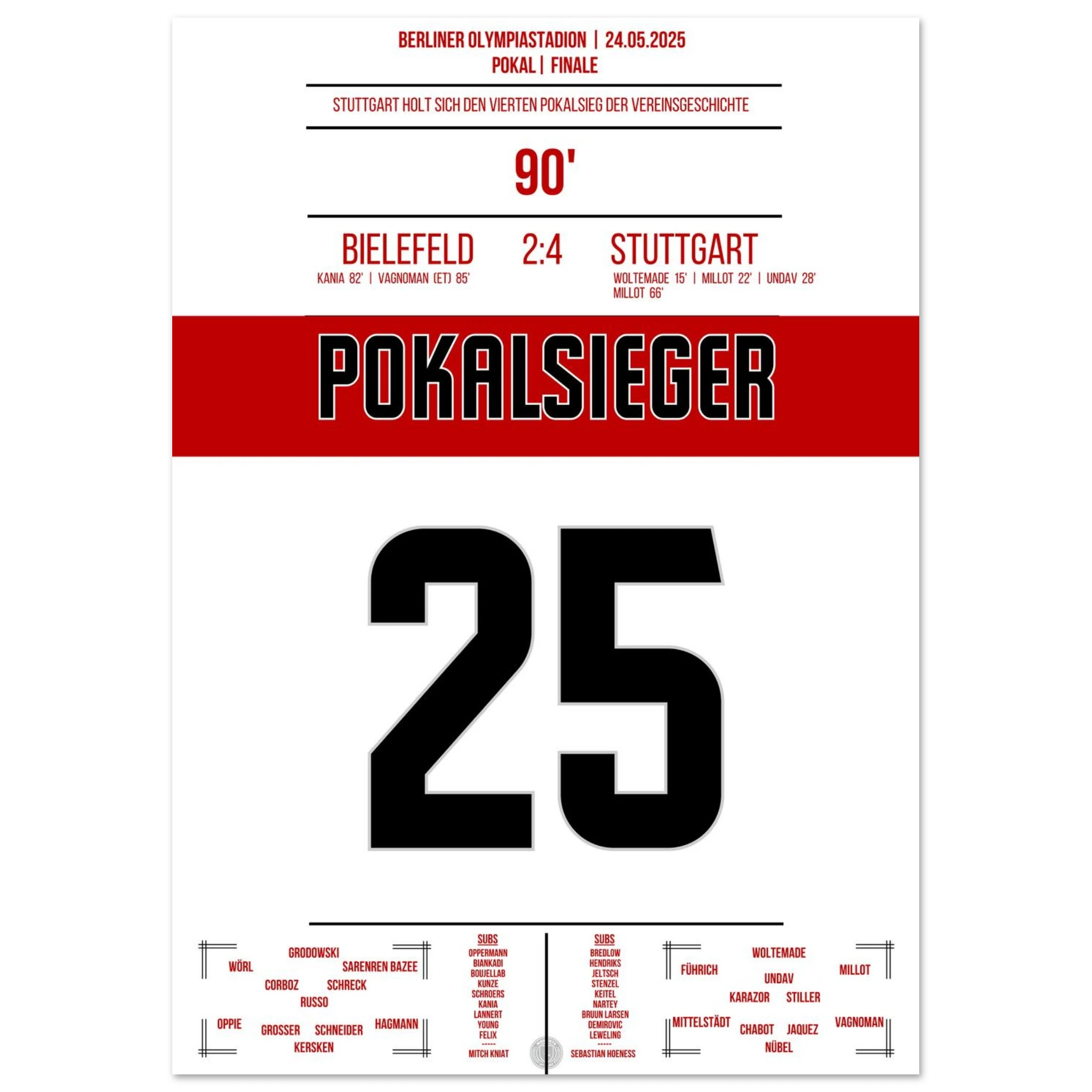 May 24, 2025 – Bielefeld vs. Stuttgart 2:4: Stuttgart crowns an outstanding season with a cup victory in Berlin! With passion, pace, and decisive play, the Swabians defeat Bielefeld and bring the cup back to Stuttgart. Our poster immortalizes this red and white triumphant moment in the Olympic Stadium.