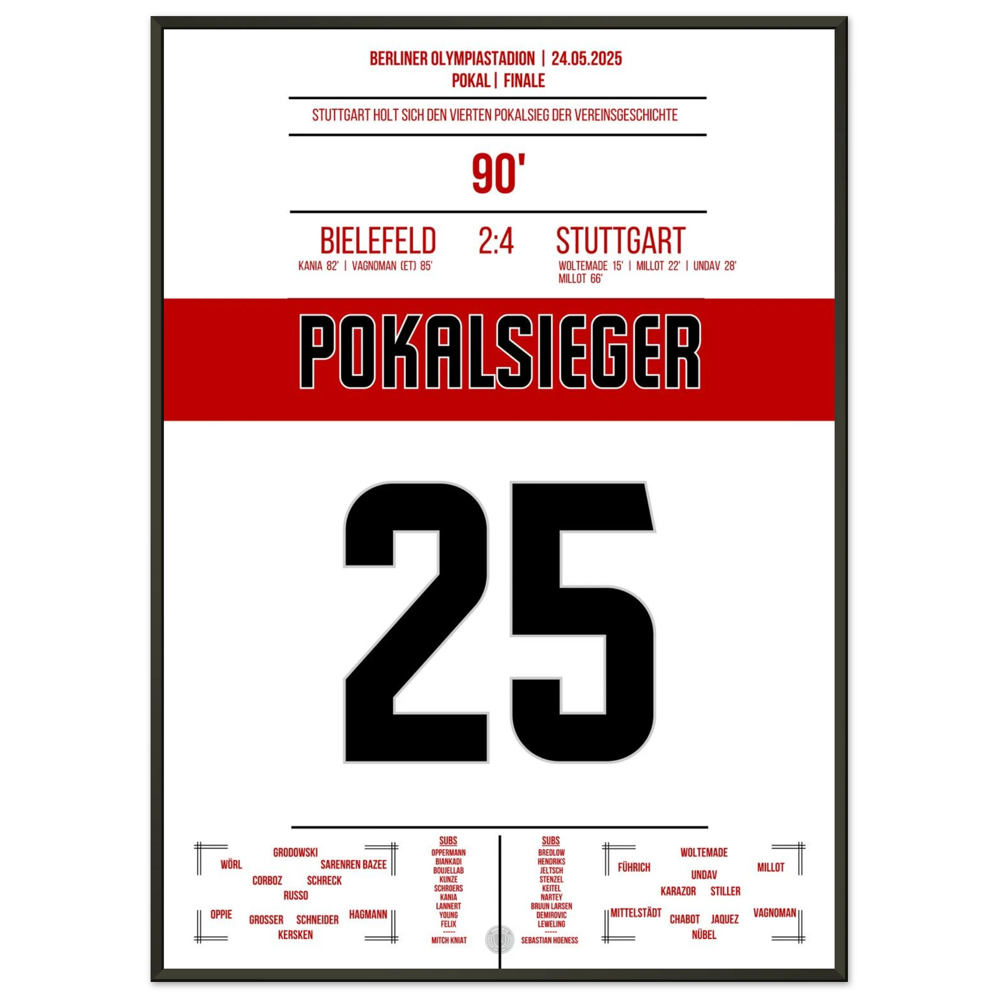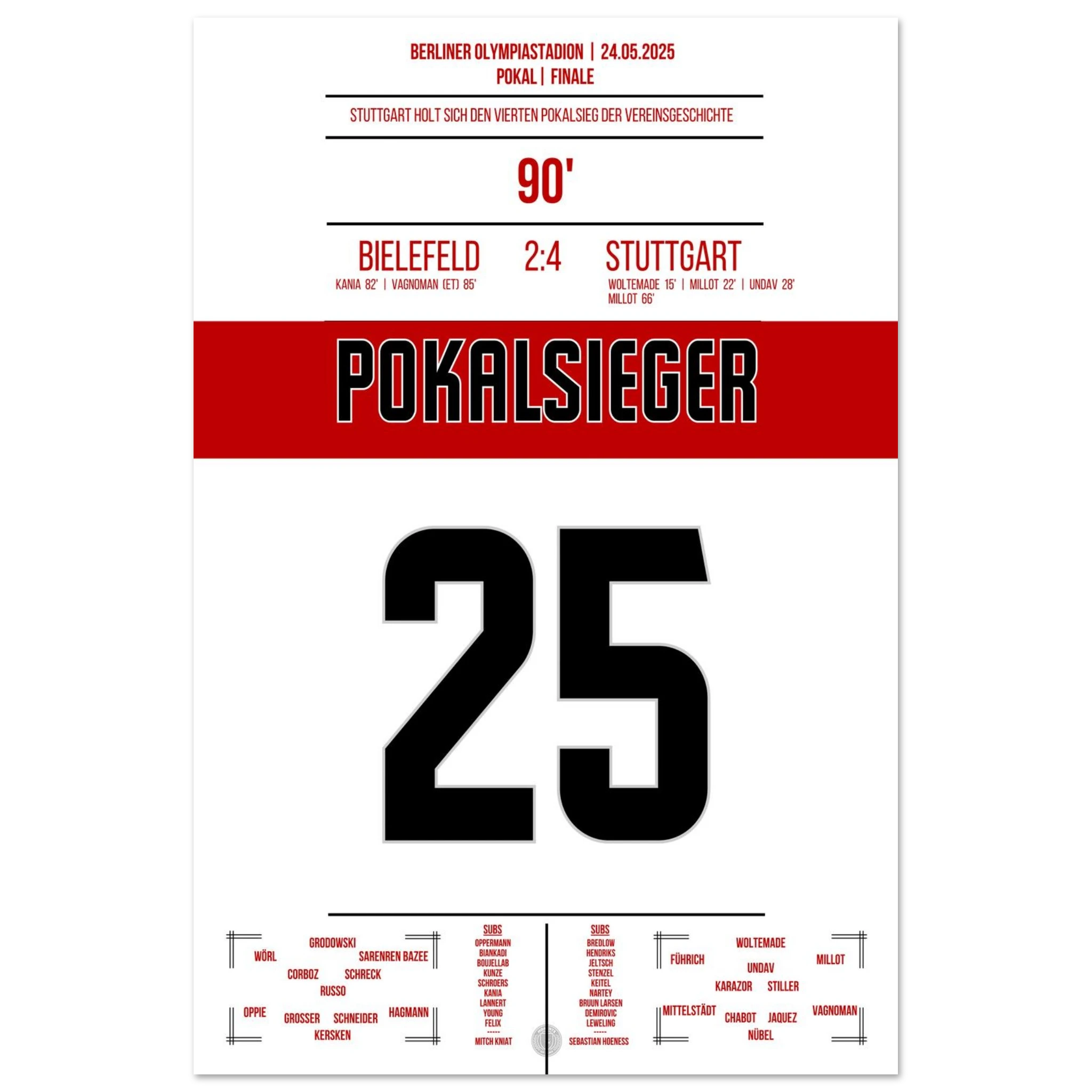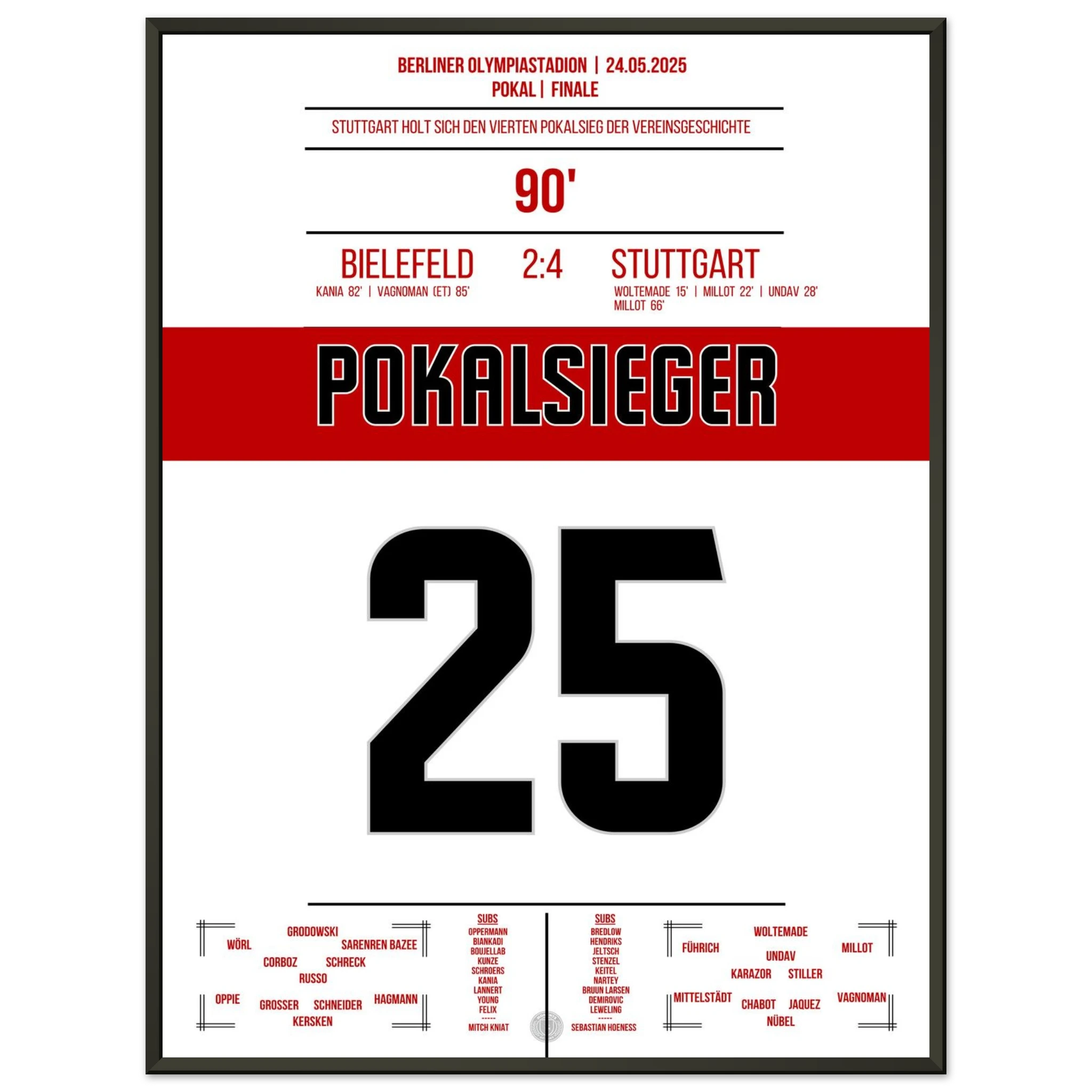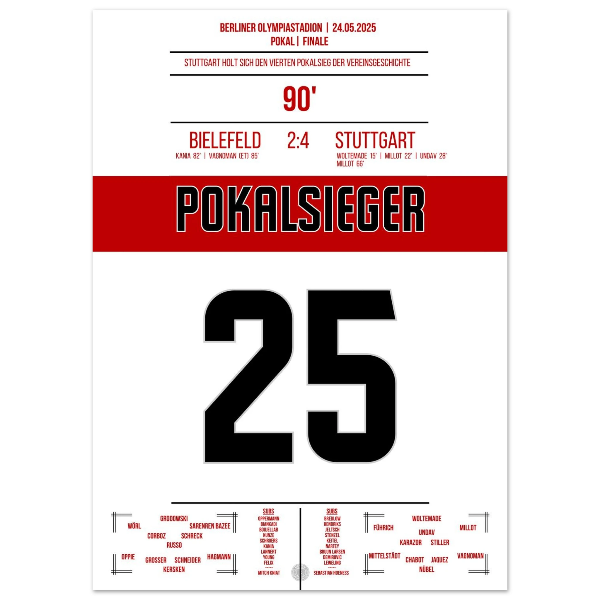 May 24, 2025 – Bielefeld vs. Stuttgart 2:4: Stuttgart crowns an outstanding season with a cup victory in Berlin! With passion, pace, and decisive play, the Swabians defeat Bielefeld and bring the cup back to Stuttgart. Our poster immortalizes this red and white triumphant moment in the Olympic Stadium.