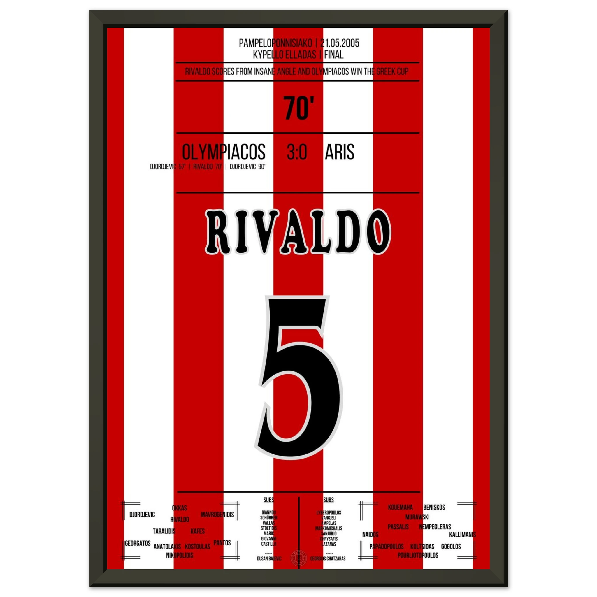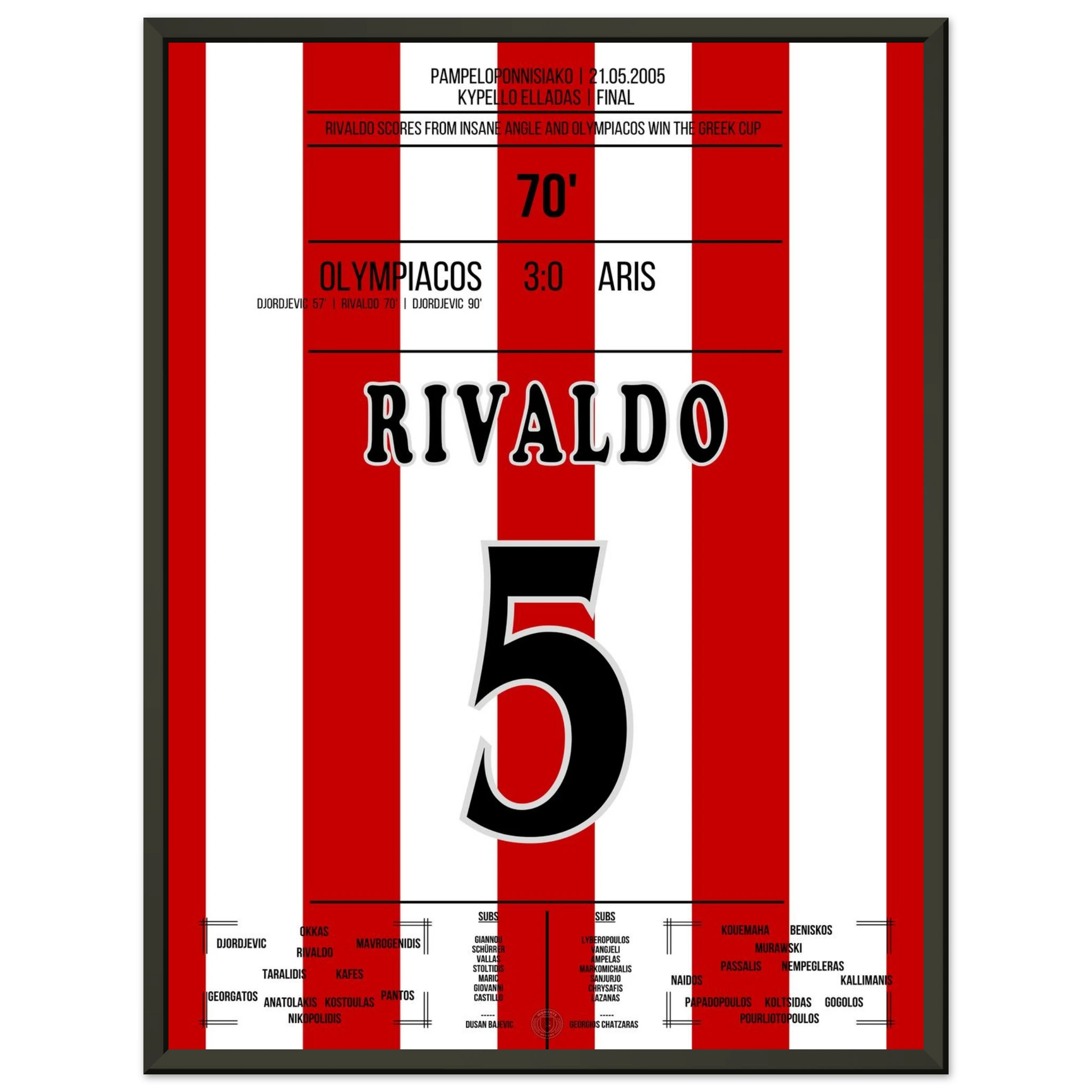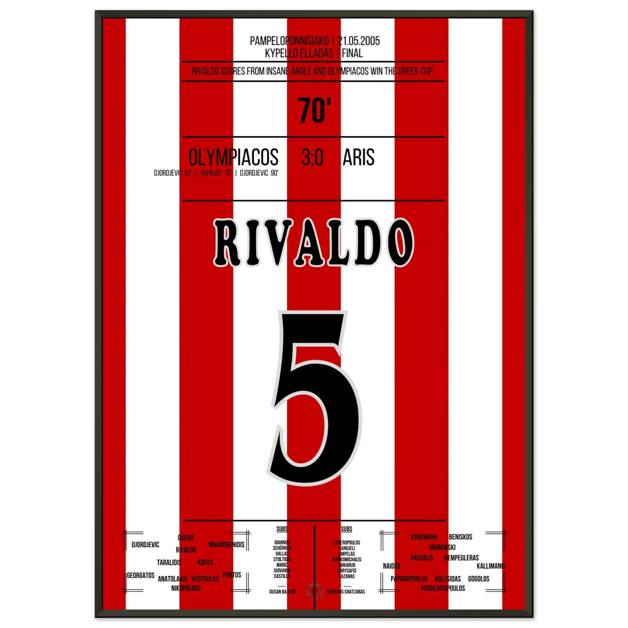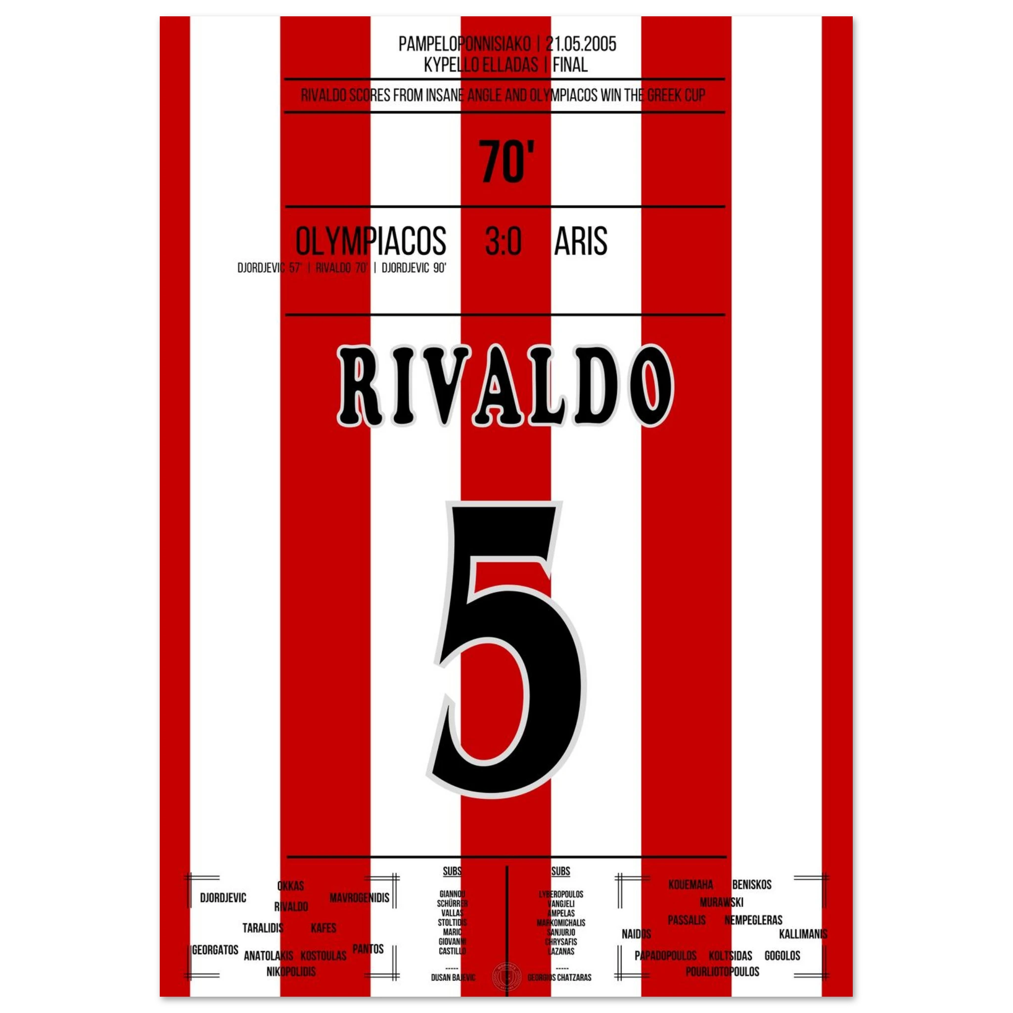 An einem heißen Abend in Piräus führt Rivaldo sein Team mit einem sehenswerten Treffer zum souveränen 3:0-Sieg. Mit seiner typischen Leichtigkeit und Technik verzaubert er das Publikum und unterstreicht einmal mehr seine Klasse als Spielmacher und Vollstrecker zugleich.