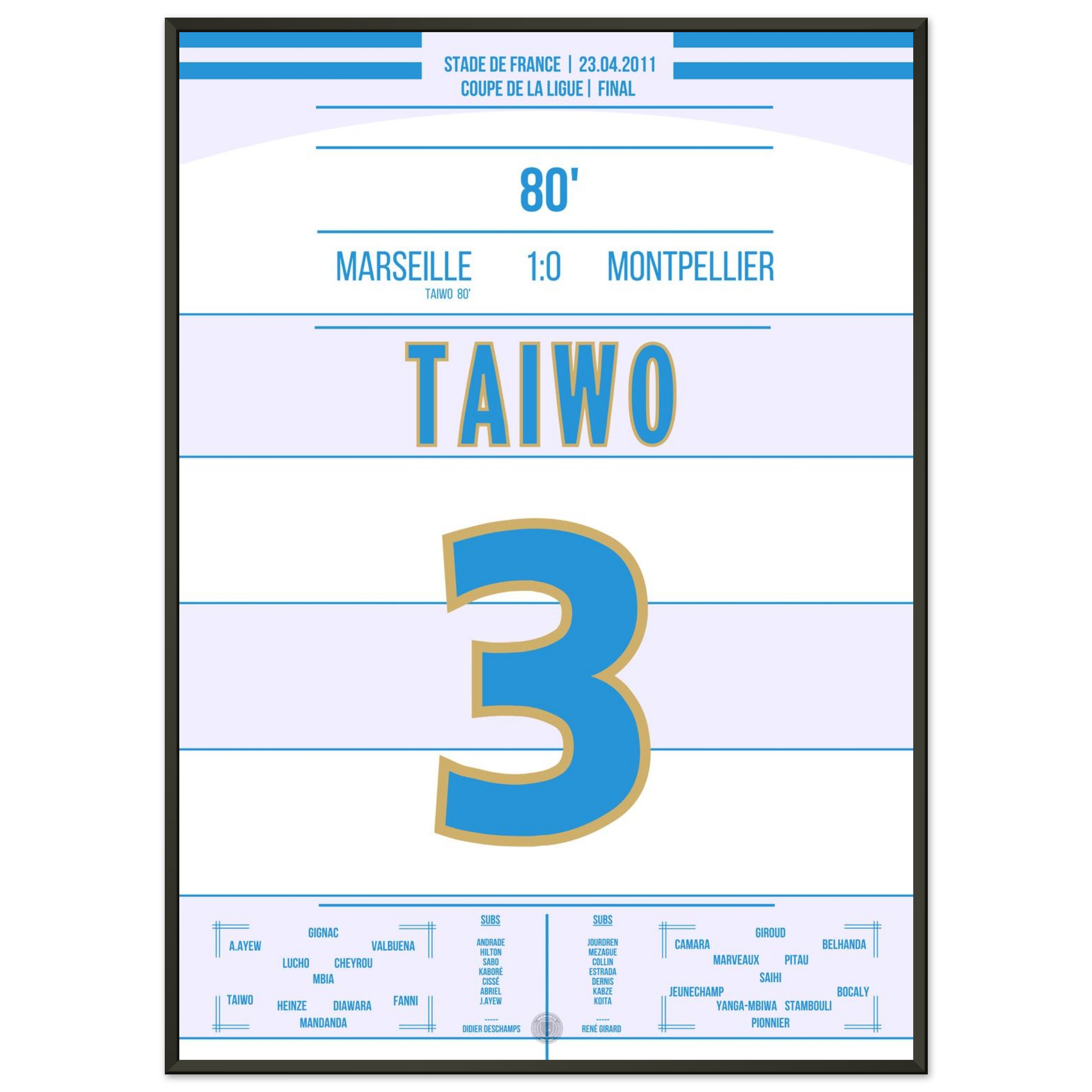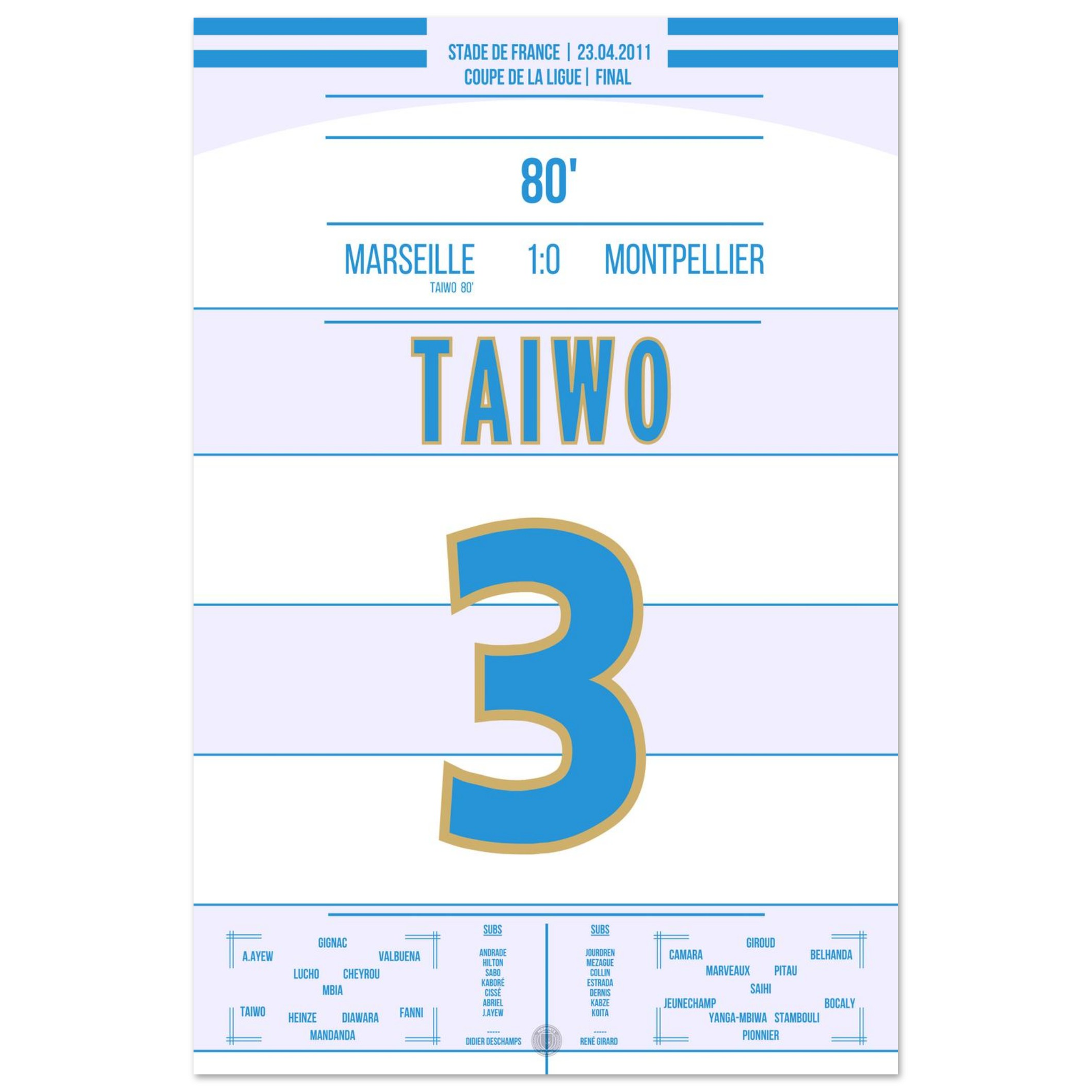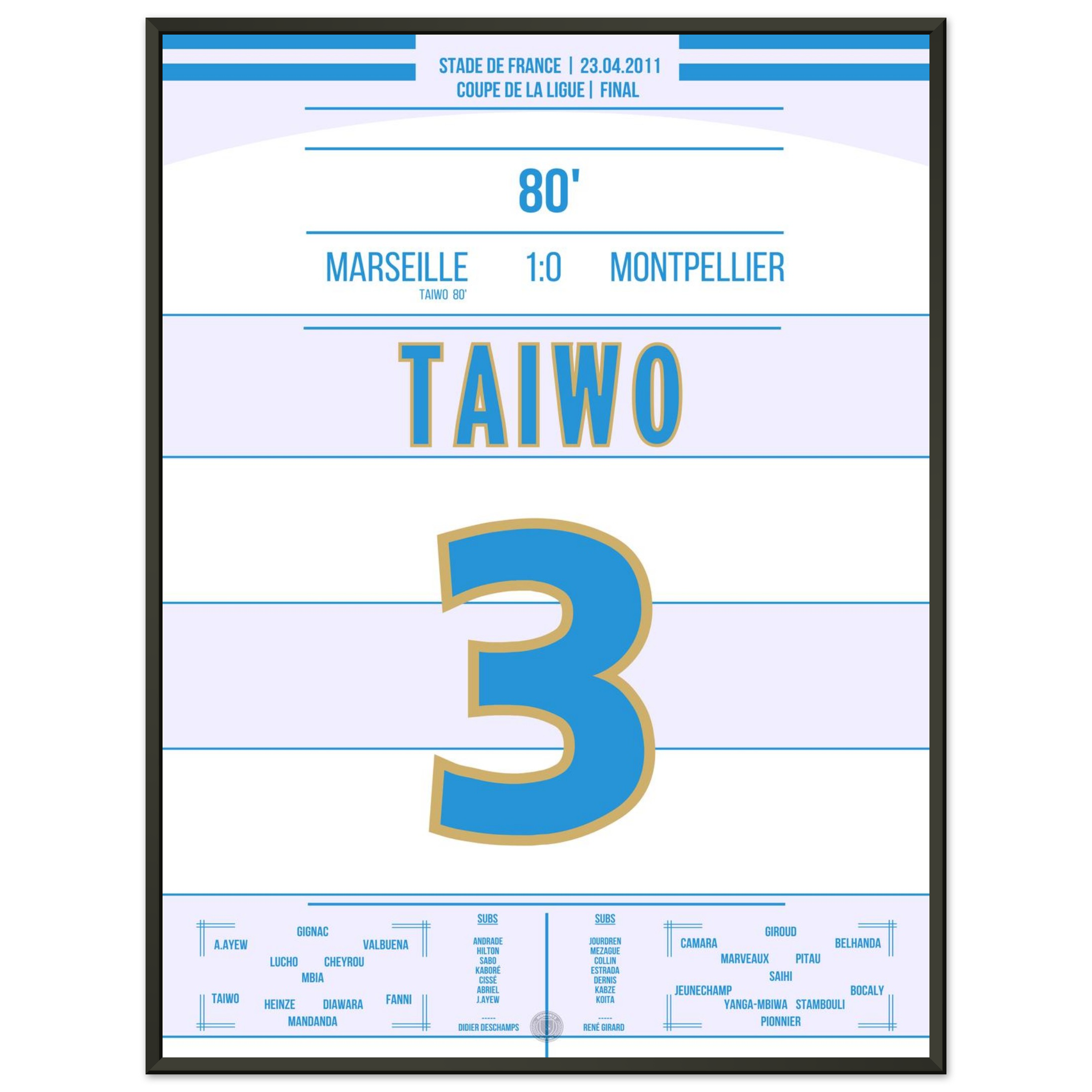 Dieses Poster feiert den Moment, in dem Taiwo zur Legende wurde und ganz Marseille im blau-weißen Jubel versank.