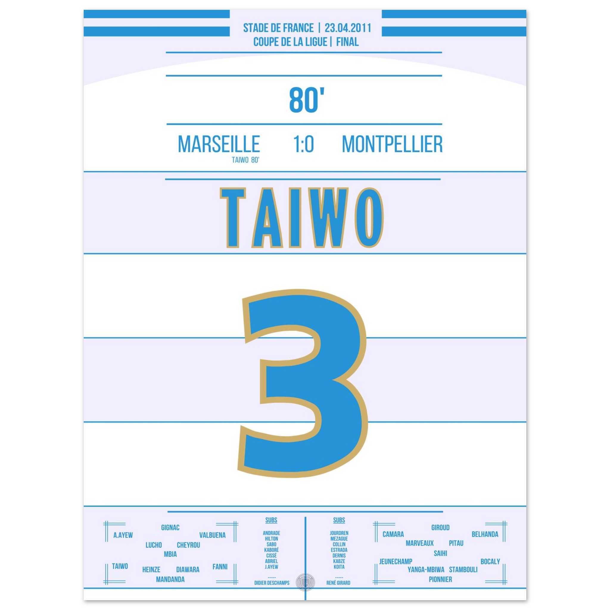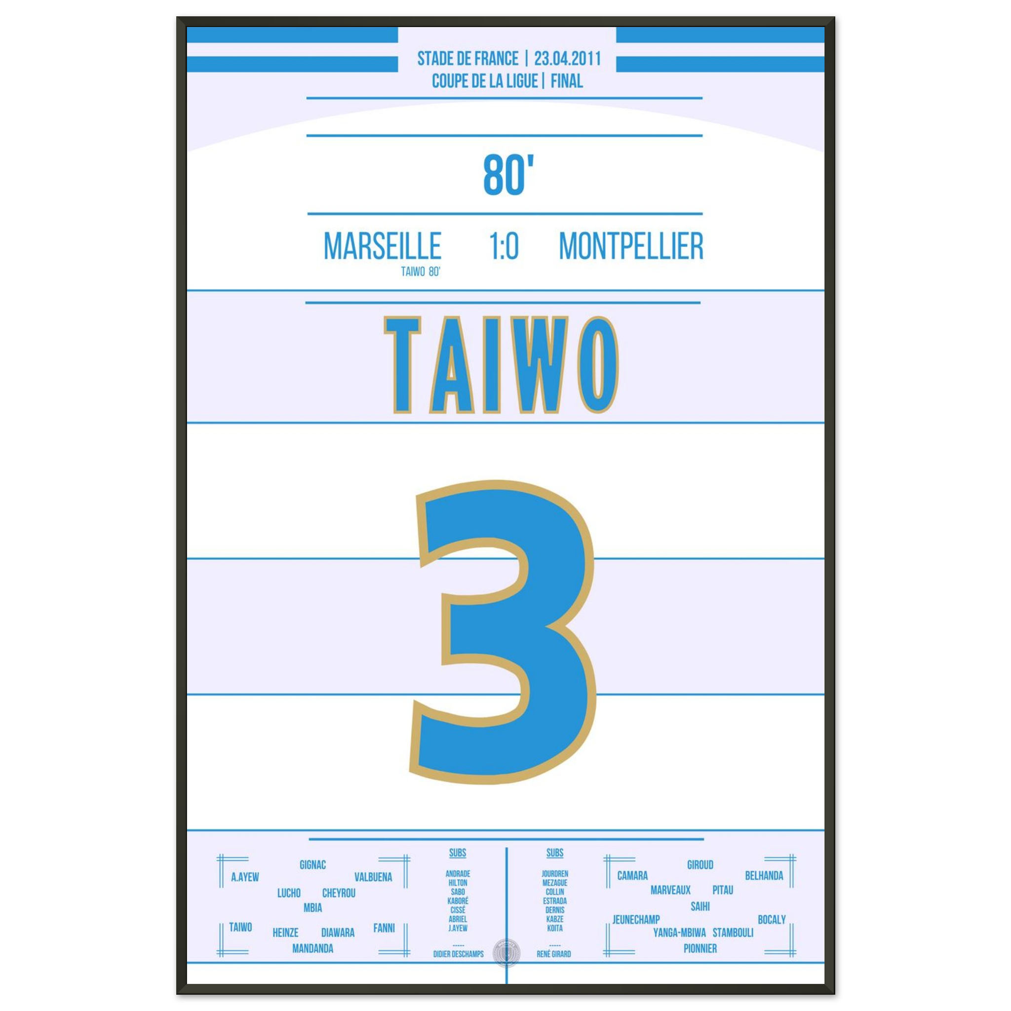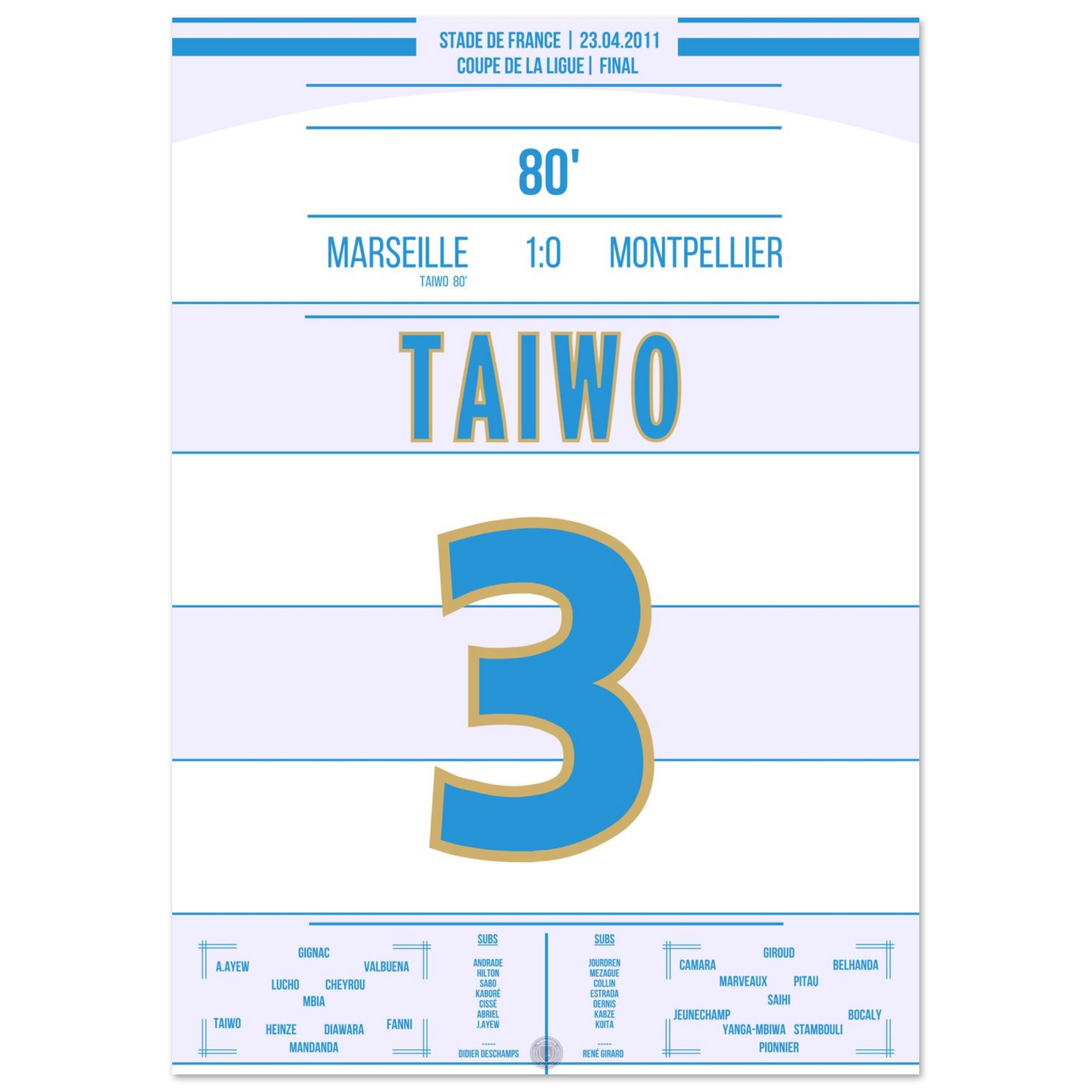 Dieses Poster feiert den Moment, in dem Taiwo zur Legende wurde und ganz Marseille im blau-weißen Jubel versank.