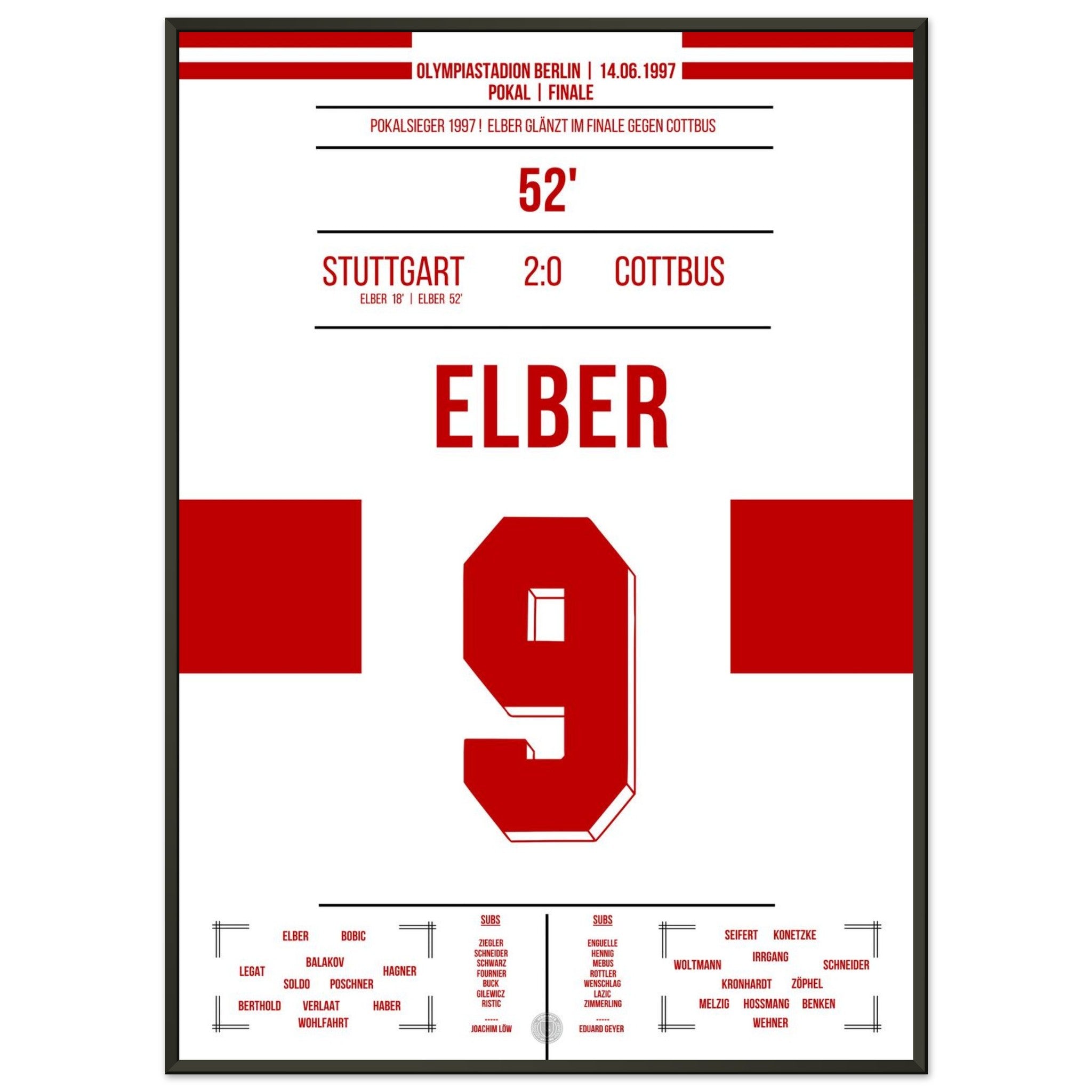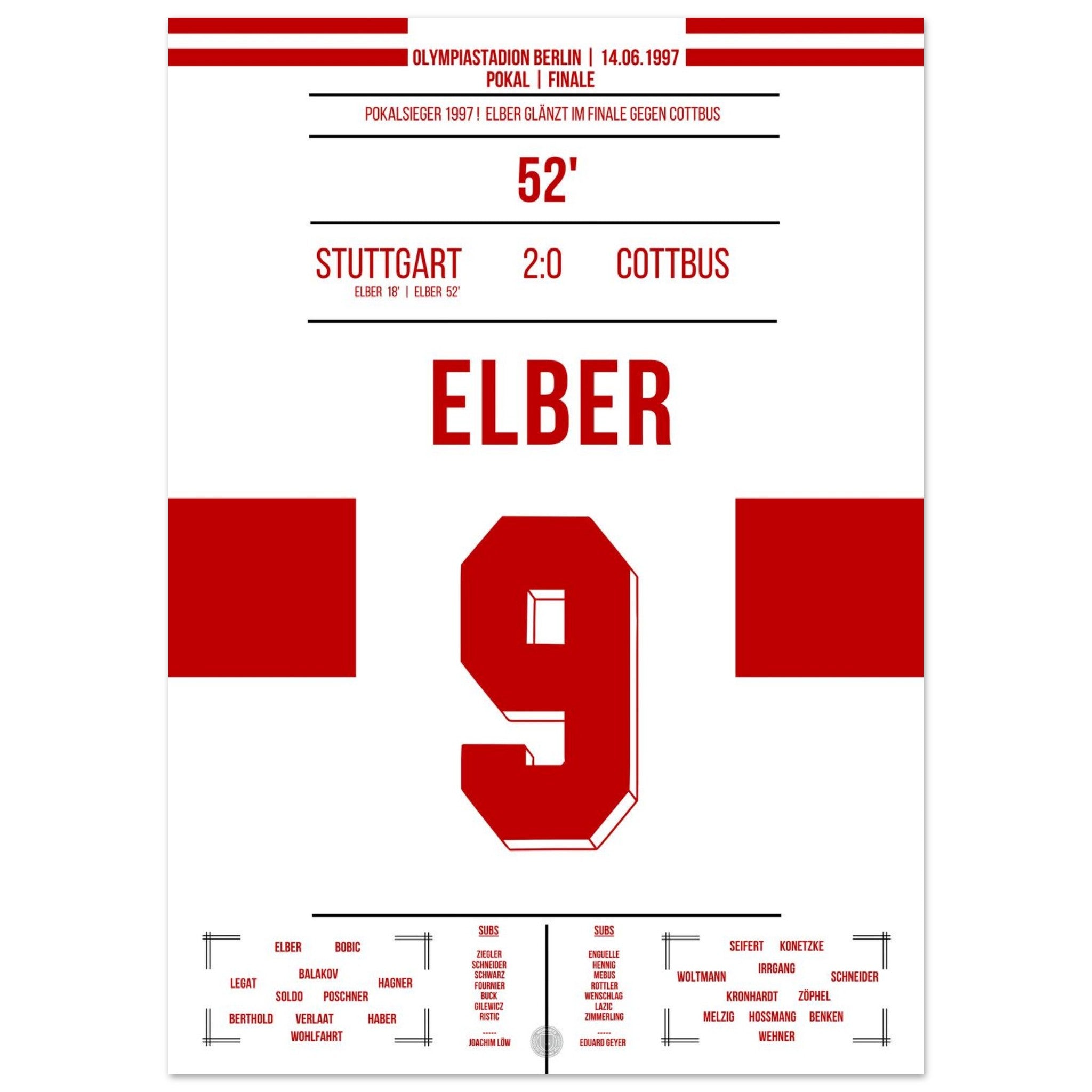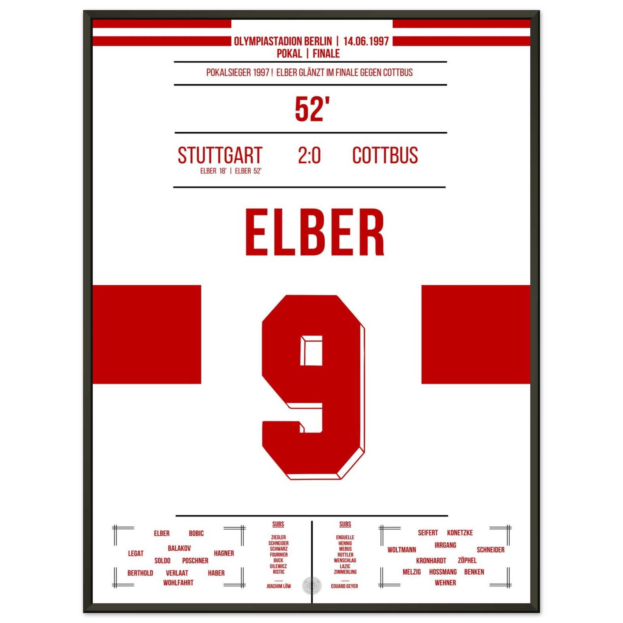 14. Juni 1997 – Stuttgart vs. Cottbus 2:0: Giovane Élber trifft im Pokalfinale doppelt und krönt eine starke Saison der Schwaben mit dem Titel. Ein heißer Sommertag in Berlin, ein brasilianischer Torjäger – und der Pokal in Stuttgarter Händen. Unser Poster verewigt diesen goldenen Élber-Moment.