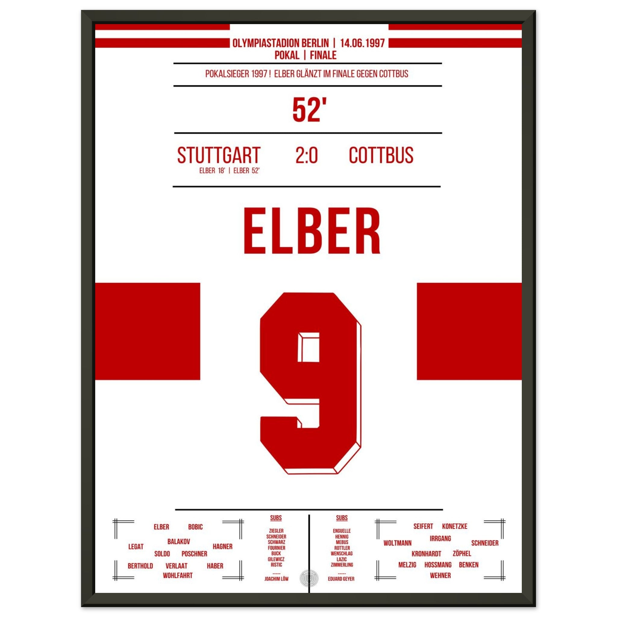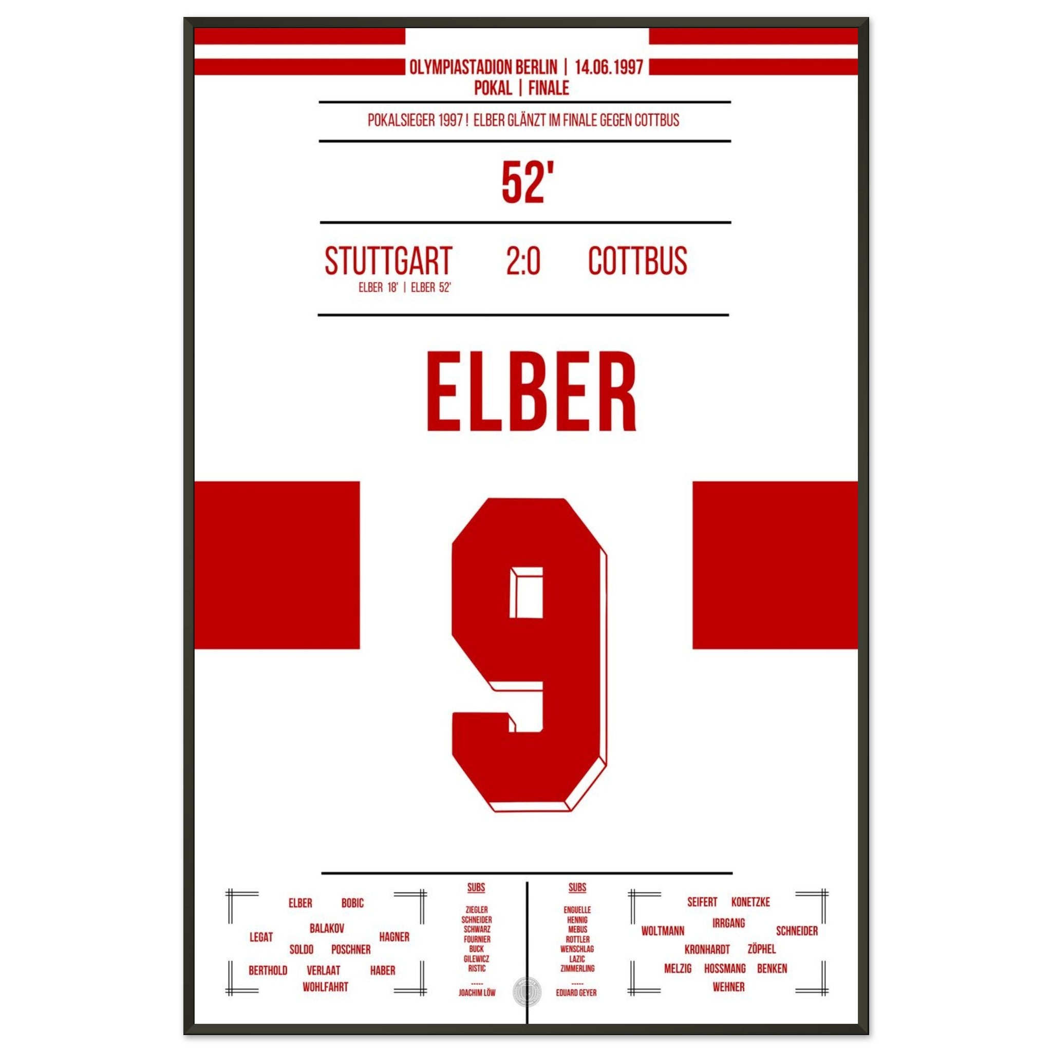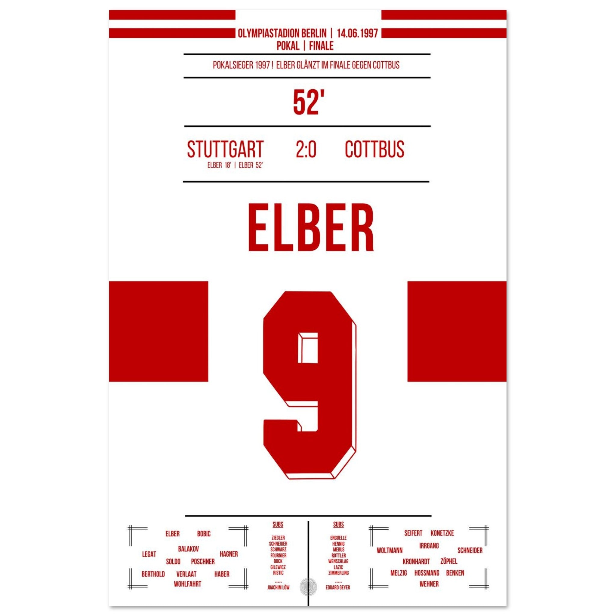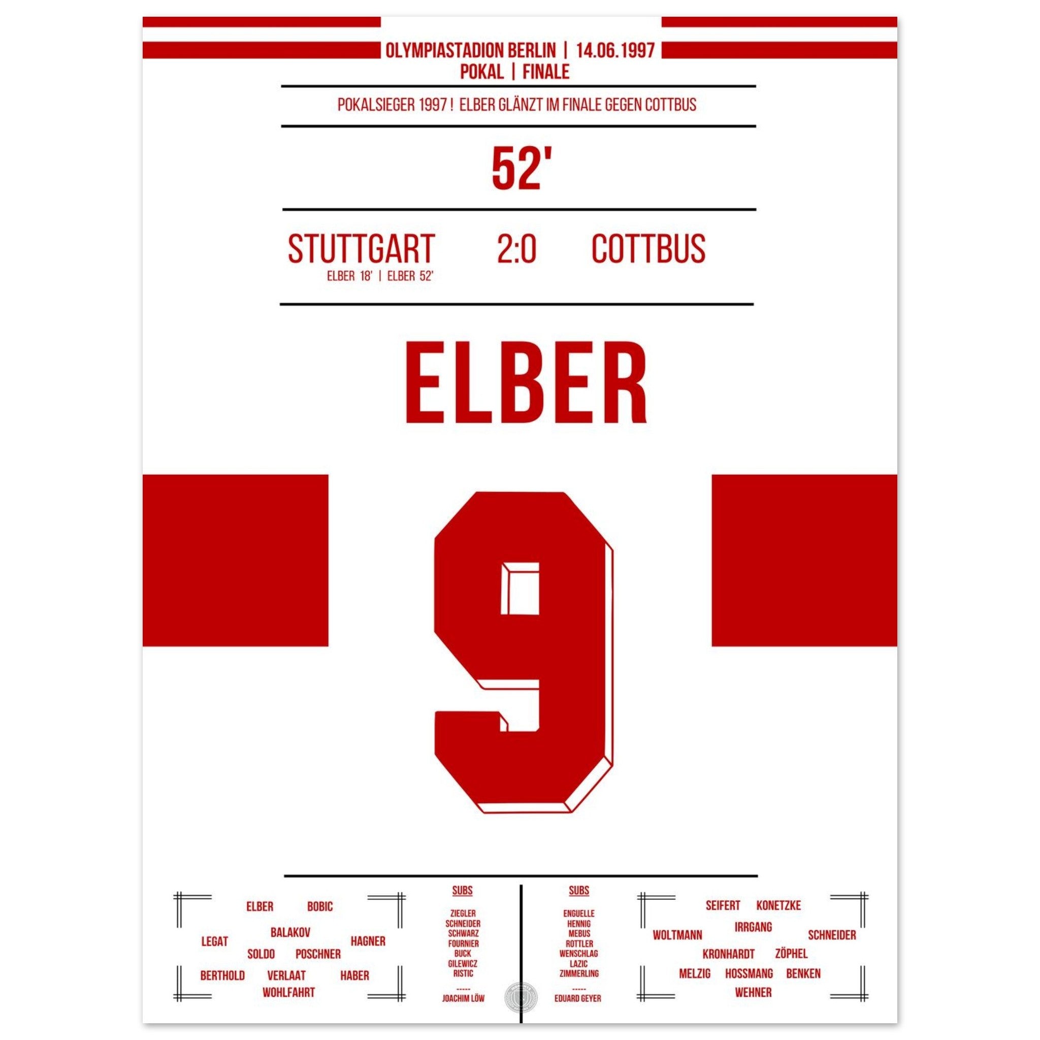 14. Juni 1997 – Stuttgart vs. Cottbus 2:0: Giovane Élber trifft im Pokalfinale doppelt und krönt eine starke Saison der Schwaben mit dem Titel. Ein heißer Sommertag in Berlin, ein brasilianischer Torjäger – und der Pokal in Stuttgarter Händen. Unser Poster verewigt diesen goldenen Élber-Moment.