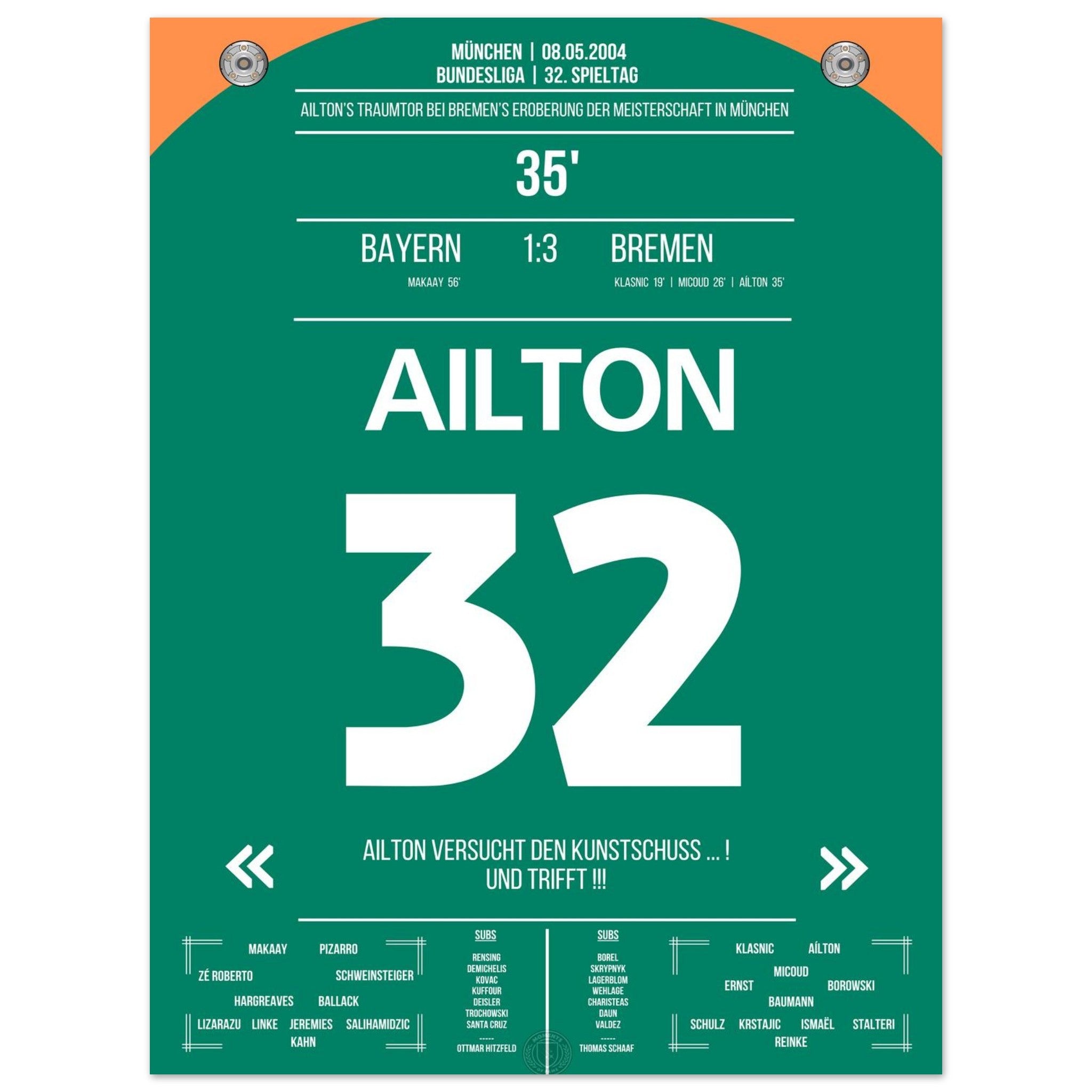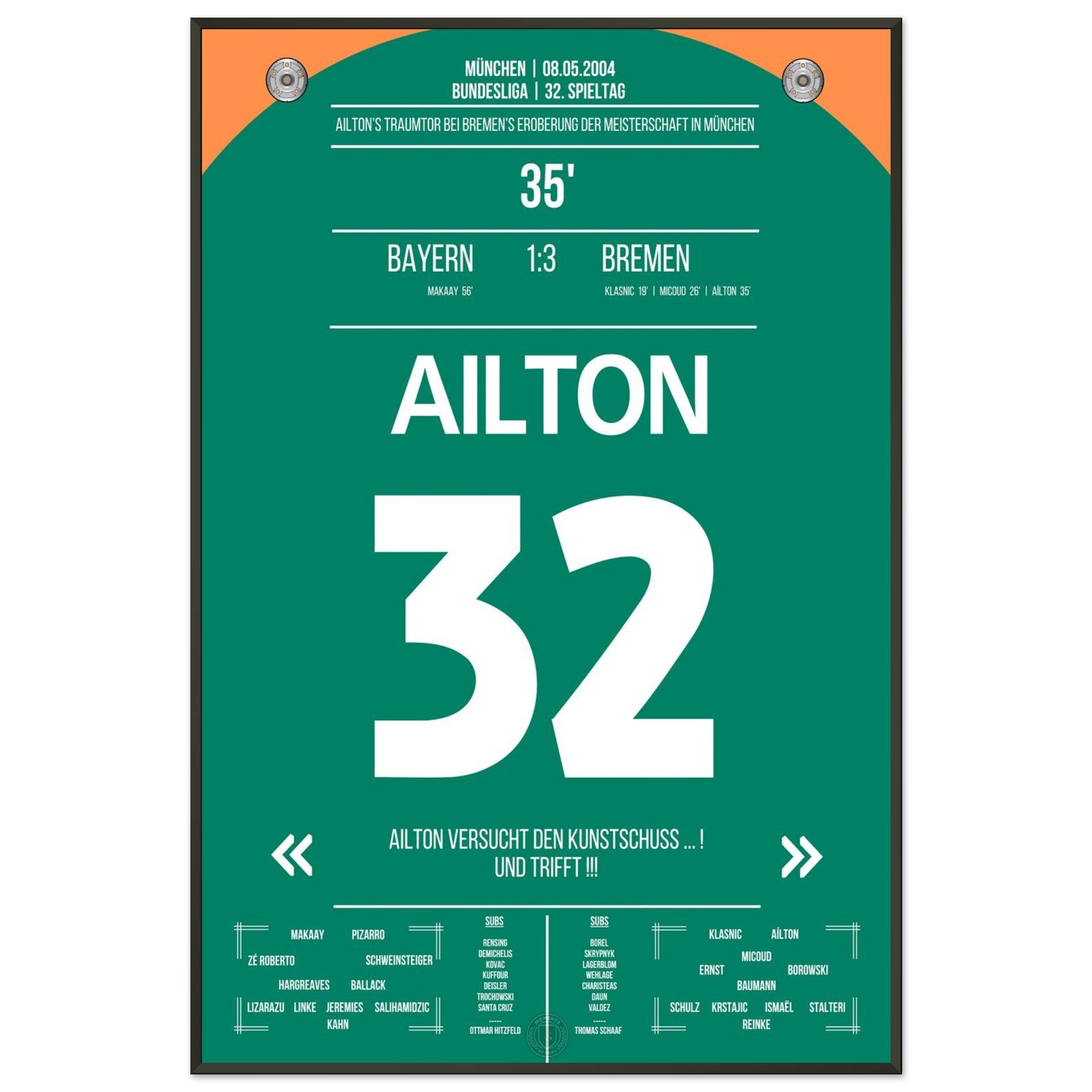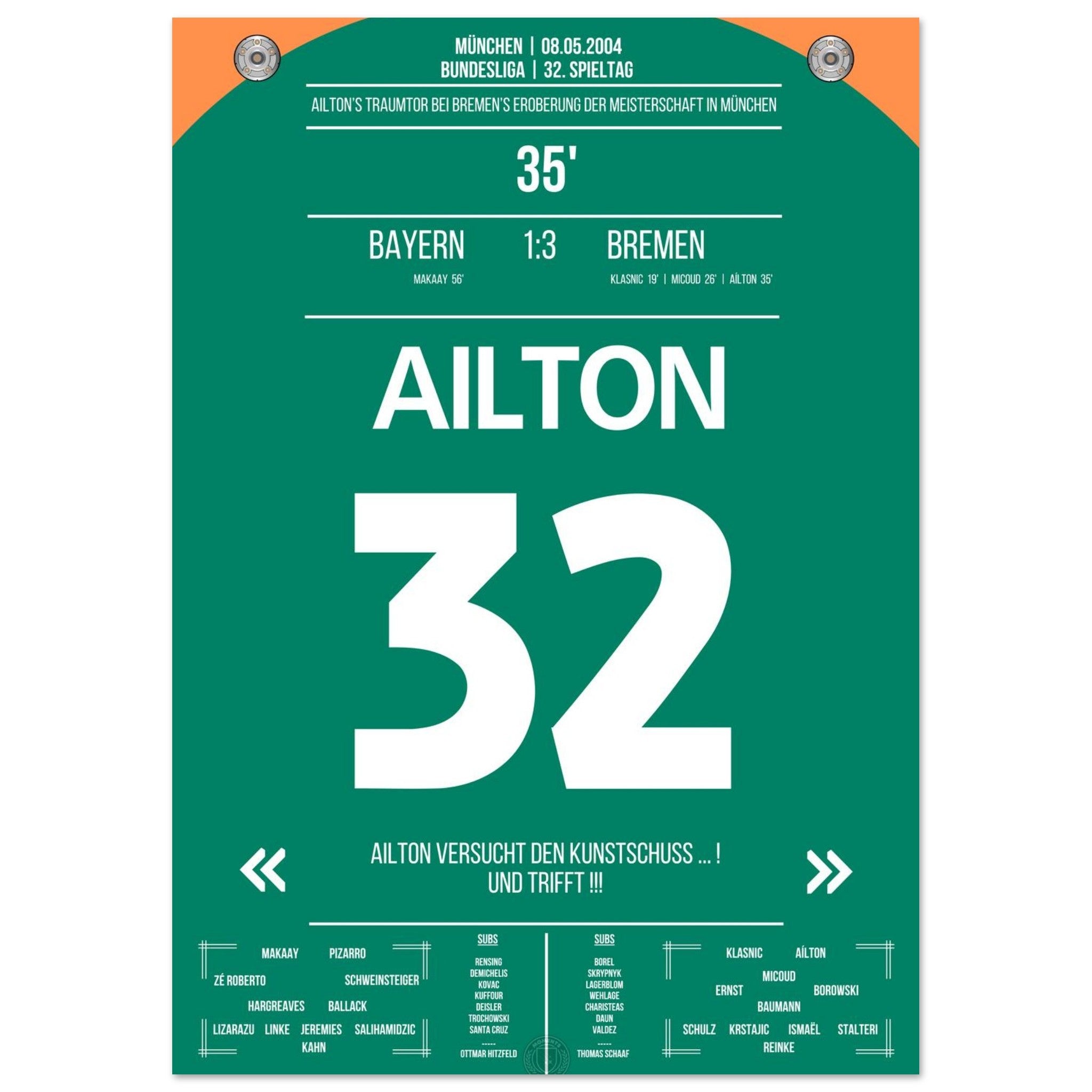 Olympiastadion. Aílton. Außenrist. 3:0. Meistermacher-Moment – jetzt als Poster für deine Wand.